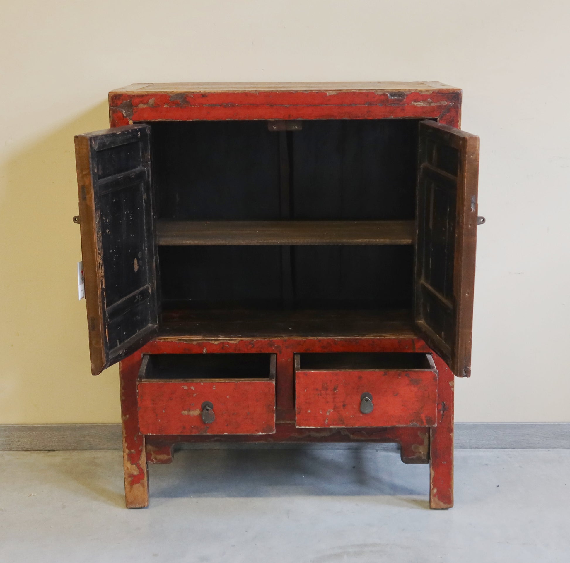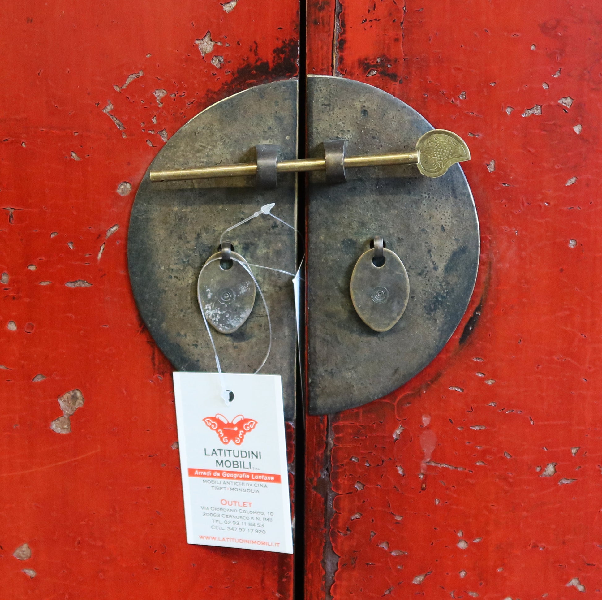 Credenza etnica con laccatura in patina, dalla particolare altezza ad unico vano con doppie ante. Provenienza regione dello Shanxi.
