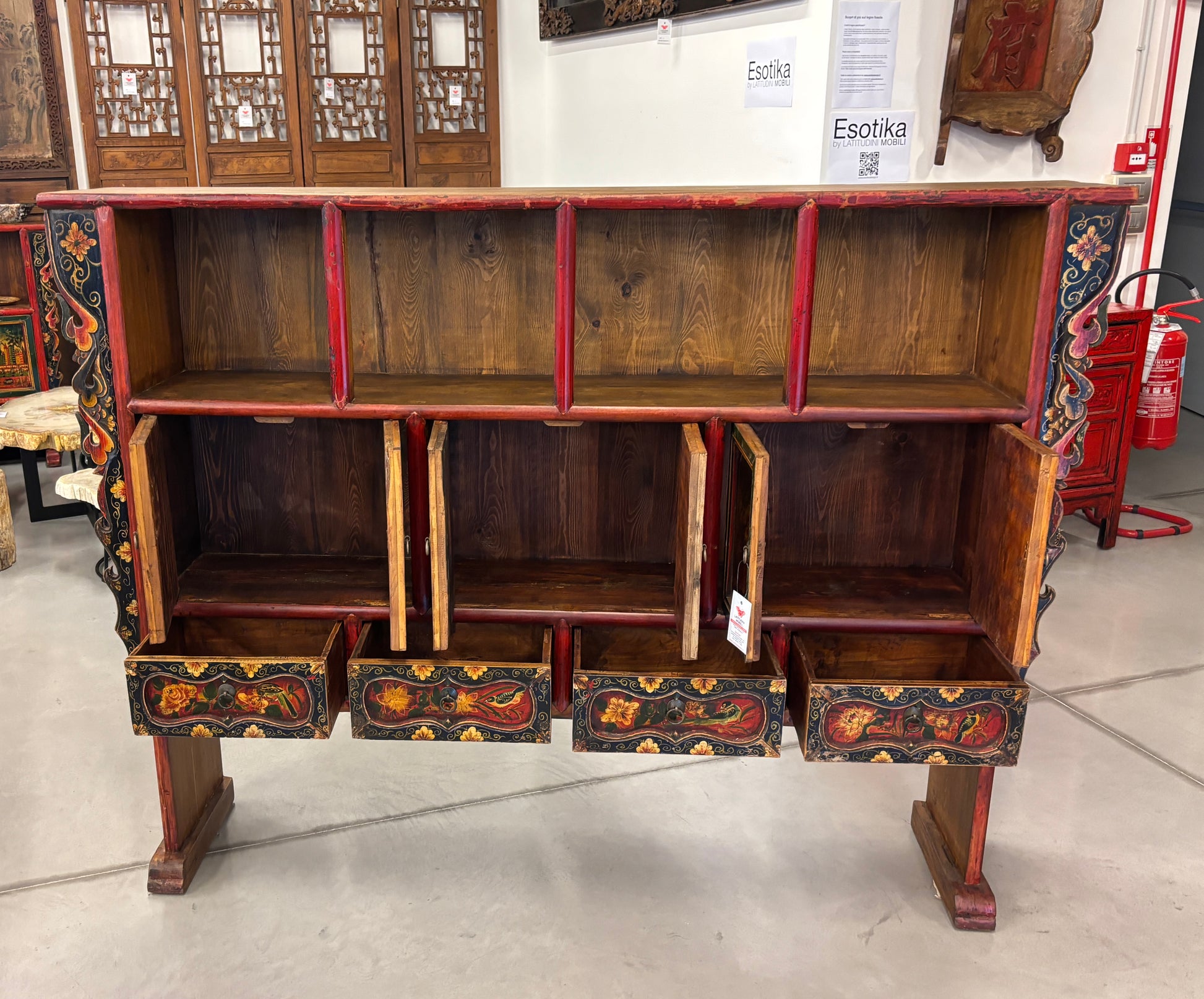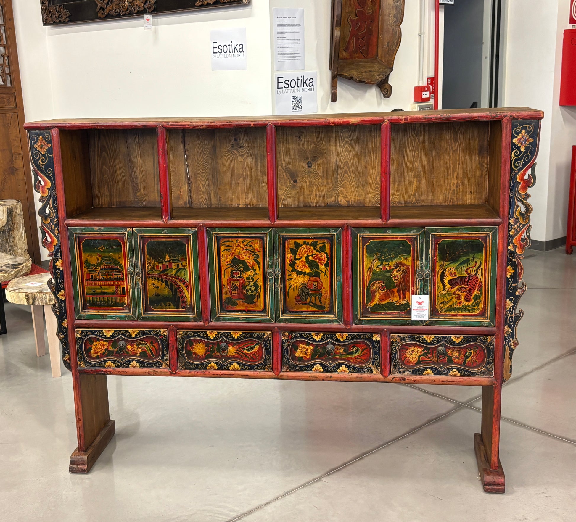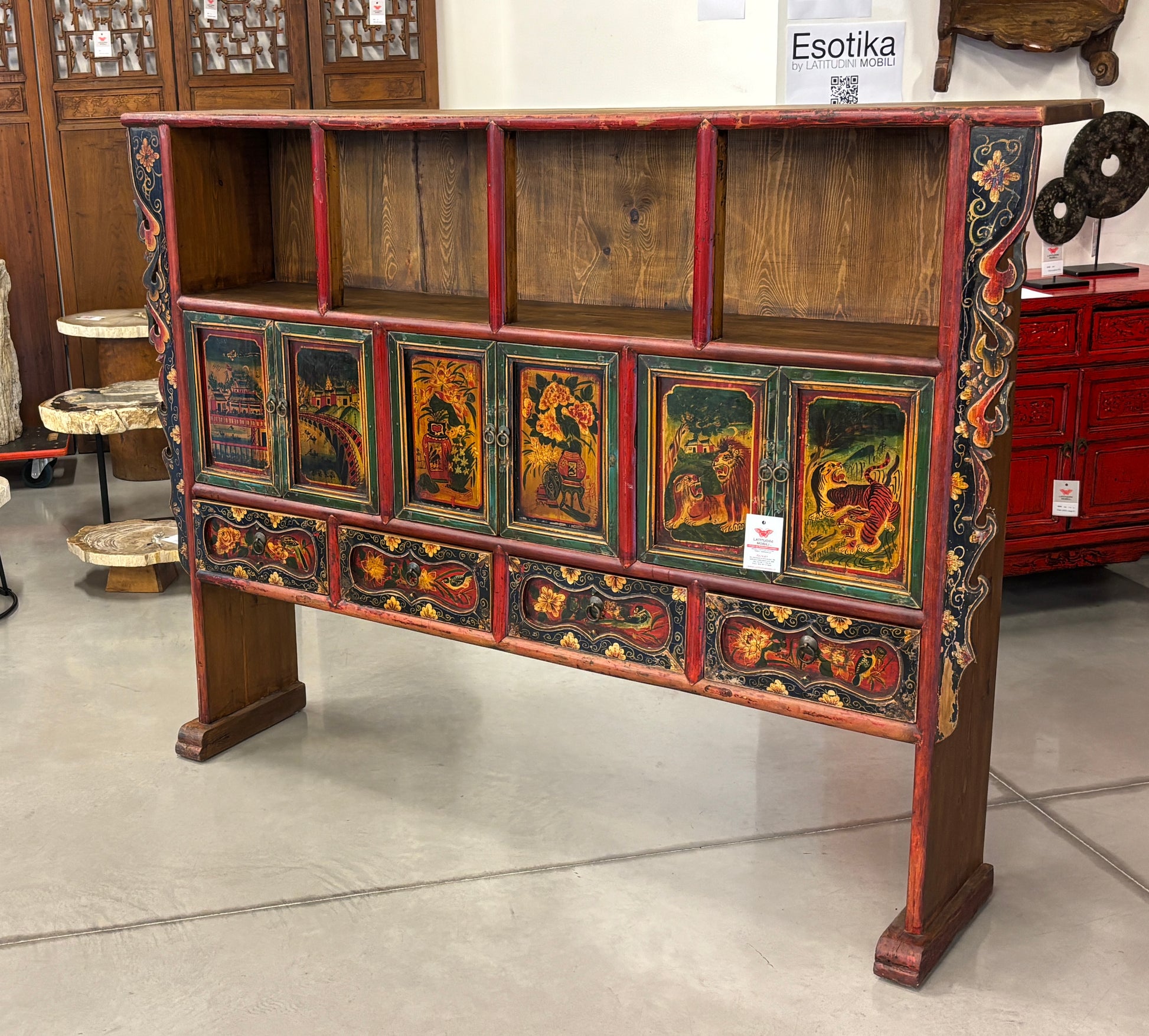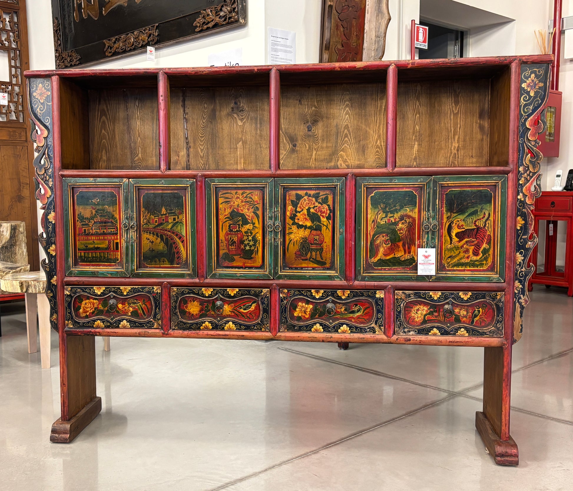 Preziosa alzatina cinese, proveniente dalla regione del Qinghai, che un tempo apparteneva al Tibet storico. E’ un mobile particolare, con spazi vano giorno, tre vani chiusi da coppie di ante, quattro cassetti bassi, ciascuno con una propria cornice sagomata. Due cornici laterali fanno da “ali” intagliati che si raccordano col piano aggettante. I montanti verticali, che fungono da gambe, poggiano su “zoccoli” bassi. Il mobile può essere sia utilizzato in piedi, come appare nella nostra fotografia, appunto come “alzata”, come consolle o libreria. Ma data la ridotta profondità il mobile può anche essere appeso (applicando dei ganci sul retro) a qualsiasi altezza. E dunque può diventare sia una testata di letto quanto una libreria sospesa. Per certo, ovunque venga collocato, resterà un pezzo unico di particolare impatto scenografico!