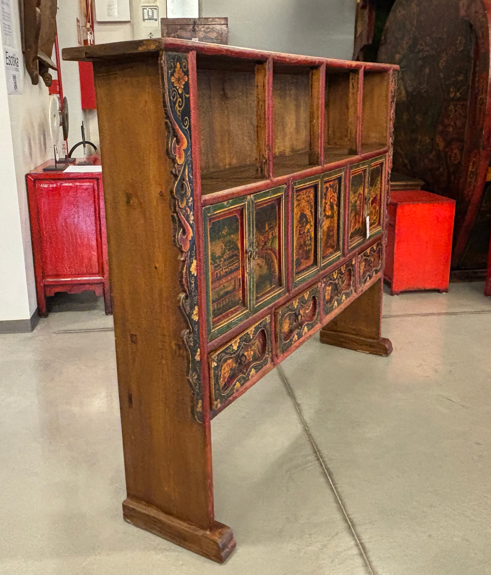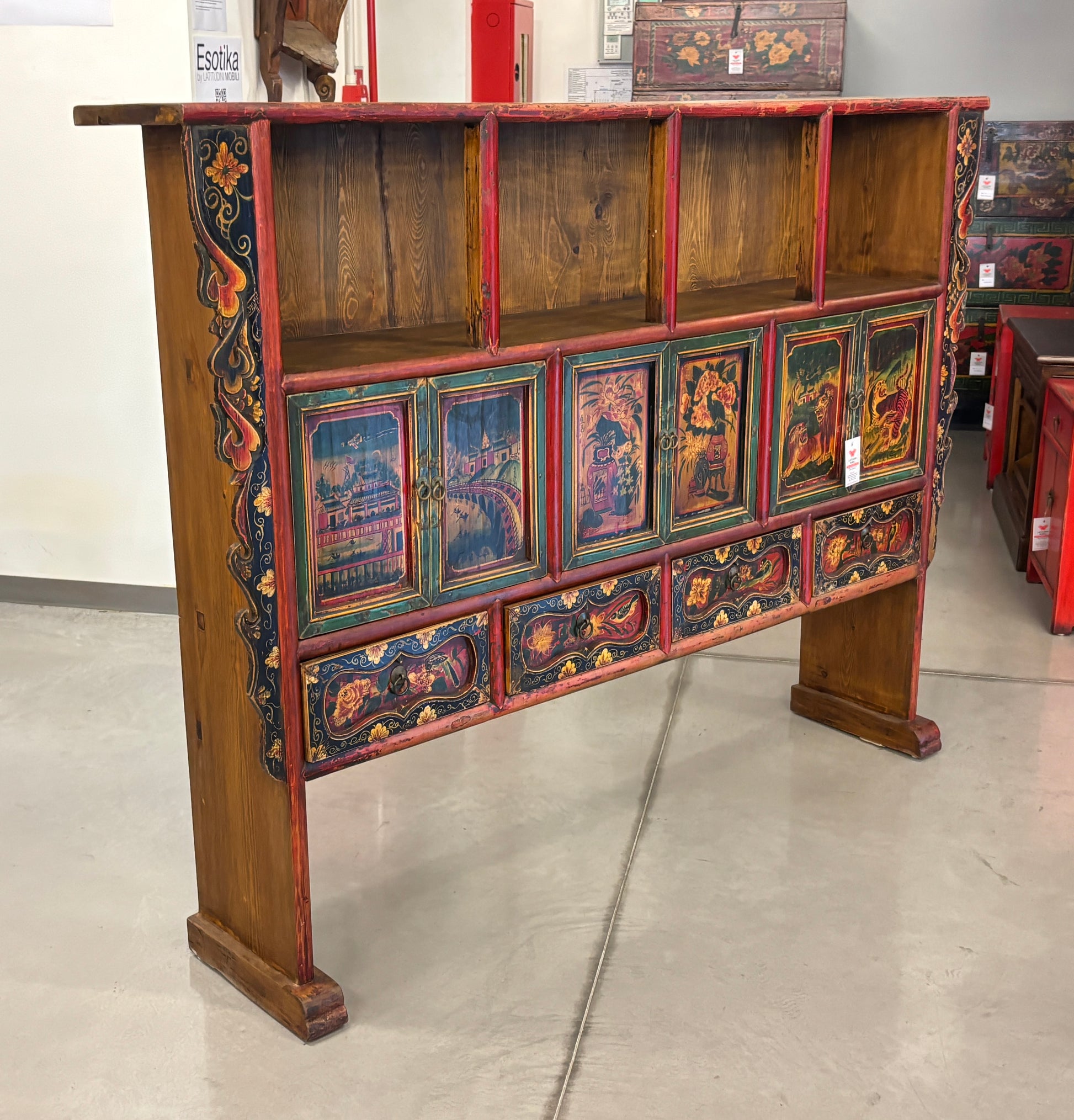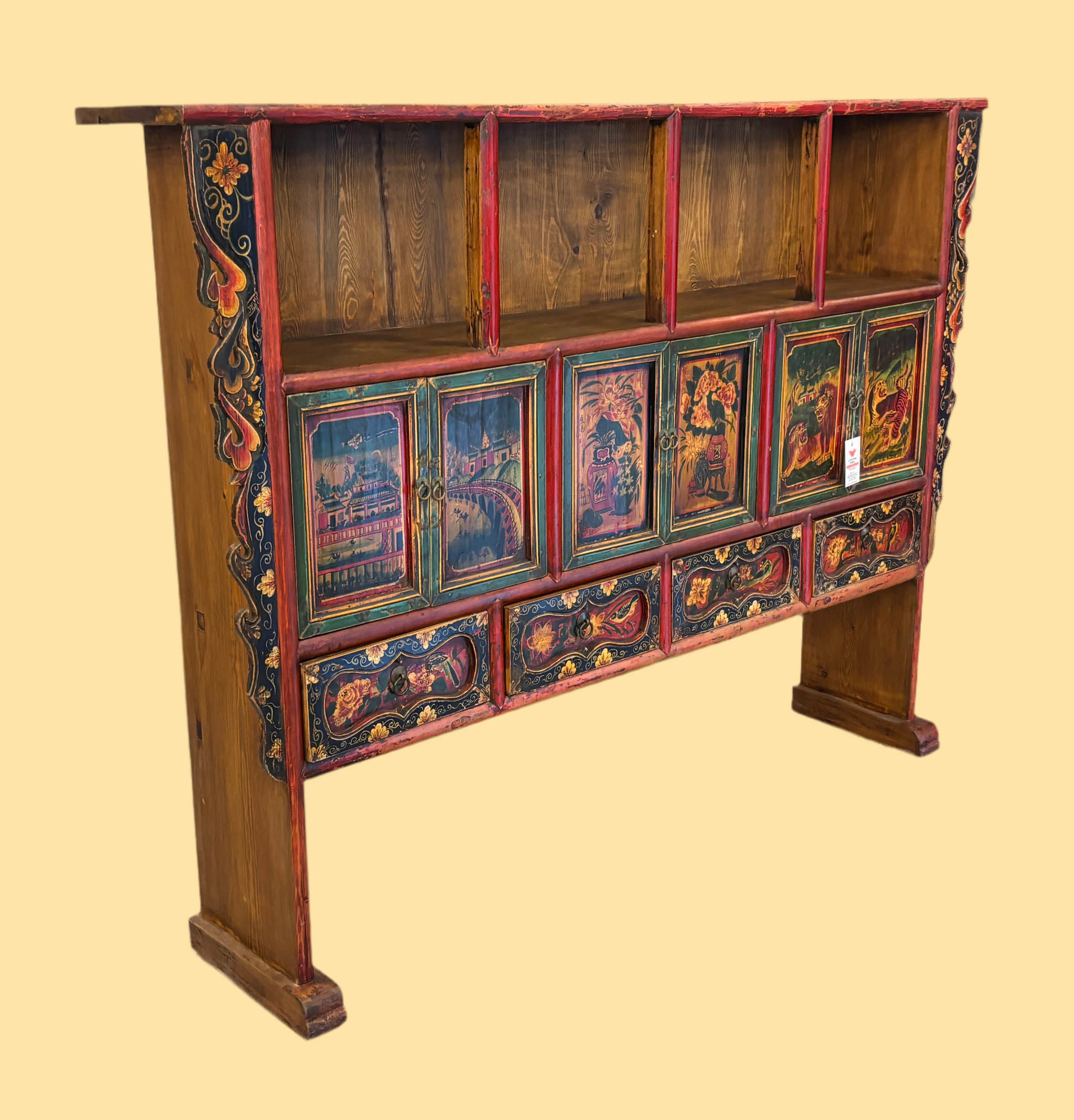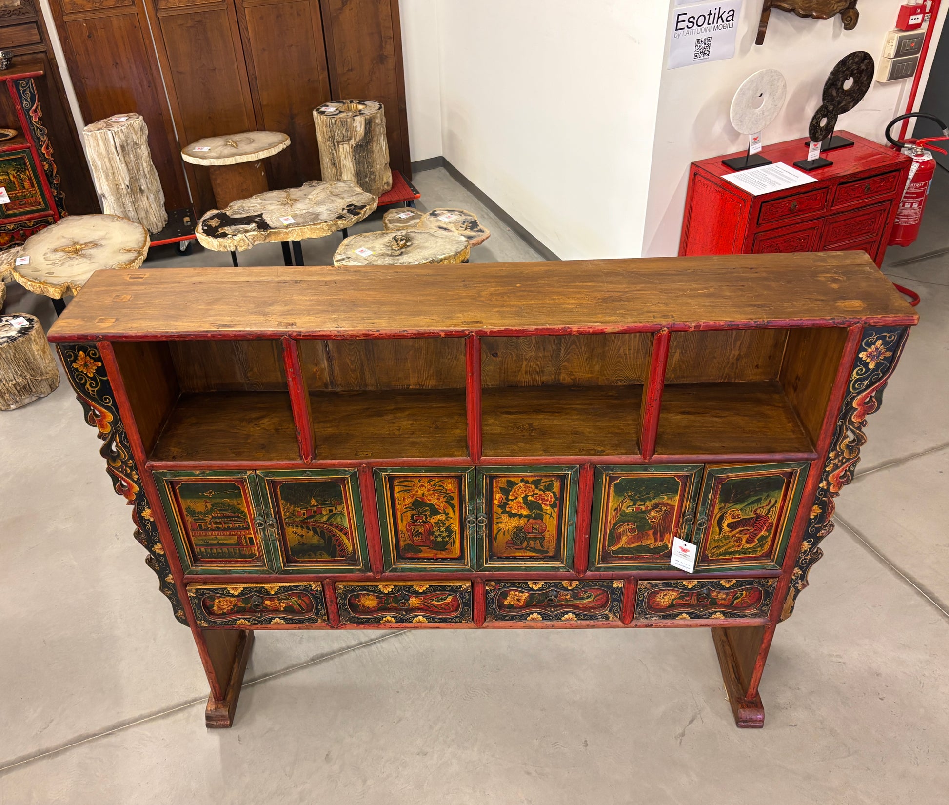 Preziosa alzatina cinese, proveniente dalla regione del Qinghai, che un tempo apparteneva al Tibet storico. E’ un mobile particolare, con spazi vano giorno, tre vani chiusi da coppie di ante, quattro cassetti bassi, ciascuno con una propria cornice sagomata. Due cornici laterali fanno da “ali” intagliati che si raccordano col piano aggettante. I montanti verticali, che fungono da gambe, poggiano su “zoccoli” bassi. Il mobile può essere sia utilizzato in piedi, come appare nella nostra fotografia, appunto come “alzata”, come consolle o libreria. Ma data la ridotta profondità il mobile può anche essere appeso (applicando dei ganci sul retro) a qualsiasi altezza. E dunque può diventare sia una testata di letto quanto una libreria sospesa. Per certo, ovunque venga collocato, resterà un pezzo unico di particolare impatto scenografico!