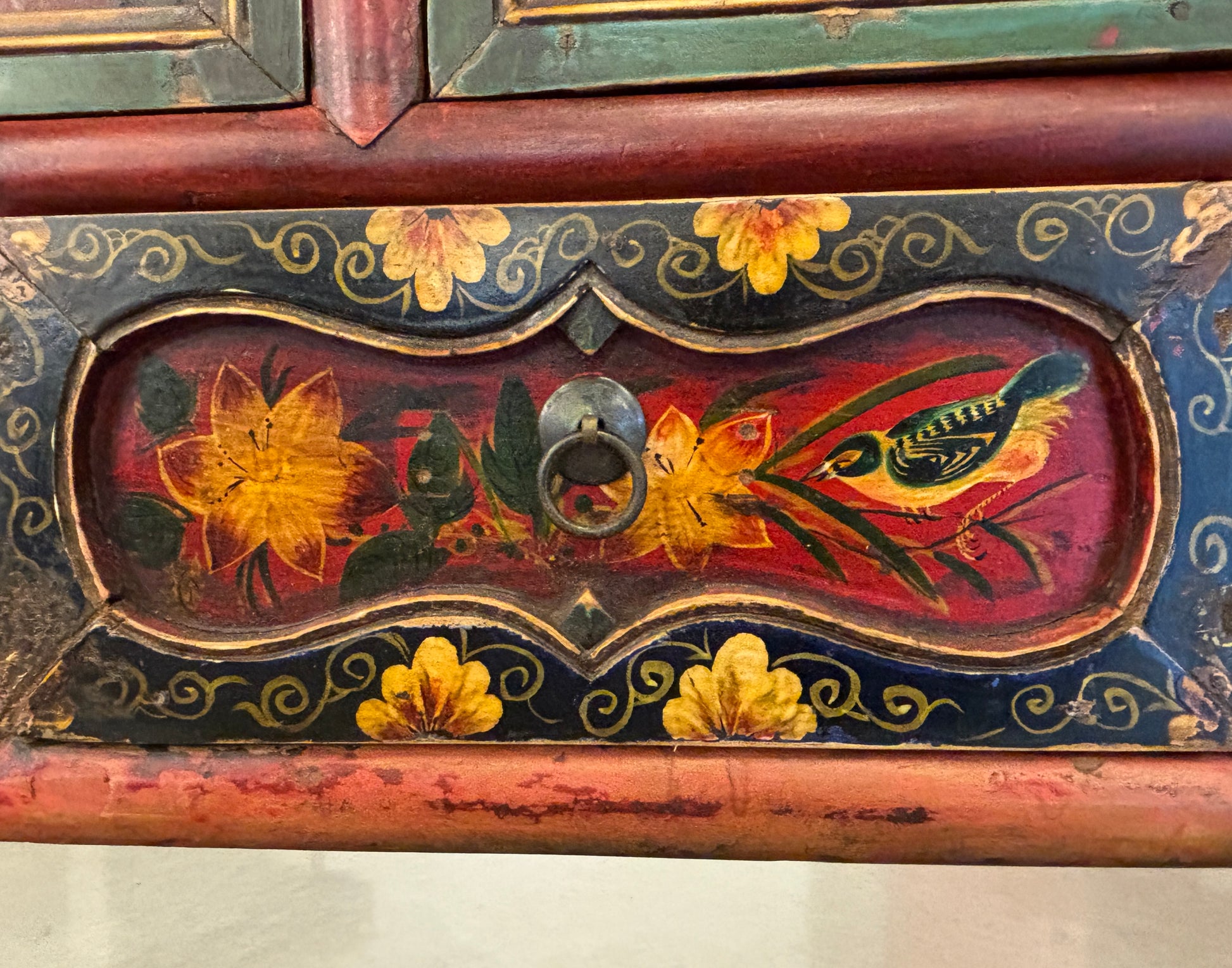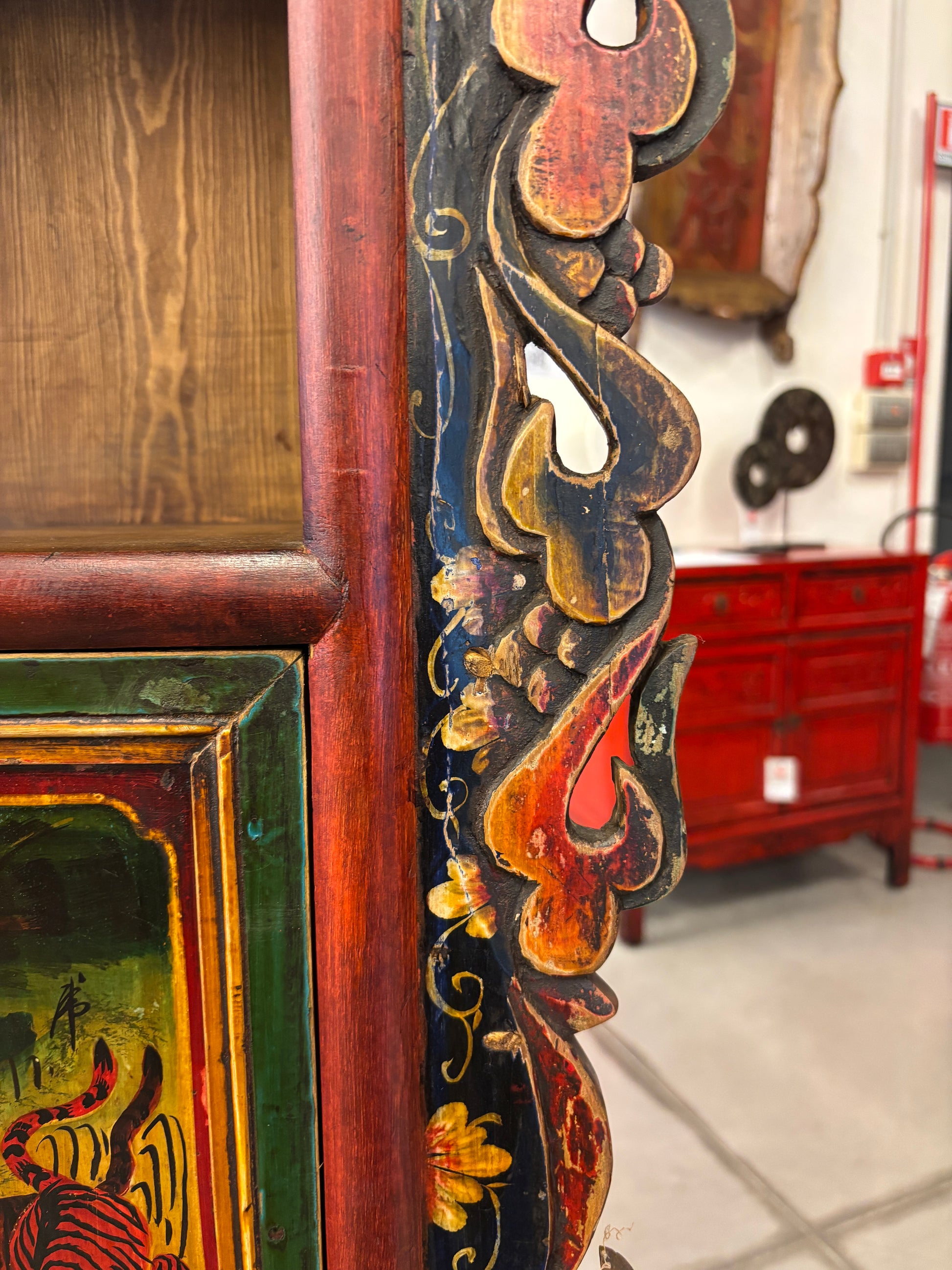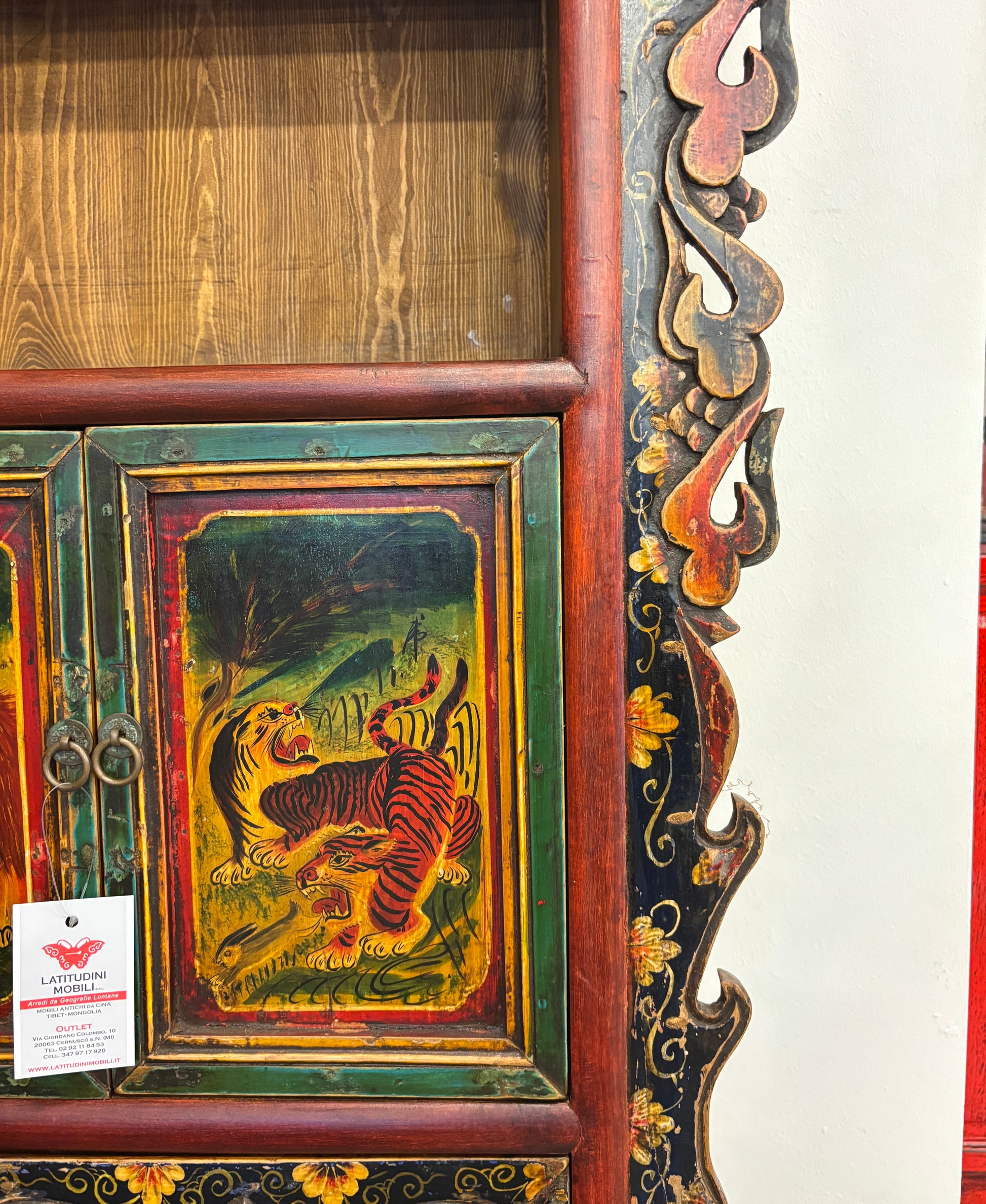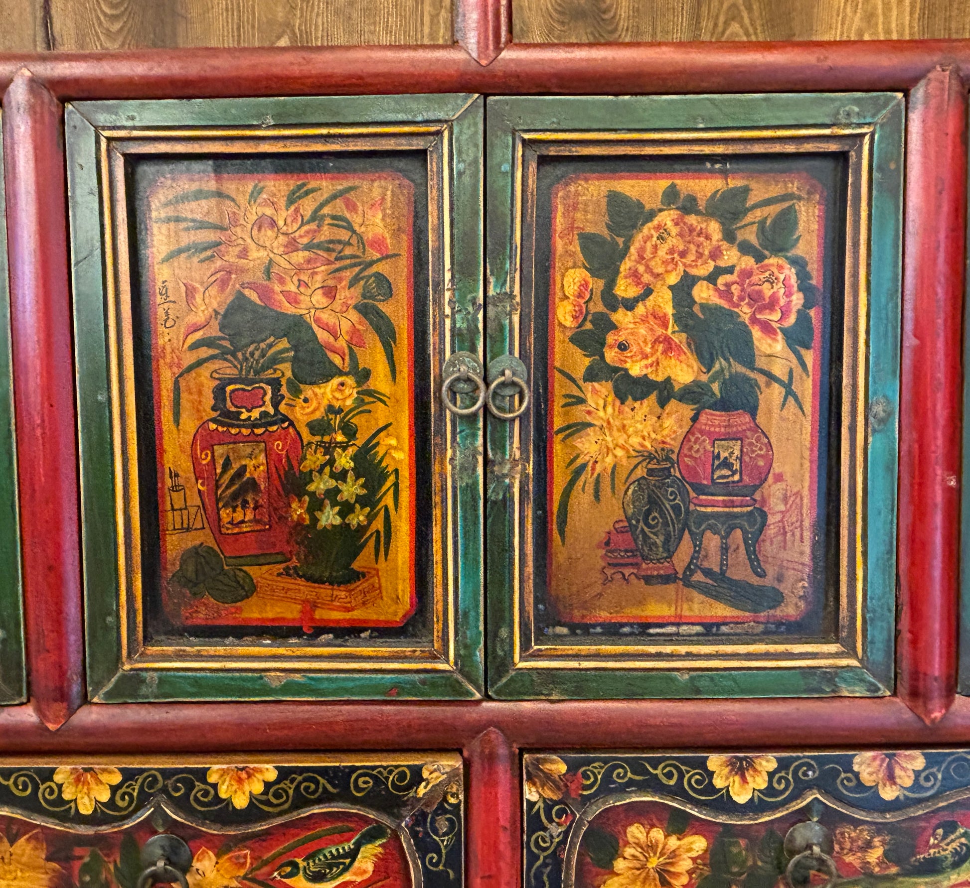 Preziosa alzatina cinese, proveniente dalla regione del Qinghai, che un tempo apparteneva al Tibet storico. E’ un mobile particolare, con spazi vano giorno, tre vani chiusi da coppie di ante, quattro cassetti bassi, ciascuno con una propria cornice sagomata. Due cornici laterali fanno da “ali” intagliati che si raccordano col piano aggettante. I montanti verticali, che fungono da gambe, poggiano su “zoccoli” bassi. Il mobile può essere sia utilizzato in piedi, come appare nella nostra fotografia, appunto come “alzata”, come consolle o libreria. Ma data la ridotta profondità il mobile può anche essere appeso (applicando dei ganci sul retro) a qualsiasi altezza. E dunque può diventare sia una testata di letto quanto una libreria sospesa. Per certo, ovunque venga collocato, resterà un pezzo unico di particolare impatto scenografico!