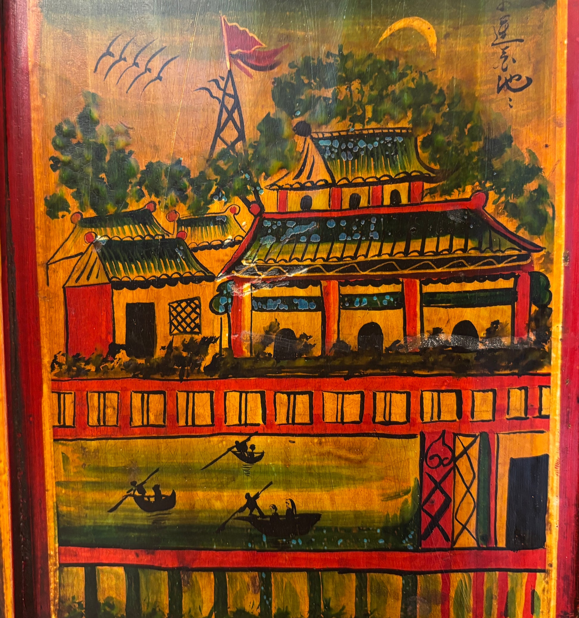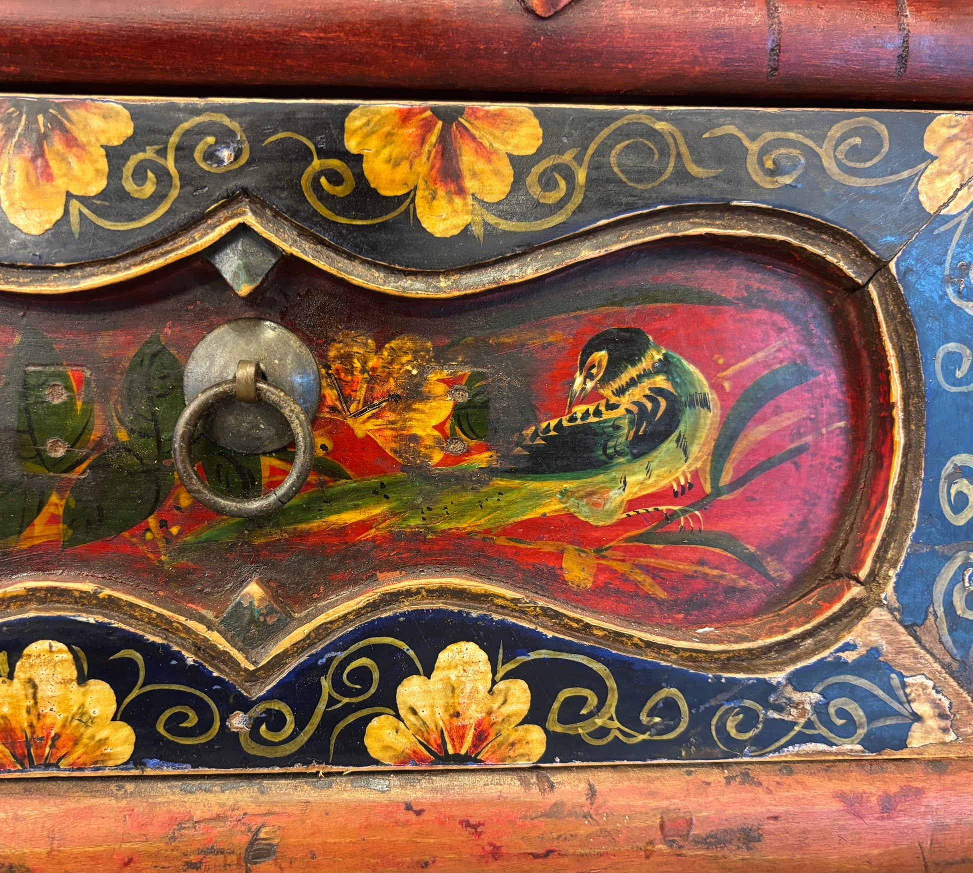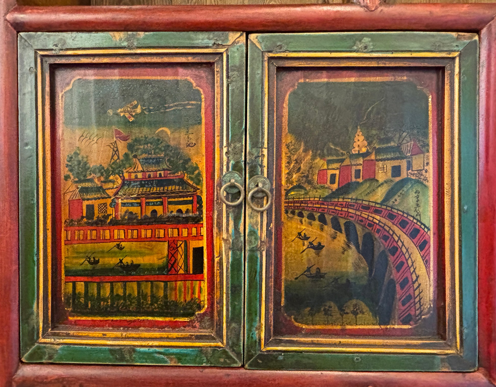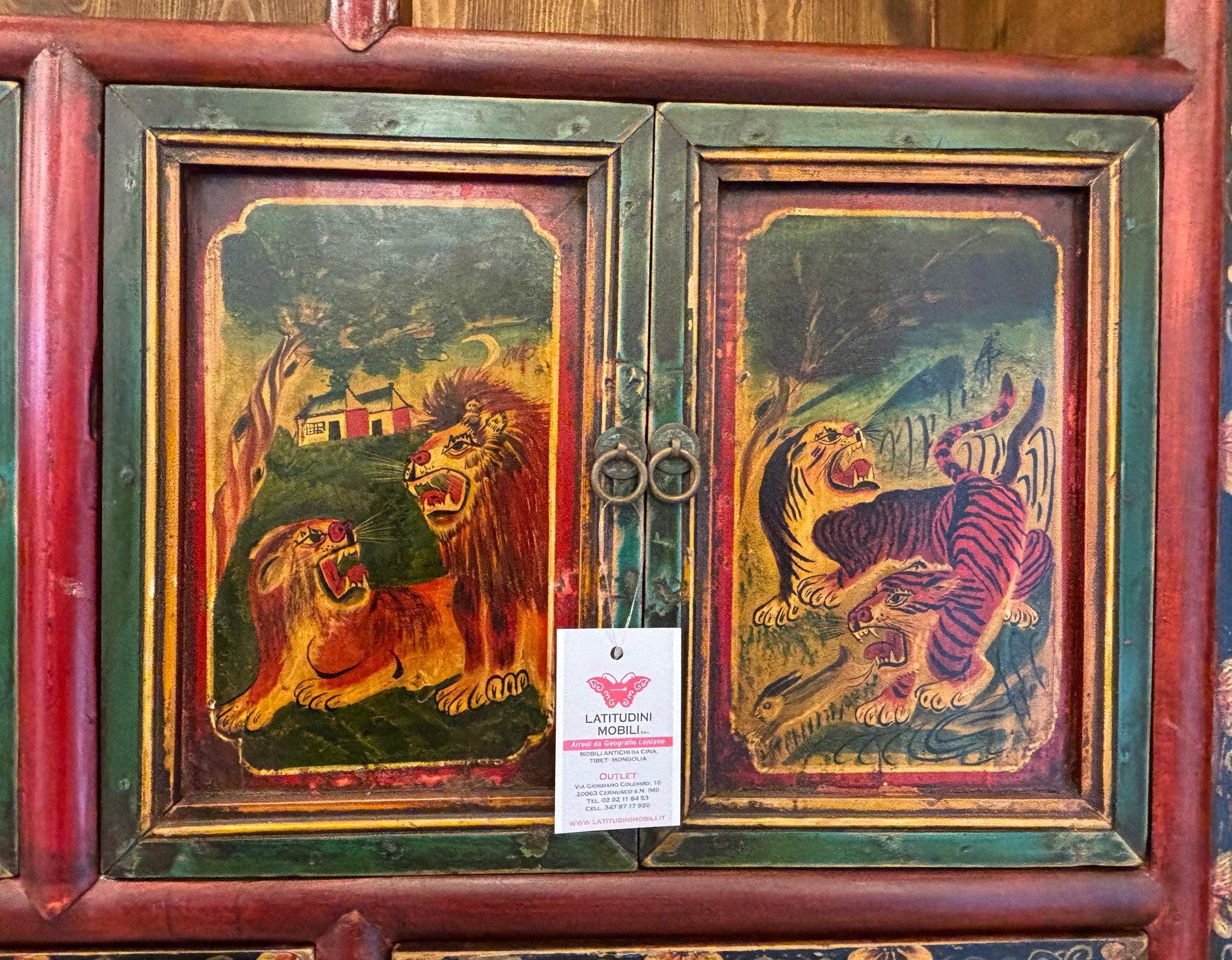 Preziosa alzatina cinese, proveniente dalla regione del Qinghai, che un tempo apparteneva al Tibet storico. E’ un mobile particolare, con spazi vano giorno, tre vani chiusi da coppie di ante, quattro cassetti bassi, ciascuno con una propria cornice sagomata. Due cornici laterali fanno da “ali” intagliati che si raccordano col piano aggettante. I montanti verticali, che fungono da gambe, poggiano su “zoccoli” bassi. Il mobile può essere sia utilizzato in piedi, come appare nella nostra fotografia, appunto come “alzata”, come consolle o libreria. Ma data la ridotta profondità il mobile può anche essere appeso (applicando dei ganci sul retro) a qualsiasi altezza. E dunque può diventare sia una testata di letto quanto una libreria sospesa. Per certo, ovunque venga collocato, resterà un pezzo unico di particolare impatto scenografico!