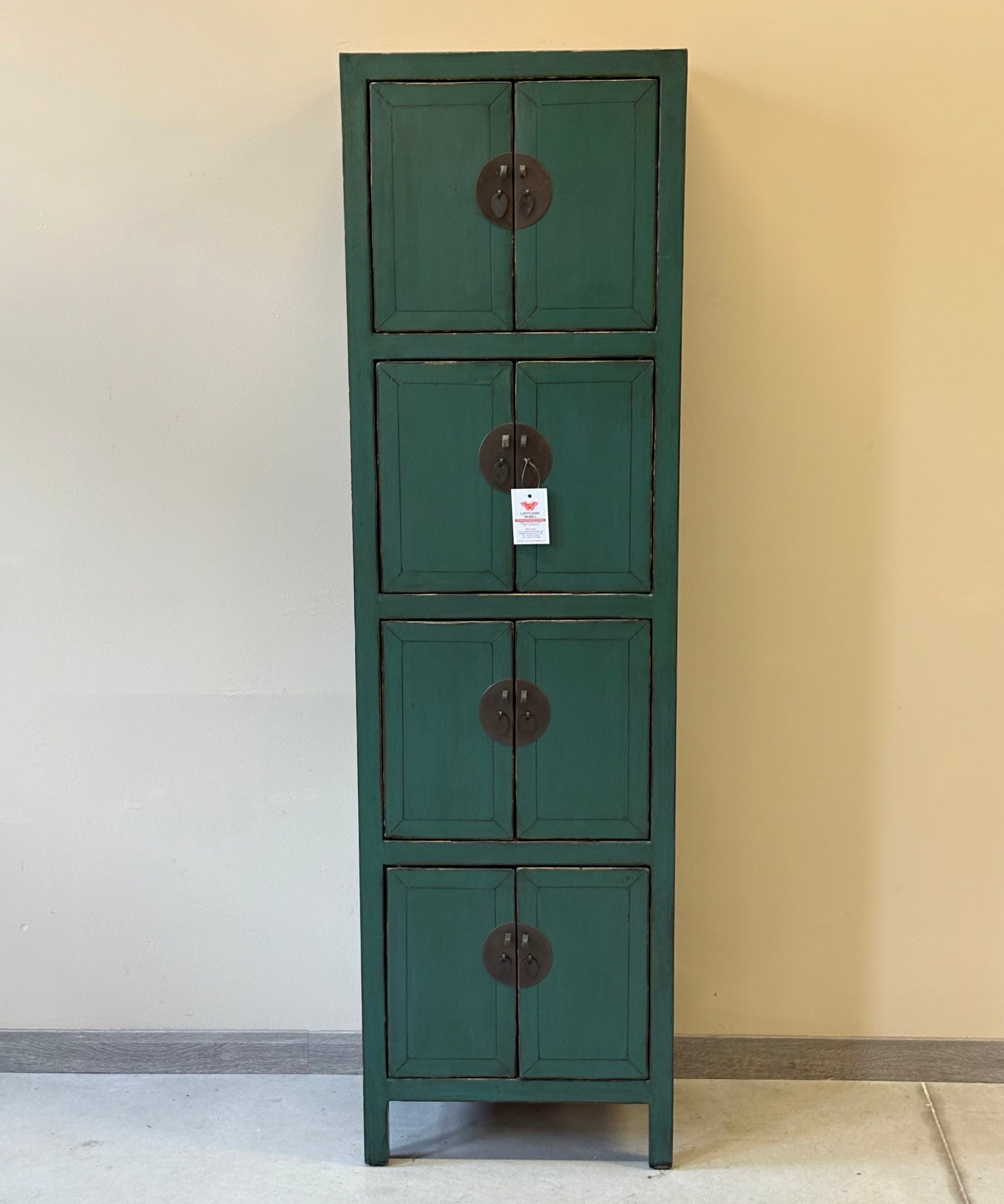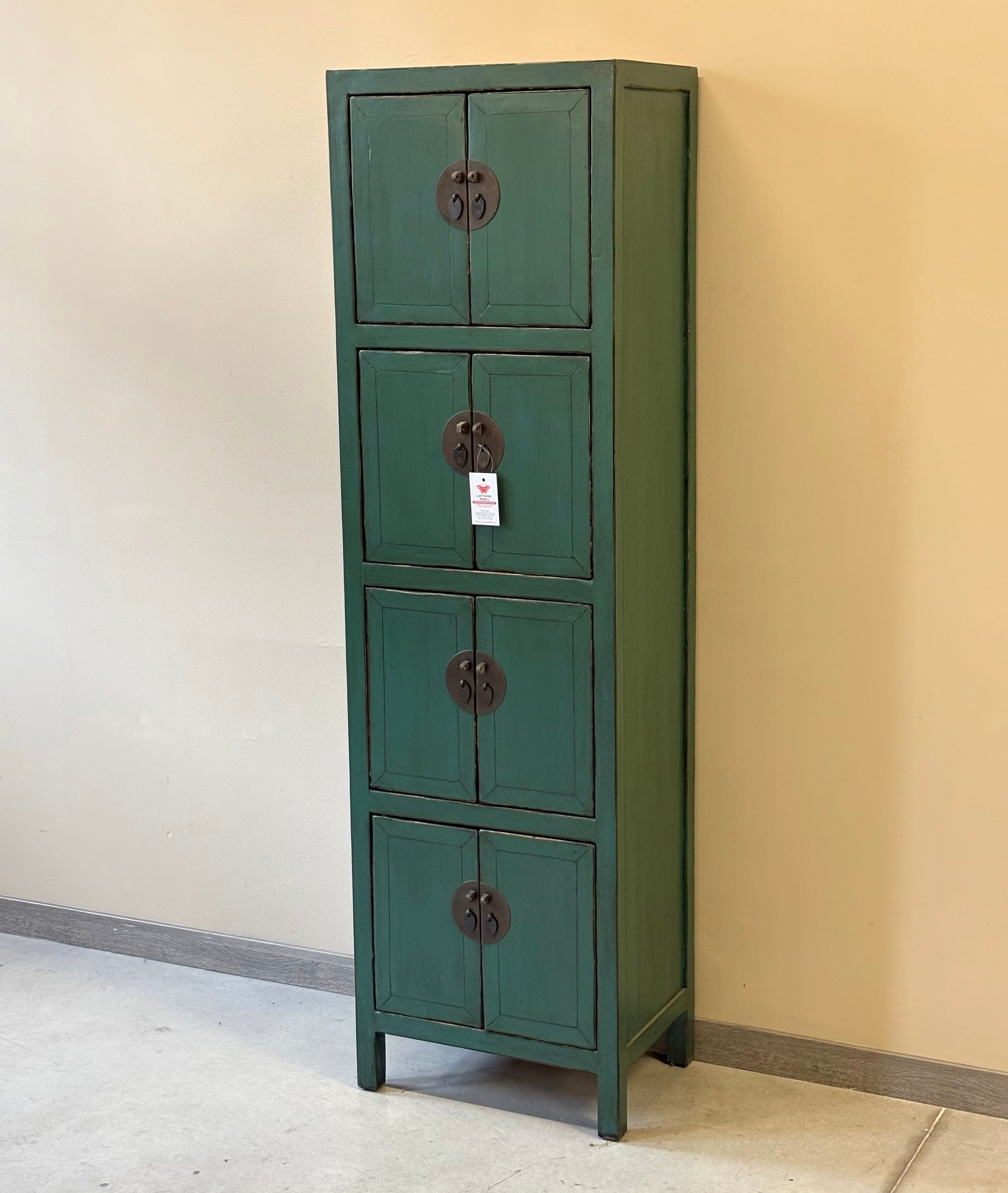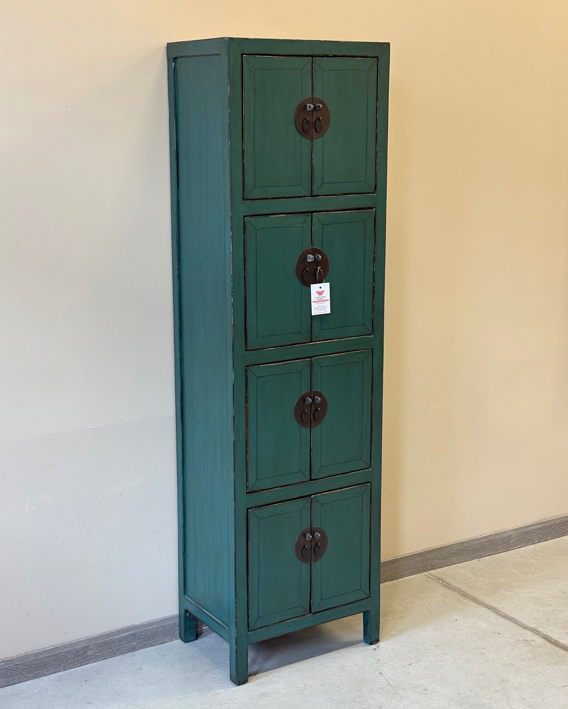Armadietto cinese stretto a colonna, quattro vani otto antine, pratico e adatto agli ambienti in cui si possa inserire solo un mobile con queste particolari caratteristiche. Sia che venga collocato in ingresso, nel soggiorno, nella camera da letto, o anche nel bagno, porterà la piacevolezza cromatica della finitura in lacca color verde ottanio.
