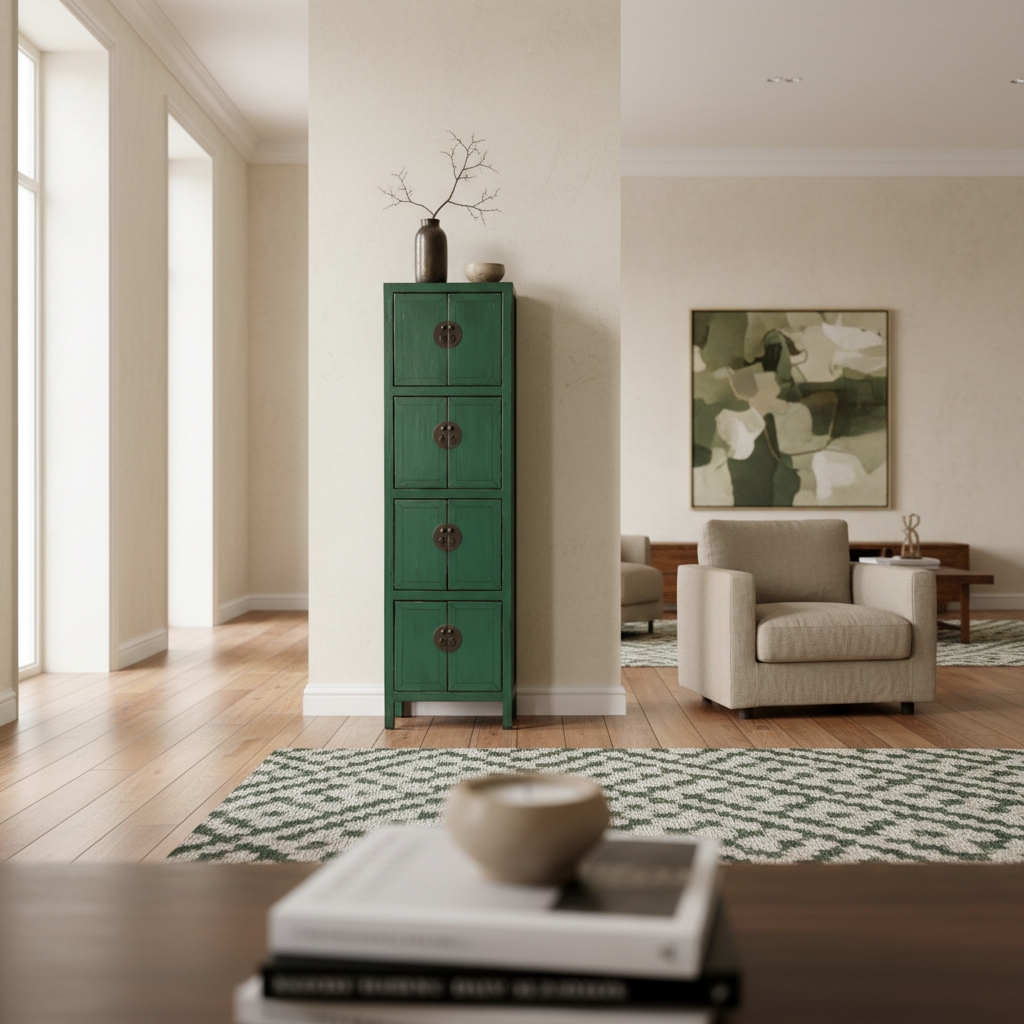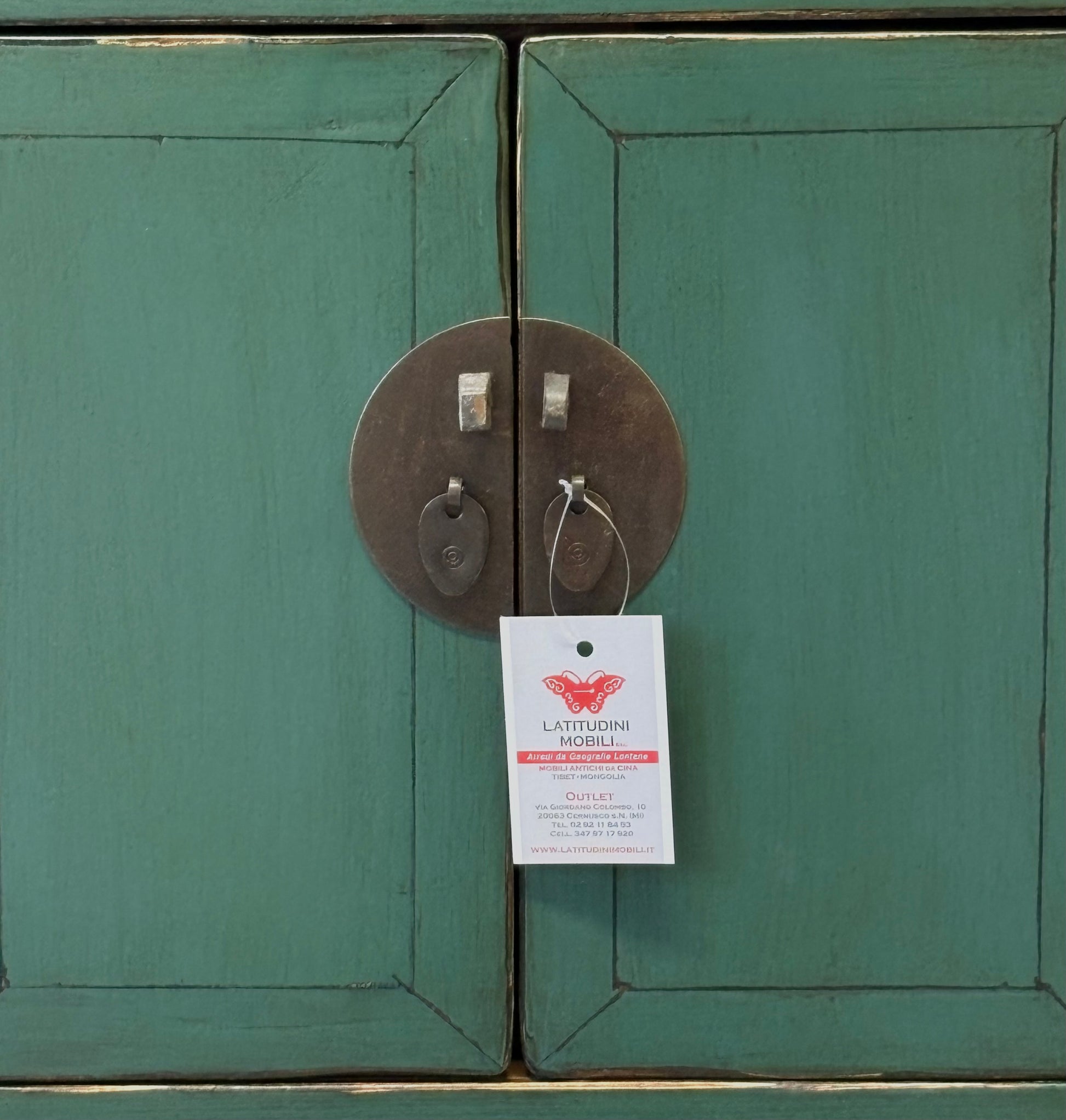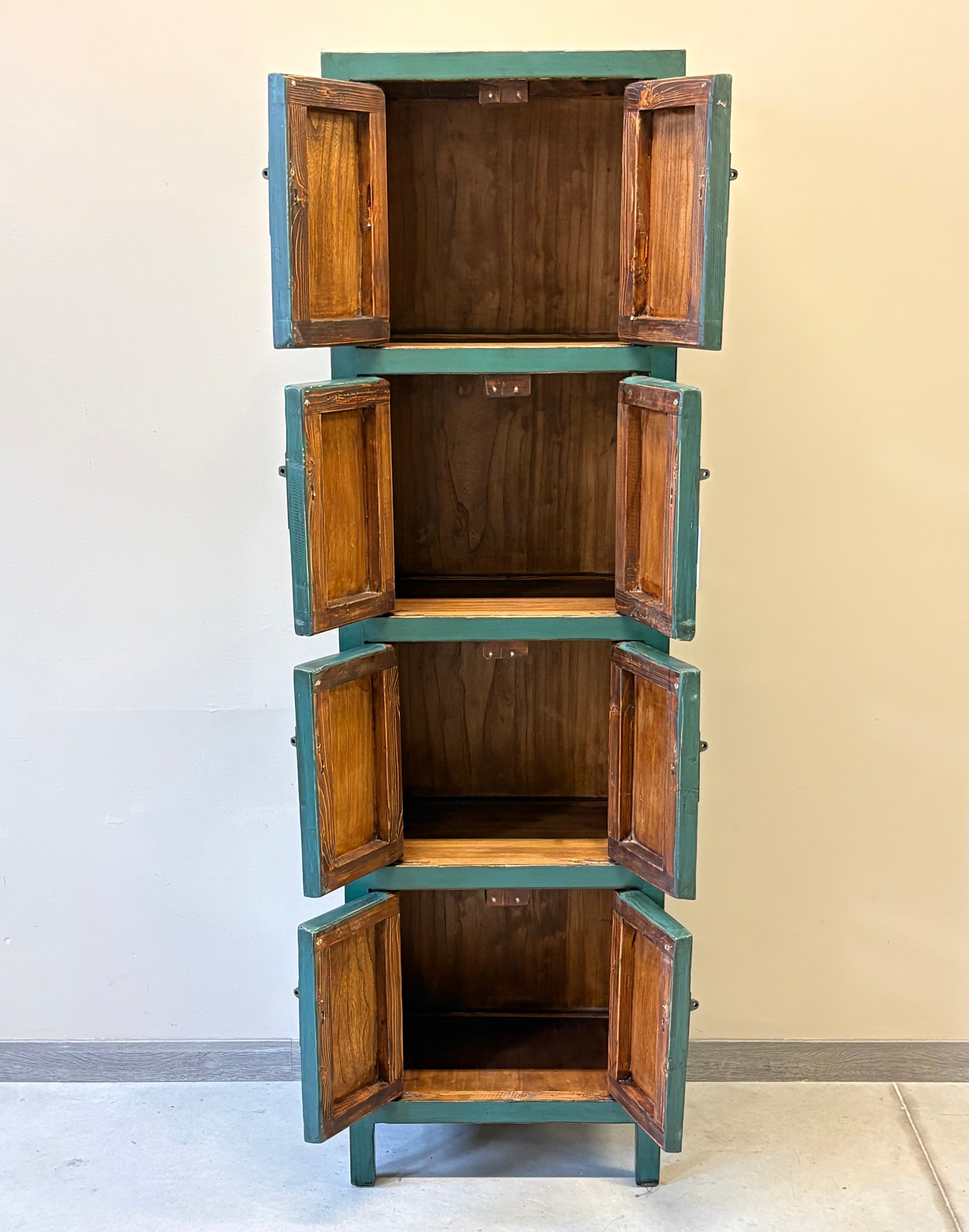Armadietto cinese stretto a colonna, quattro vani otto antine, pratico e adatto agli ambienti in cui si possa inserire solo un mobile con queste particolari caratteristiche. Sia che venga collocato in ingresso, nel soggiorno, nella camera da letto, o anche nel bagno, porterà la piacevolezza cromatica della finitura in lacca color verde ottanio.