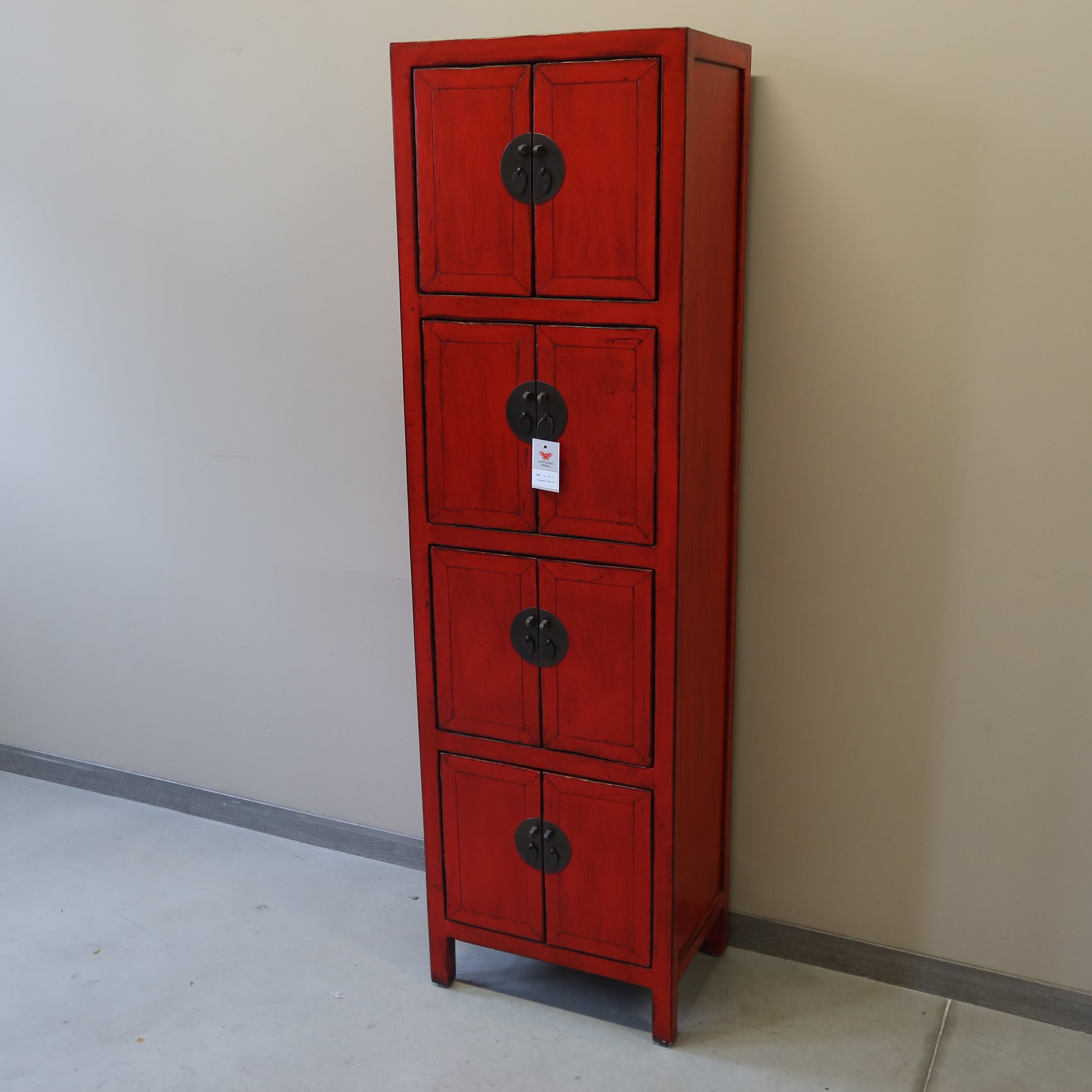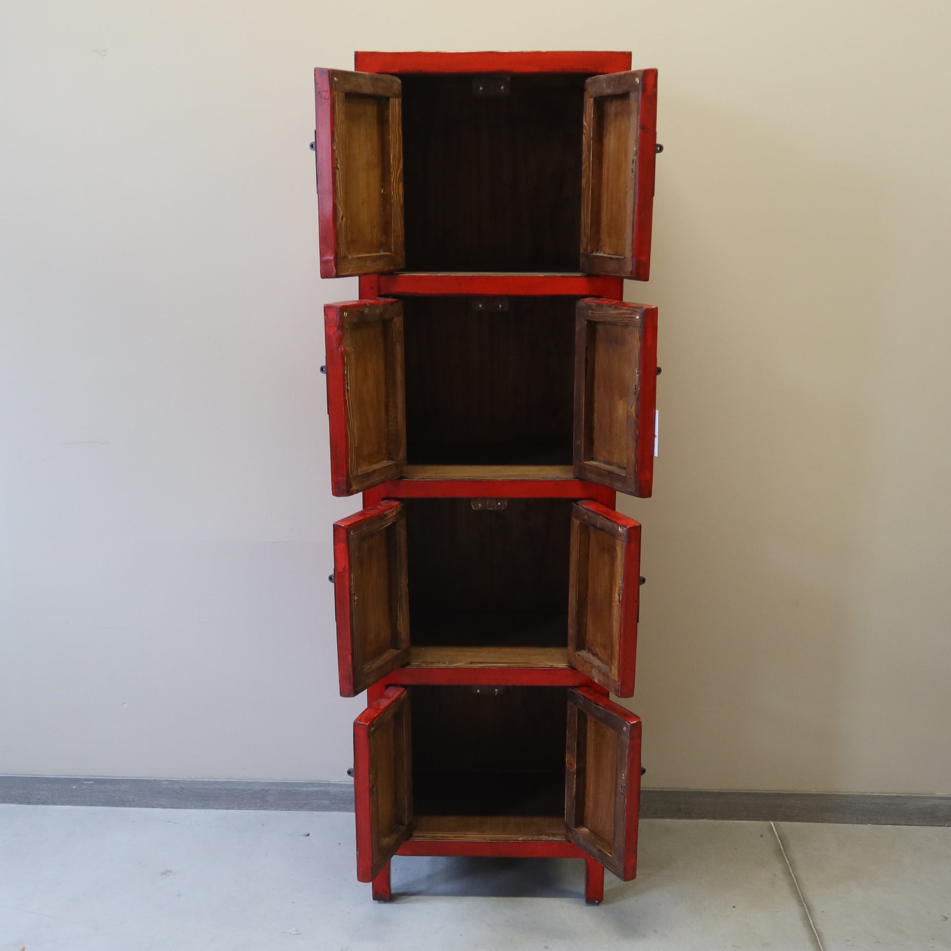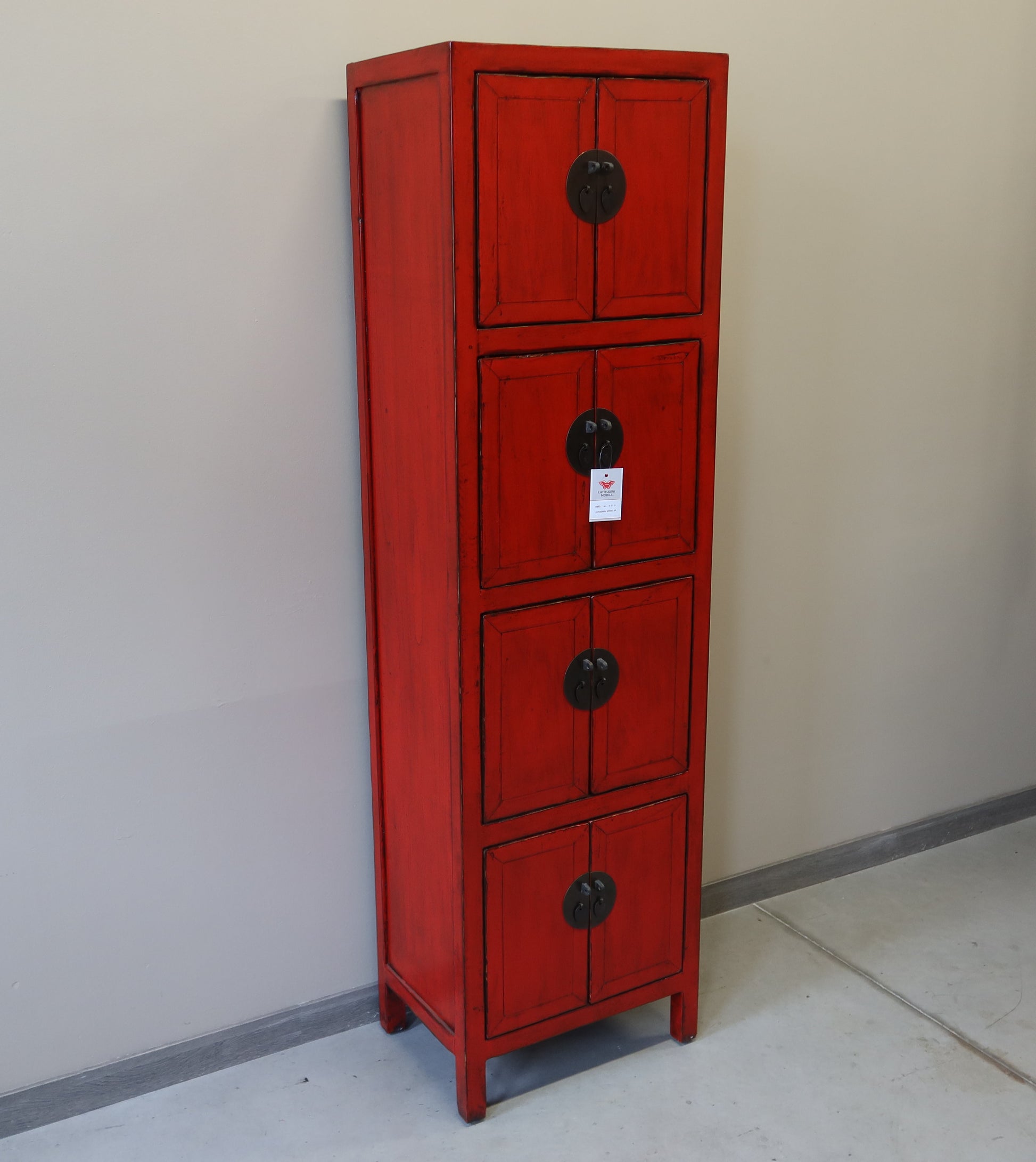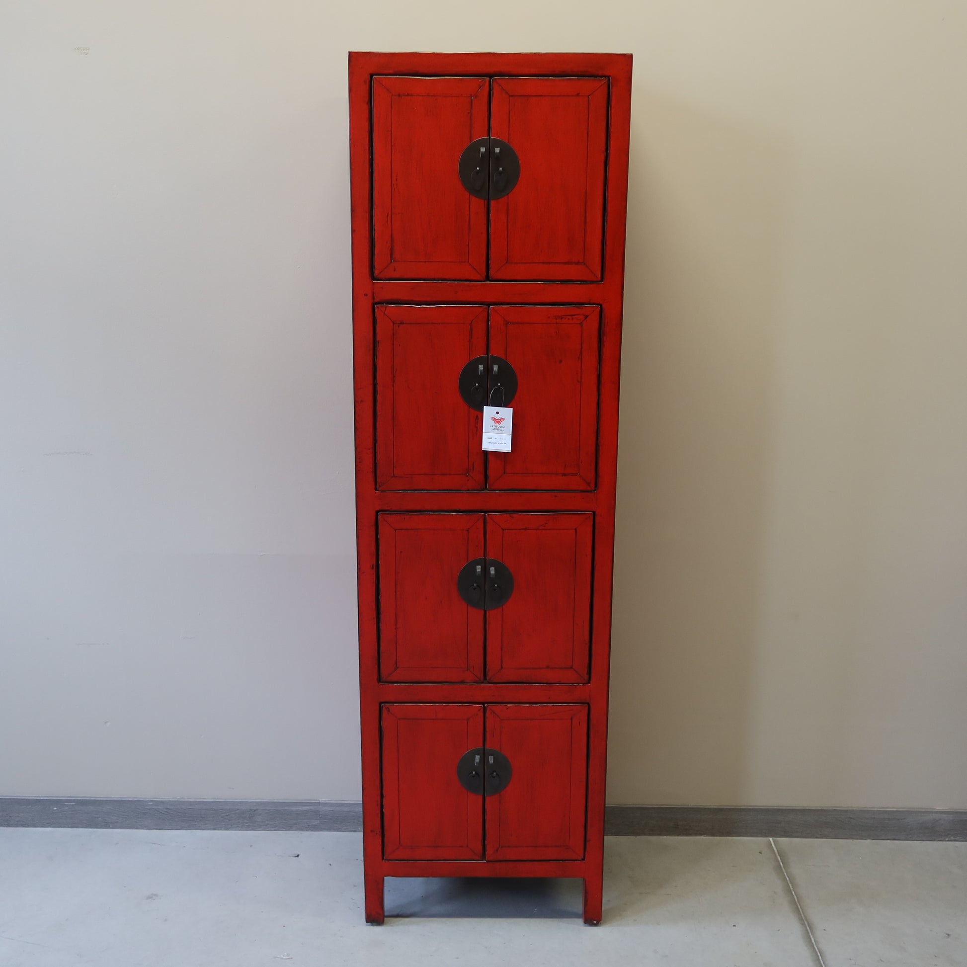 Armadietto cinese stretto a colonna, quattro vani otto antine, pratico e adatto agli ambienti in cui si possa inserire solo un mobile con queste particolari caratteristiche. Sia che venga collocato in ingresso, nel soggiorno, nella camera da letto, o anche nel bagno, porterà la piacevolezza cromatica della finitura in lacca rossa.