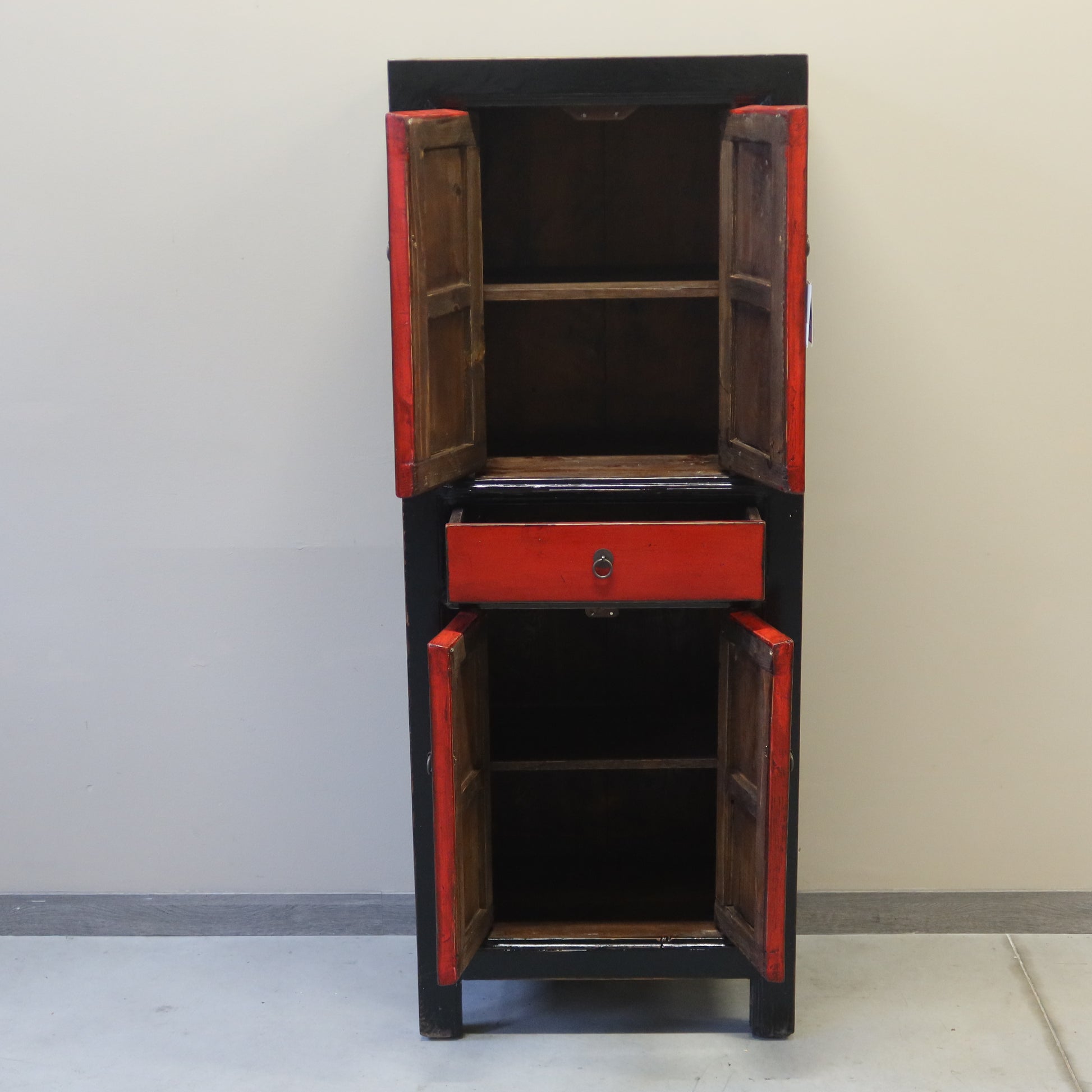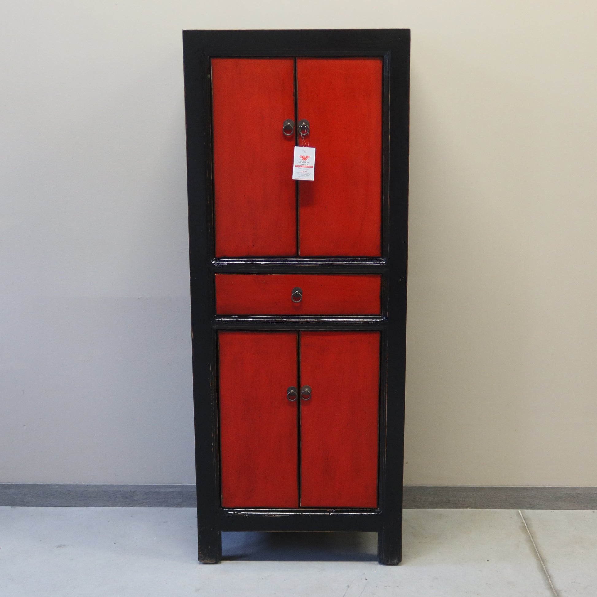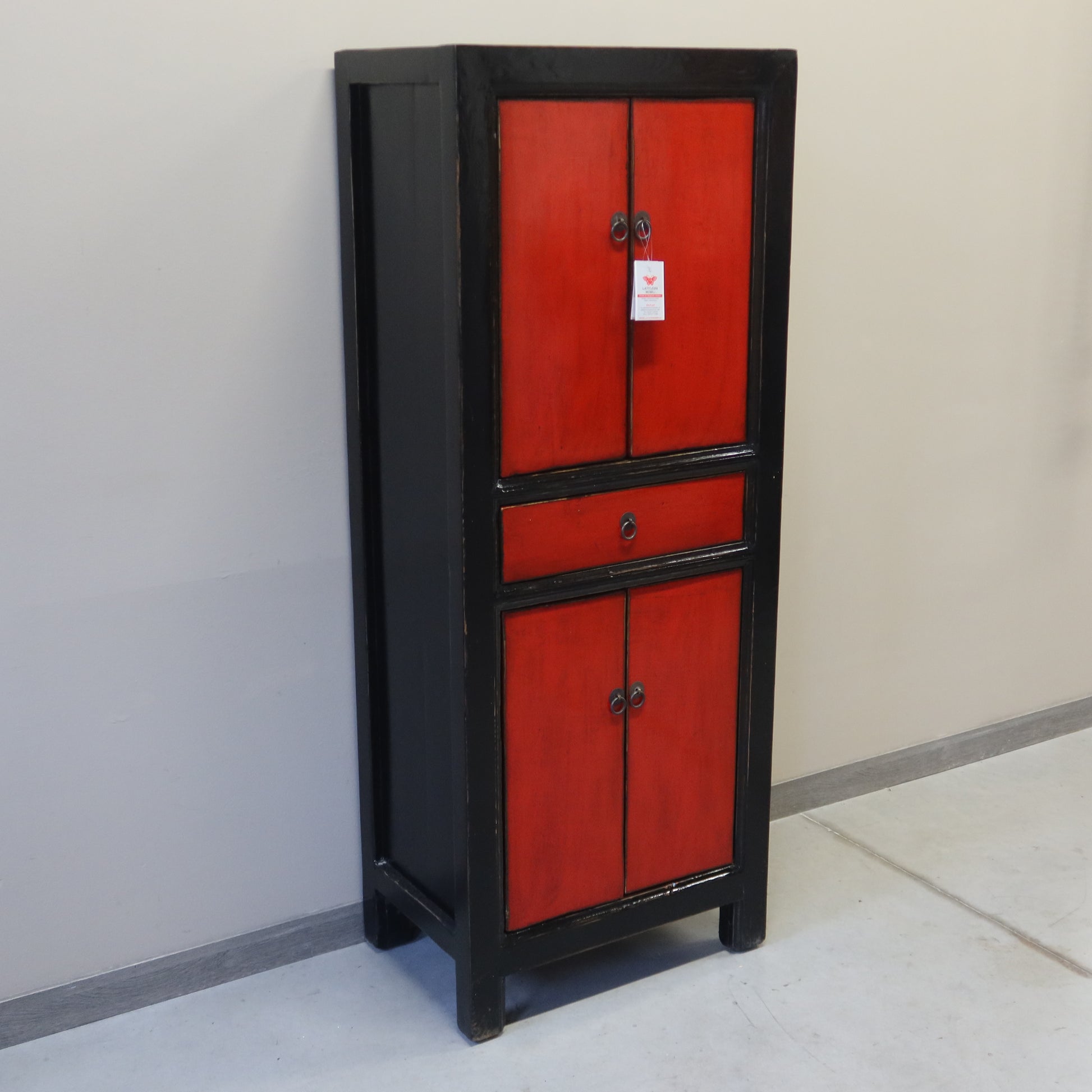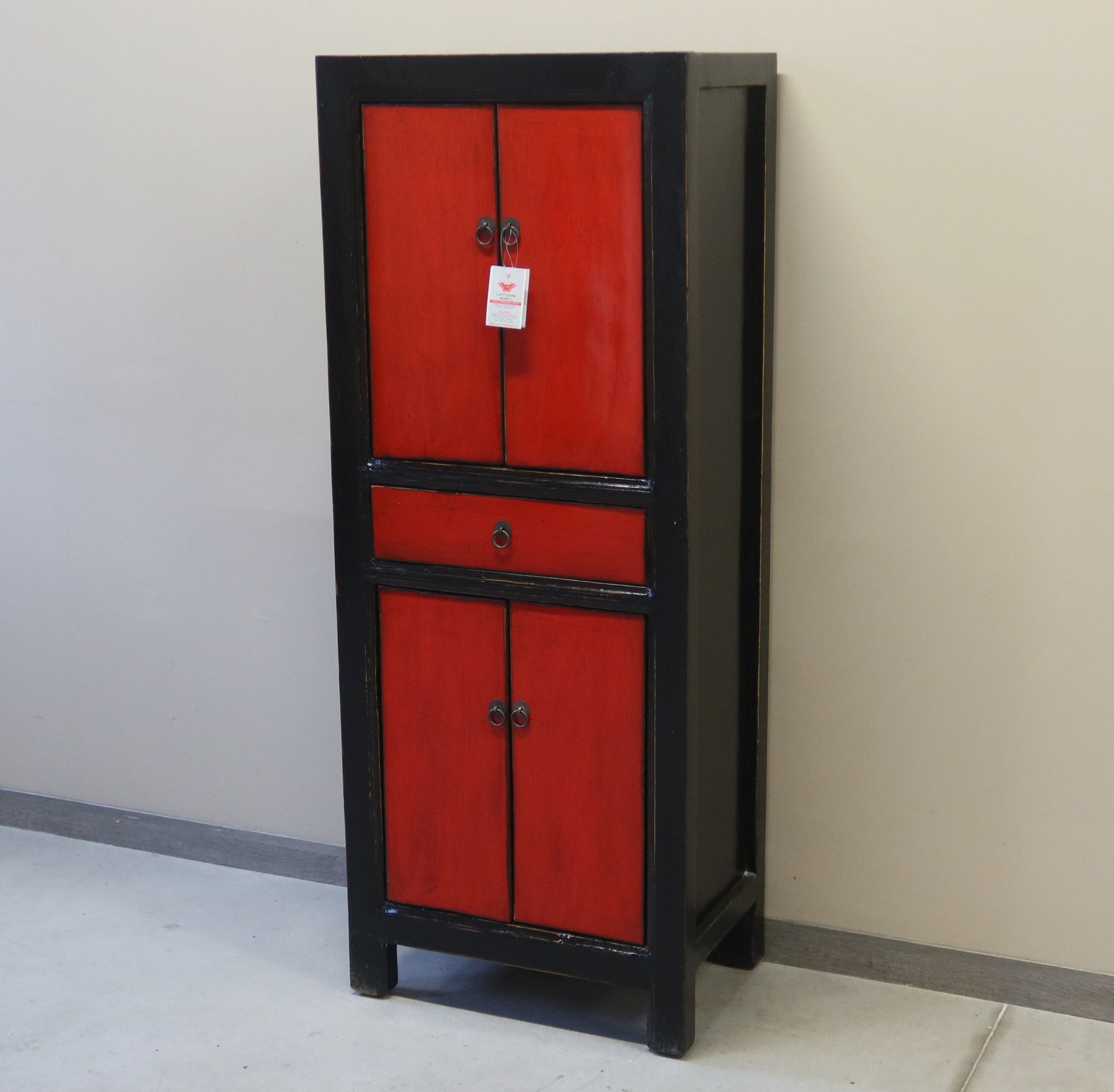 Mobile cinese stretto in lacca, una sorta di armadietto a colonna con due coppie di ante e un cassetto. E' un mobile molto funzionale, e la laccatura bicolore a contrasto anche molto elegante.