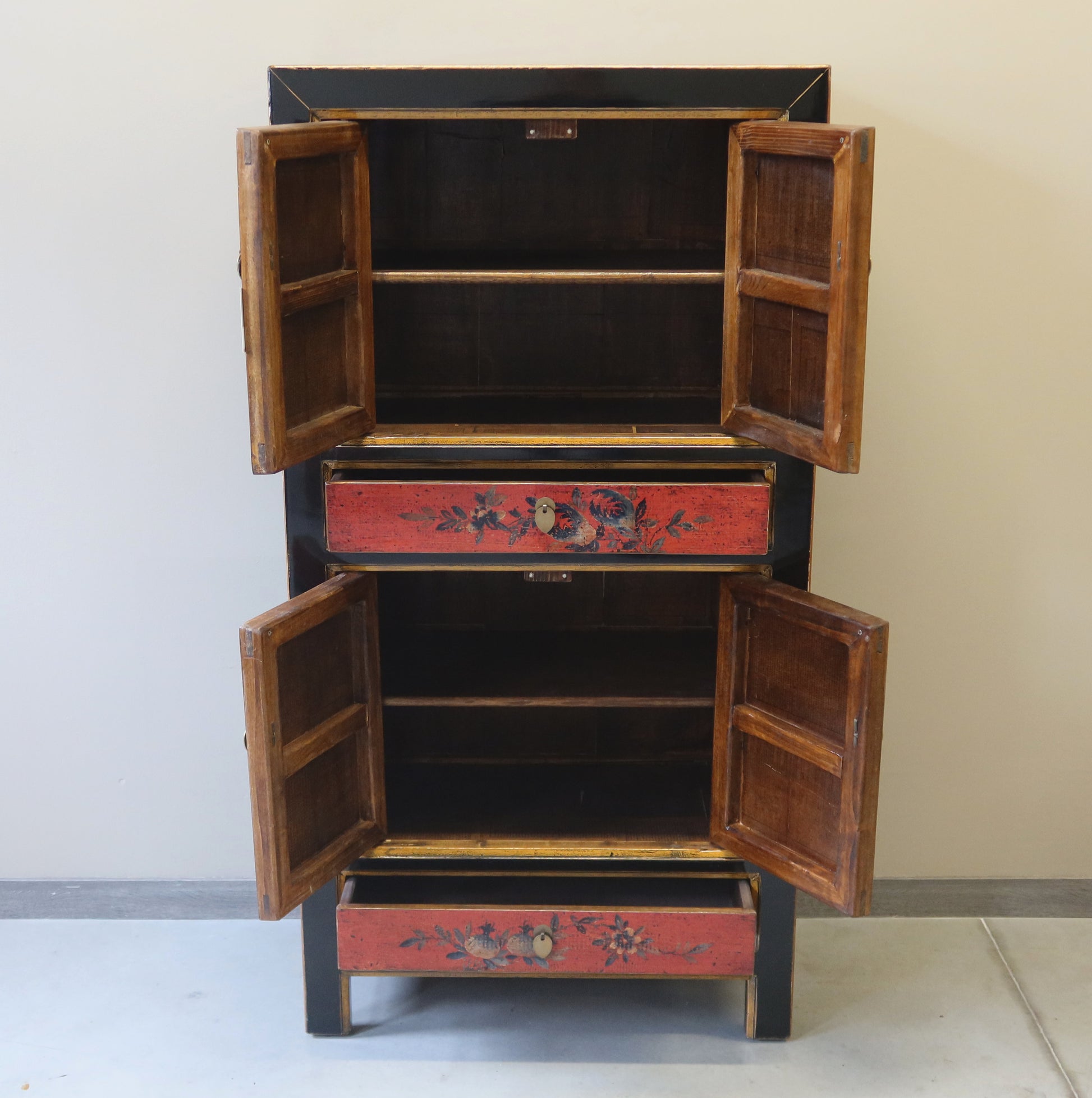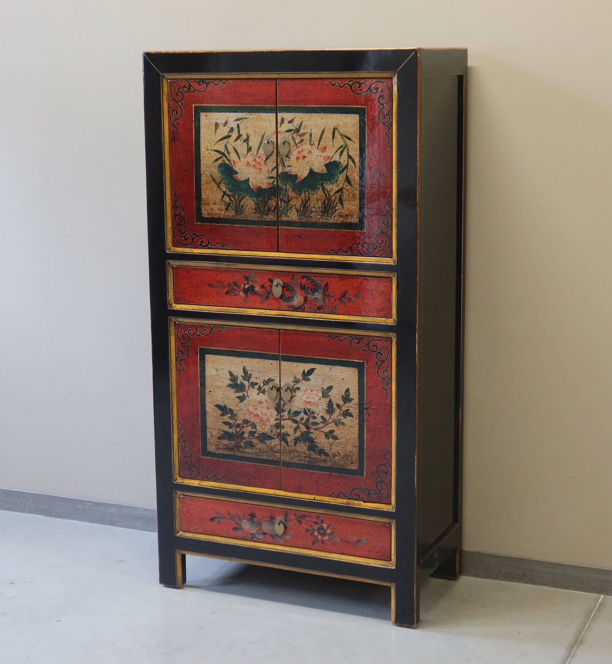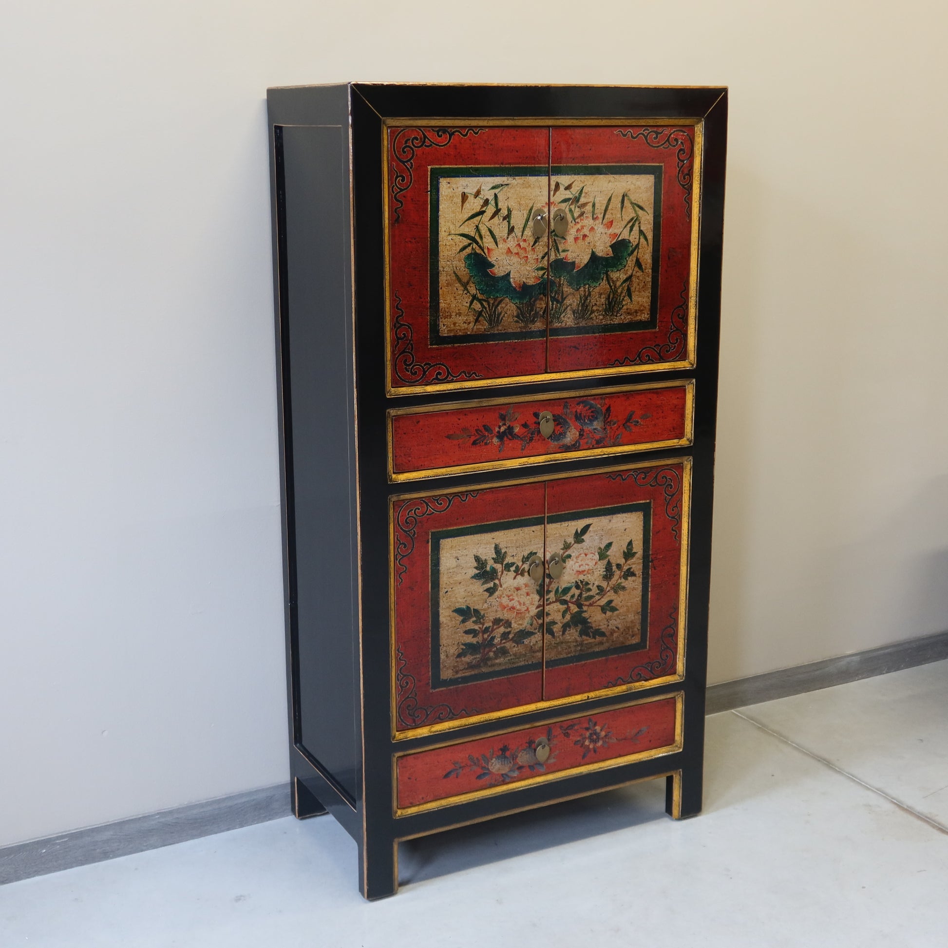 Stretto armadietto a 4 ordini di aperture con una prima coppia di antine, un cassetto, una seconda coppia di antine ed infine un altro cassetto. La struttura è in lacca nera e il fronte è in lacca decorata. Provenienza regione della Mongolia Interna.