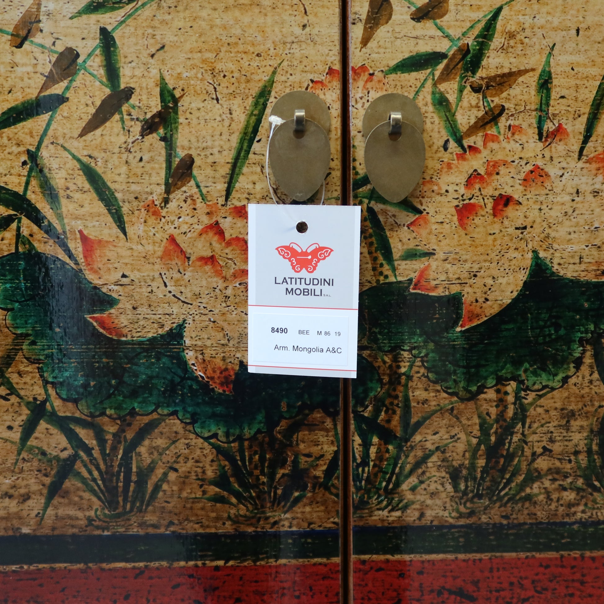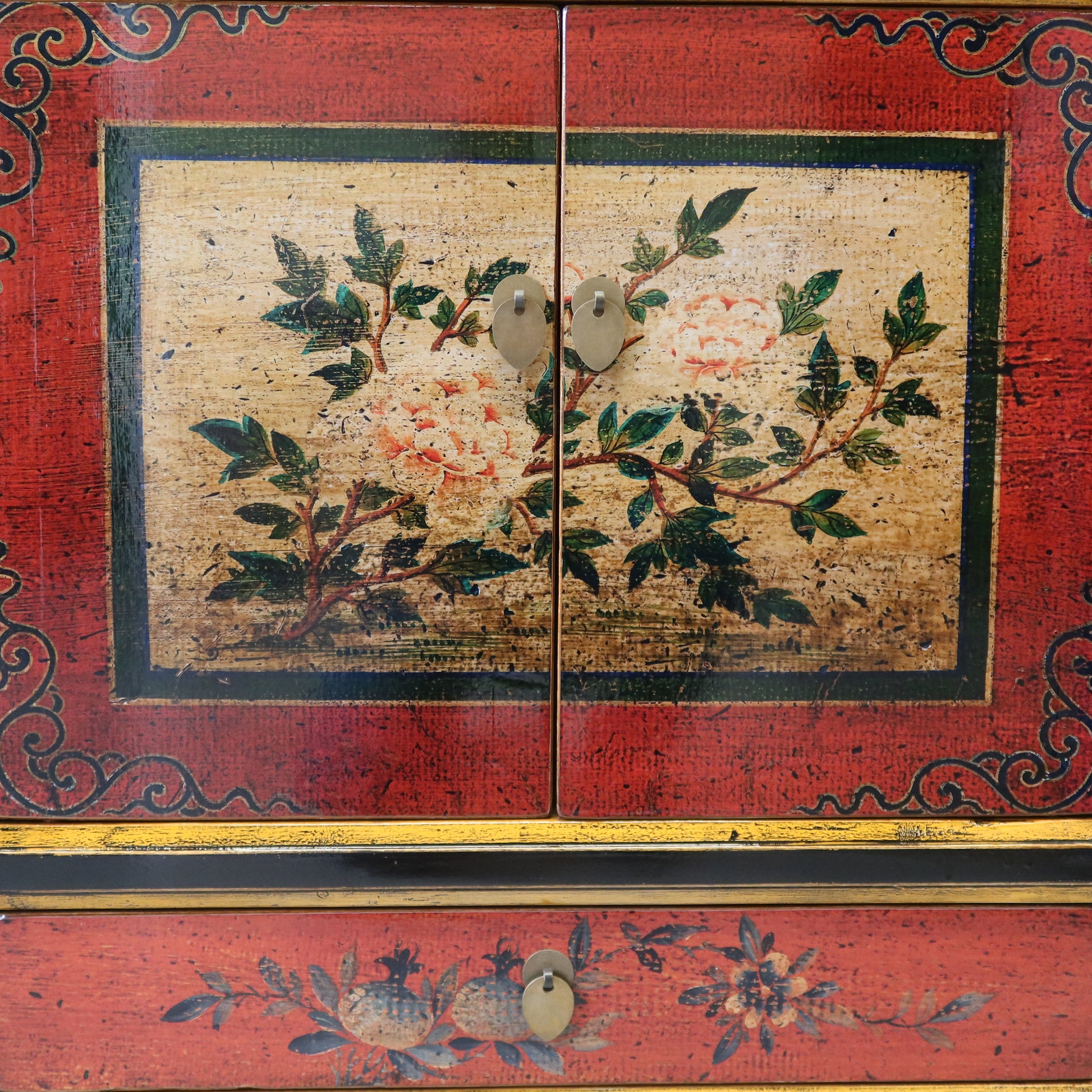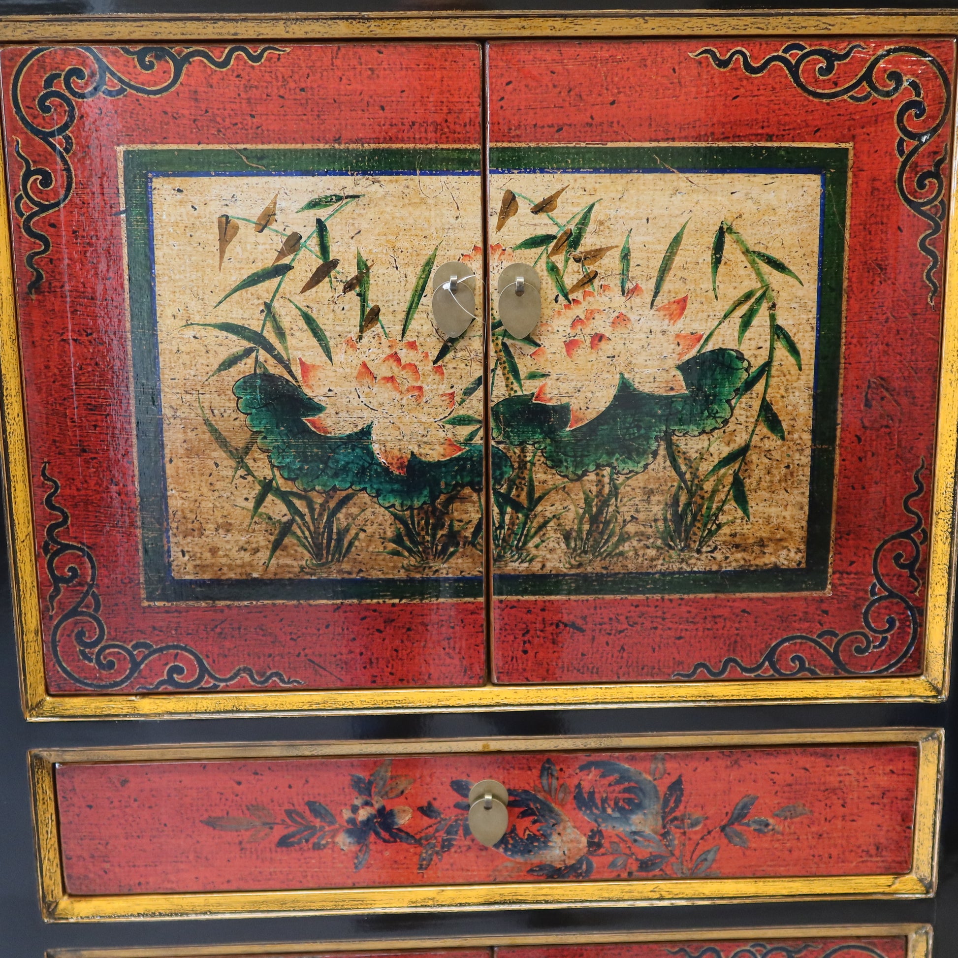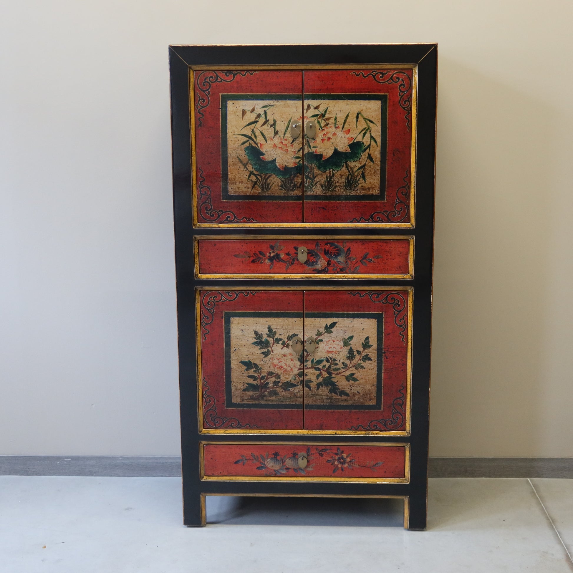 Stretto armadietto a 4 ordini di aperture con una prima coppia di antine, un cassetto, una seconda coppia di antine ed infine un altro cassetto. La struttura è in lacca nera e il fronte è in lacca decorata. Provenienza regione della Mongolia Interna.