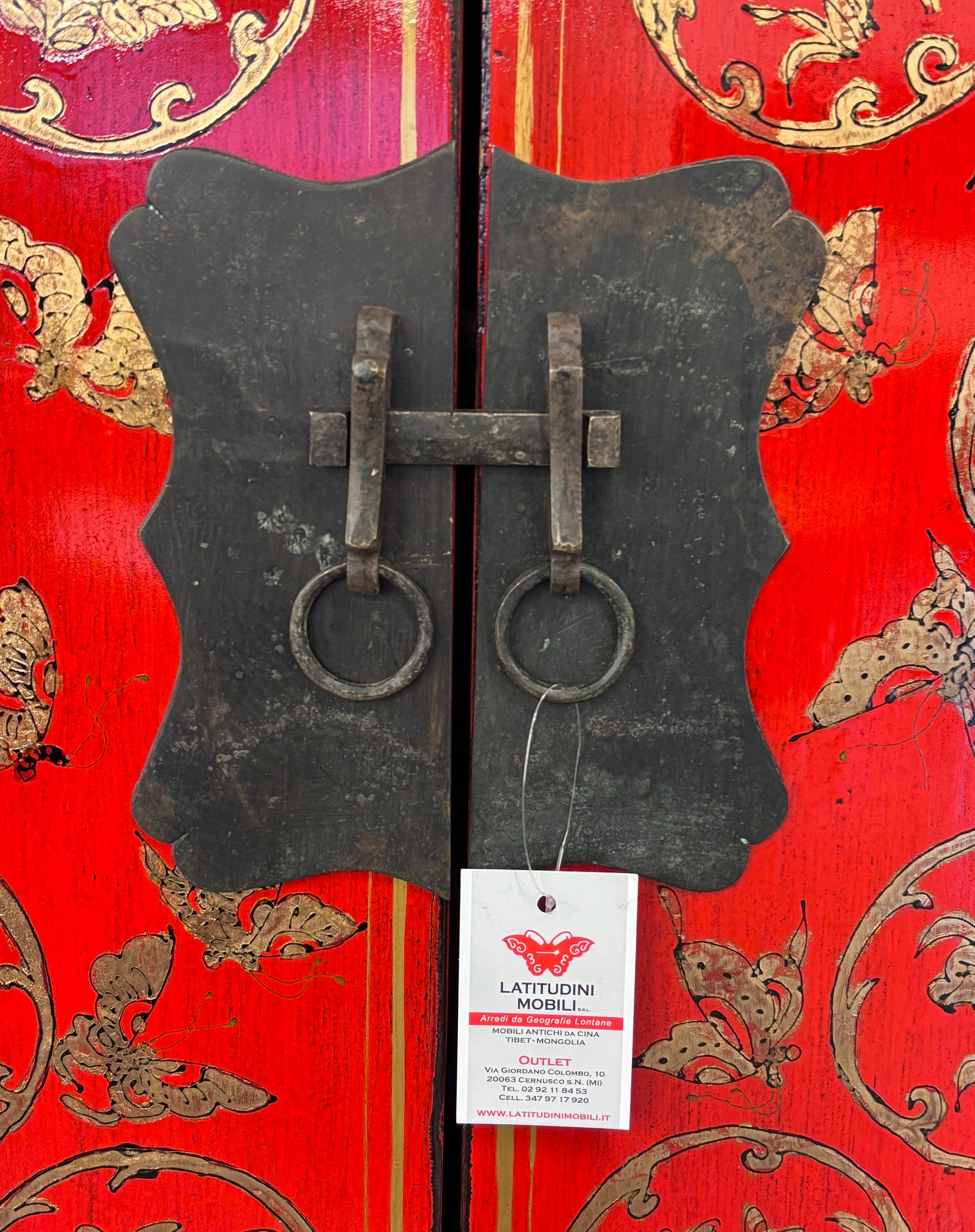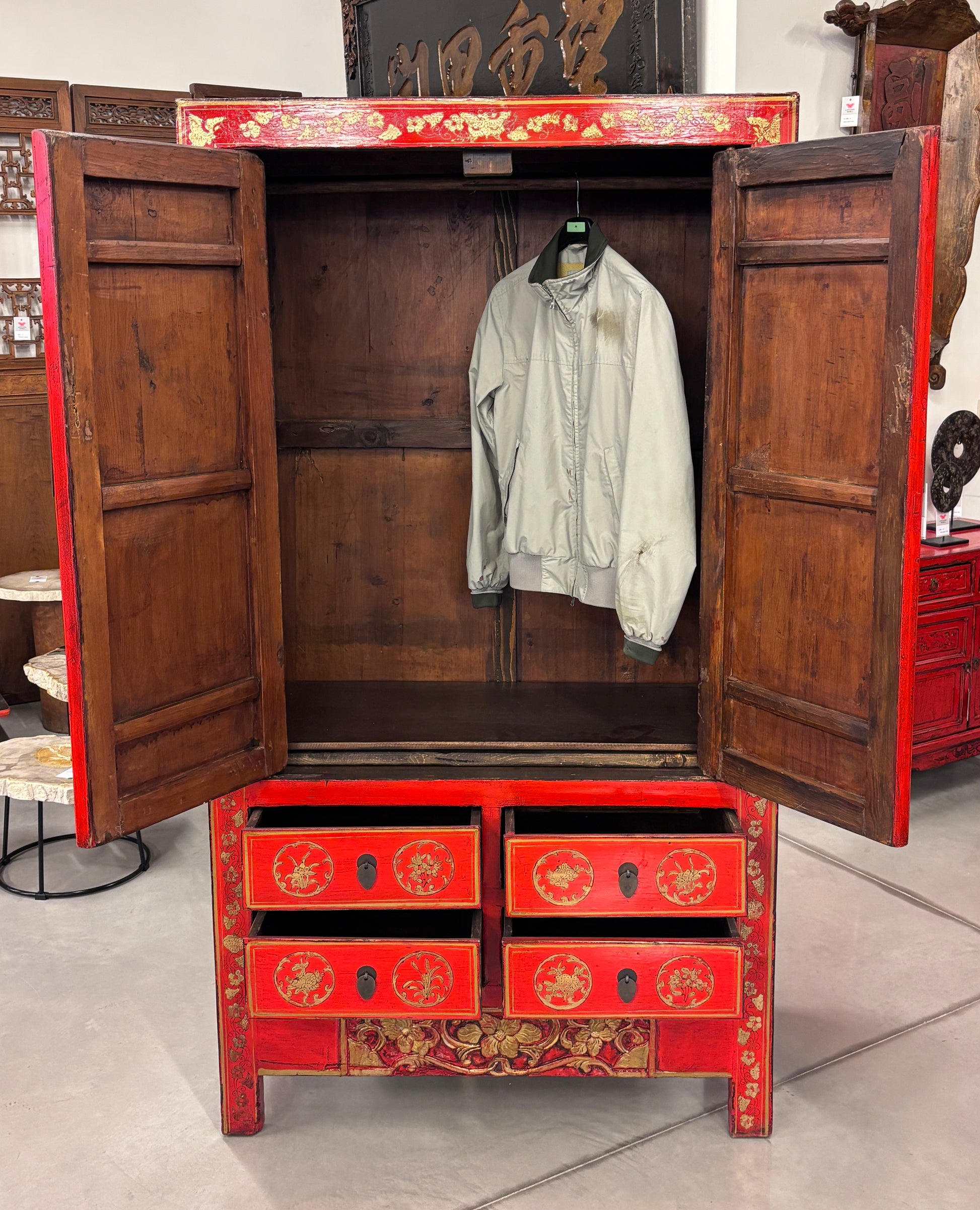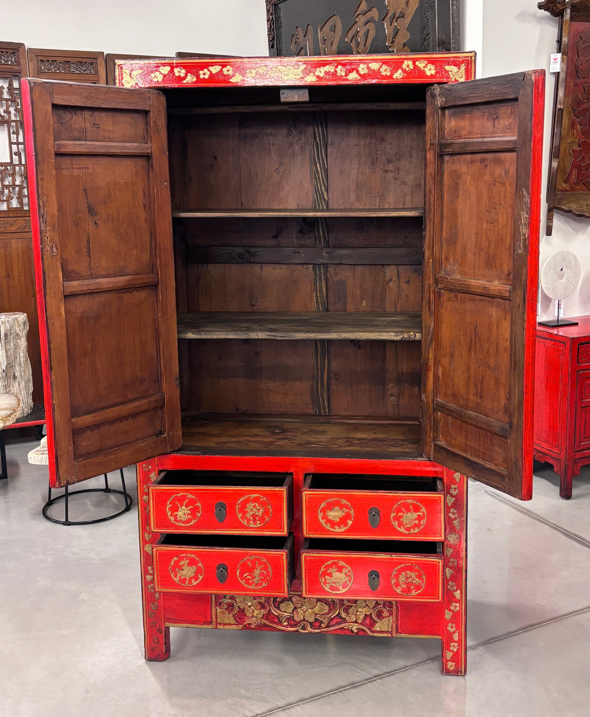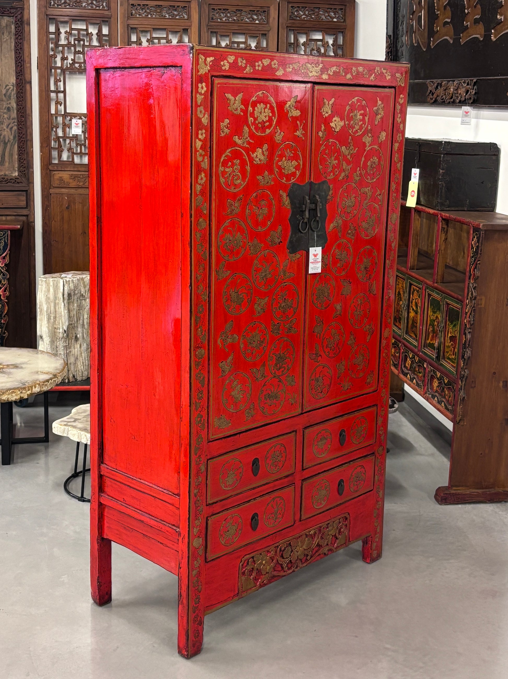 Armadio a doppia anta e 4 cassetti in lacca rossa con caratteristico decoro in oro. Le ante sono decorate anche da importante metalleria centrale. Provenienza regione dello Shanxi.