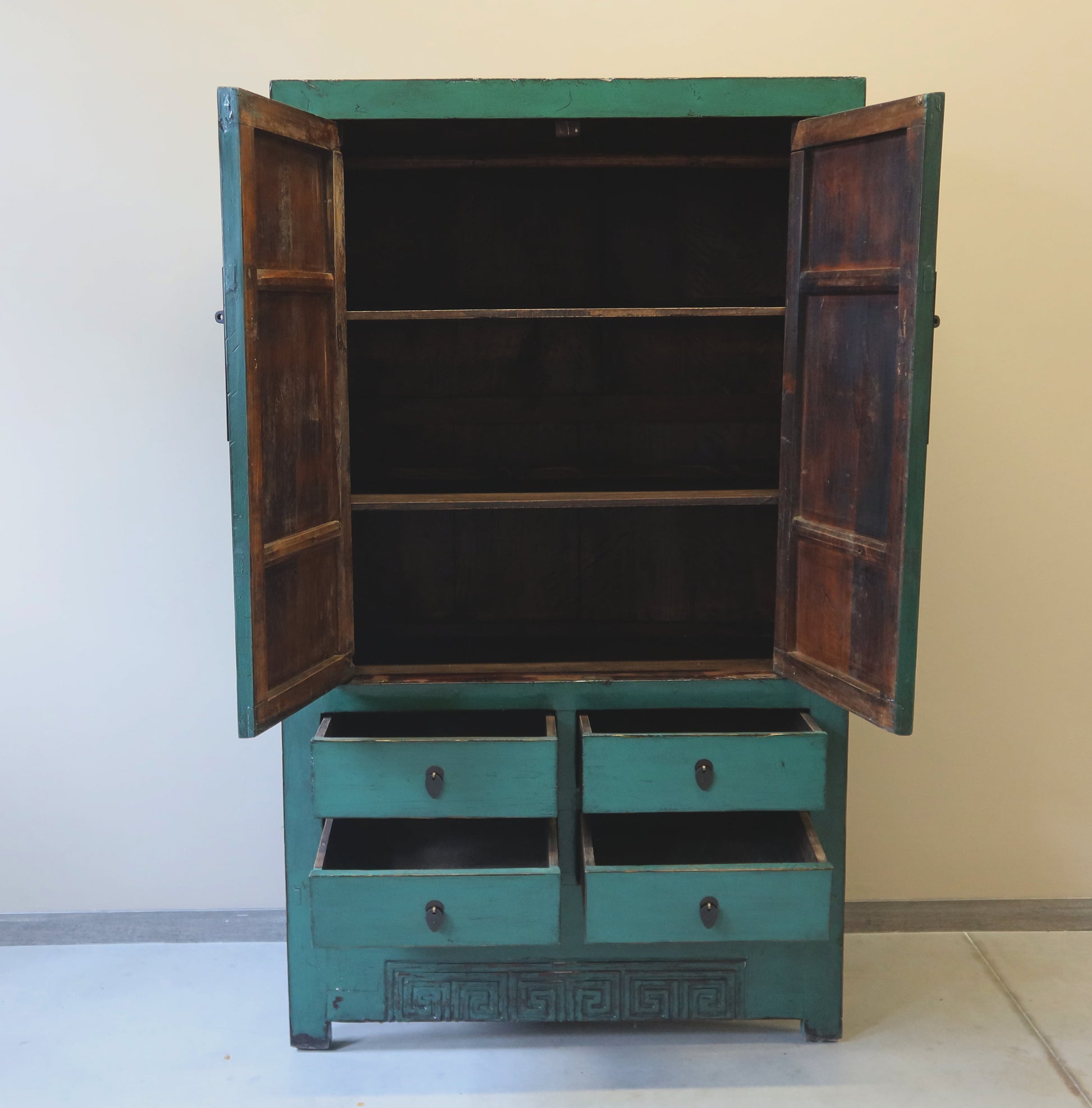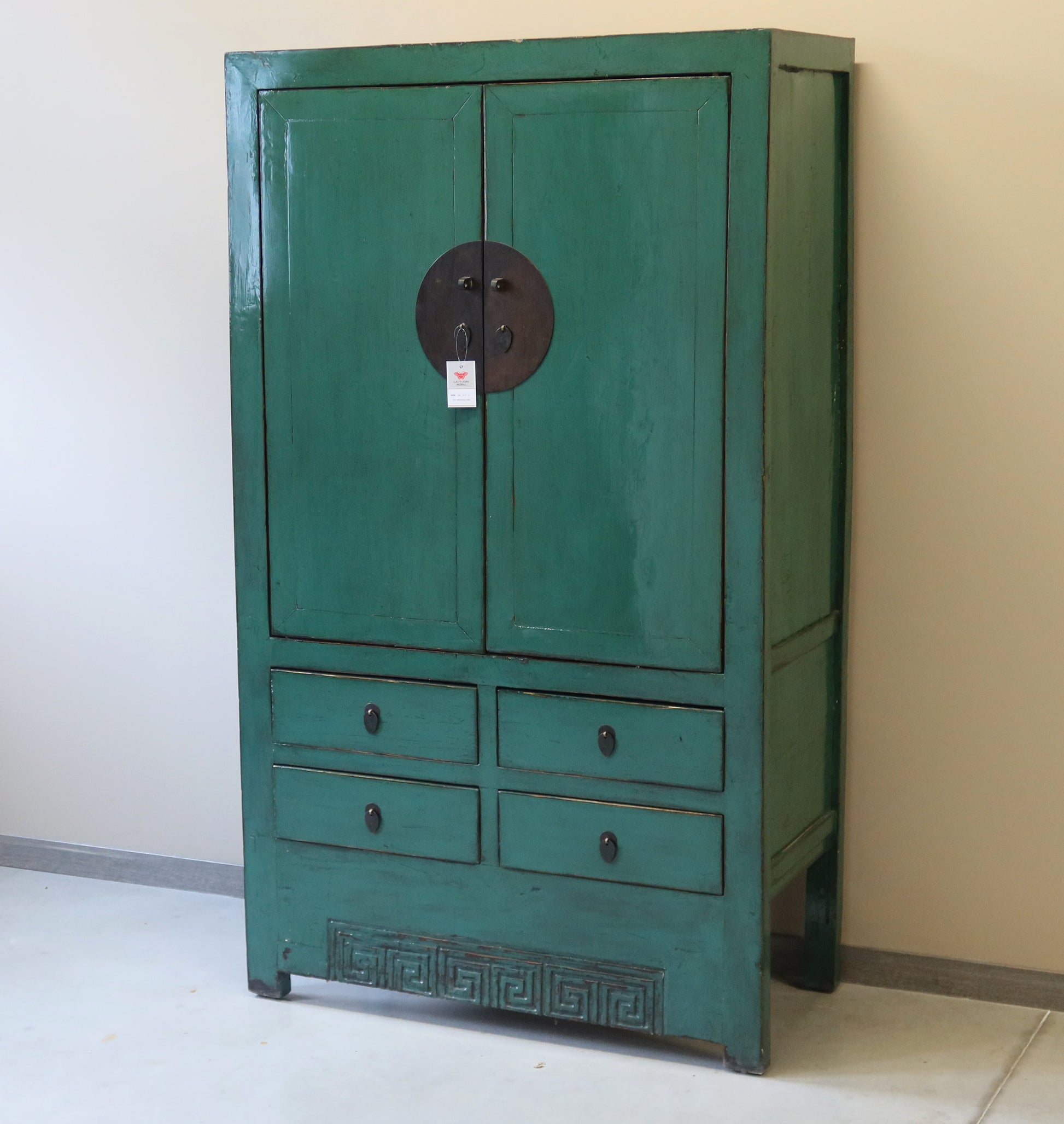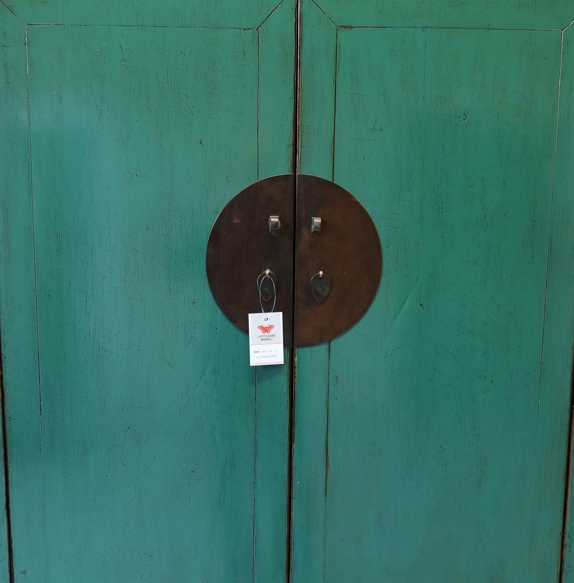 Particolare laccatura verde-malachite rende affascinante e meno comune fra le laccature dei mobili cinesi. Questo mobile a doppia anta e quattro cassetti è un pezzo unico che costituisce un raro esempio di armadio in questa tonalità.