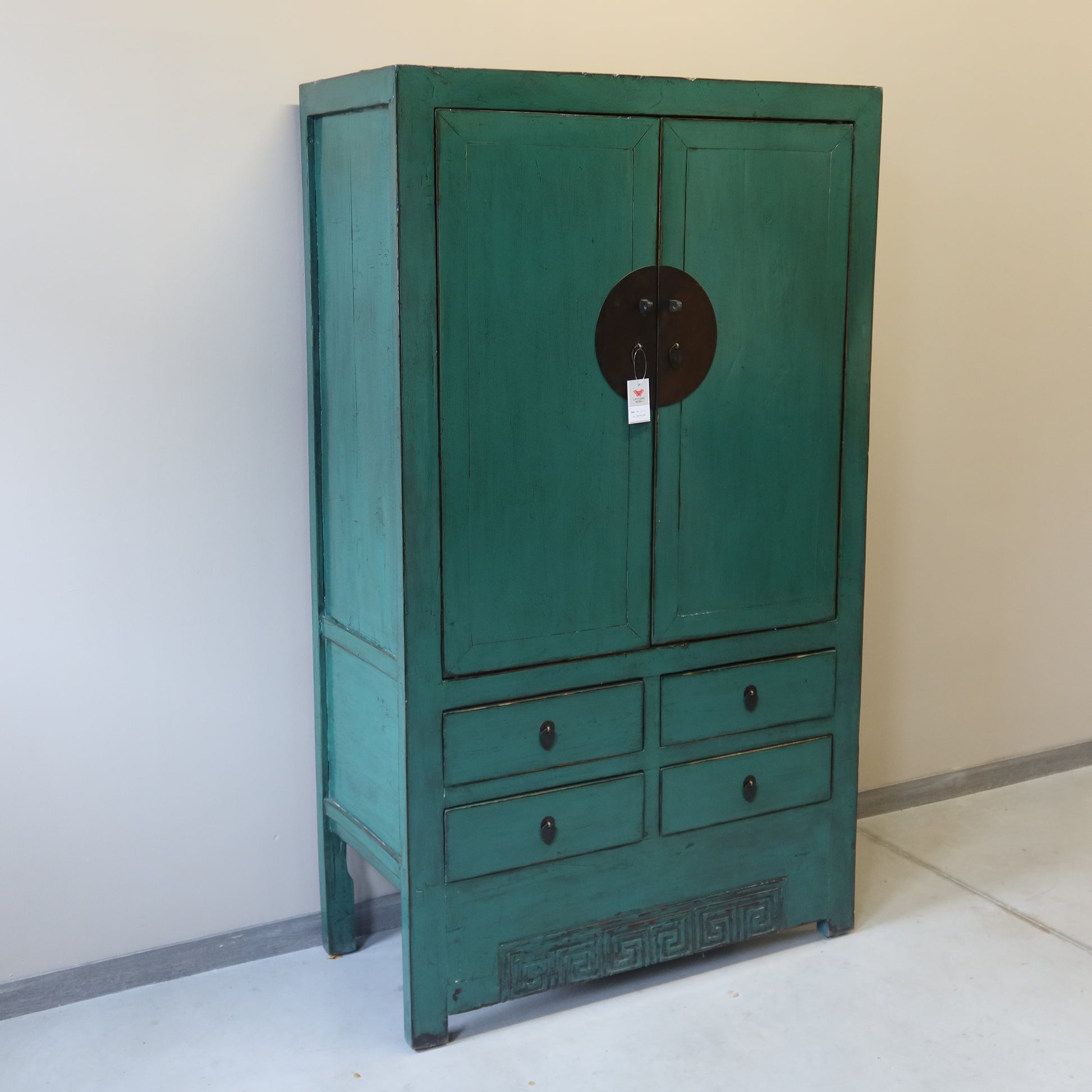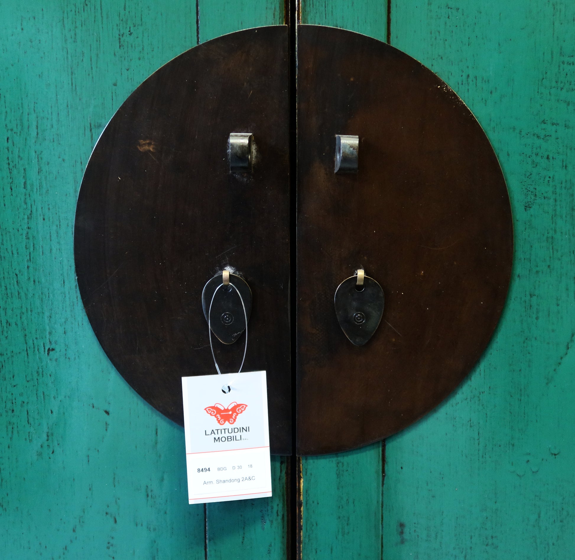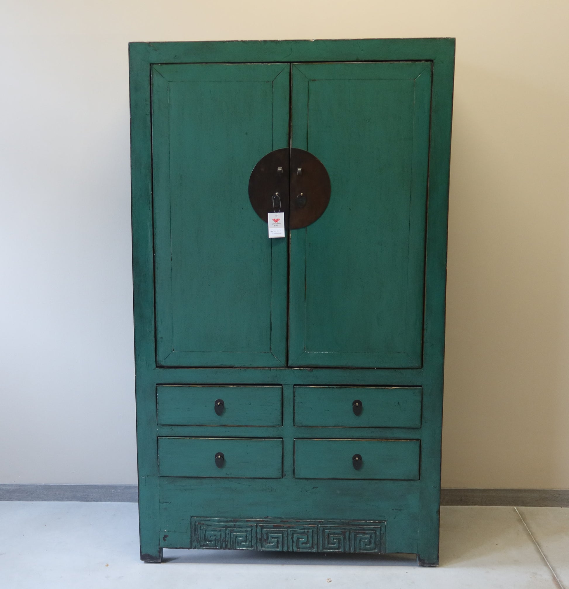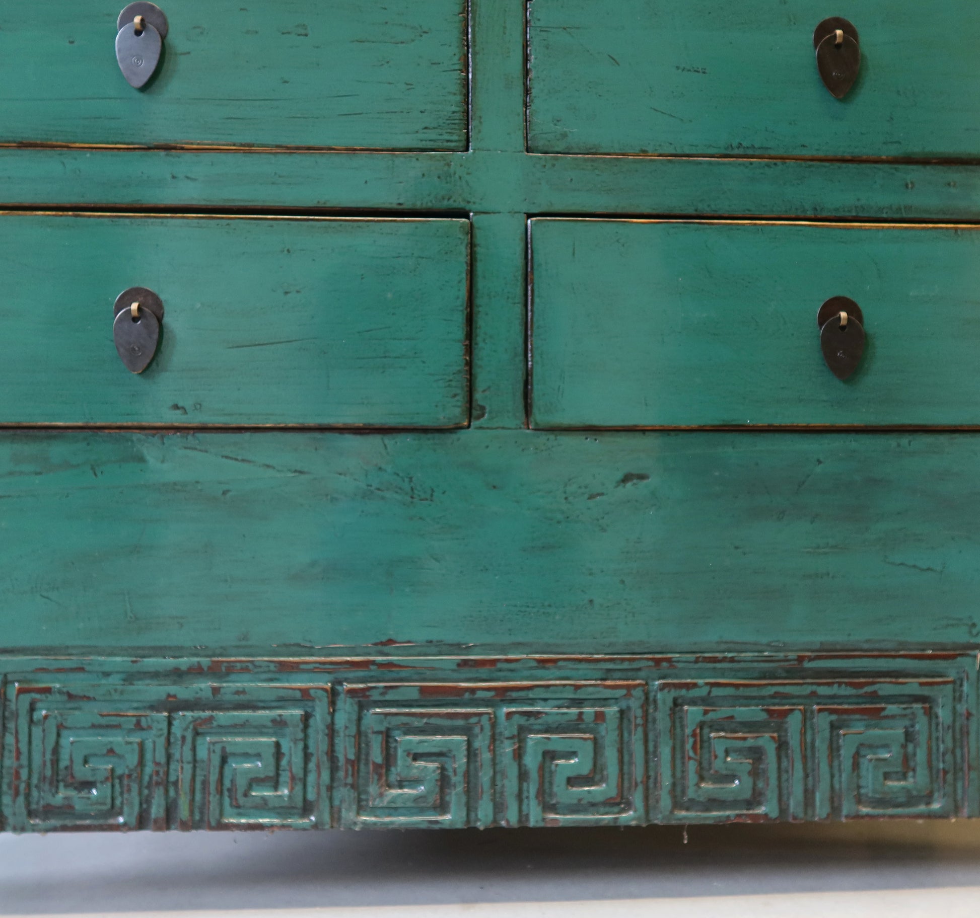 Particolare laccatura verde-malachite rende affascinante e meno comune fra le laccature dei mobili cinesi. Questo mobile a doppia anta e quattro cassetti è un pezzo unico che costituisce un raro esempio di armadio in questa tonalità.