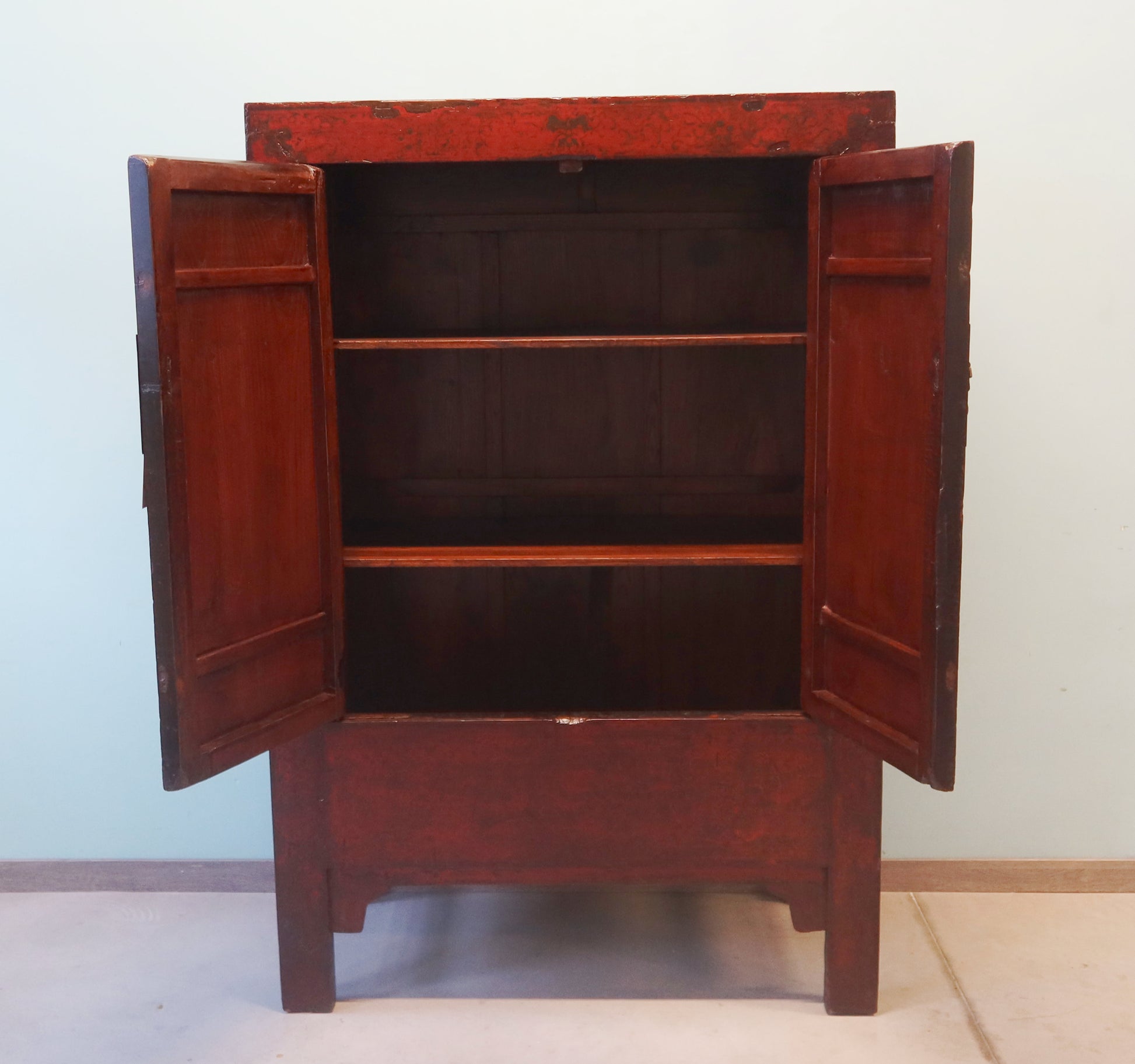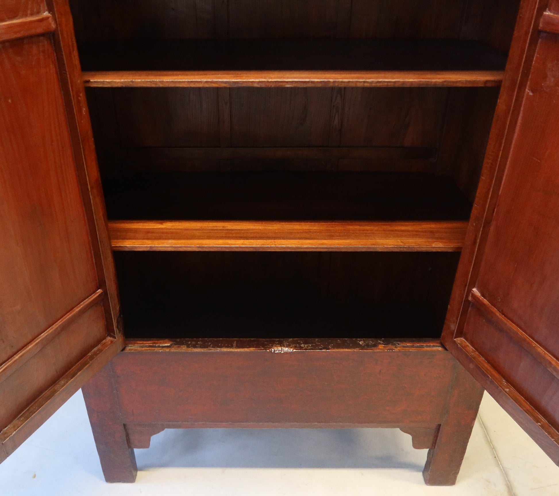 Splendido armadio in patina originale in lacca rossa con decoro lieve: provenienza regione dello Shanxi