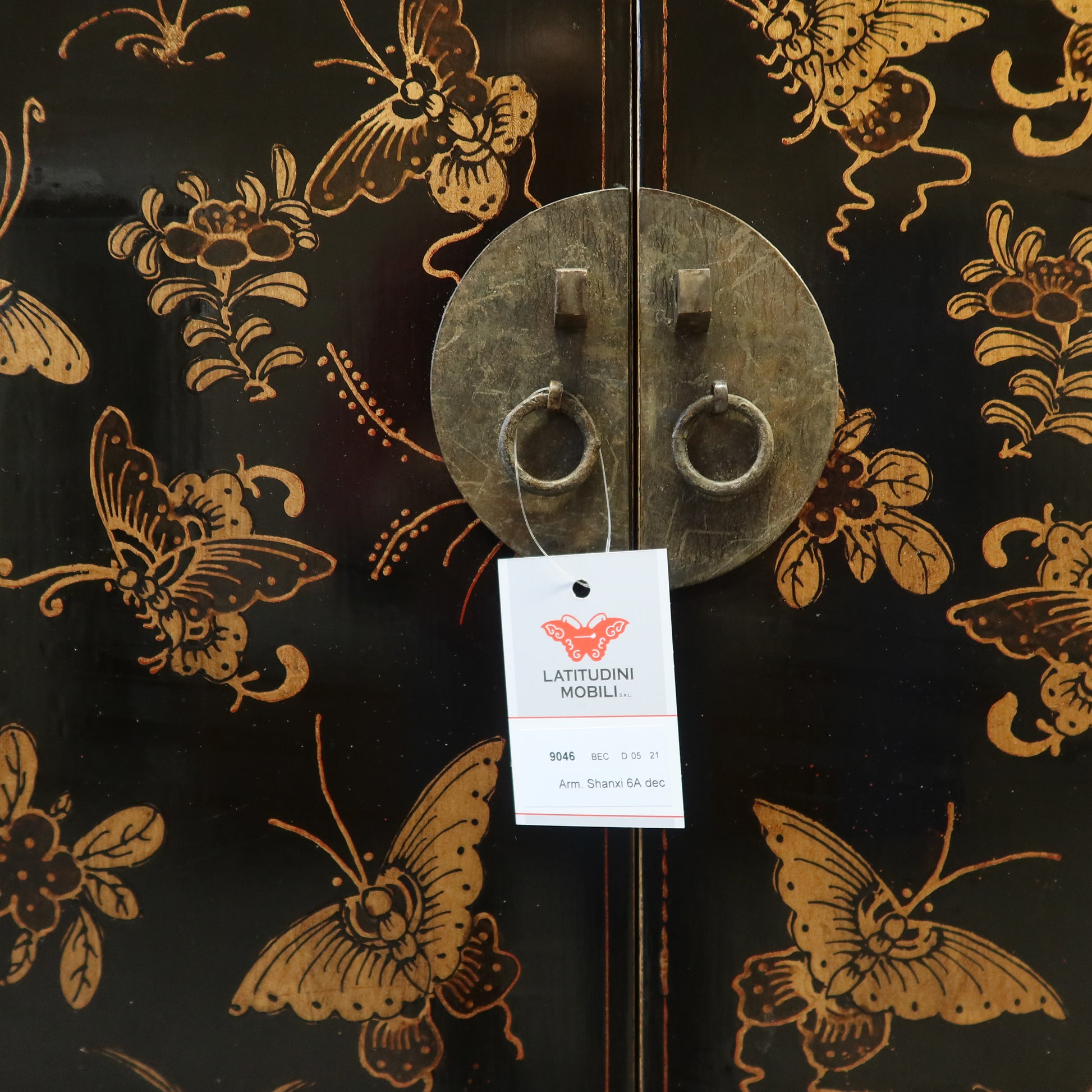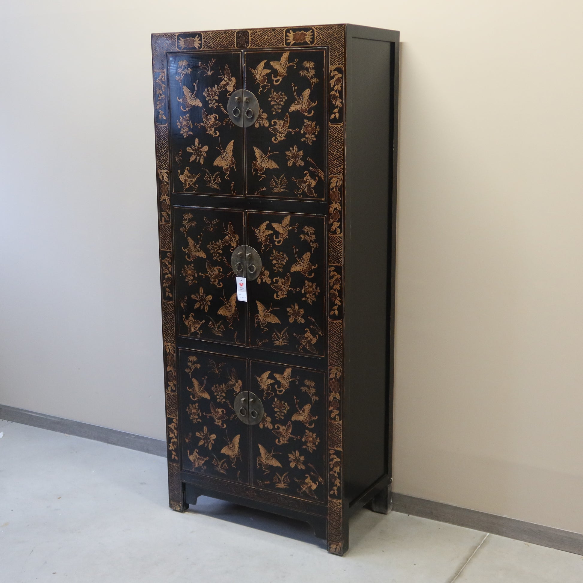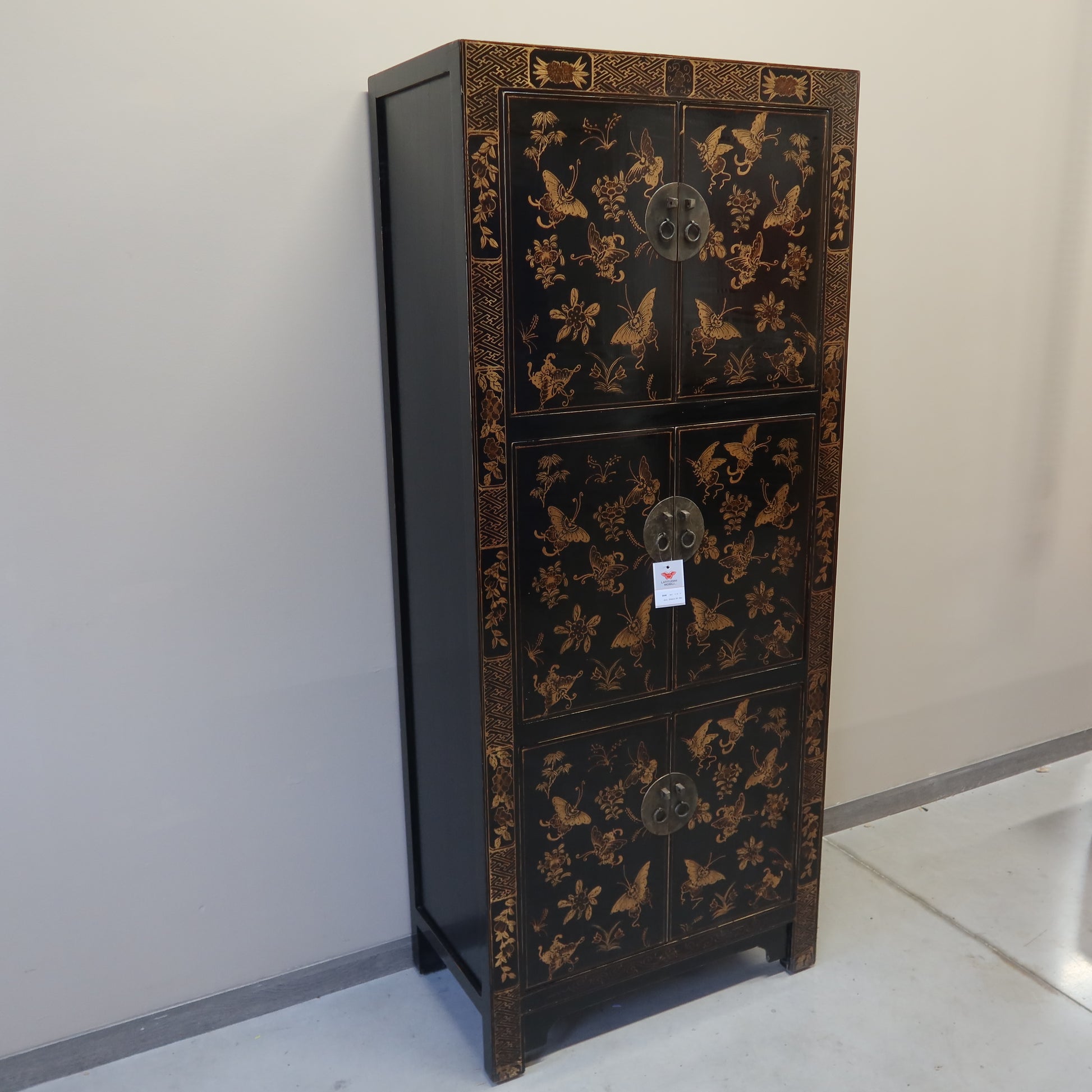 Particolare armadio cinese, stretto e alto, proveniente dalla regione dello Shanxi. La struttura di questo mobile a colonna è a tre vani, ciascuno chiuso da doppia anta. Molto bella la finitura in lacca nera con decori dorati, che conferiscono al mobile una particolare eleganza.