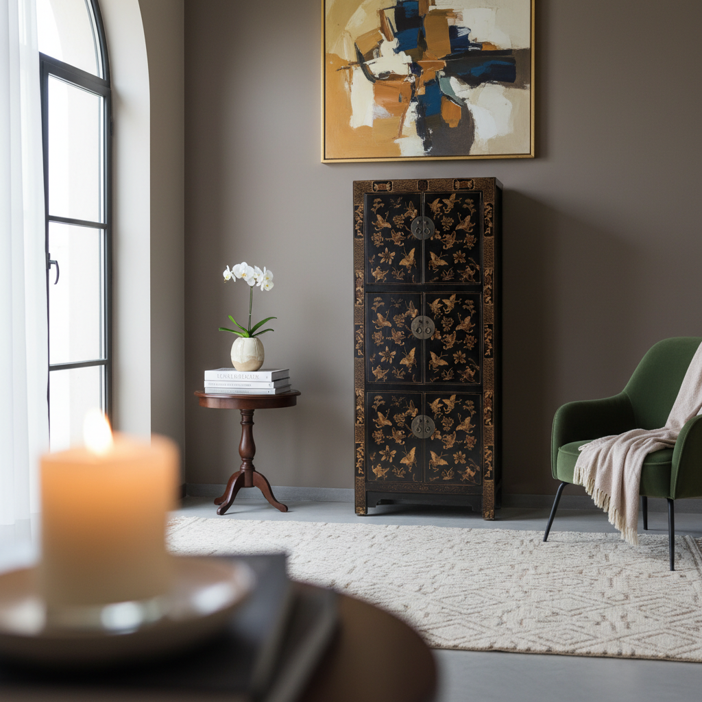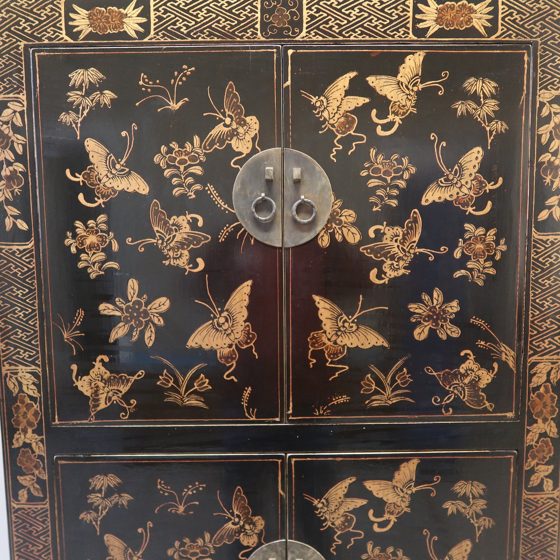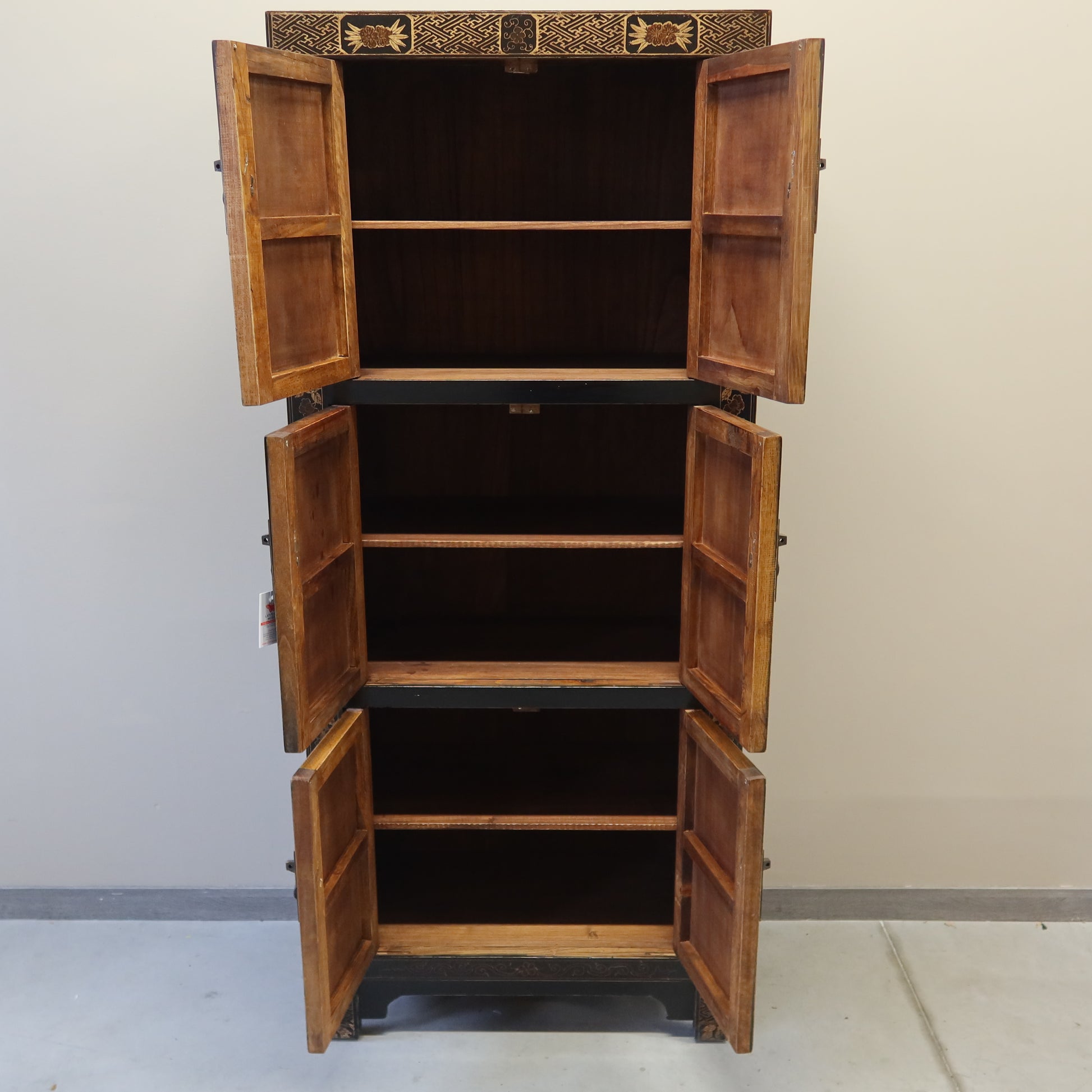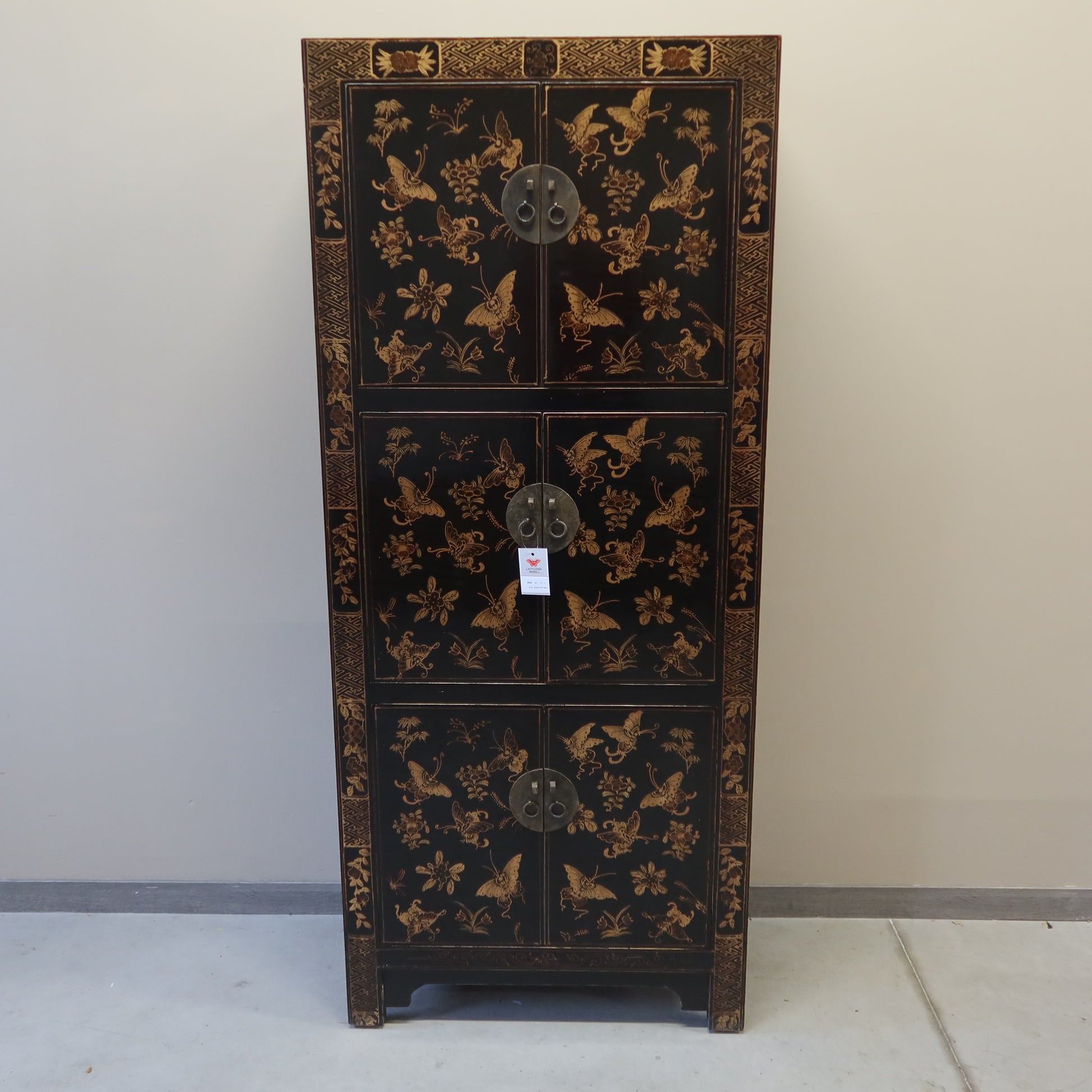 Particolare armadio cinese, stretto e alto, proveniente dalla regione dello Shanxi. La struttura di questo mobile a colonna è a tre vani, ciascuno chiuso da doppia anta. Molto bella la finitura in lacca nera con decori dorati, che conferiscono al mobile una particolare eleganza.
