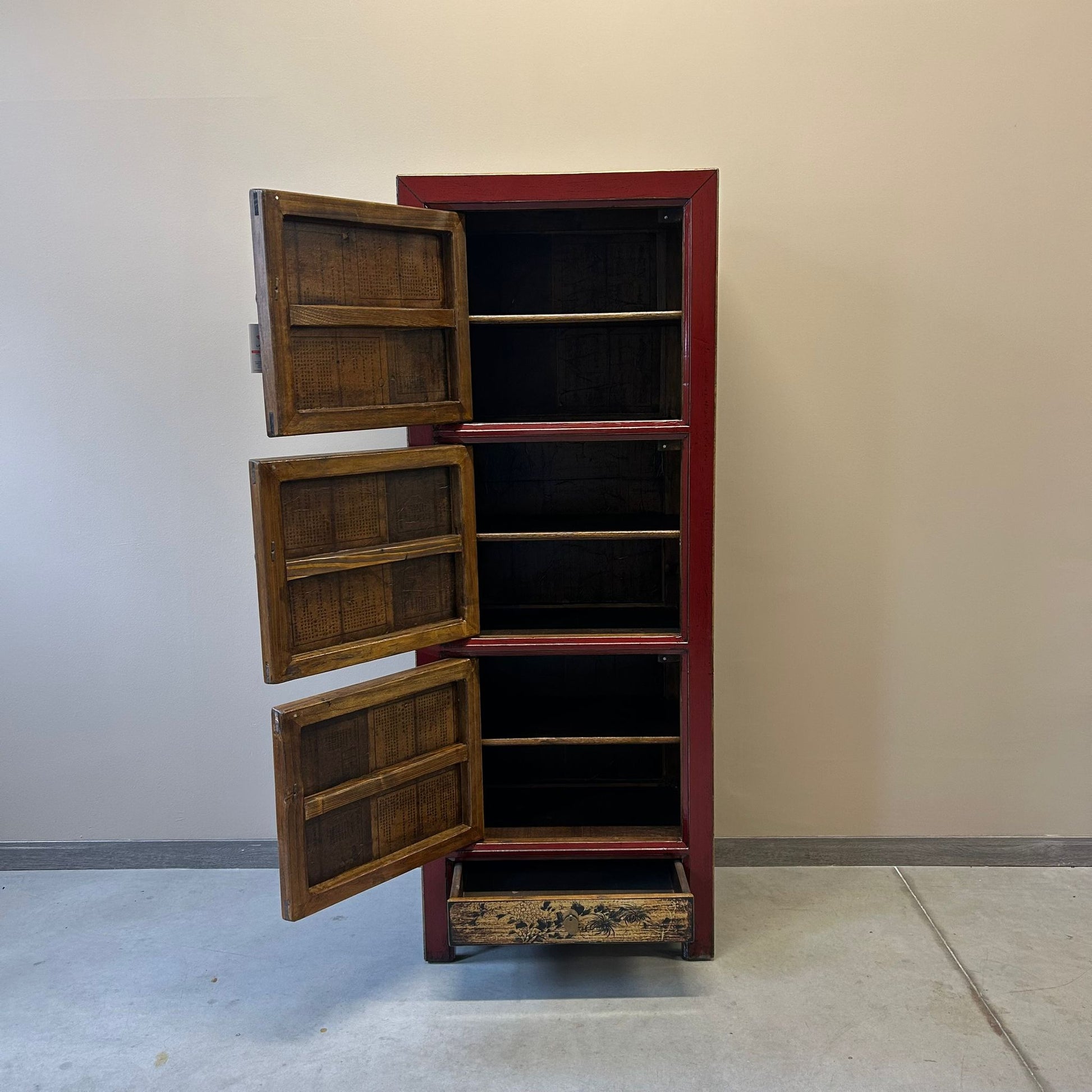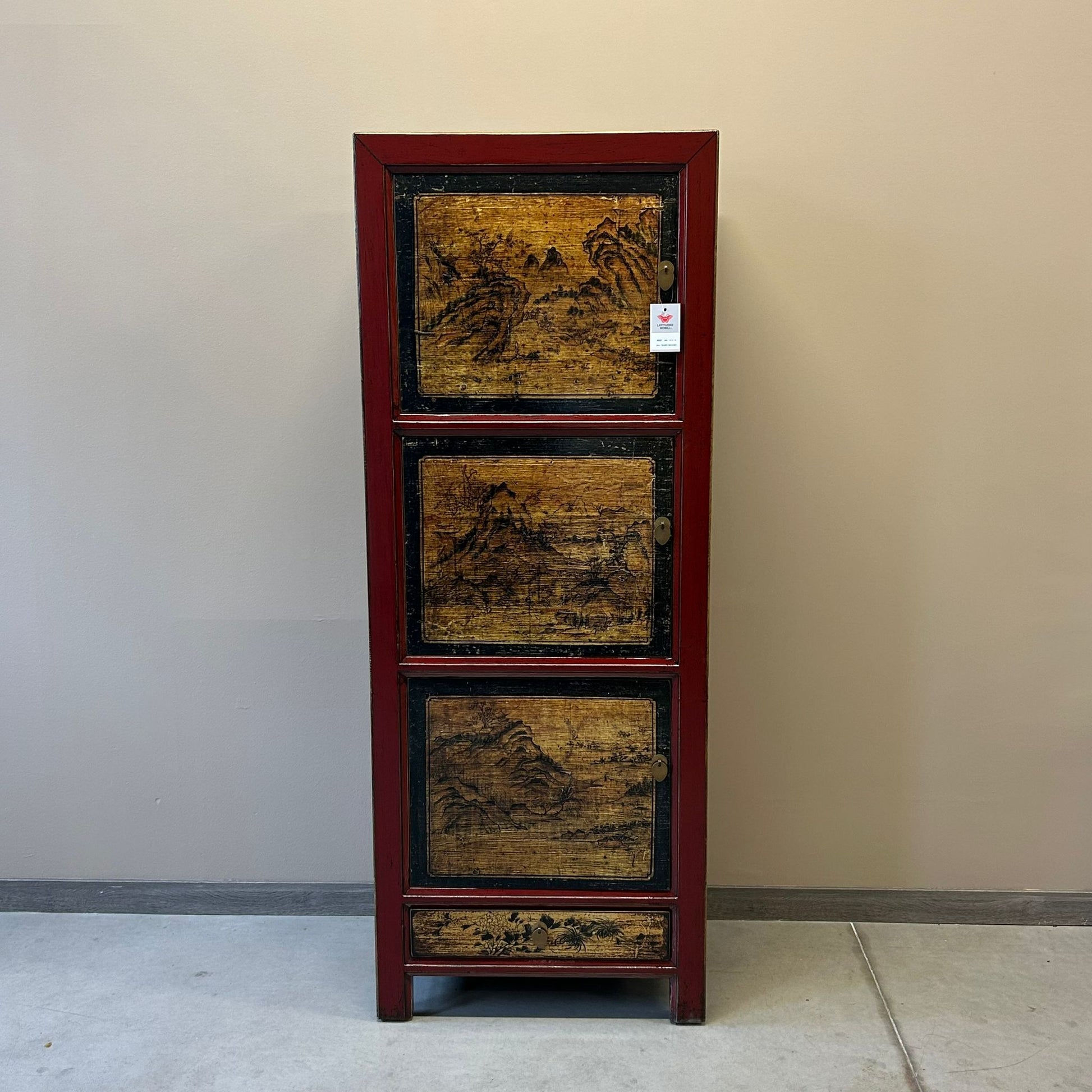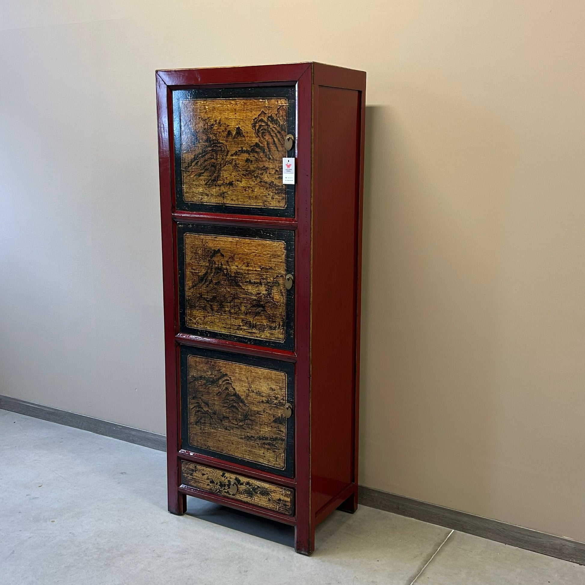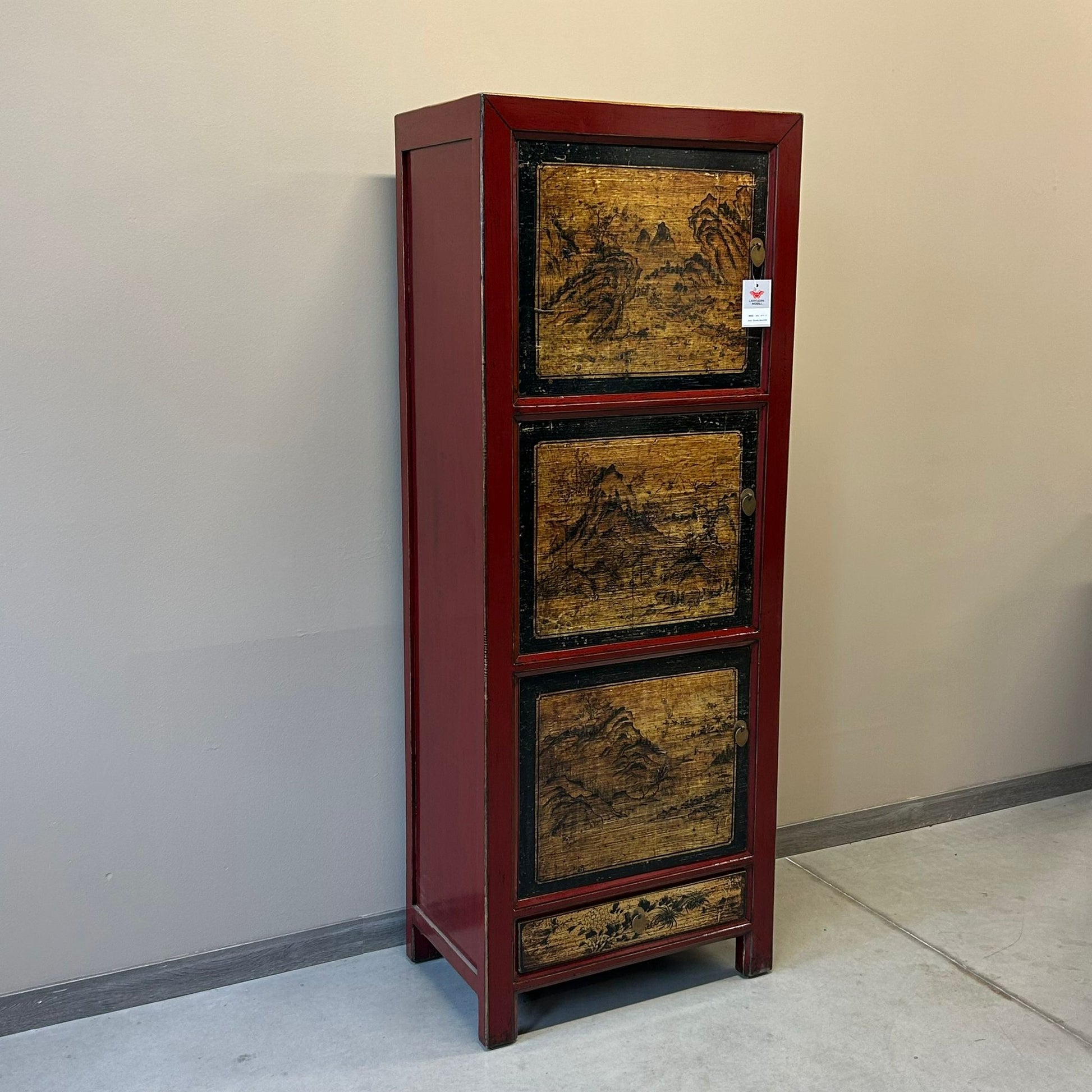 Stretto armadio etnico decorato con tre vani di apertura a pannello e cassetto nella fascia inferiore.