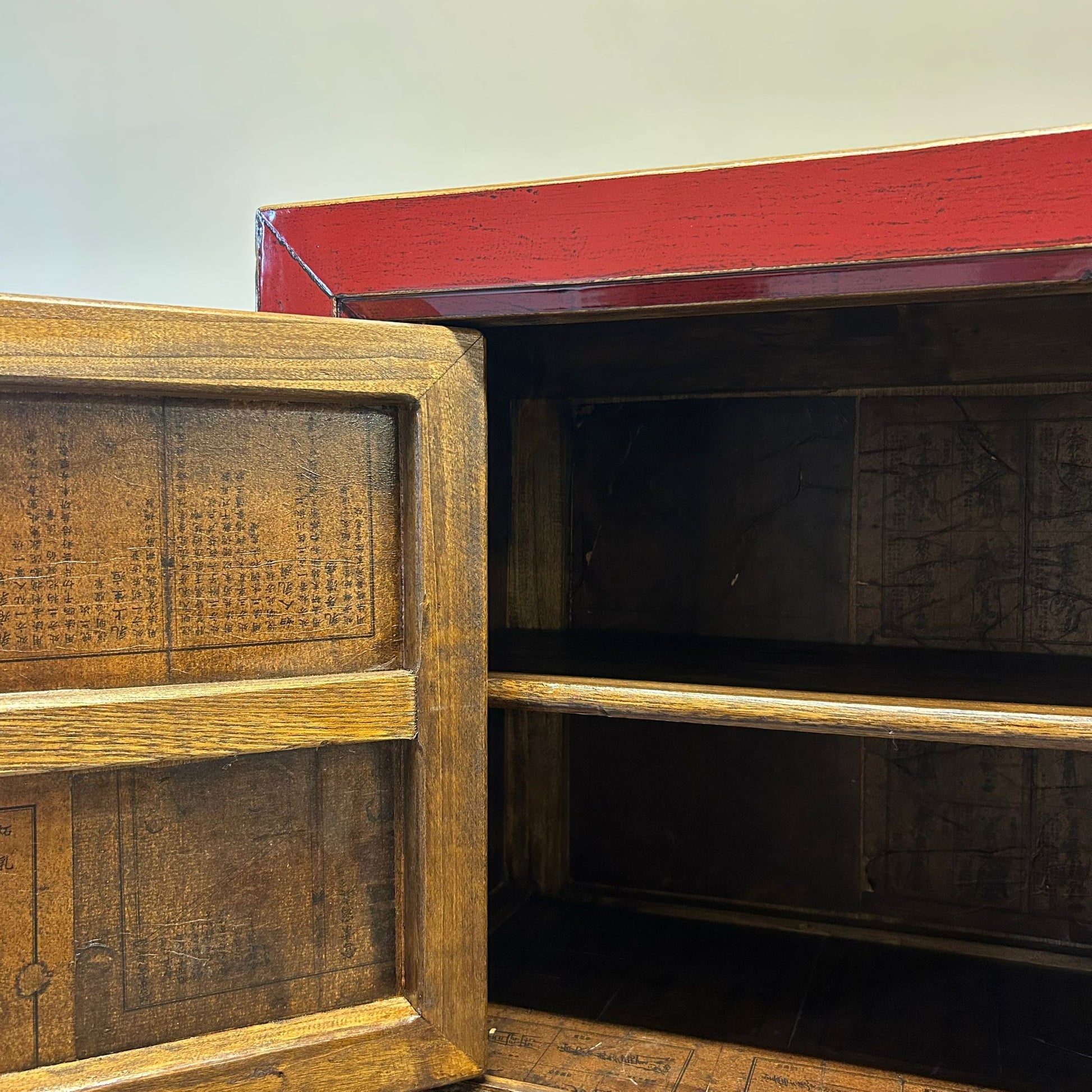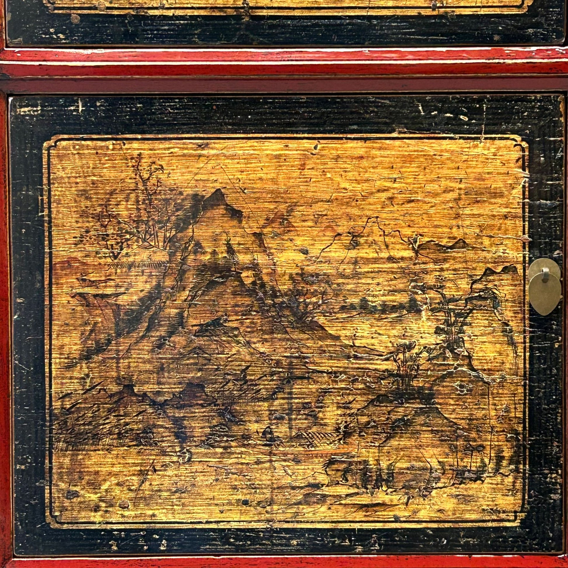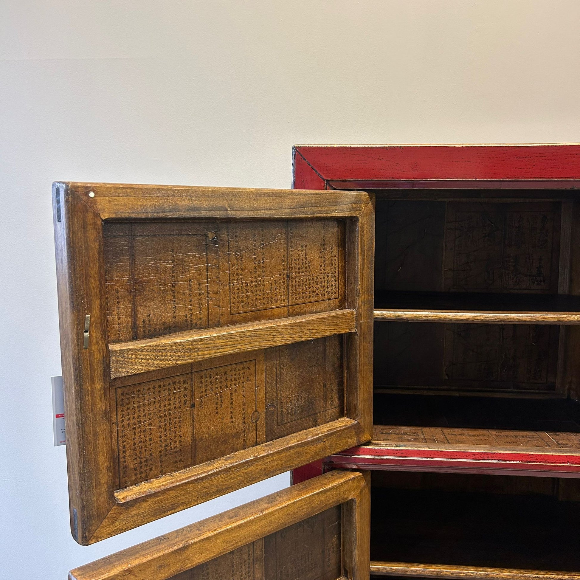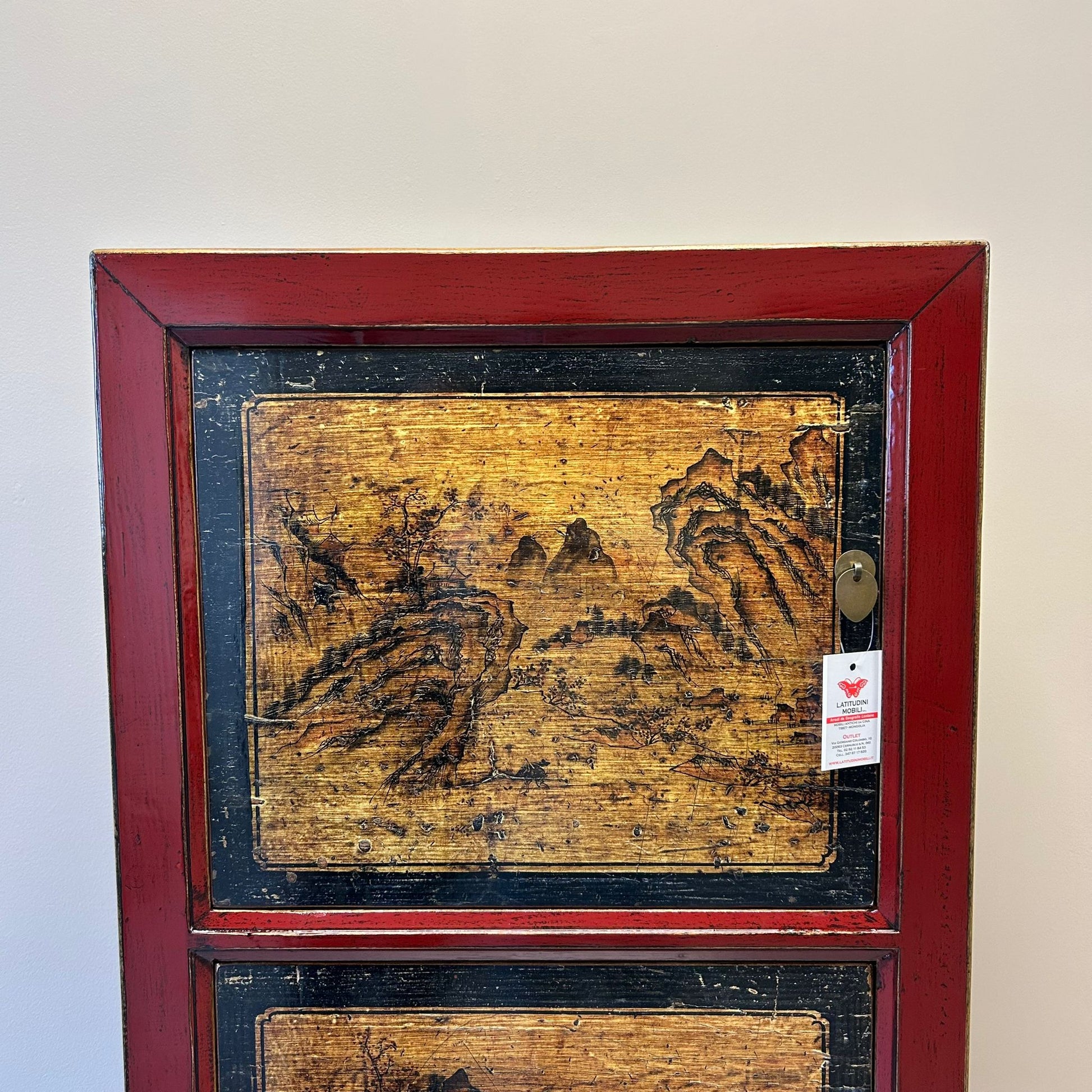 Stretto armadio etnico decorato con tre vani di apertura a pannello e cassetto nella fascia inferiore.