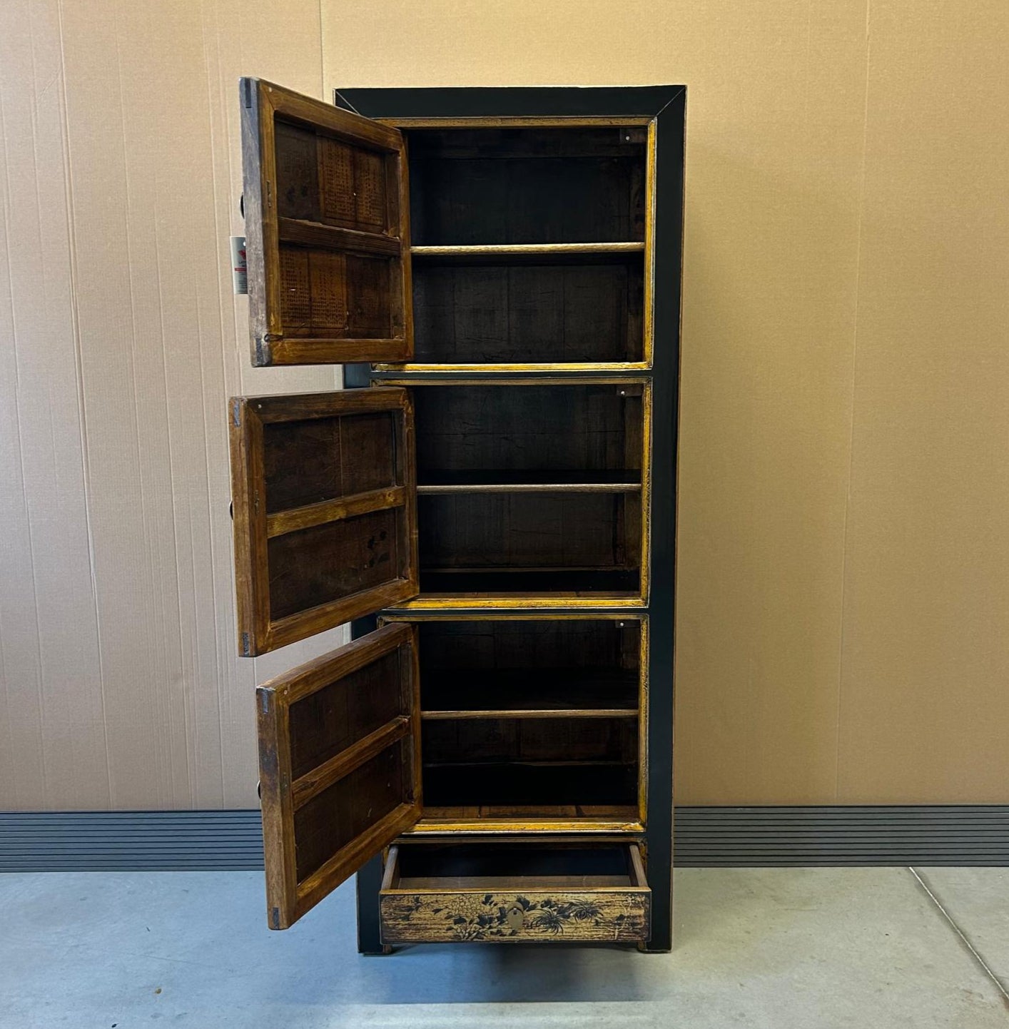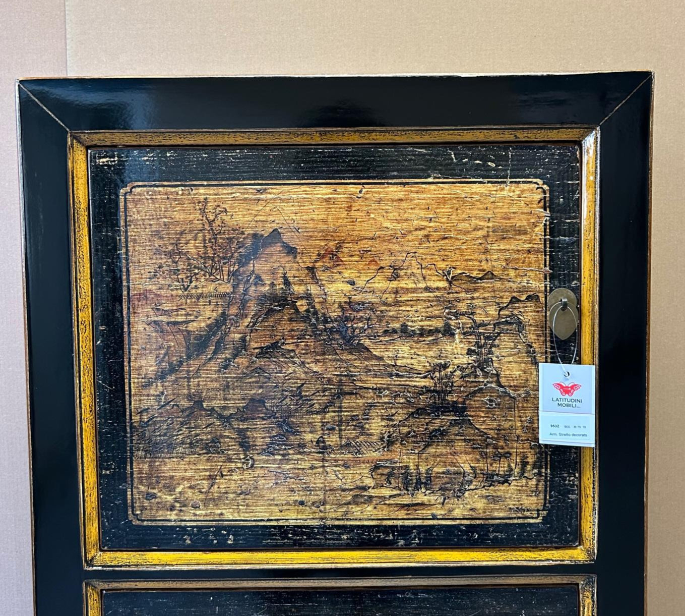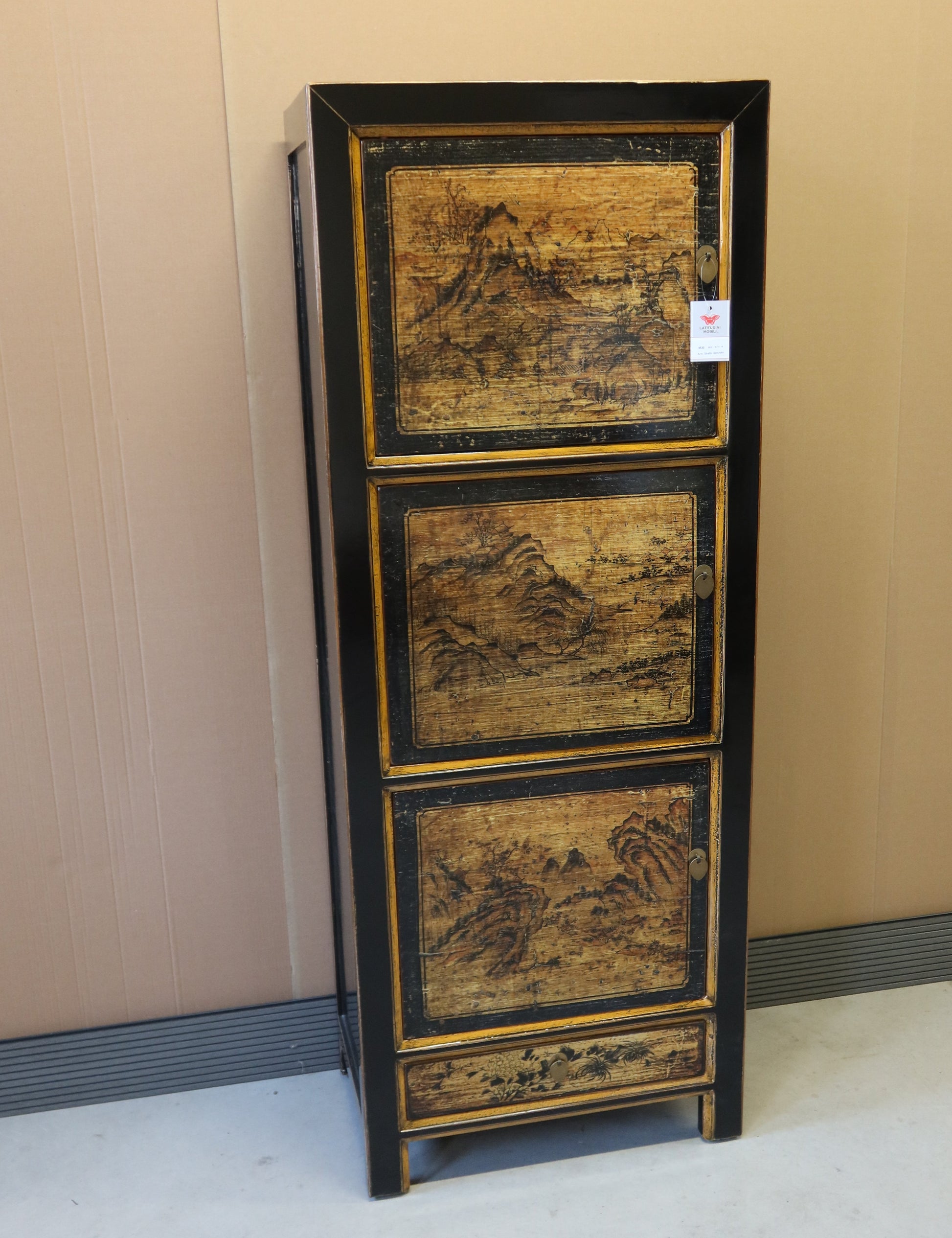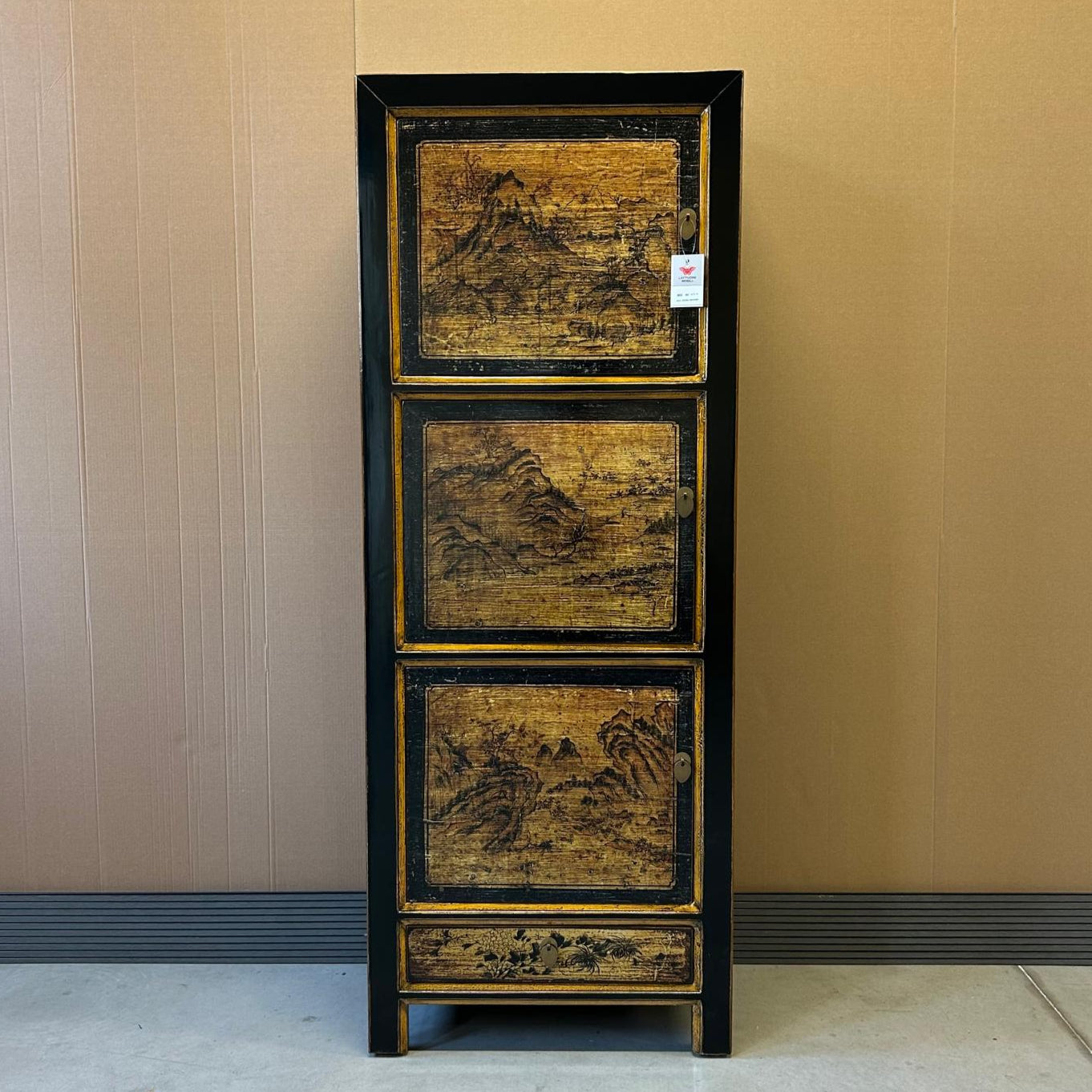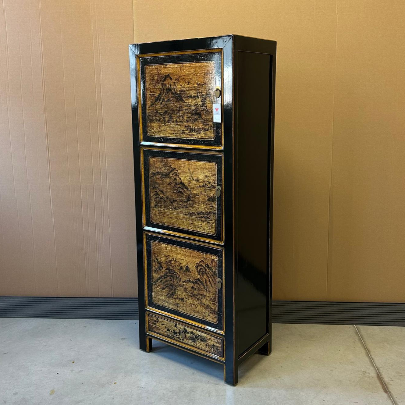 Stretto armadio etnico decorato con tre vani di apertura a pannello e cassetto nella fascia inferiore.