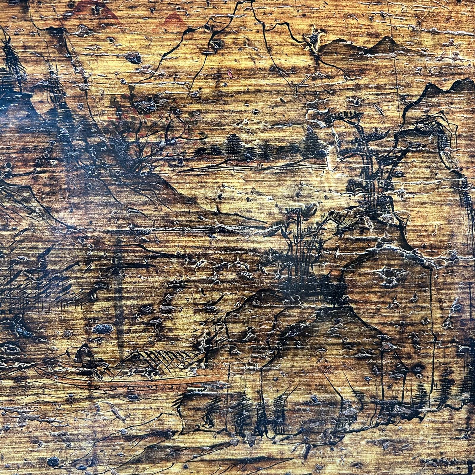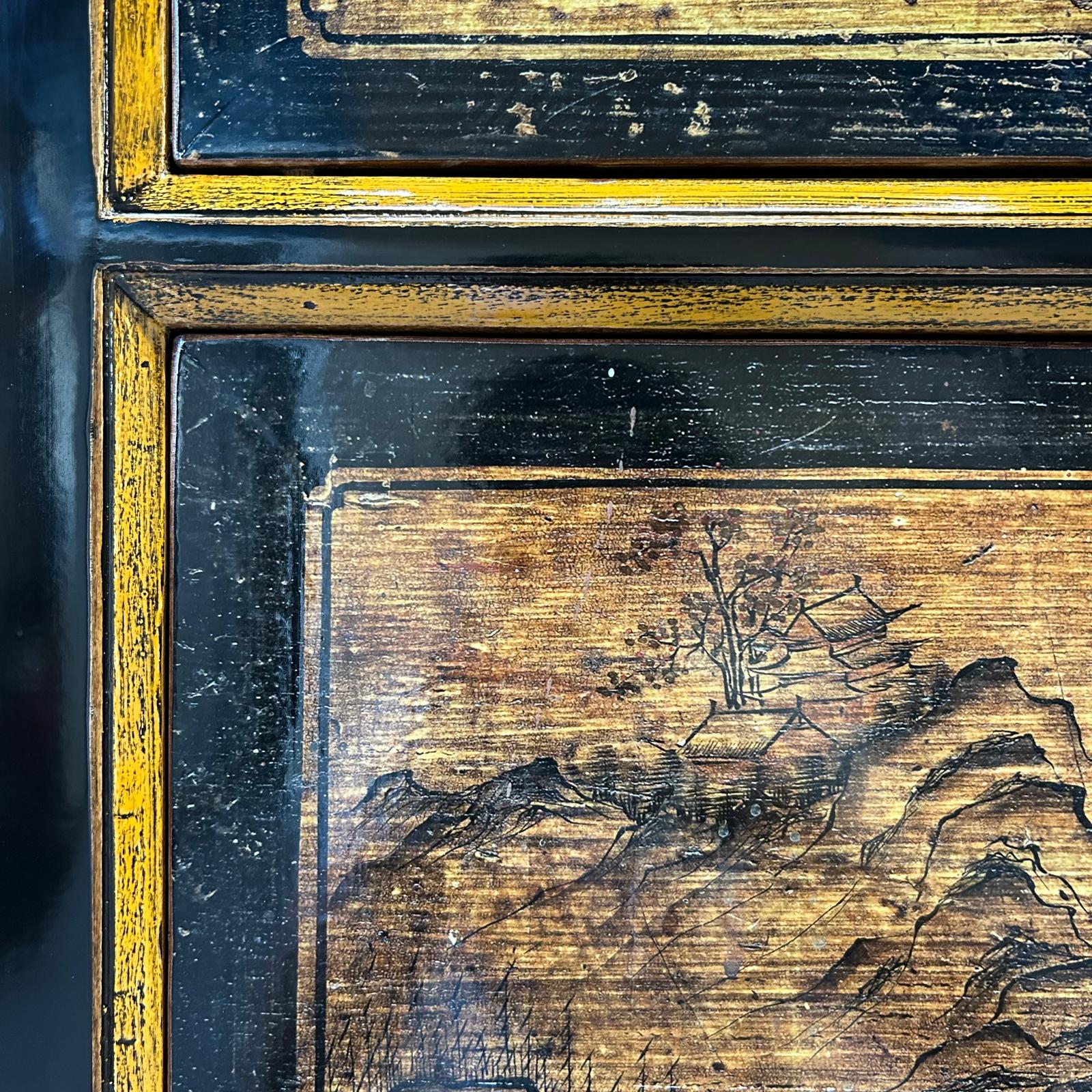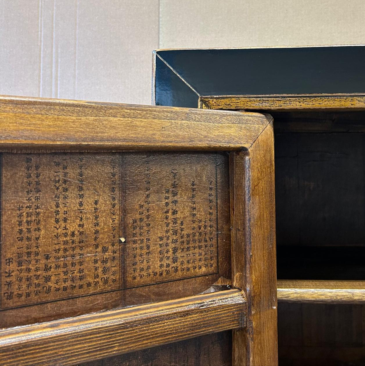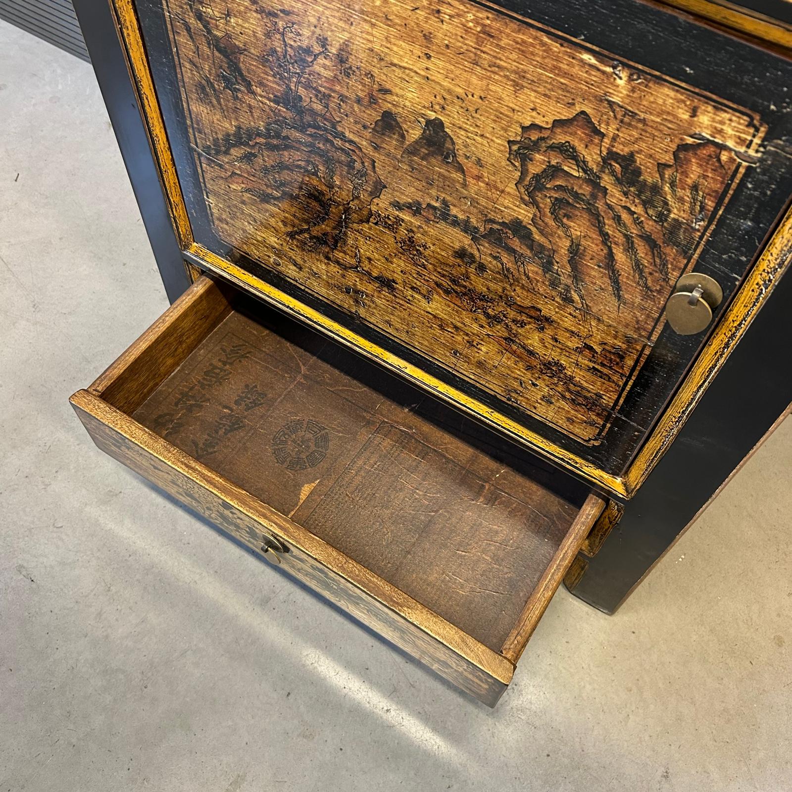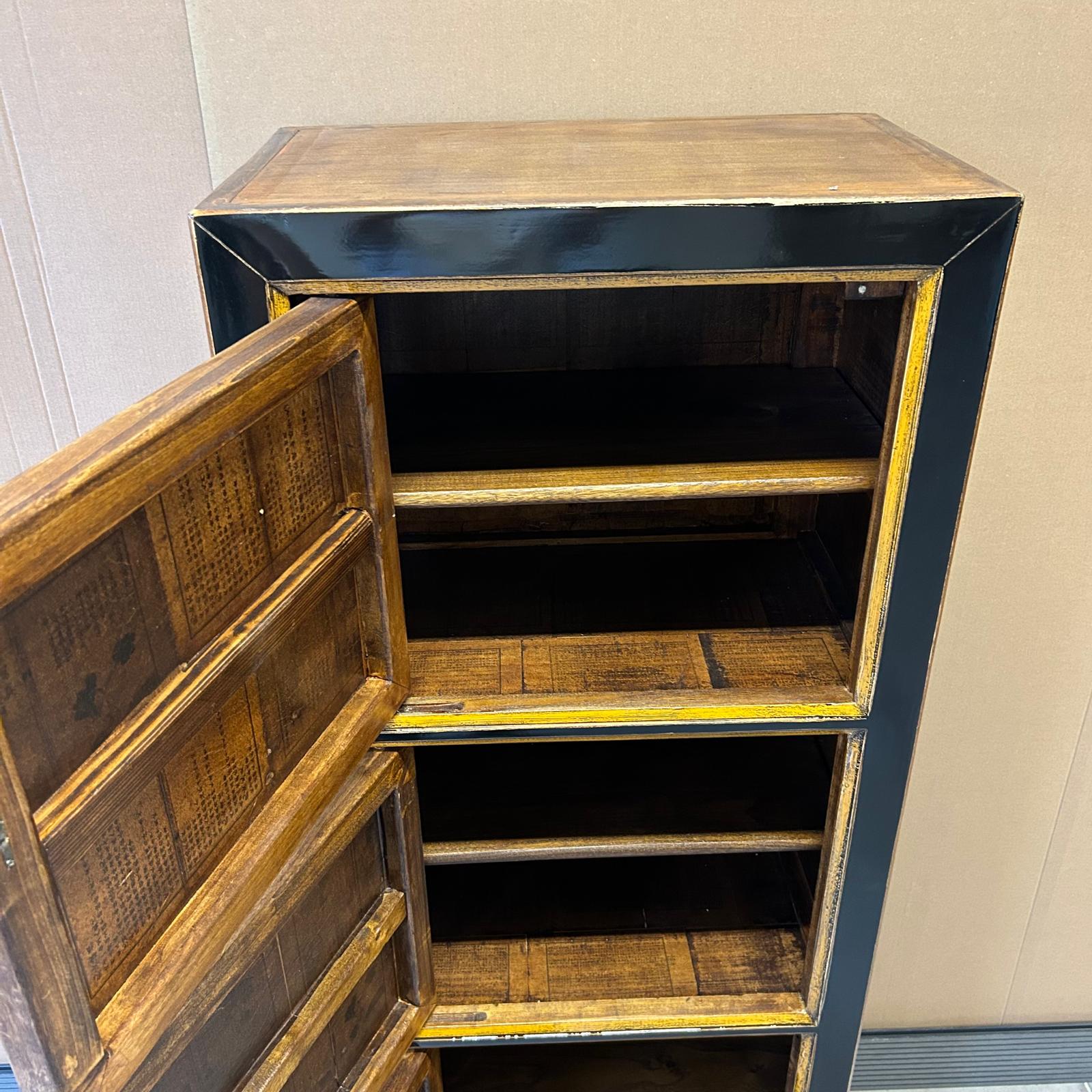 Stretto armadio etnico decorato con tre vani di apertura a pannello e cassetto nella fascia inferiore.