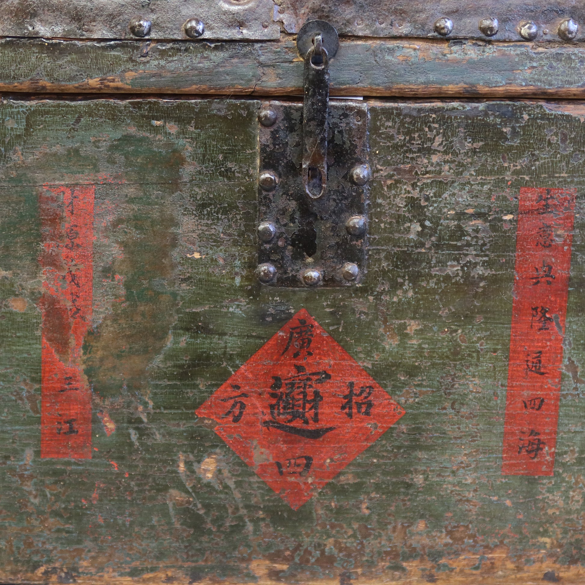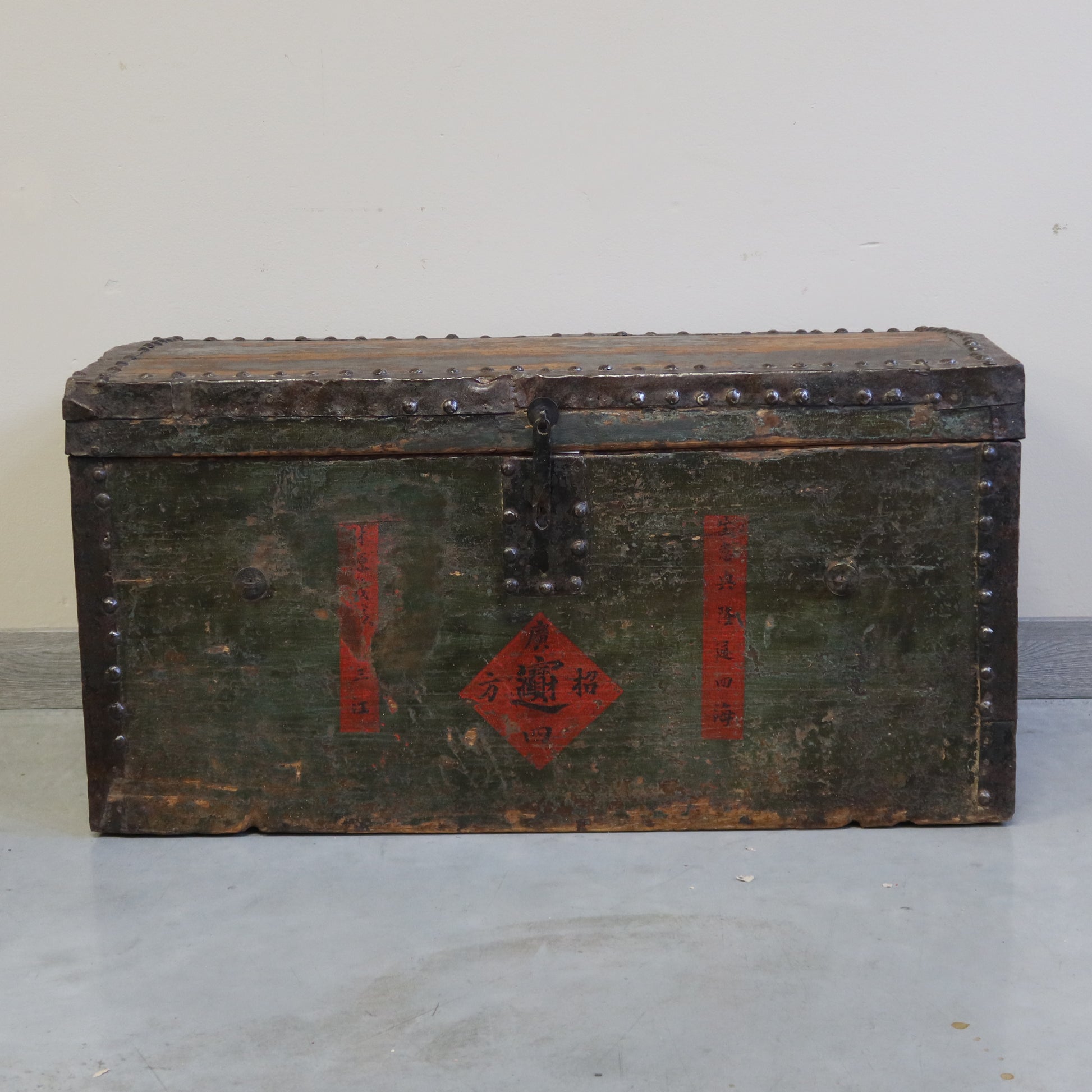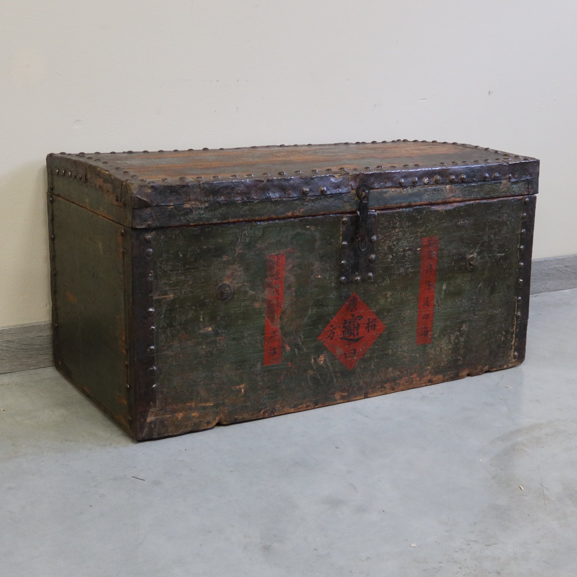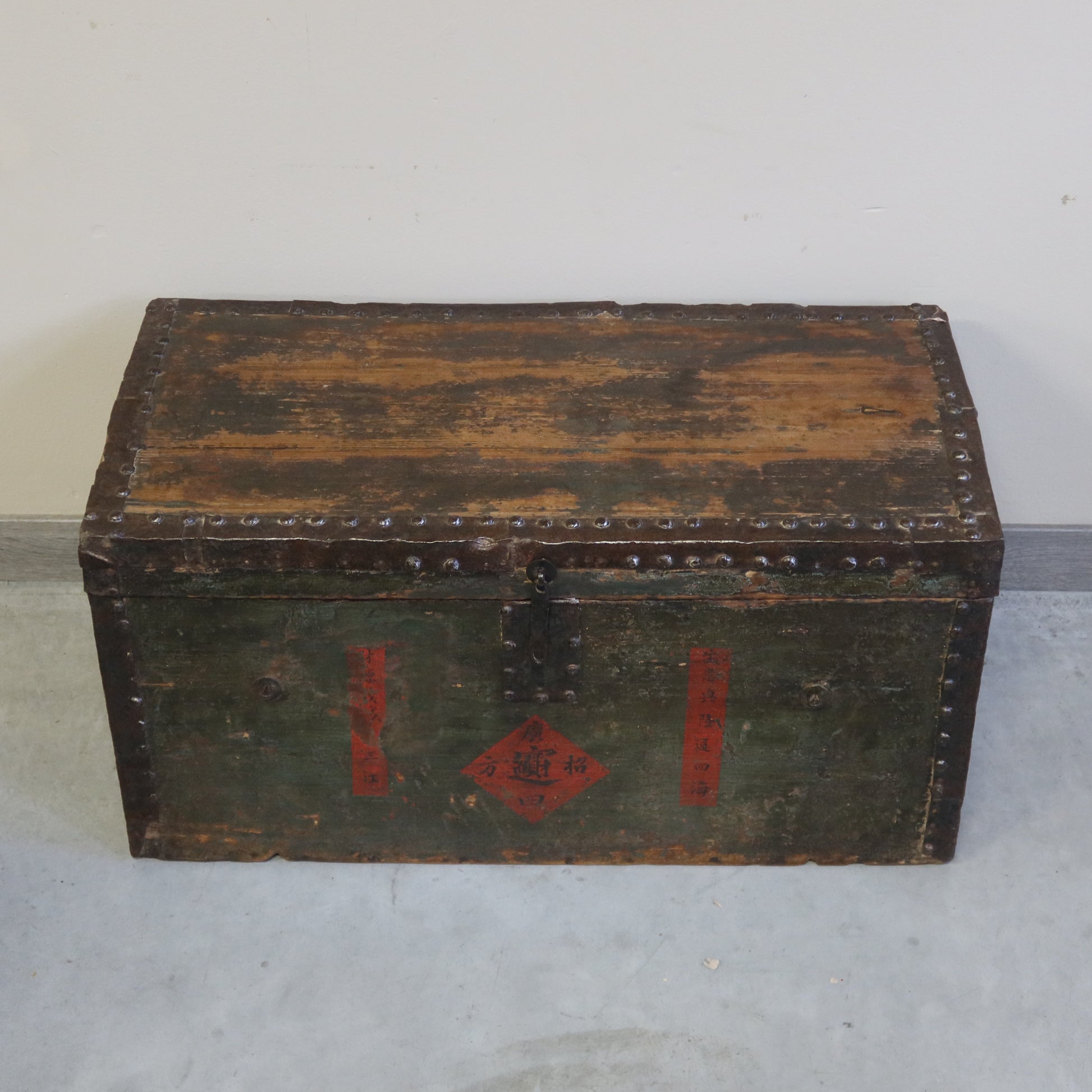 Baule con finitura in patina e apertura dall'alto con coperchio. particolare il bordo contornato di borchie metalliche