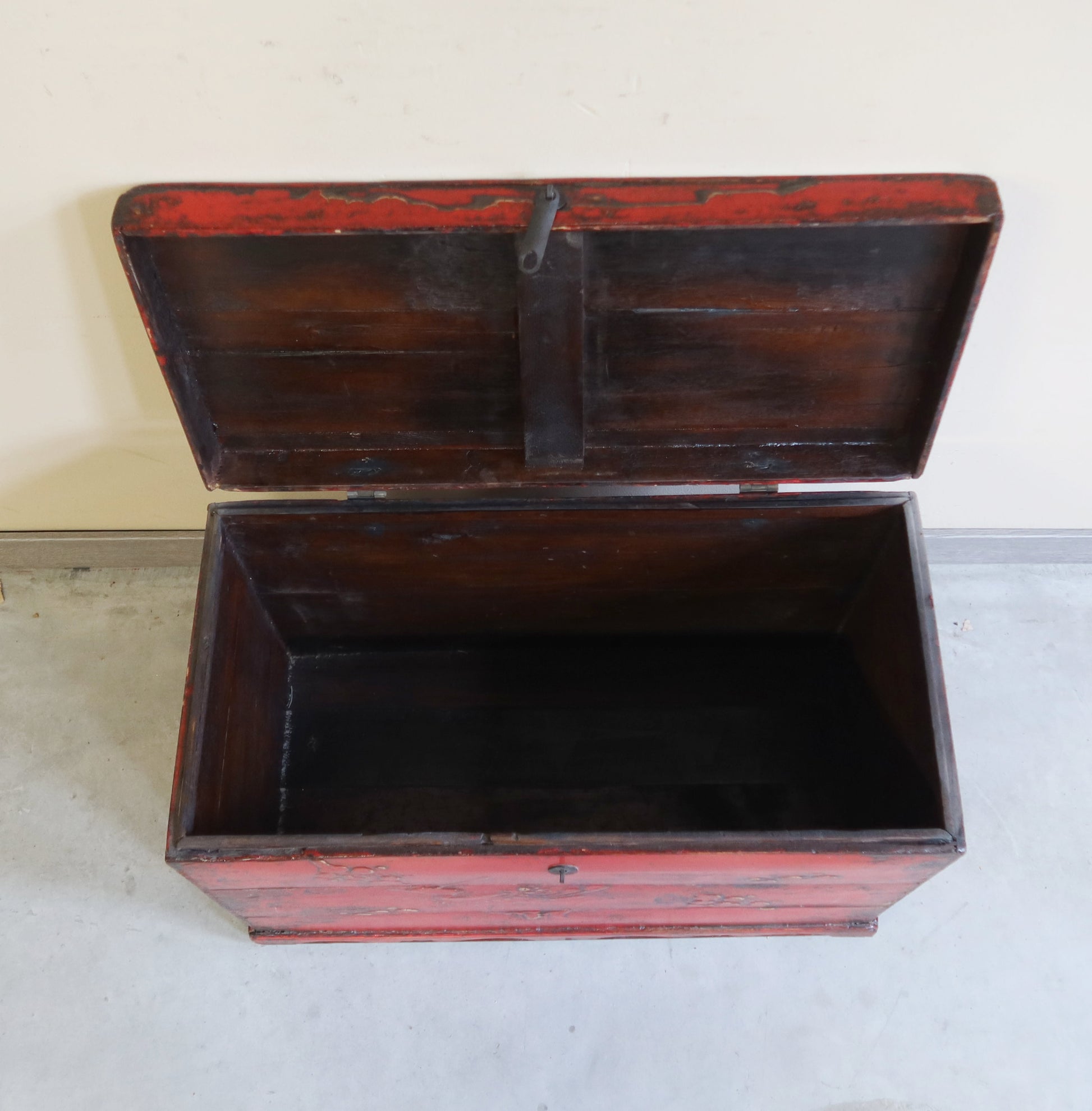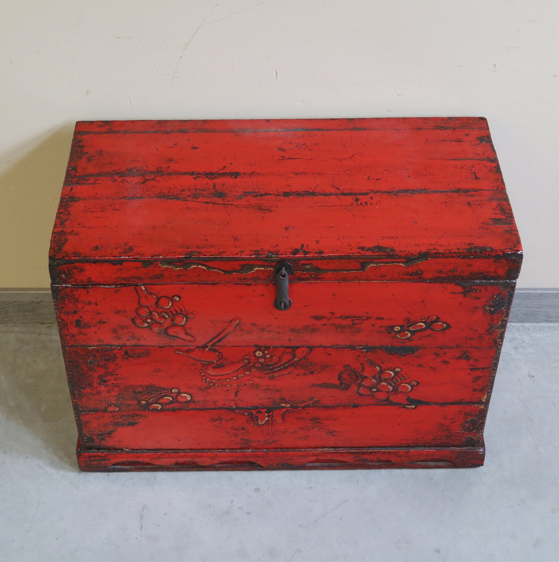 Baule con base in olmo cinese dal particolare tipo di decorazione a rilievo: la finitura è in lacca rossa. Questo proporzionato baule orientale può essere sia appoggiato su un altro mobile ma anche posto a terra come piccolo tavolino di servizio ad una poltrona o ad un divano .