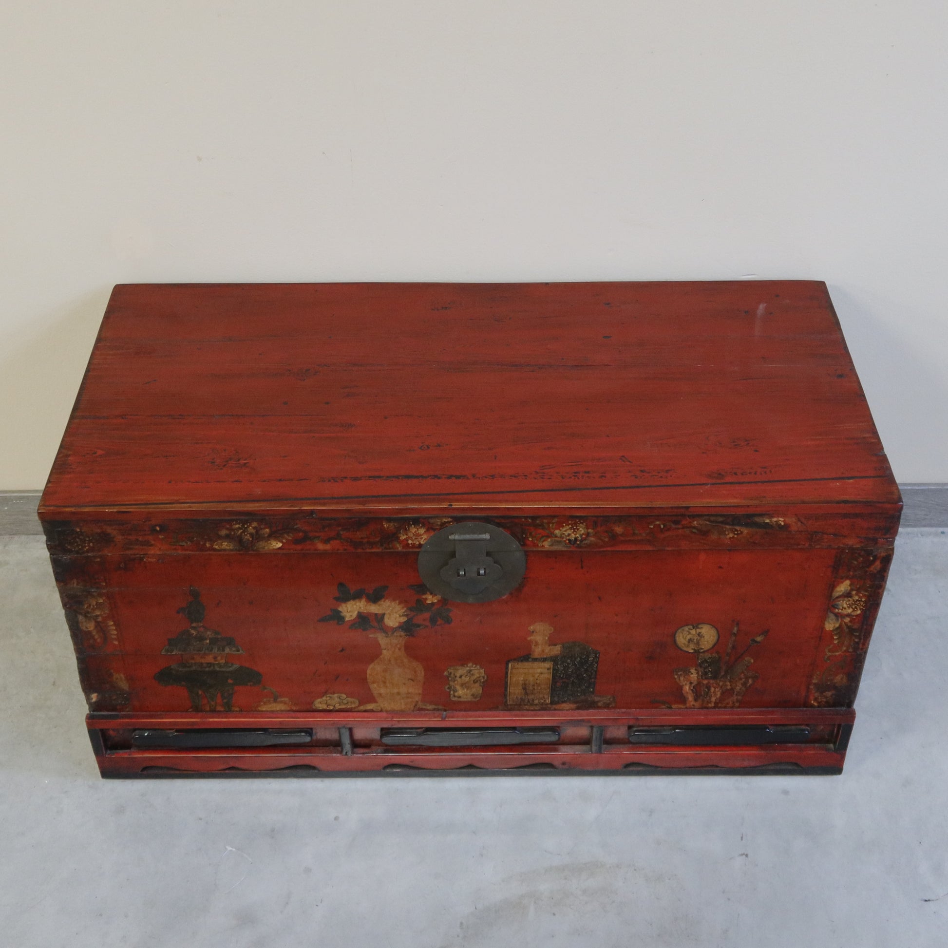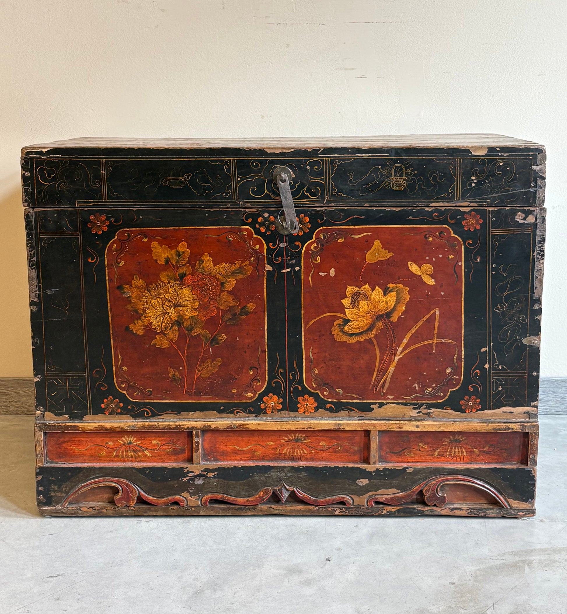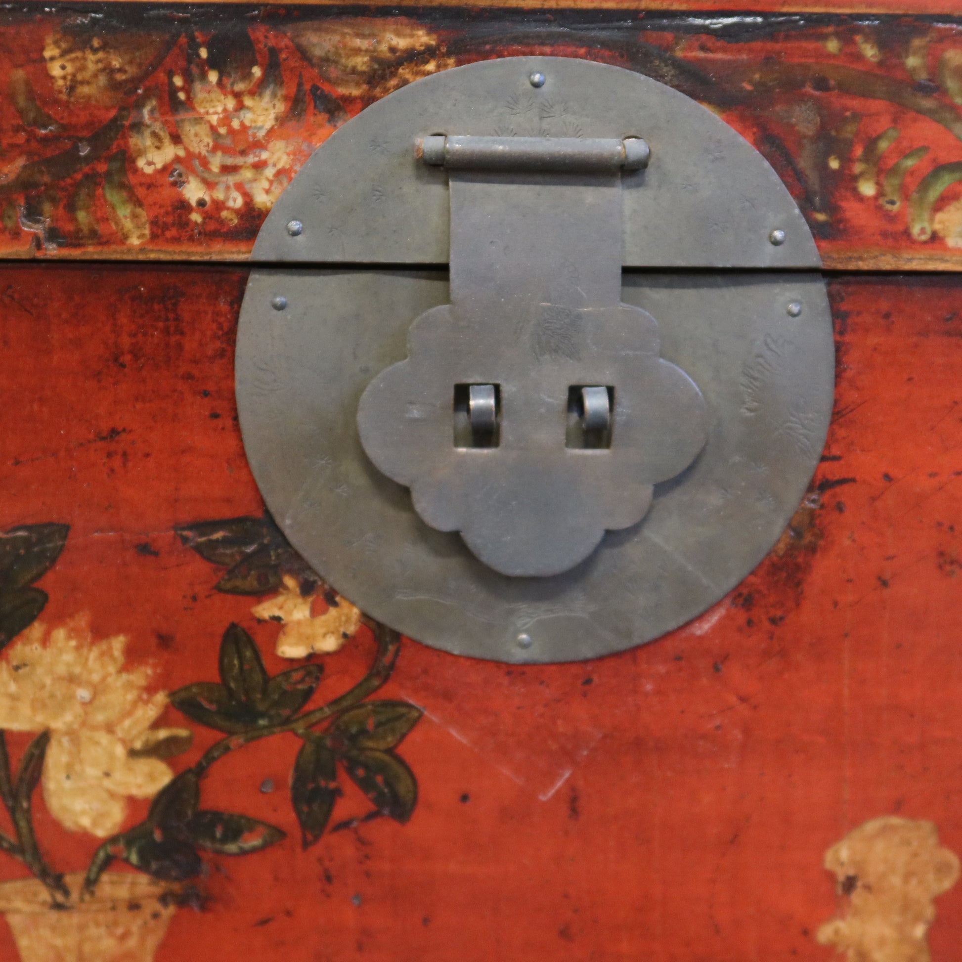 Baule con garbato decoro di genere e base con formelle e intagli. La provenienza è la regione cinese del Ganzu.