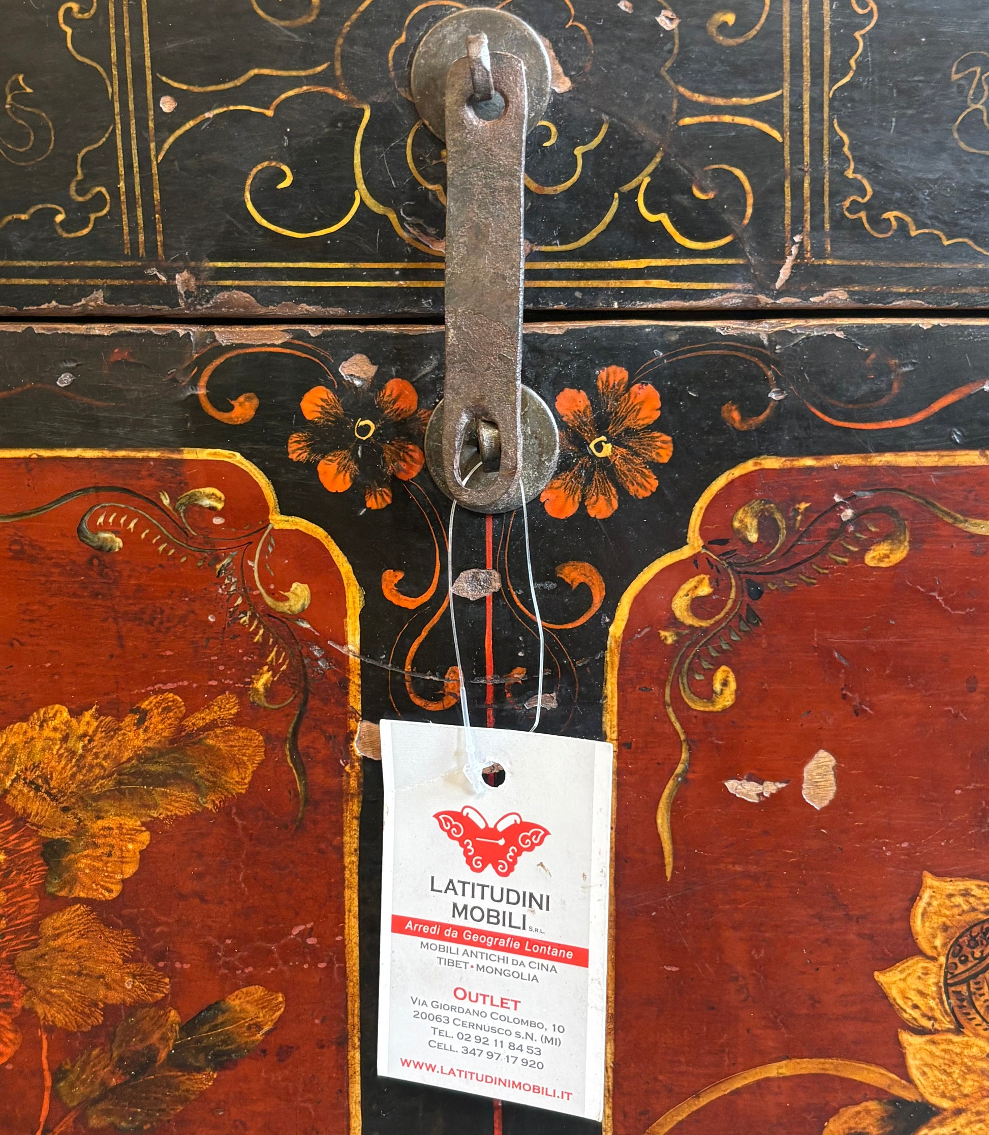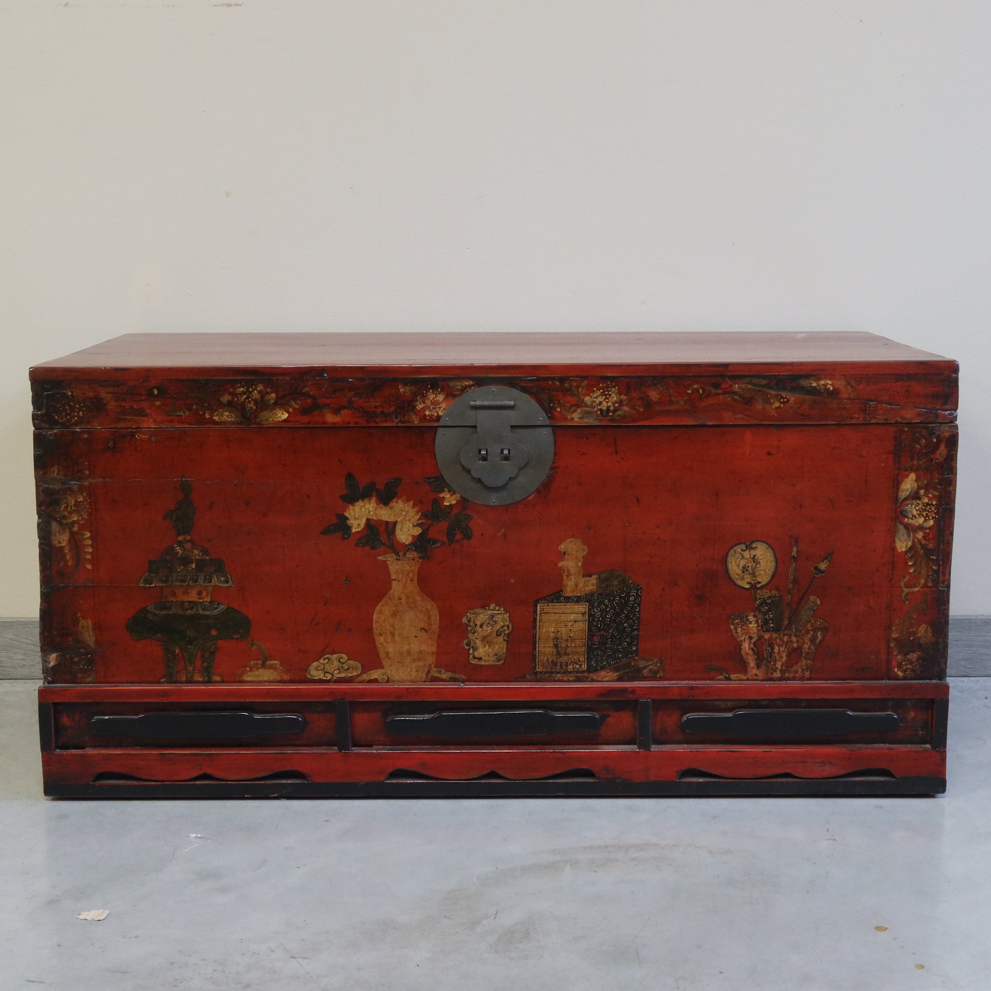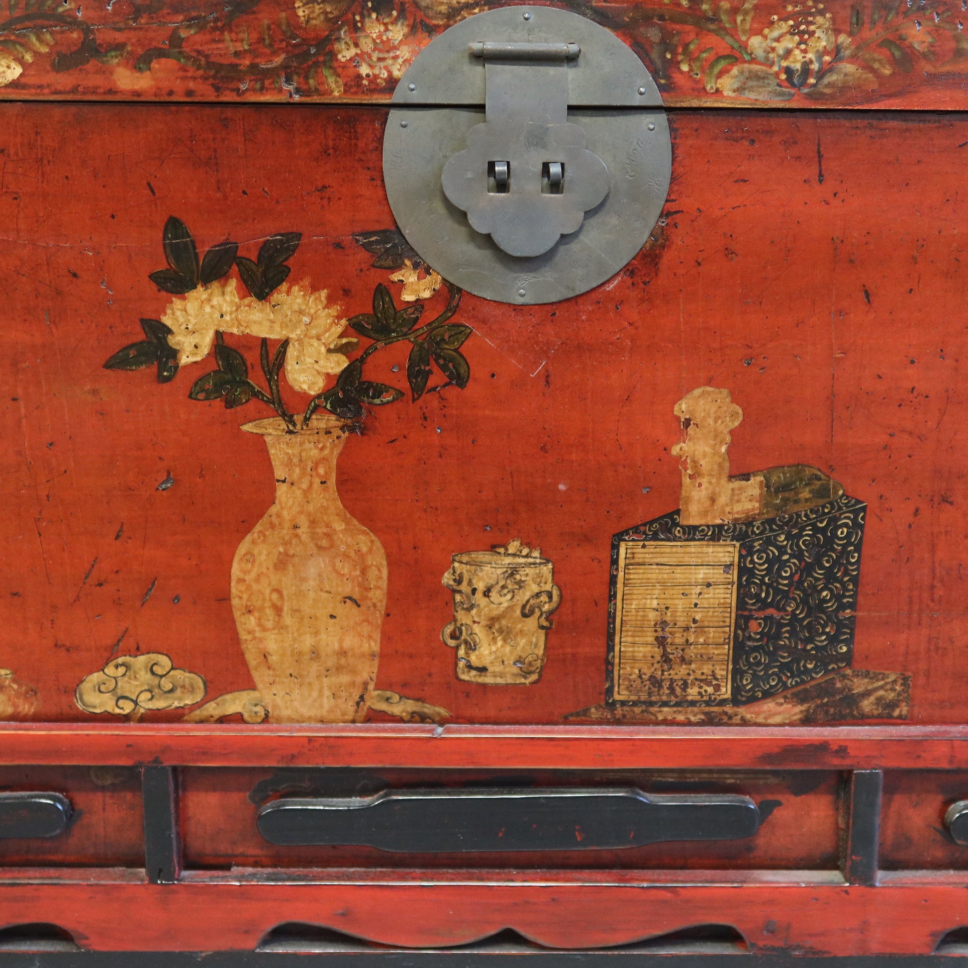 Baule con garbato decoro di genere e base con formelle e intagli. La provenienza è la regione cinese del Ganzu.