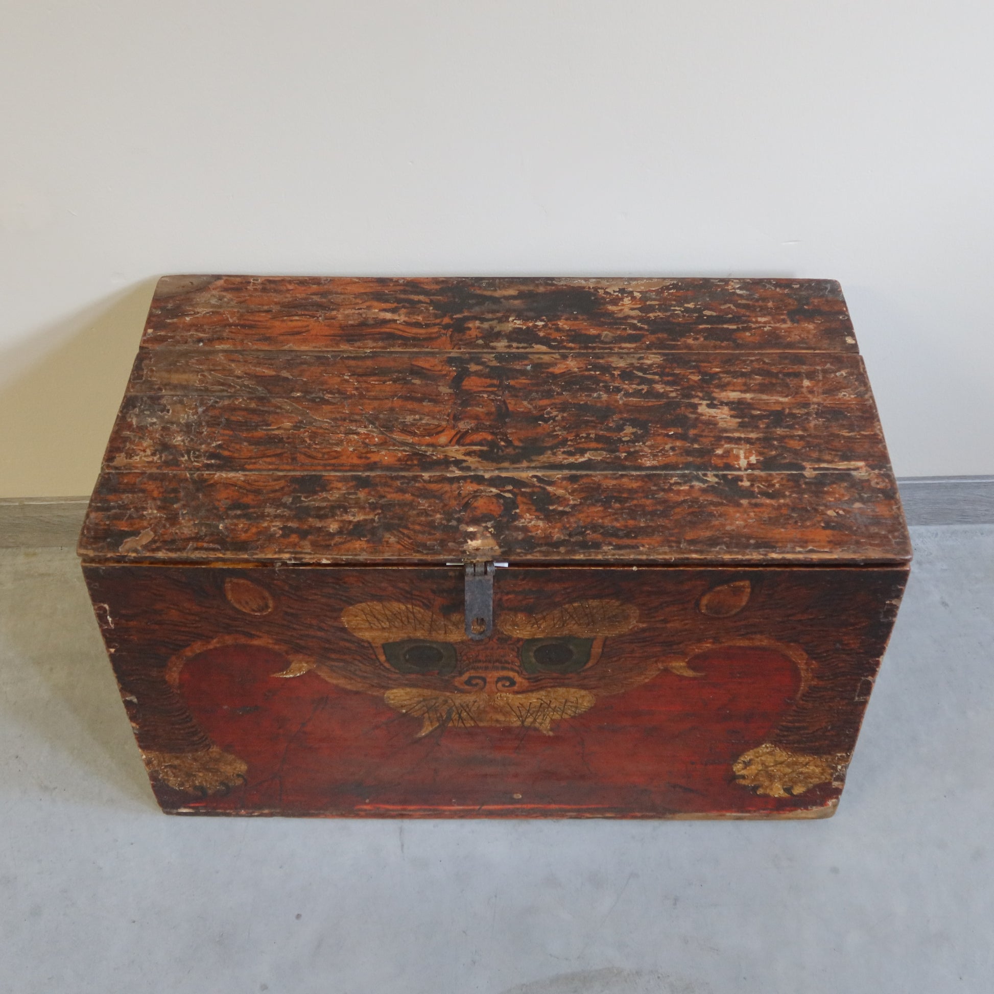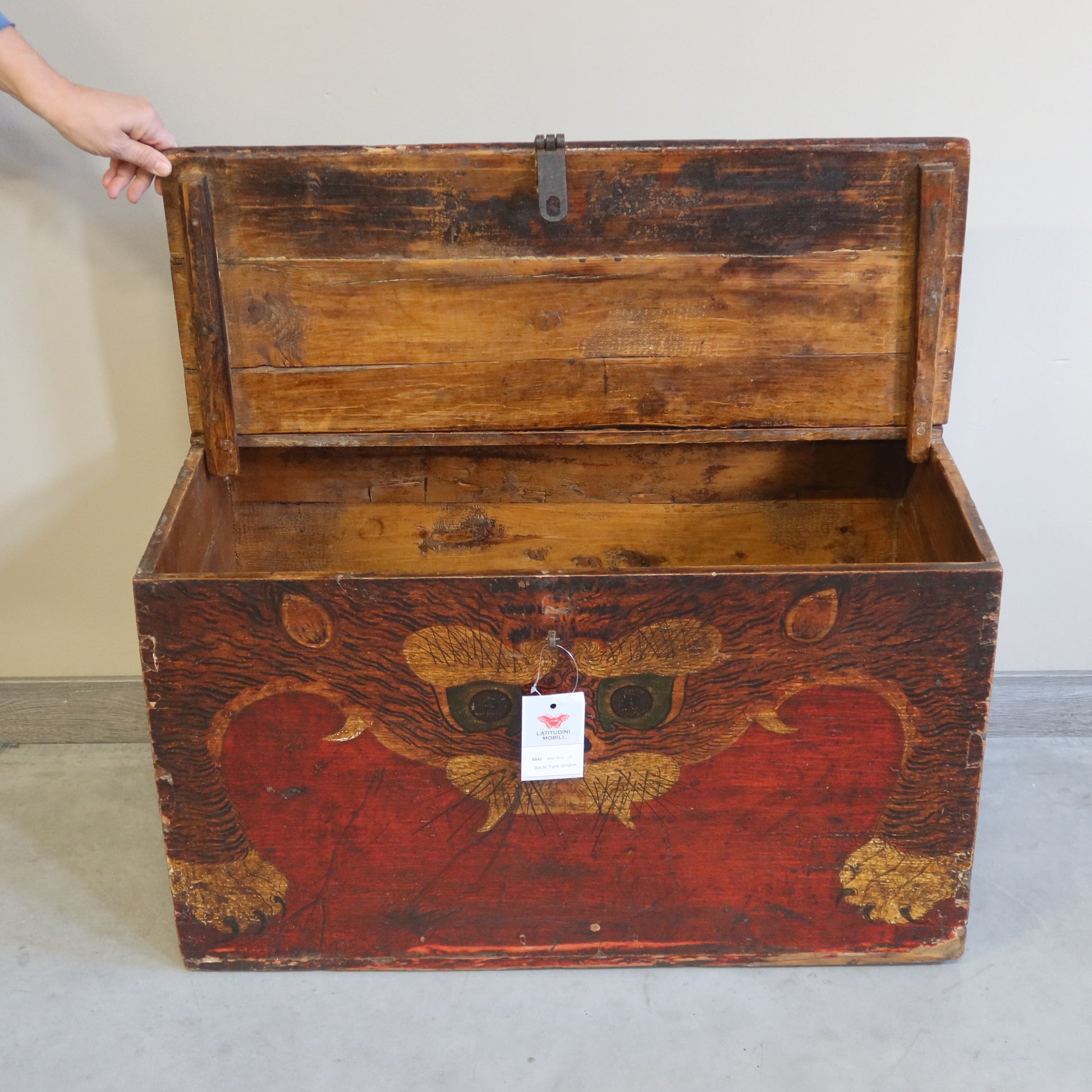 Bellissimo baule in lacca policroma decorata con raffigurazione della tigre. Apertura dall'alto solo di una gran parte del coperchio.
