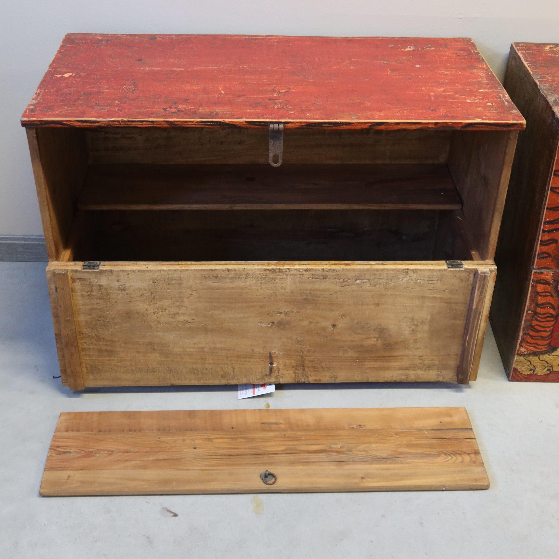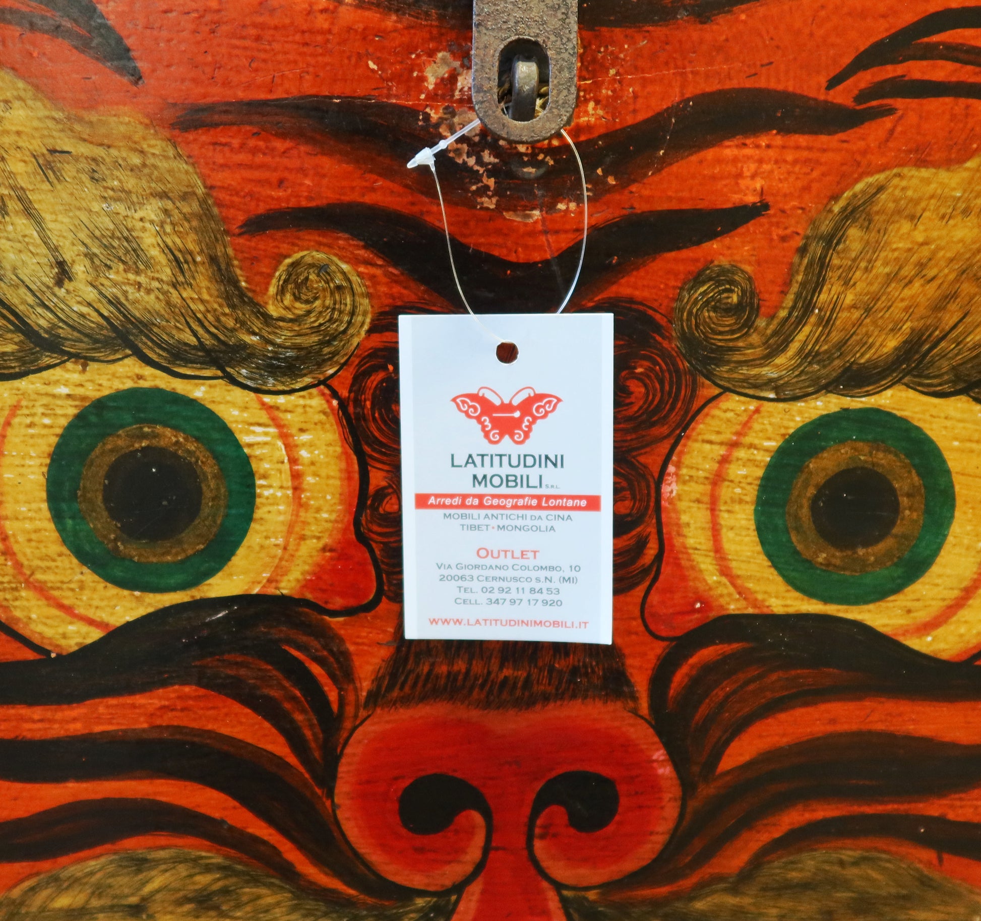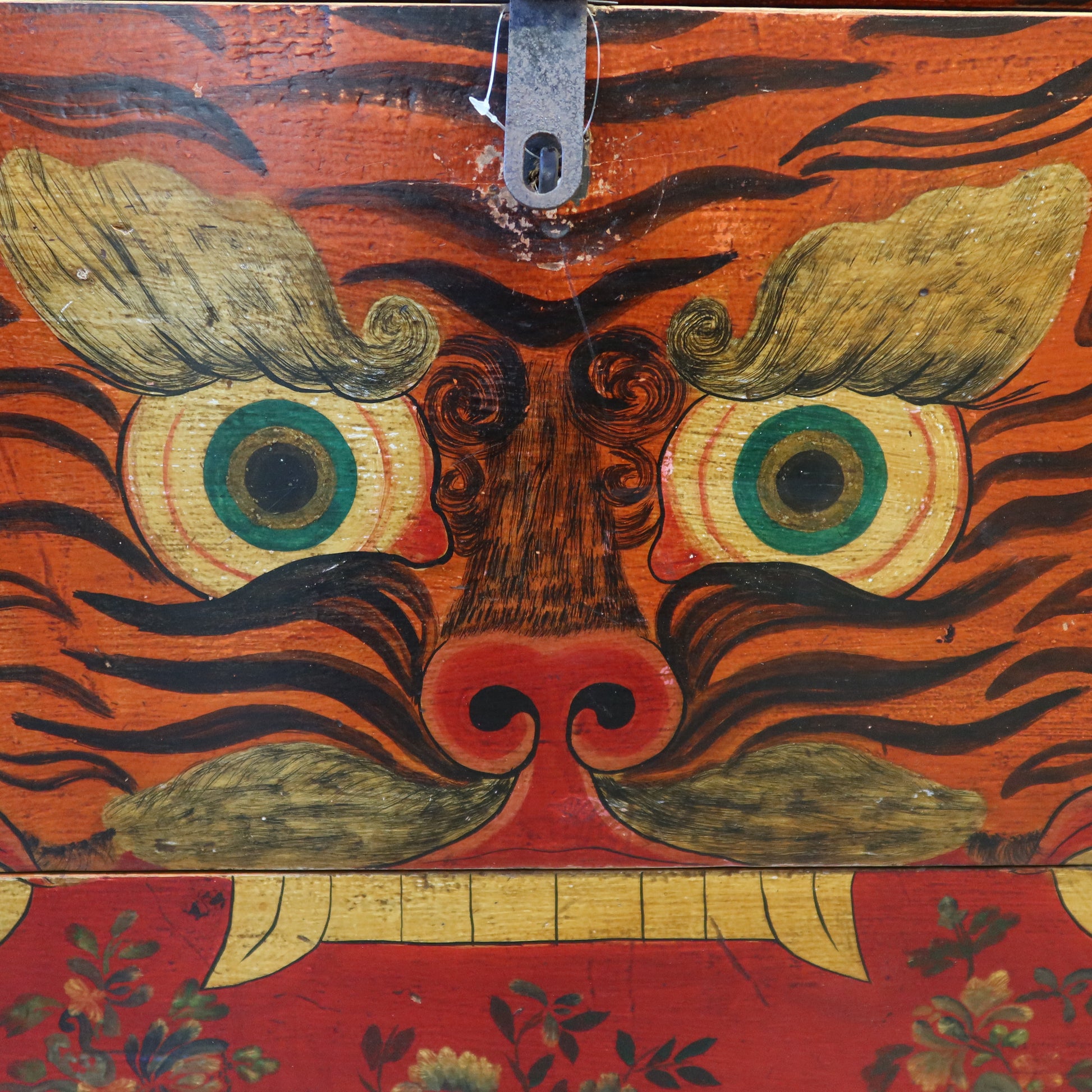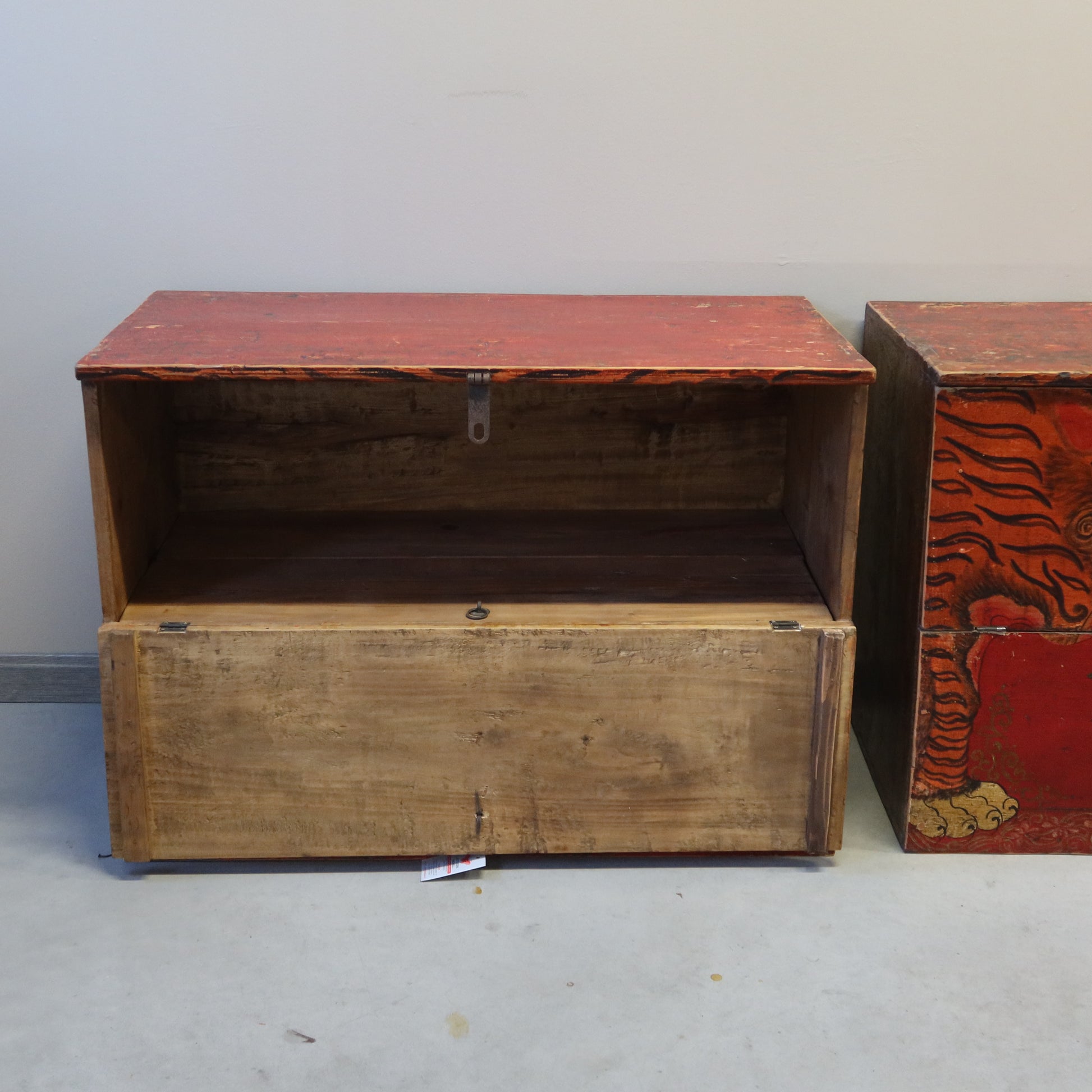 Bellissima coppia di bauli in lacca policroma decorata con raffigurazione della tigre. Apertura dall'alto di una gran parte del coperchio. IL PREZZO INDICATO E' PER SINGOLO BAULE.