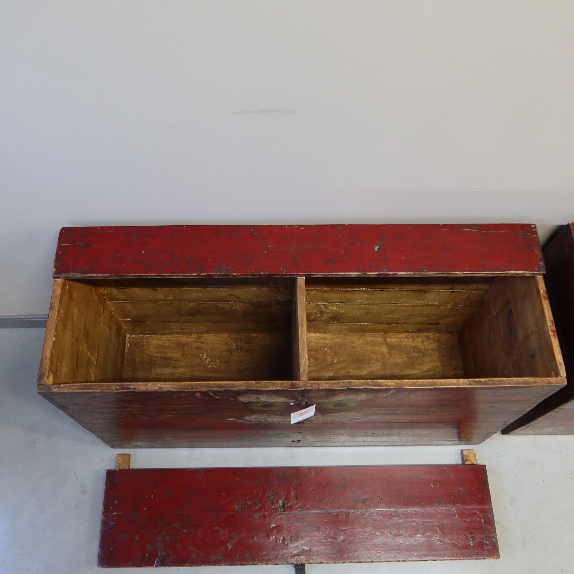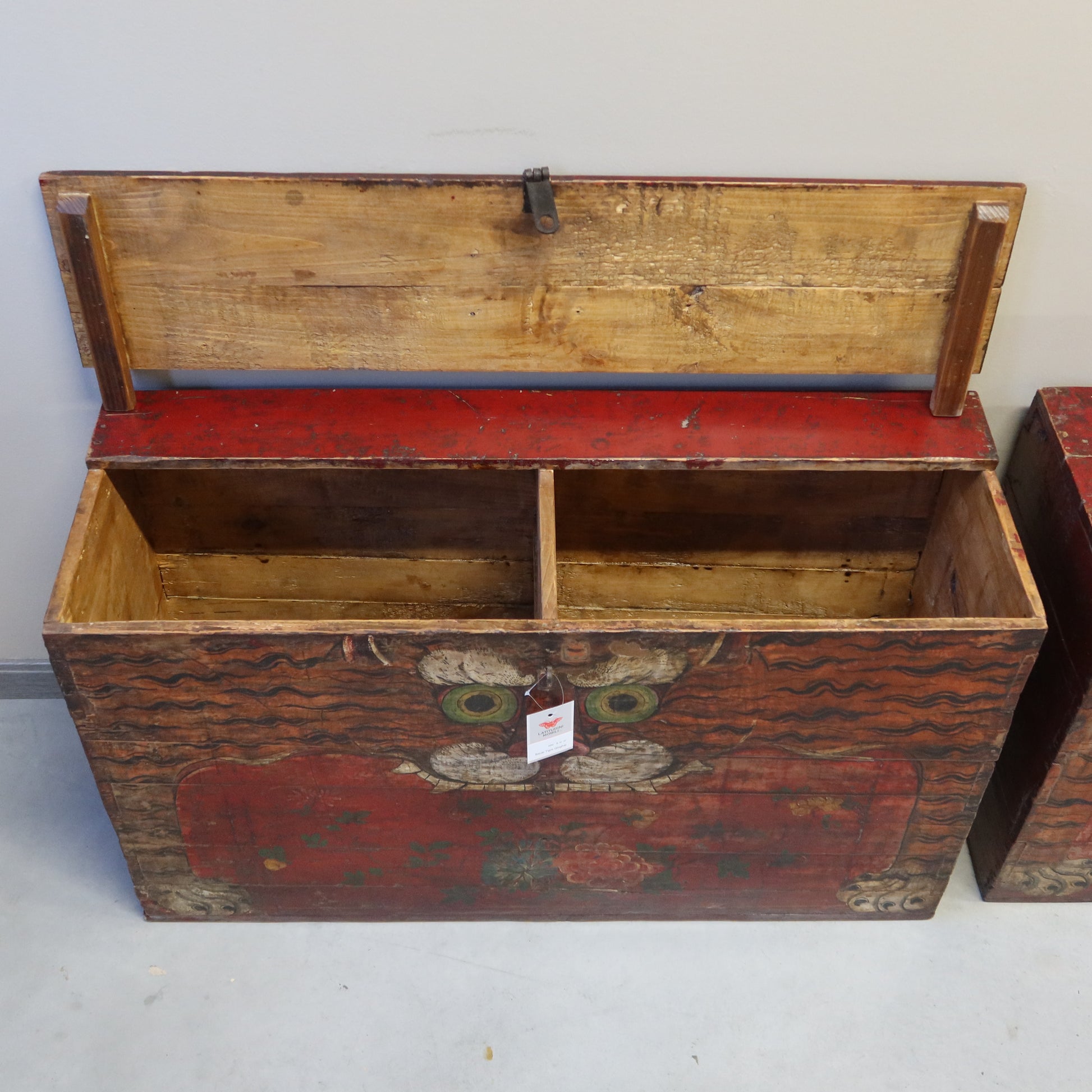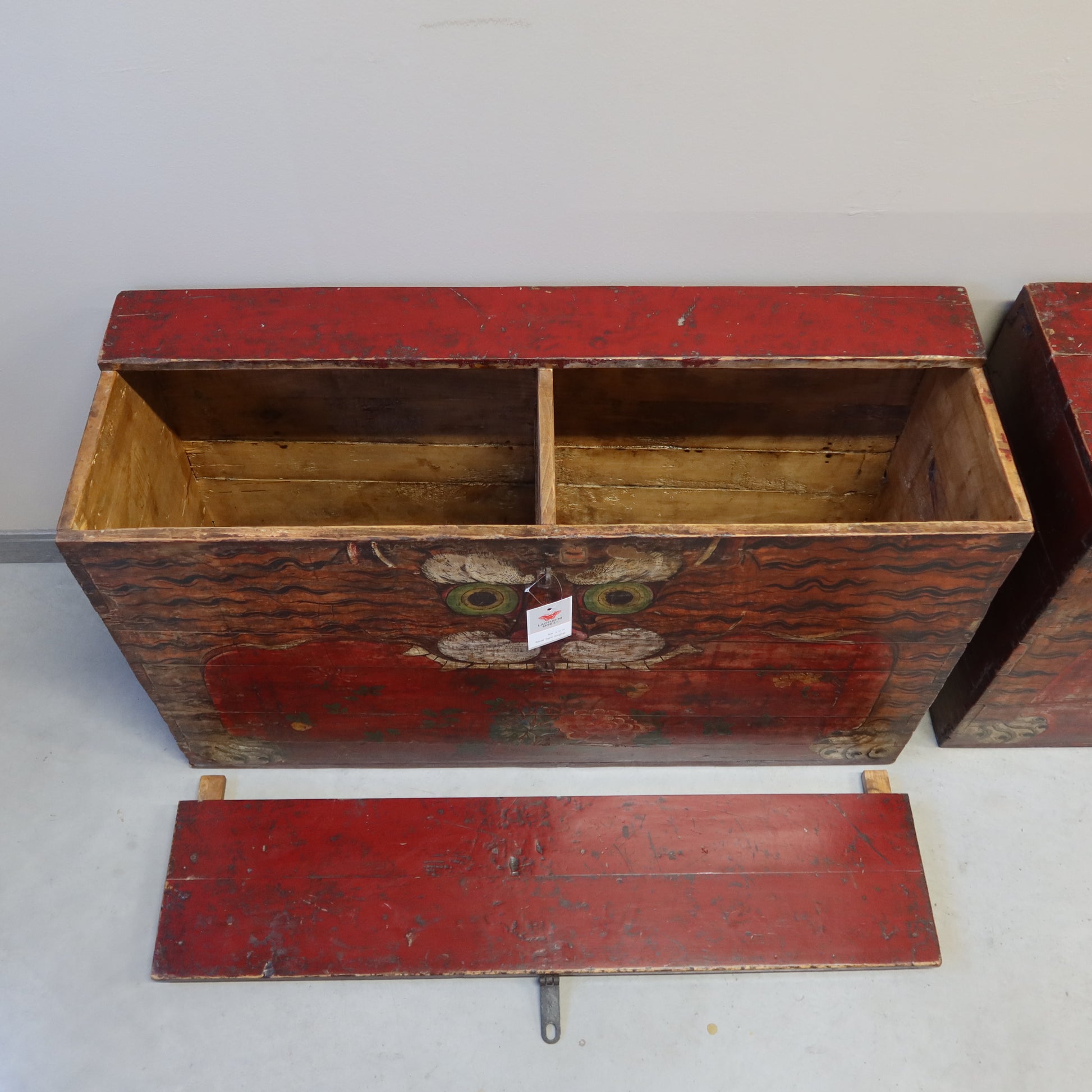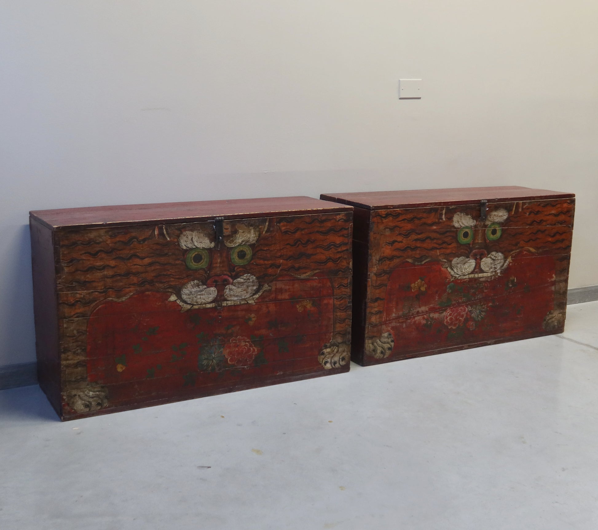 Bellissima coppia di bauli in lacca policroma decorata con raffigurazione della tigre. Apertura dall'alto di una gran parte del coperchio. IL PREZZO INDICATO E' PER SINGOLO BAULE.
