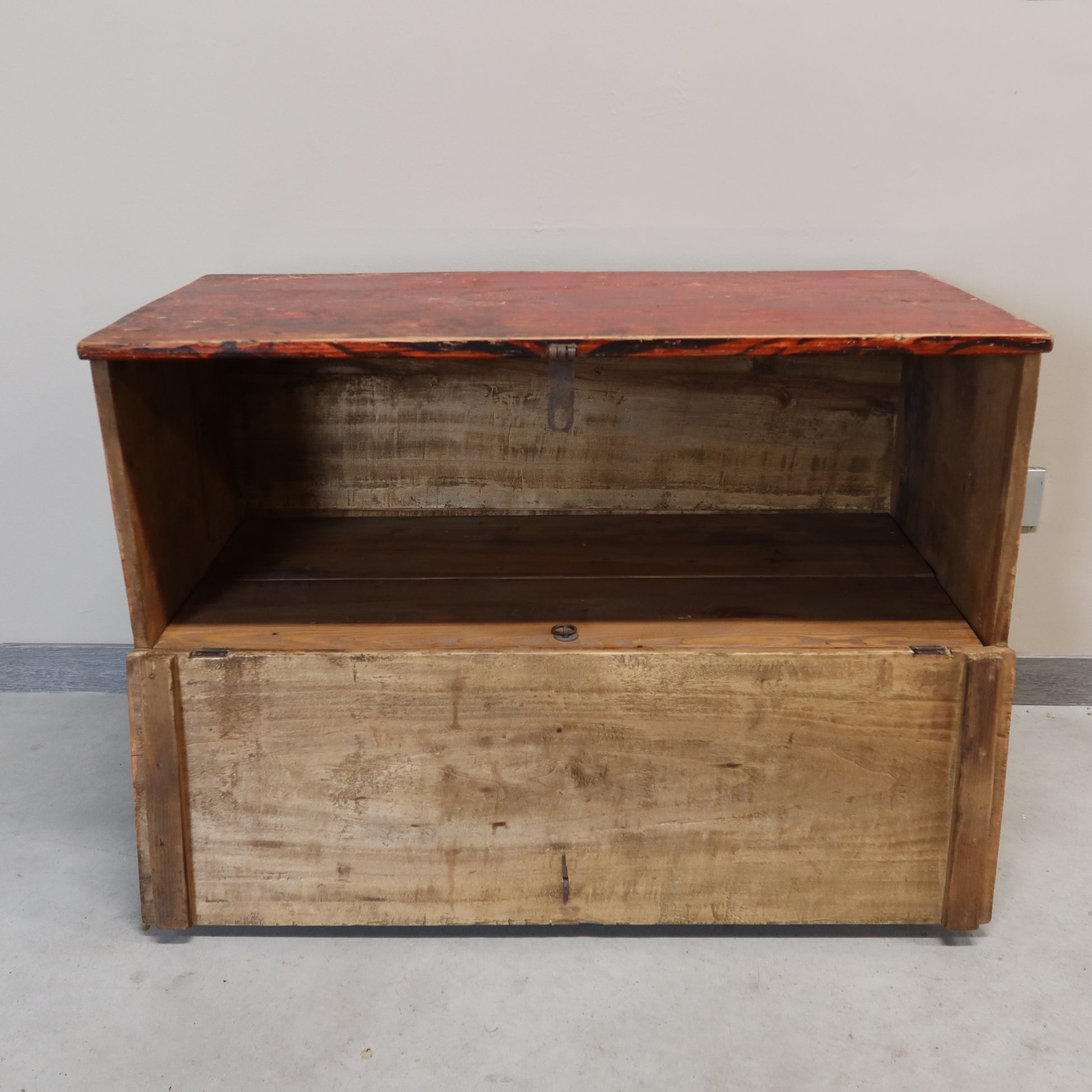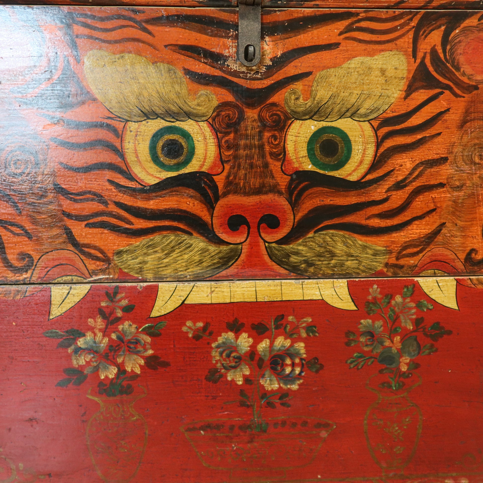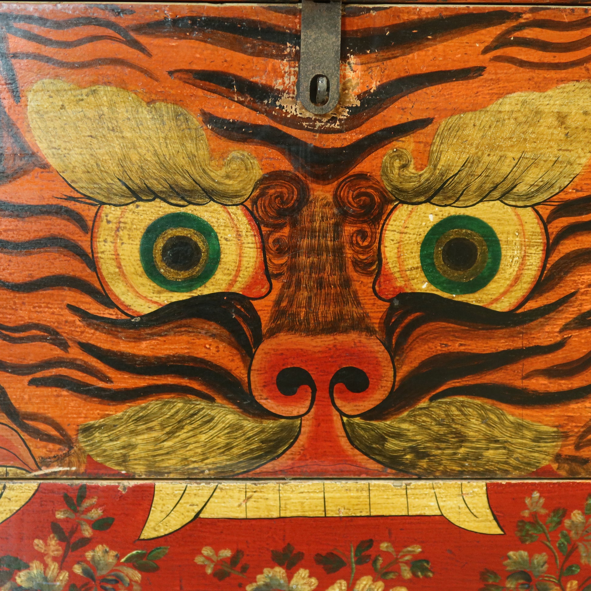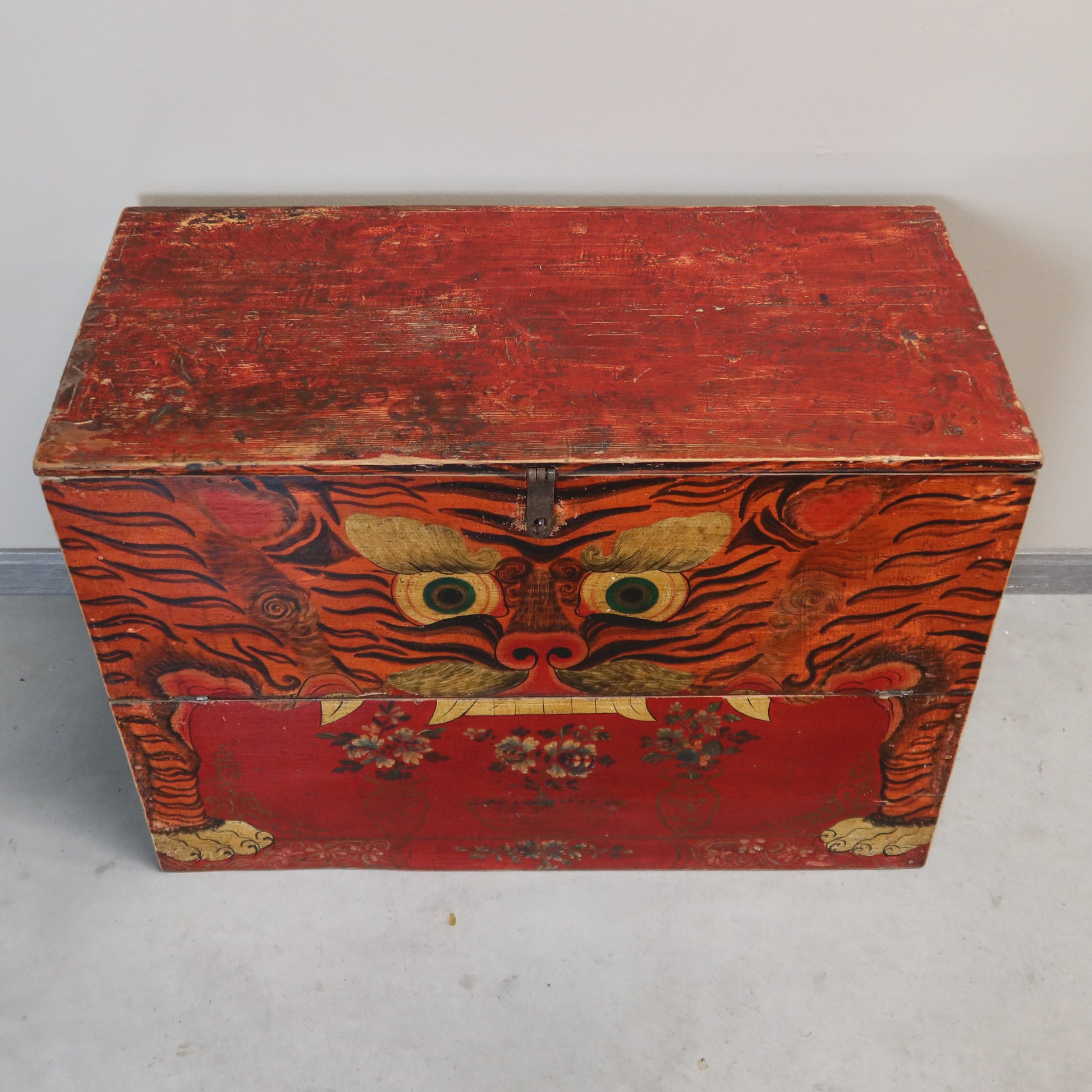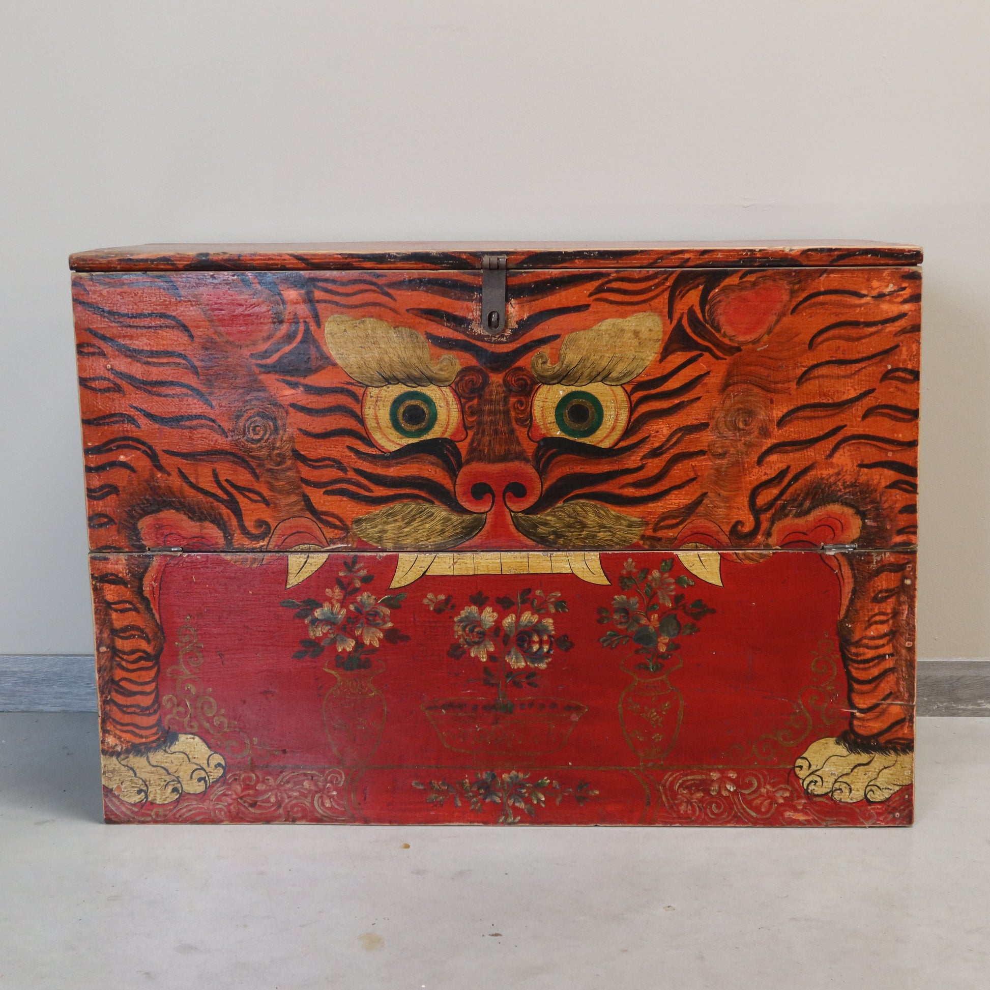 Bellissimo baule in lacca policroma decorata con raffigurazione della tigre. Apertura frontale di una sola metà dell'altezza. L'interno ha un ripiano rimovibile diviso in due per sfruttare appieno la parte inferiore e in generale tutta l'altezza qualora si volesse togliere il doppio ripiano.
