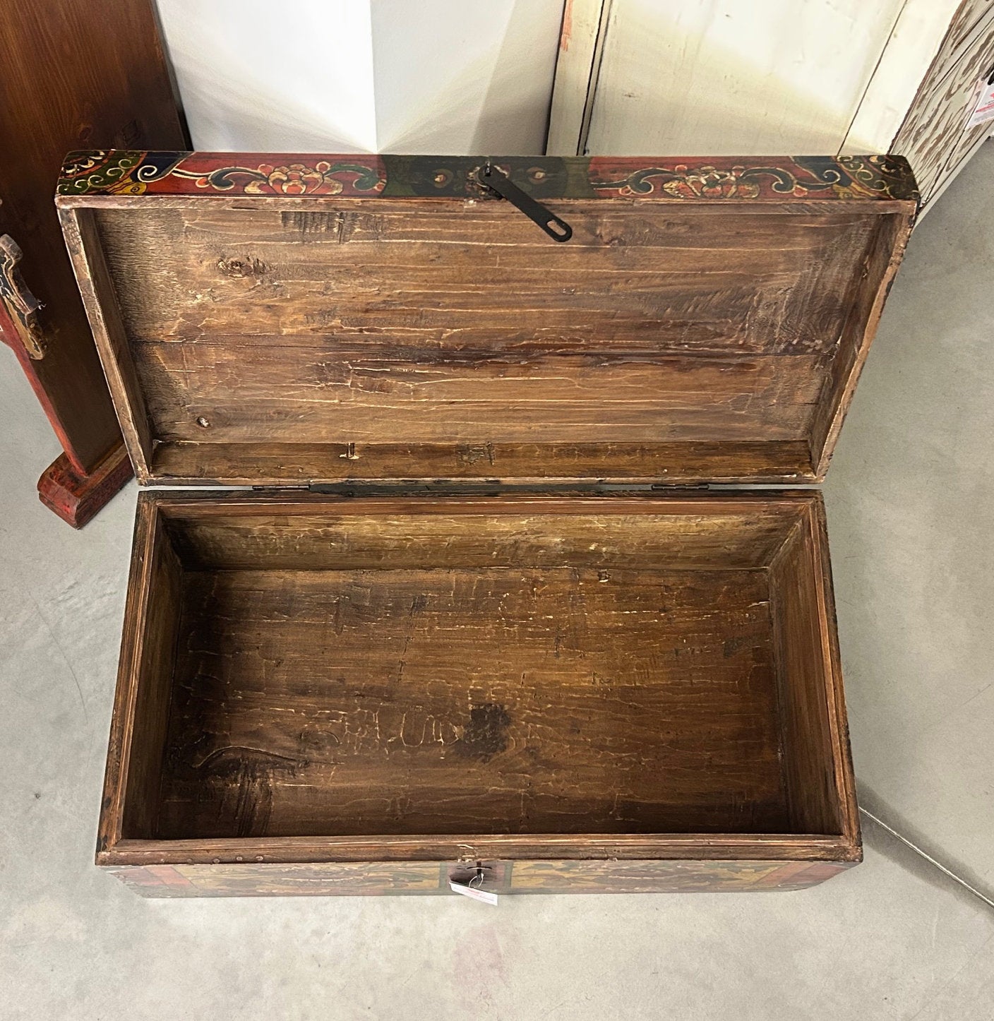 Baule dal fronte in lacca decorata con top in lacca color rosso. Provenieza regione settentrionale della Mongolia interna cinese.