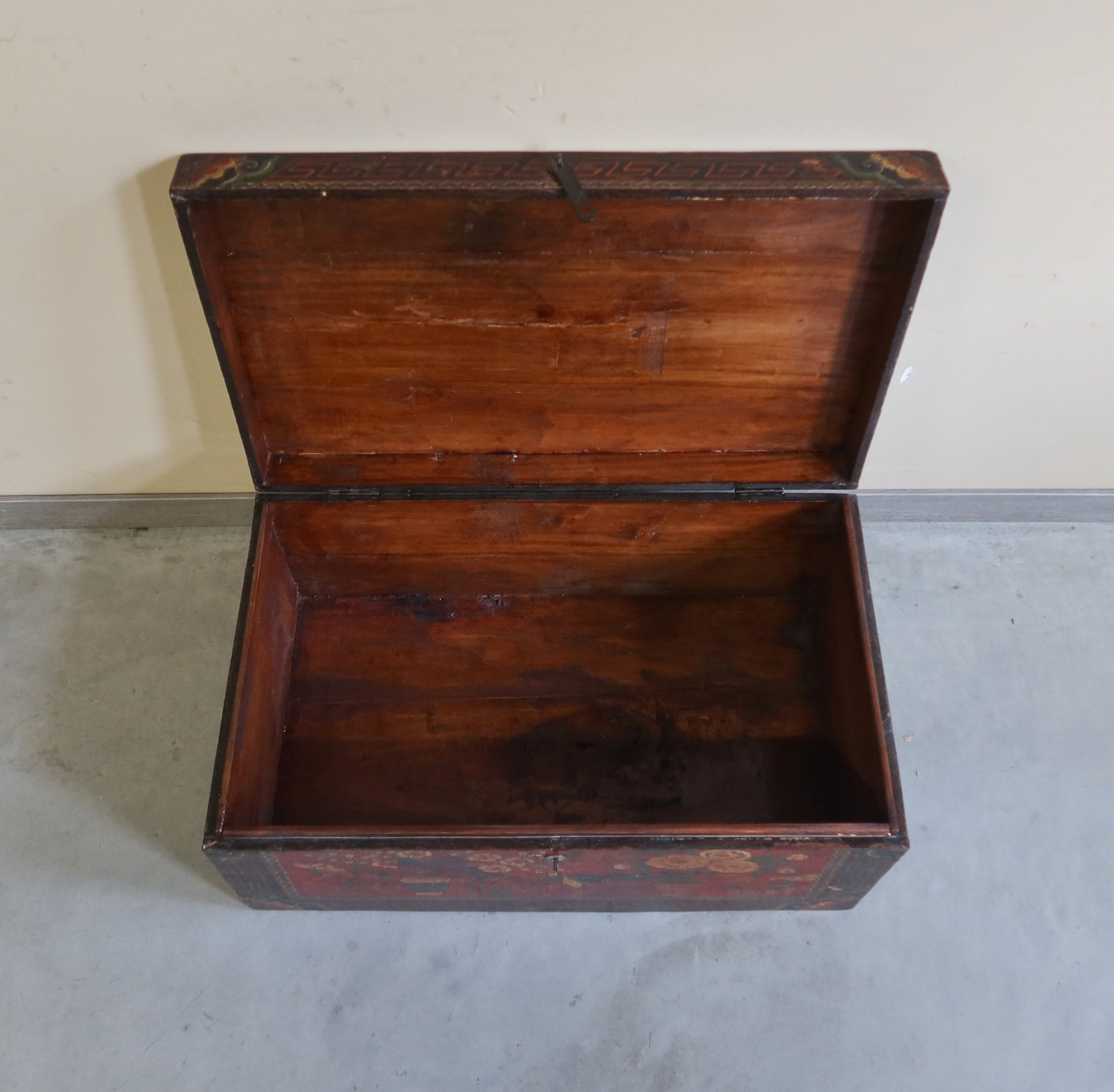 Baule in lacca con caratteristico ricco decoro floreale: particolare la cornice geometrica che racchiude il dipinto: il top è in lacca rossa. Provenienza regione della Mongolia interna cinese.