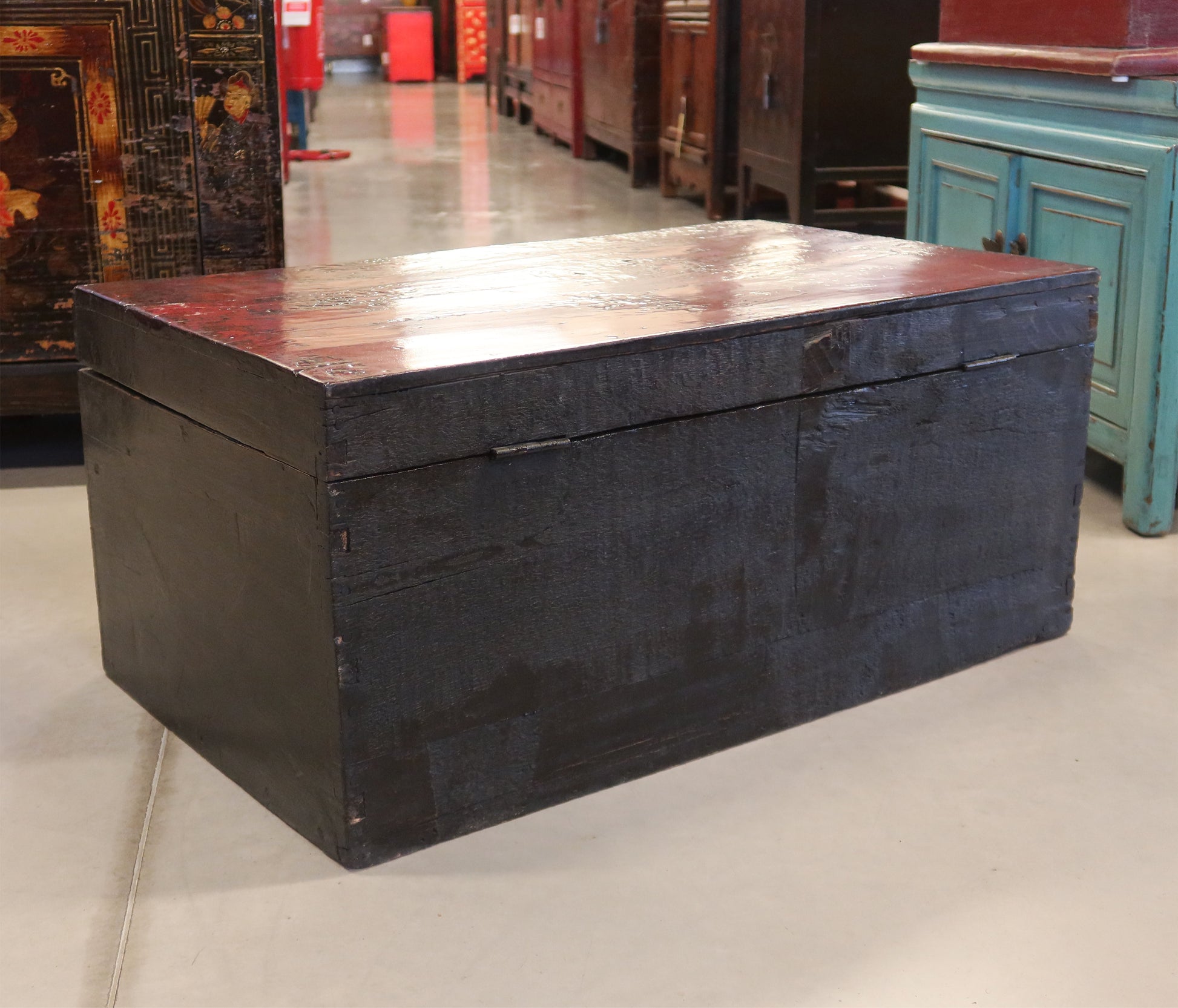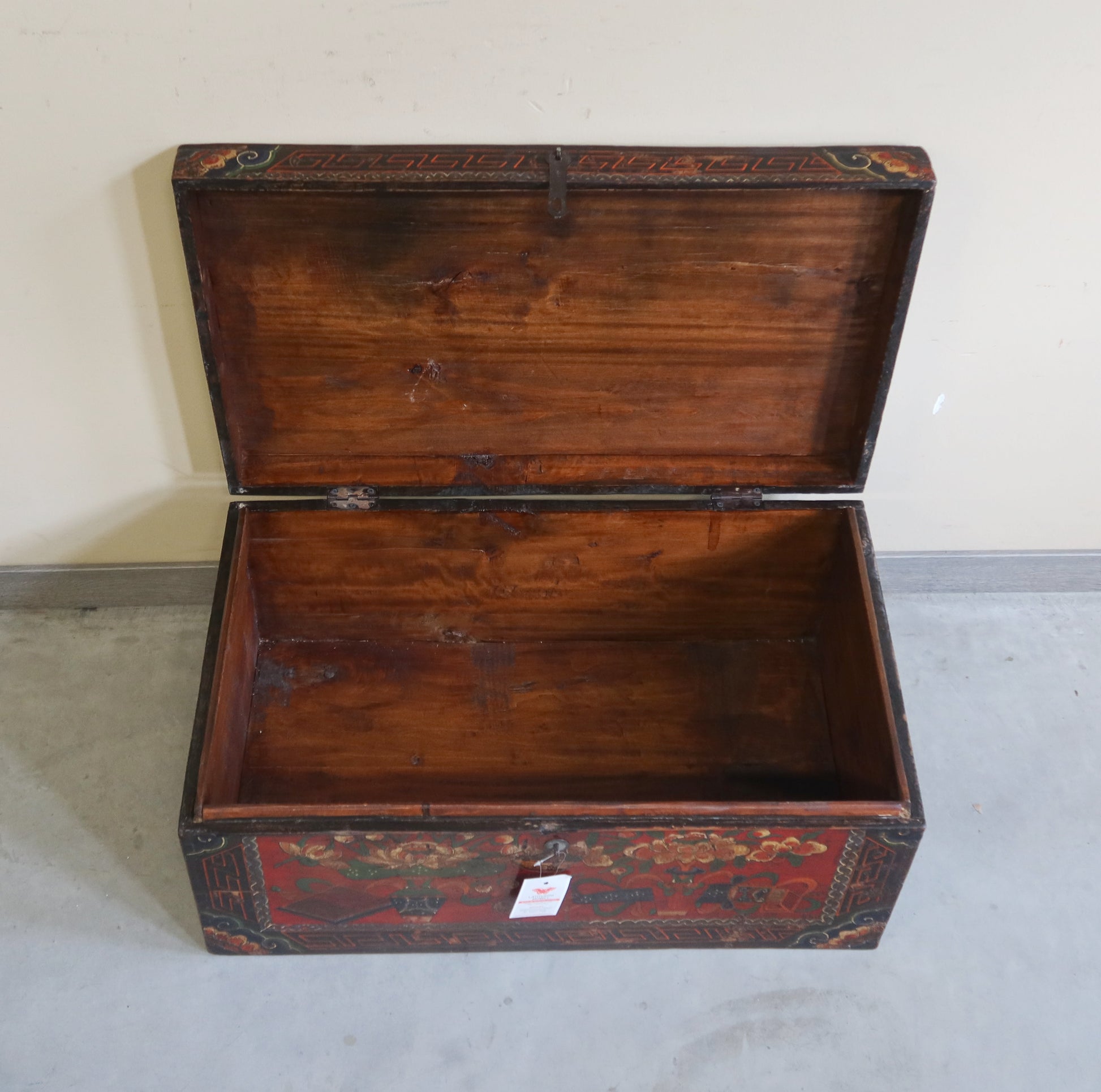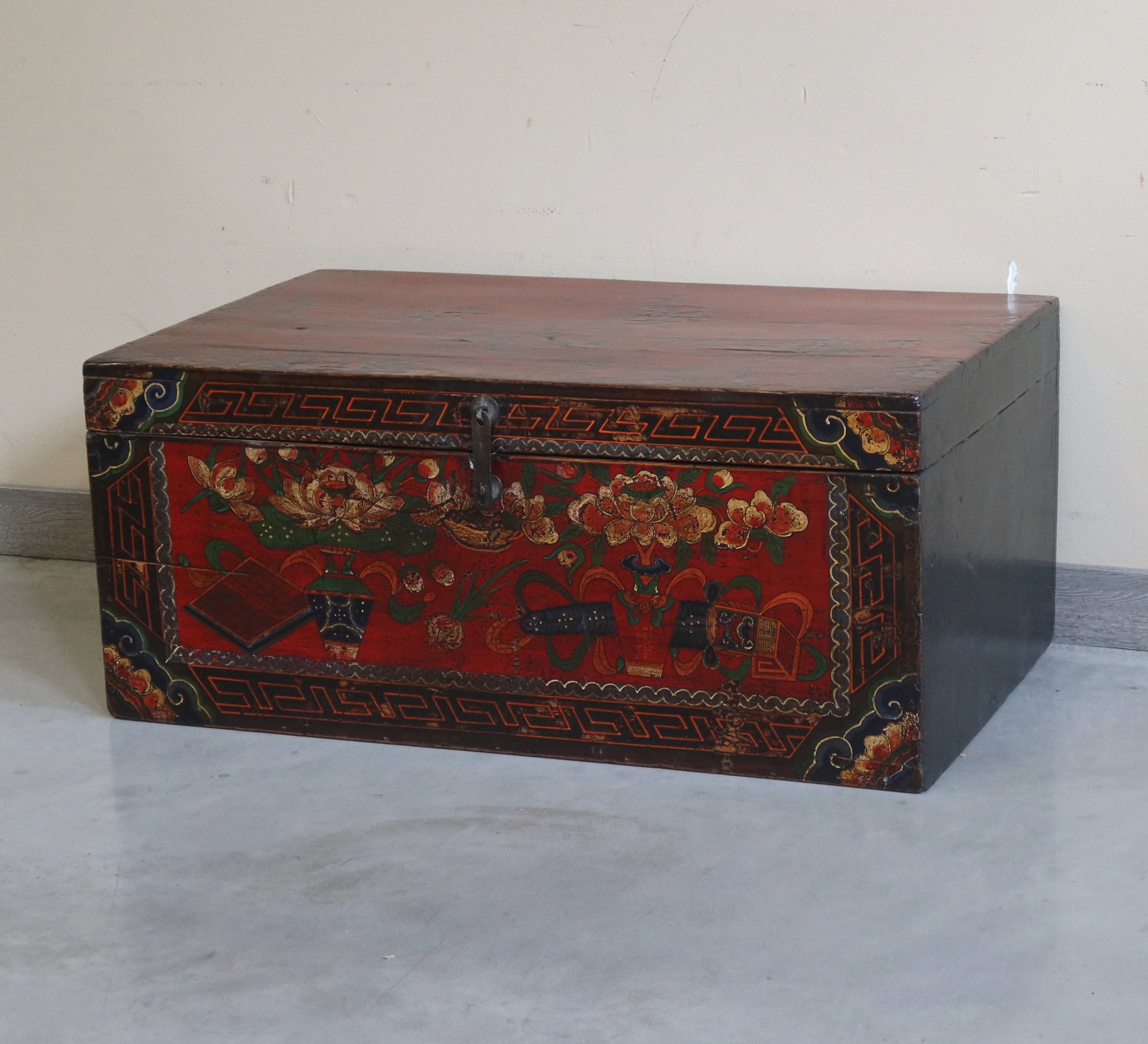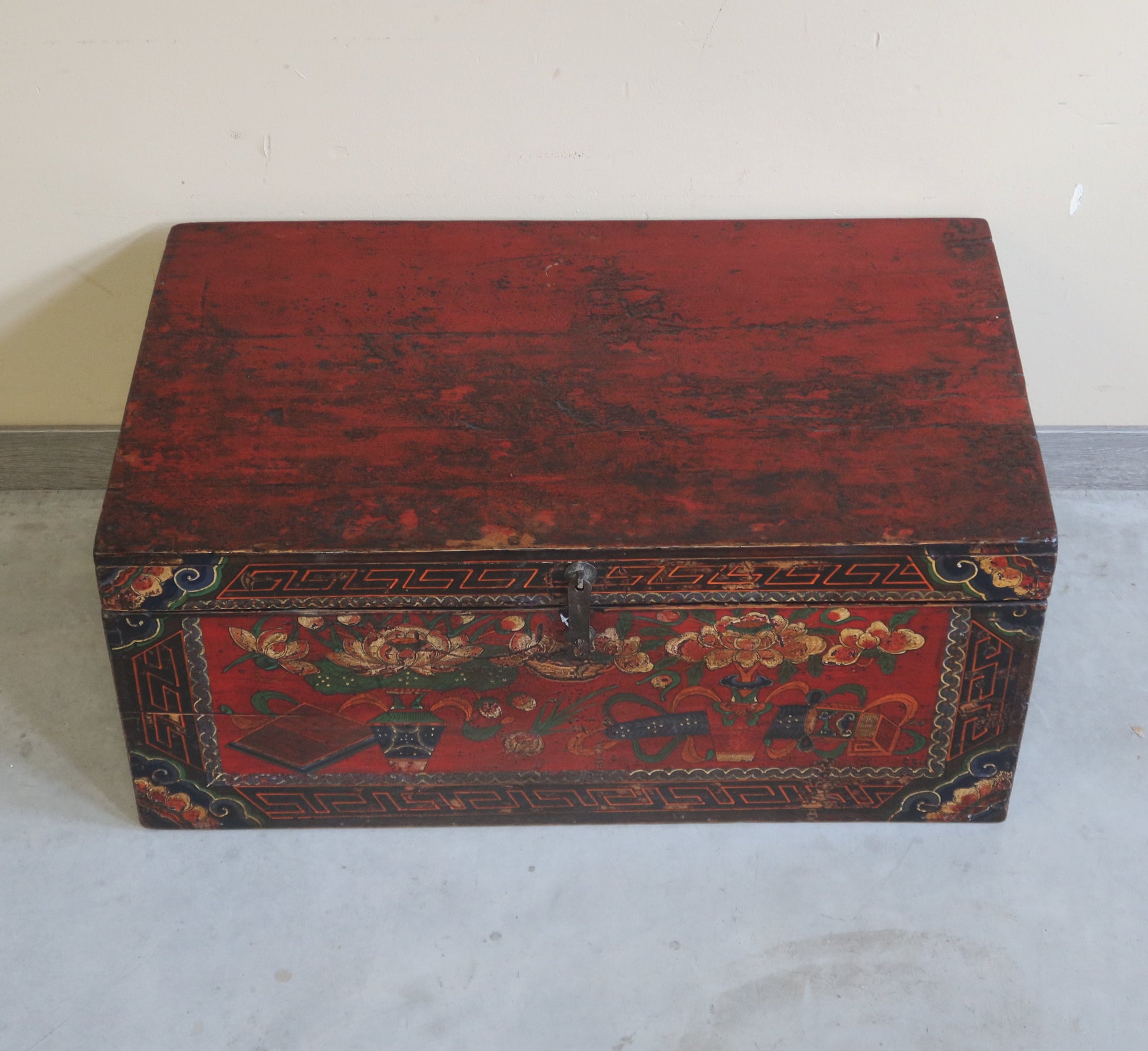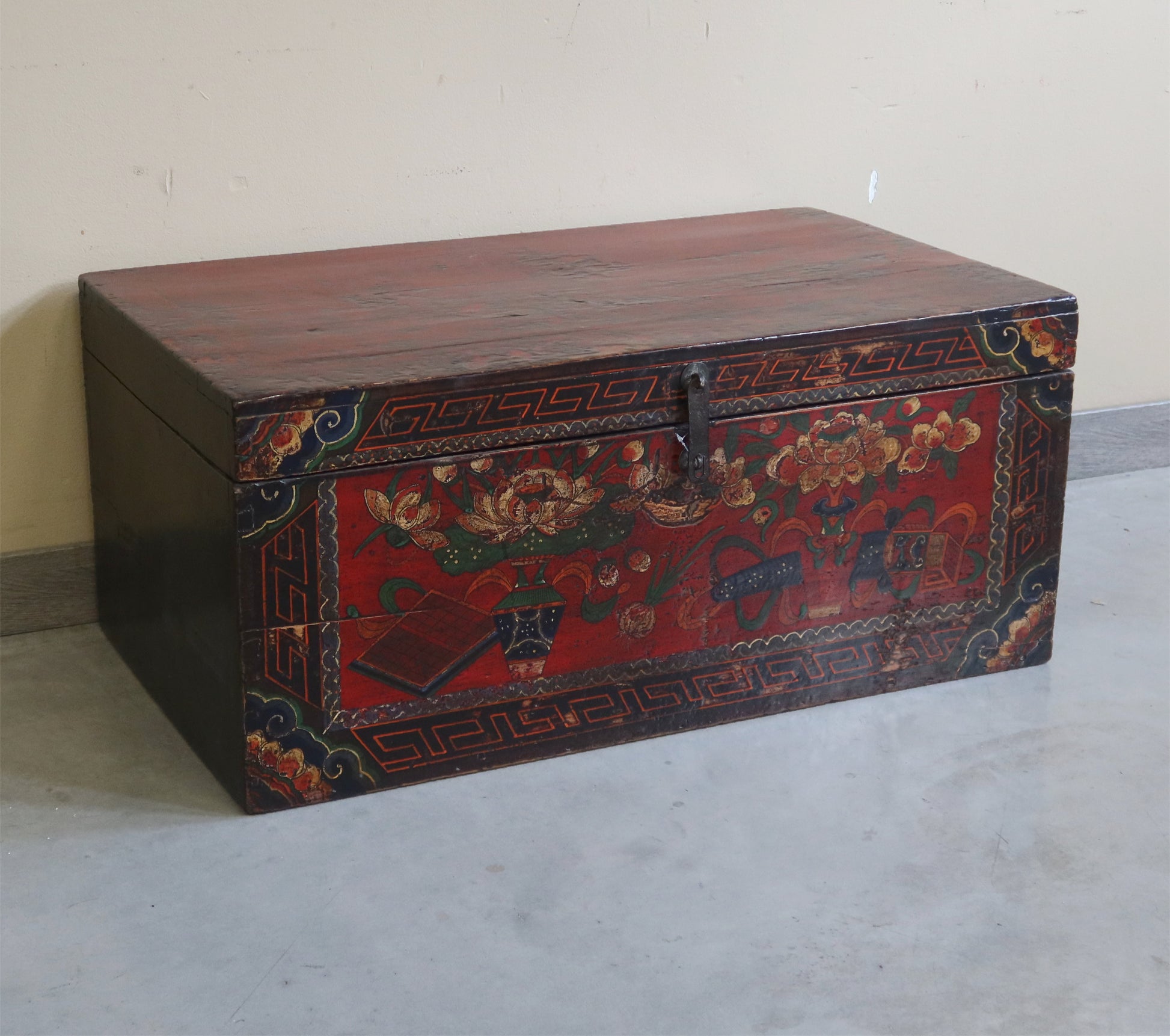 Baule in lacca rossa con caratteristico decoro floreale ricco. Provenienza regione della Mongolia interna cinese.