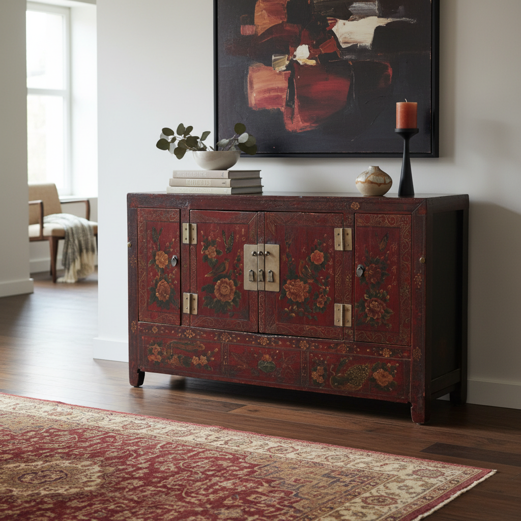 Credenza a buffet cinese, proveniente dalla regione del Dongbei, con delicato decoro floreale e apertura a due ante centrali e due laterali. La finitura è in patina e il pezzo ha un particolare sapore.