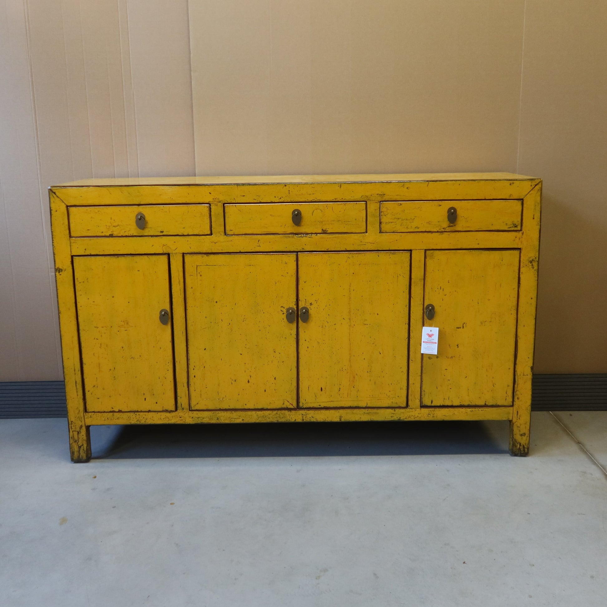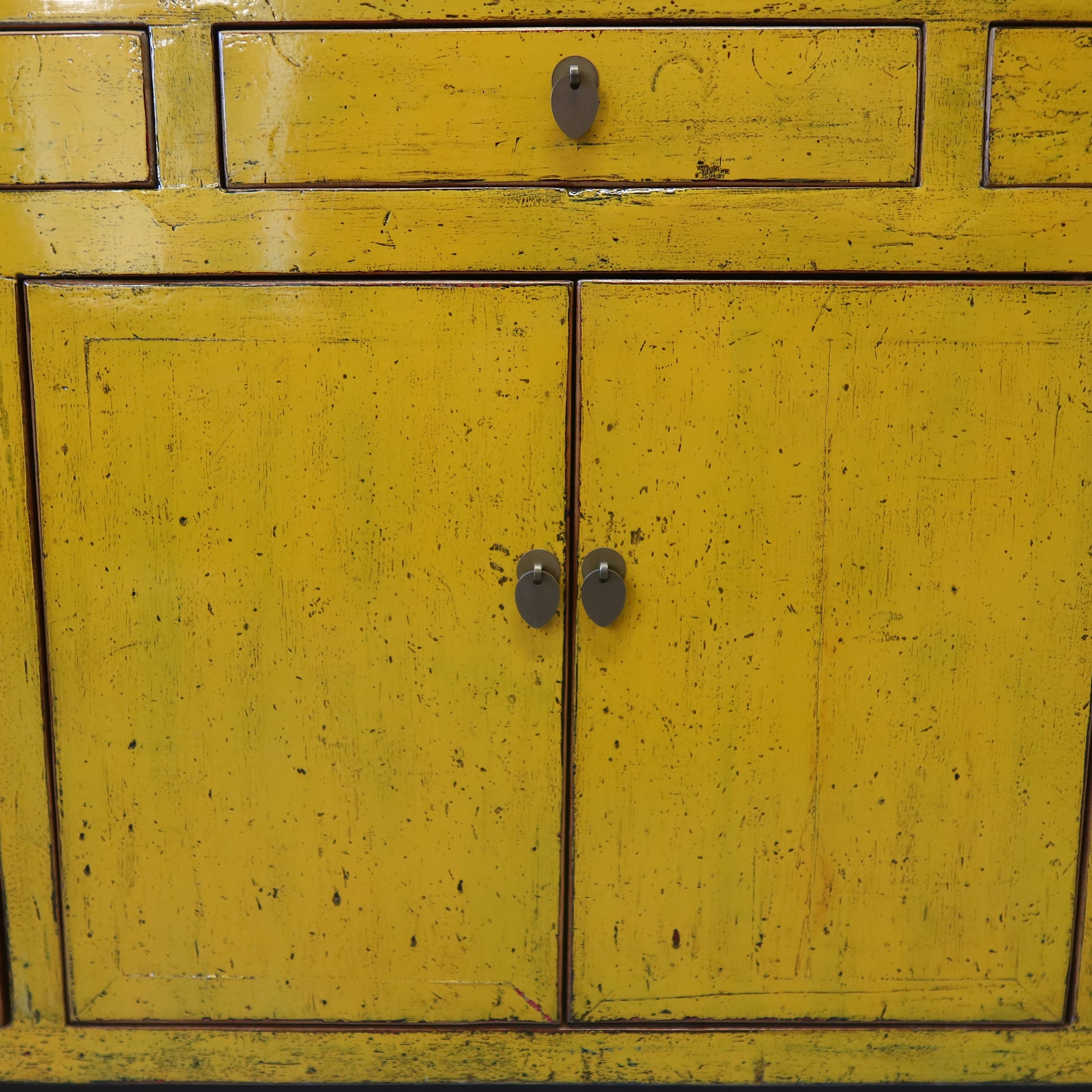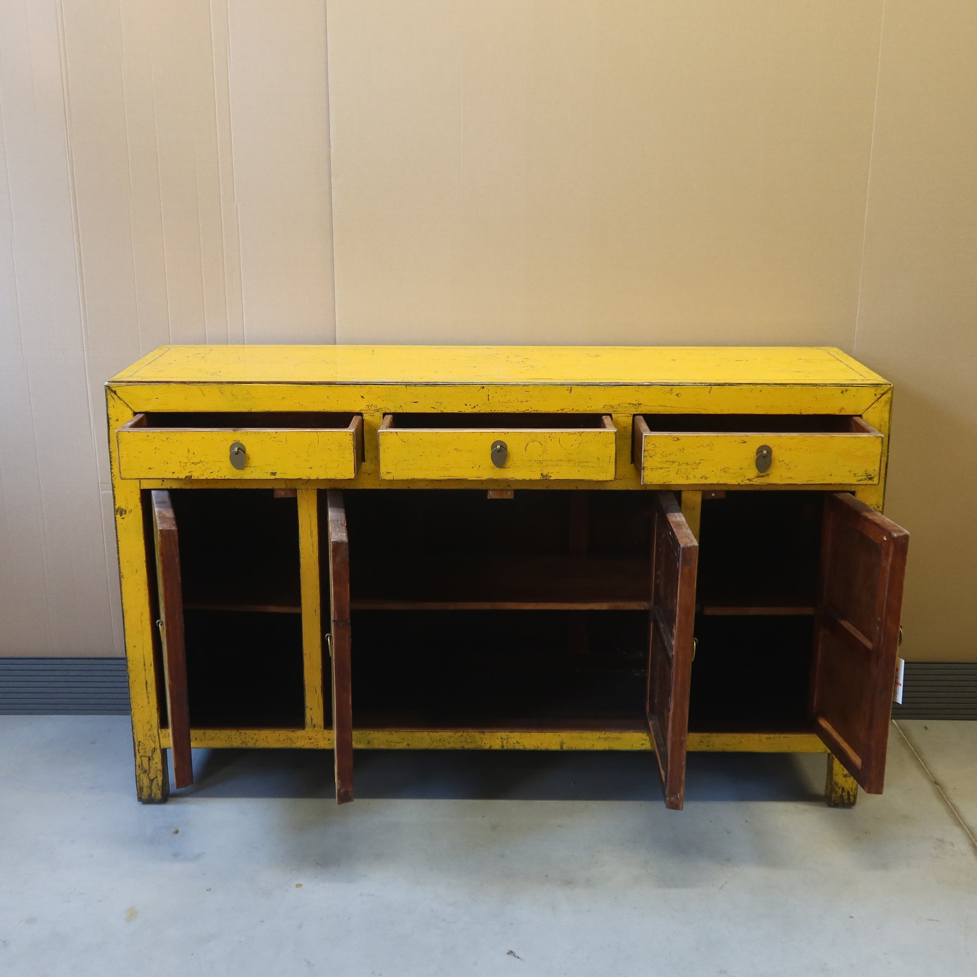 Rigorosa credenza cinese color giallo intenso a tre cassetti e quattro ante, La provenienza è la regione del Dongbei (Cina Nord-orientale).