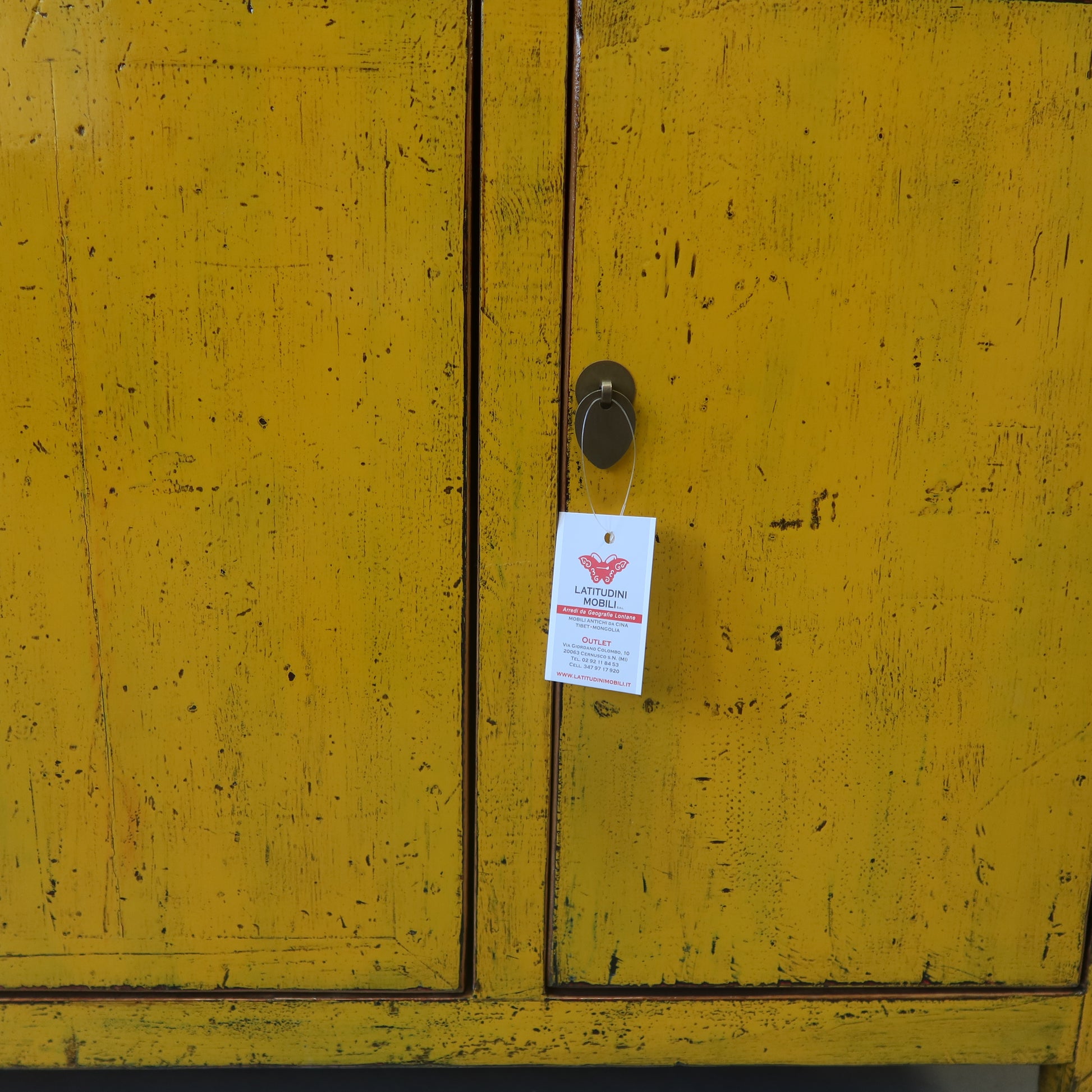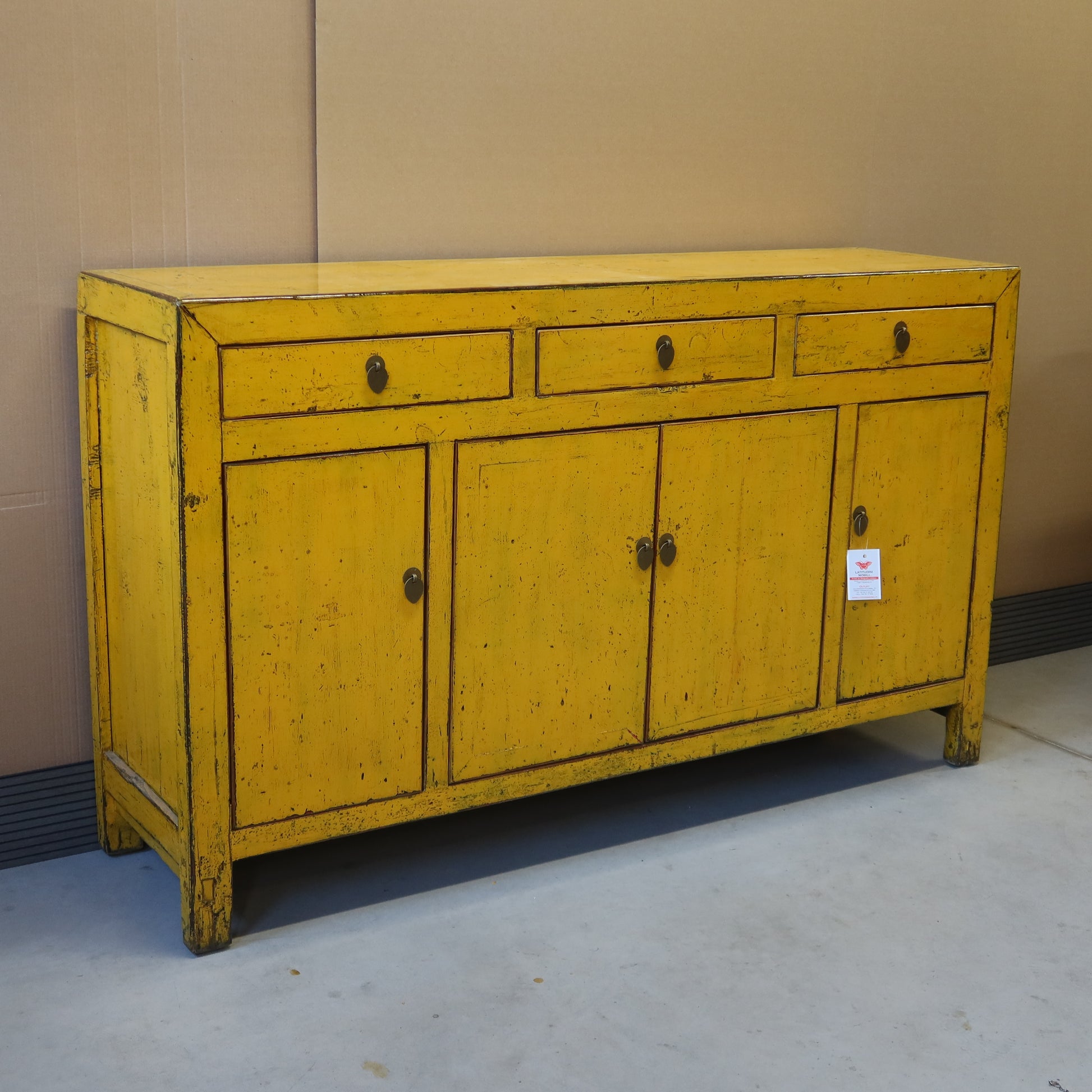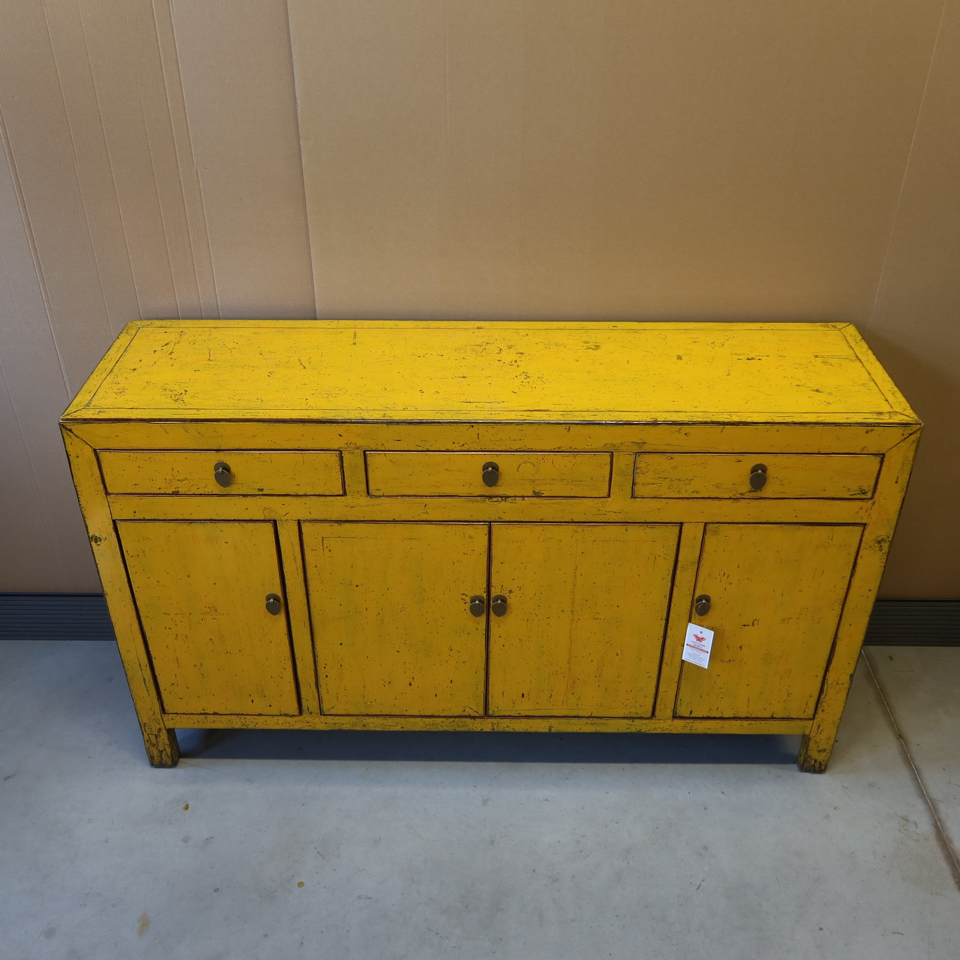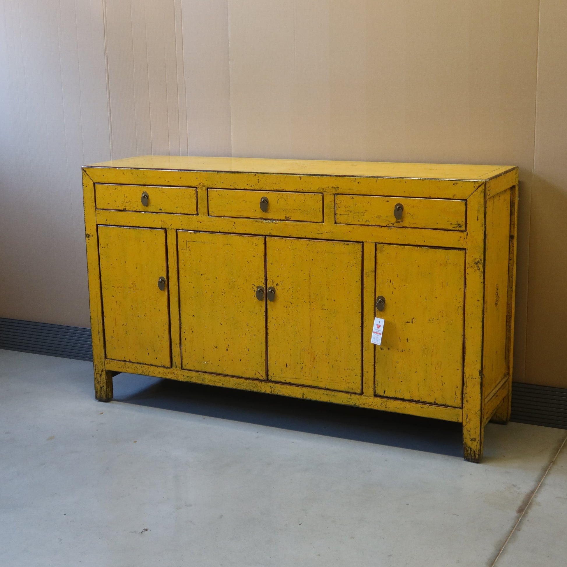 Rigorosa credenza cinese color giallo intenso a tre cassetti e quattro ante, La provenienza è la regione del Dongbei (Cina Nord-orientale).