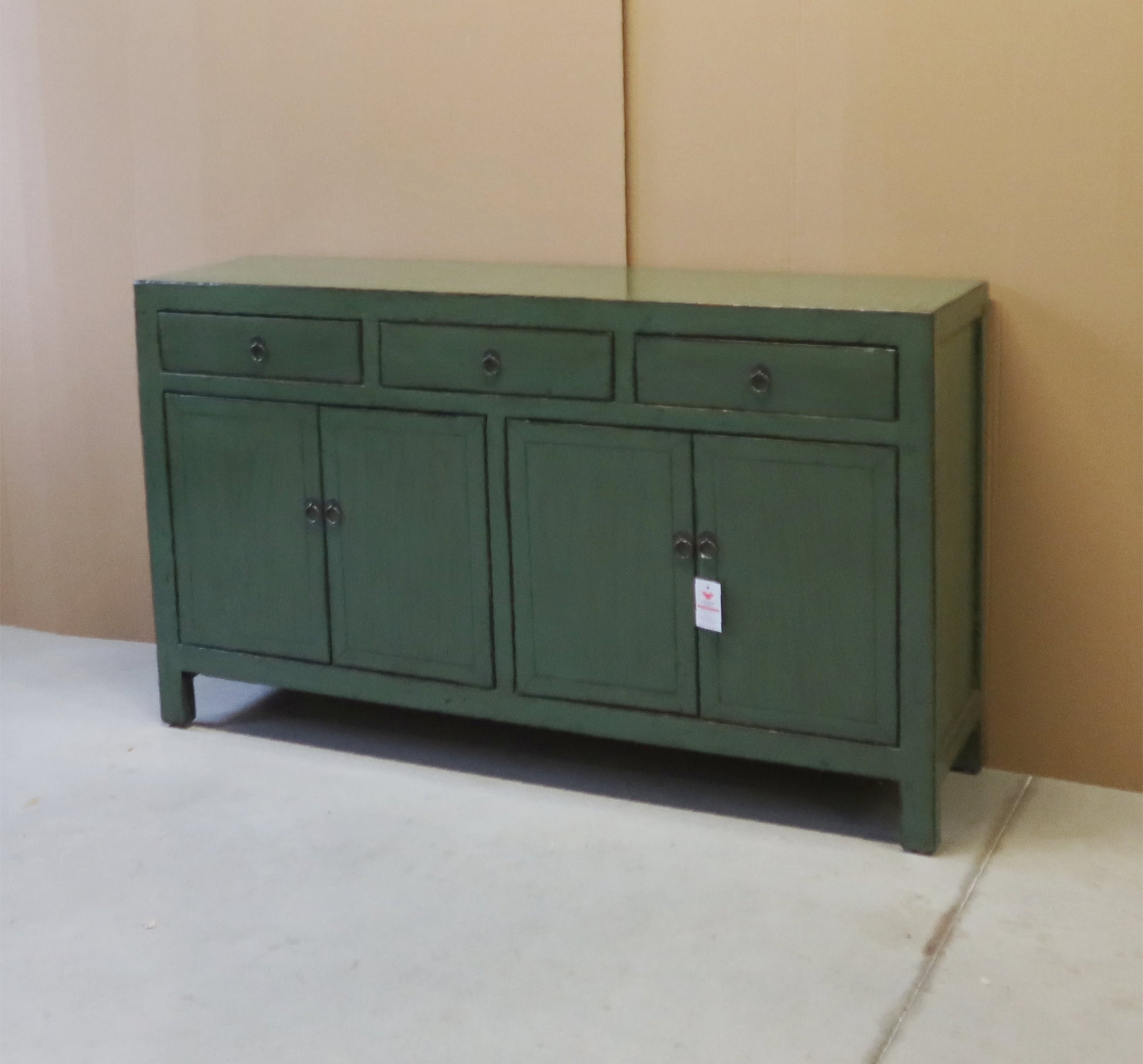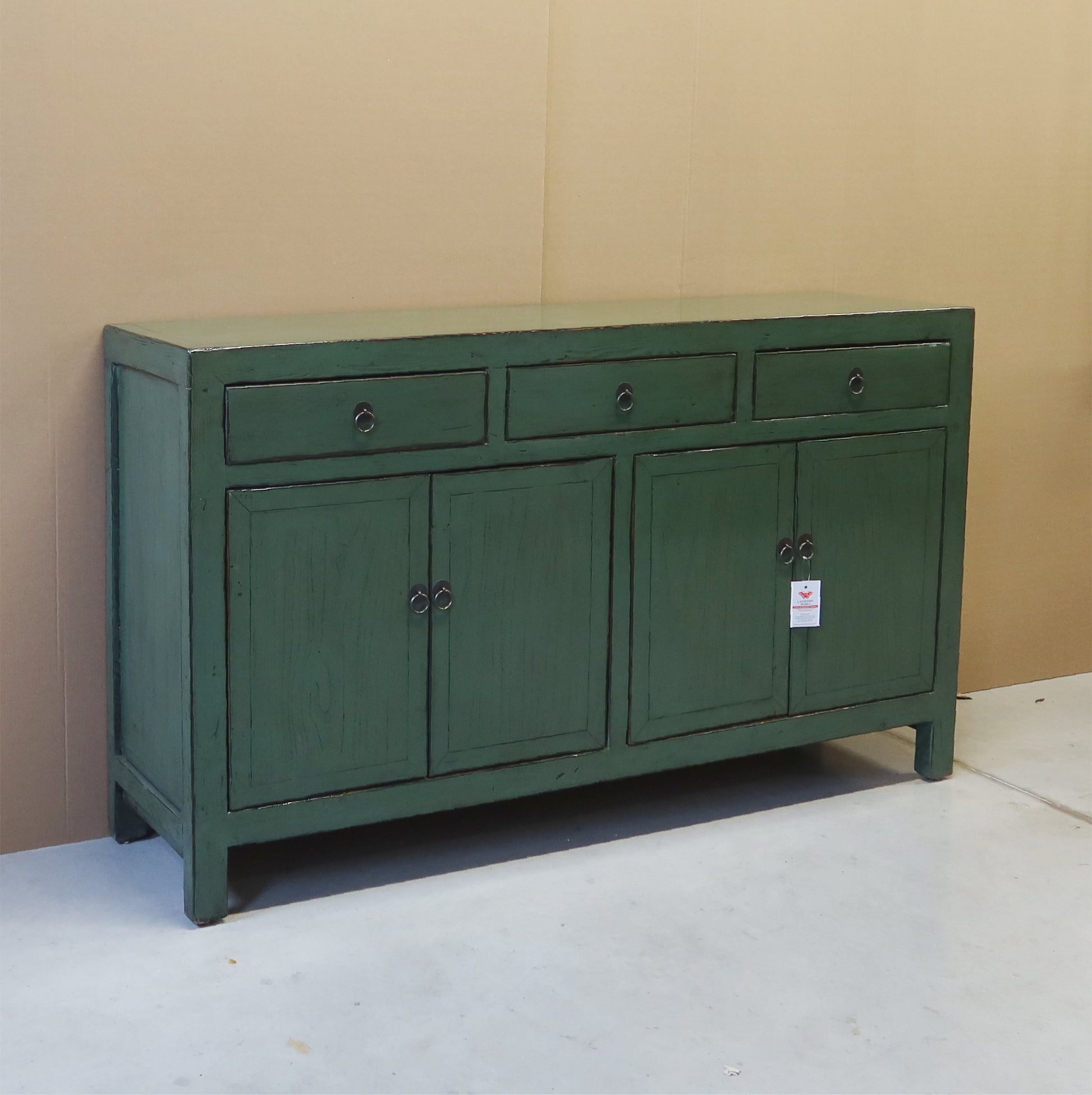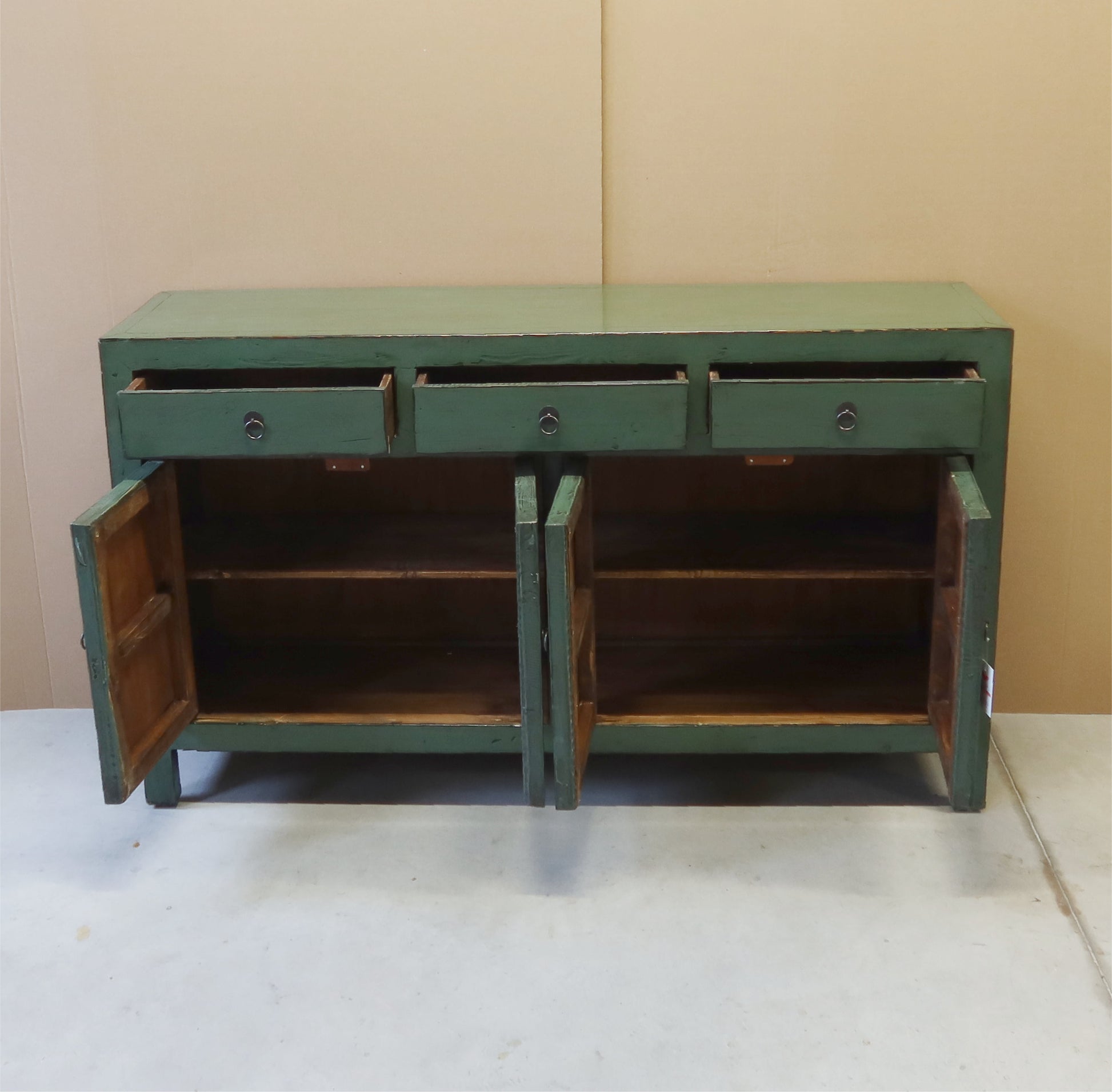 Rigorosa credenza cinese in lacca a quattro ante chiuse da caratteristica metalleria e tre cassetti nella fascia superiore. La provenienza è la regione del Dongbei (Cina Nord-orientale)