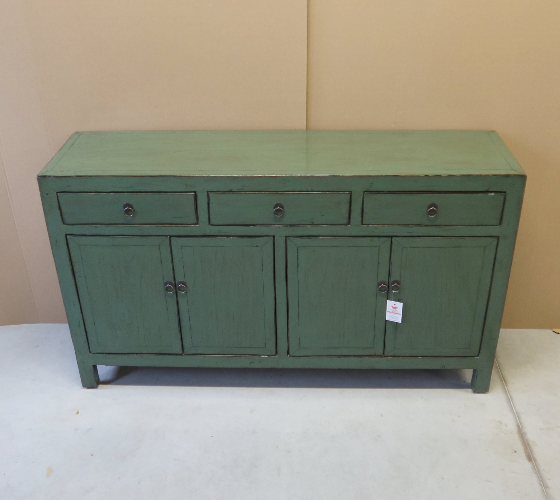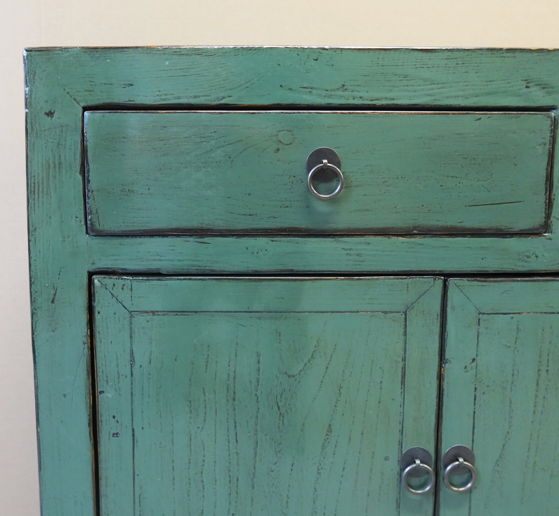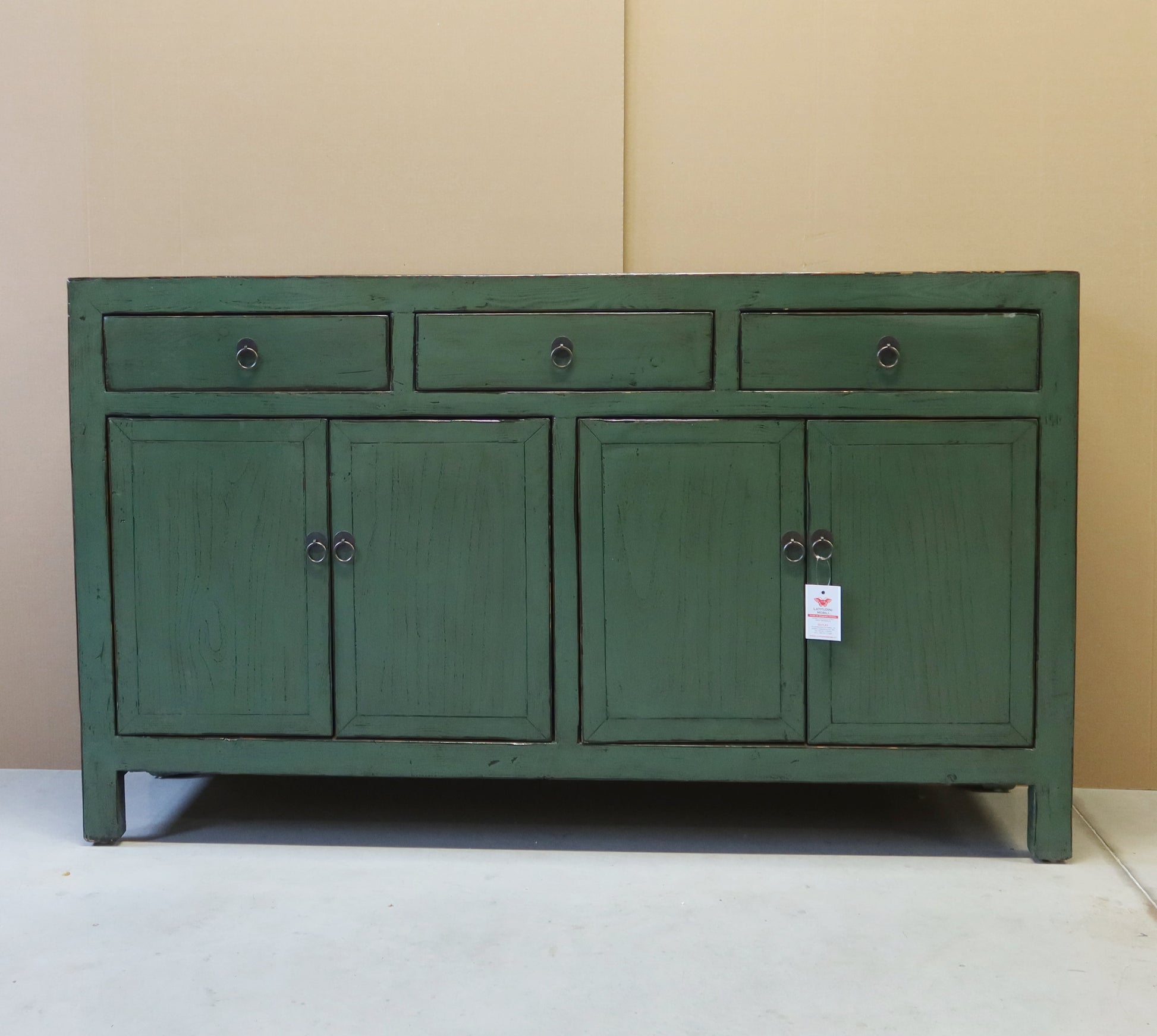 Rigorosa credenza cinese in lacca a quattro ante chiuse da caratteristica metalleria e tre cassetti nella fascia superiore. La provenienza è la regione del Dongbei (Cina Nord-orientale)