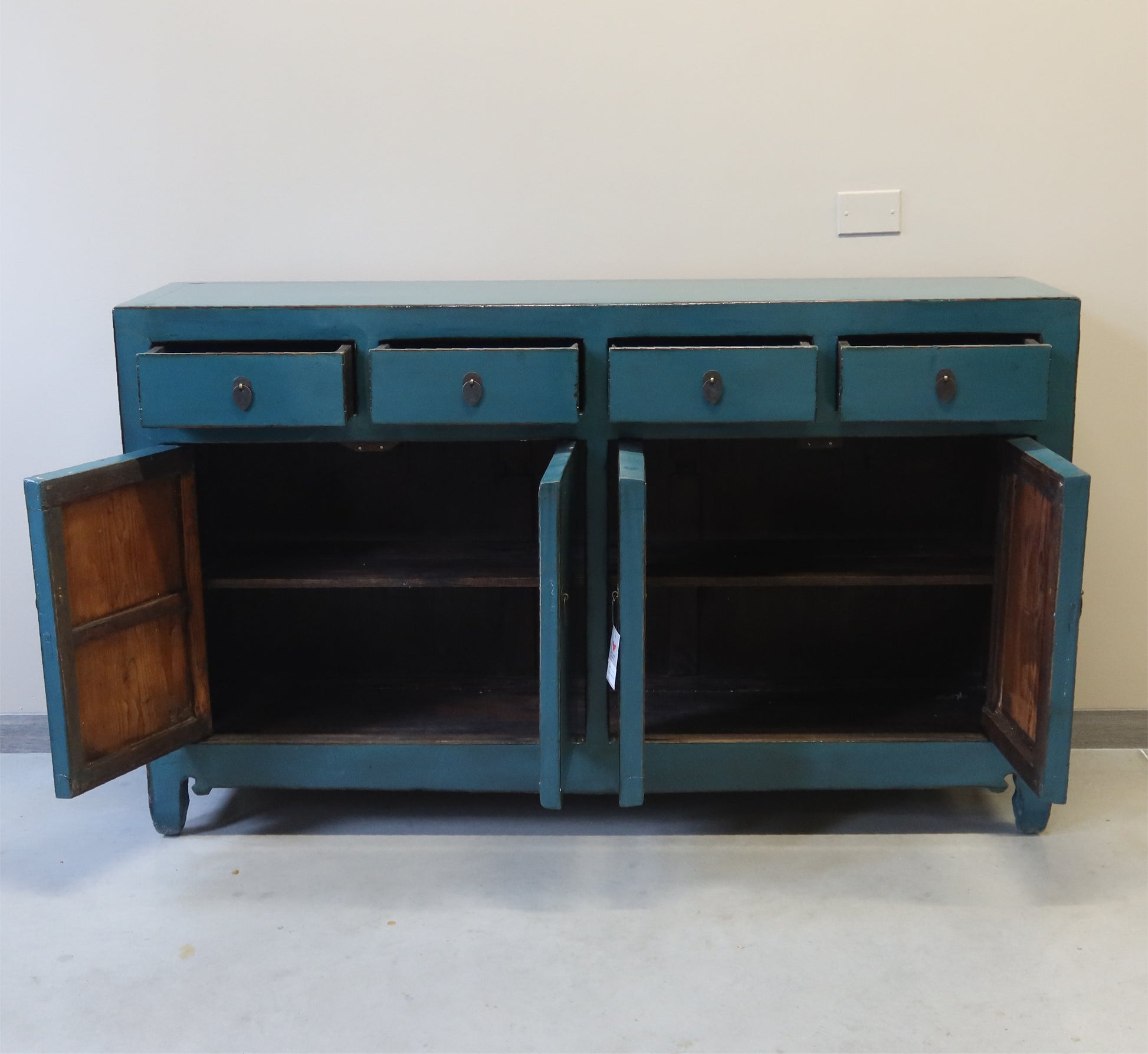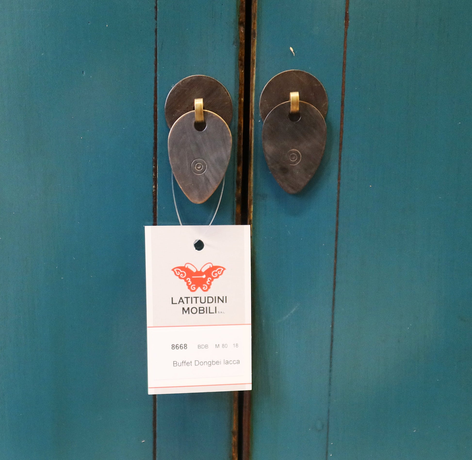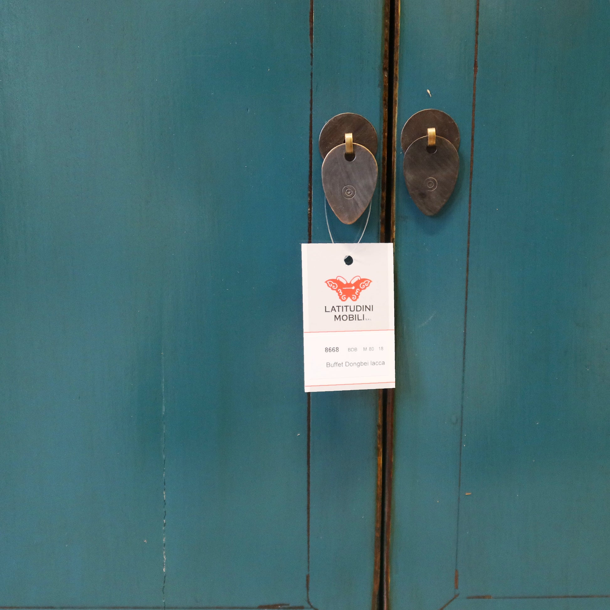 Rigorosa credenza cinese in lacca a quattro ante chiuse da caratteristica metalleria e tre cassetti nella fascia superiore. La provenienza è la regione del Dongbei (Cina Nord-orientale)