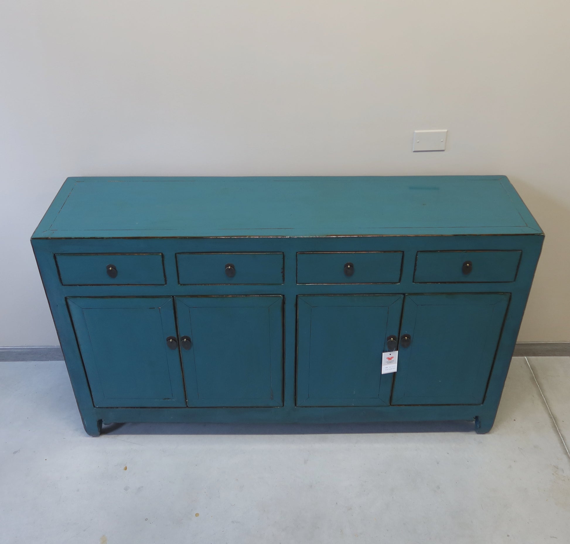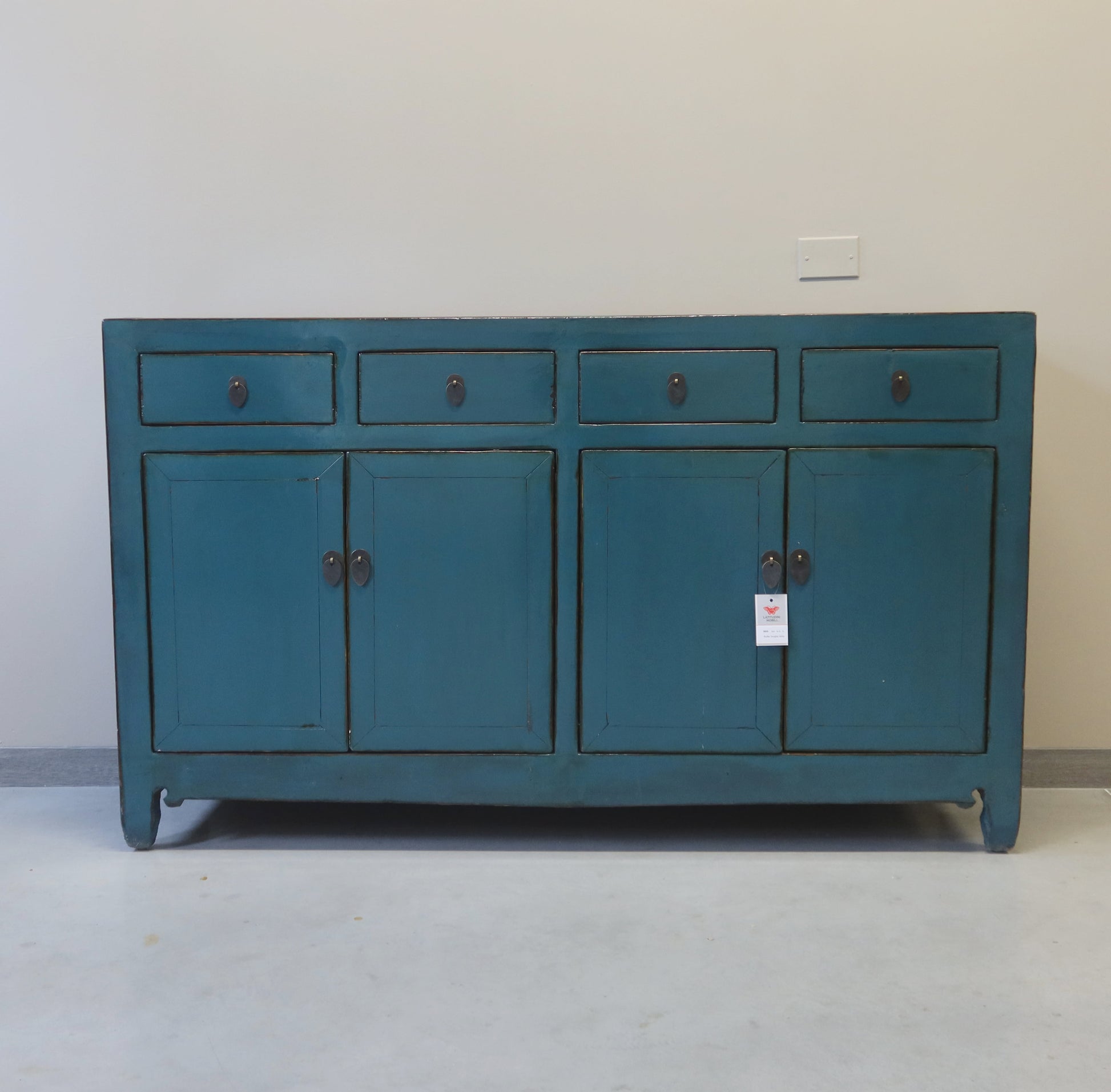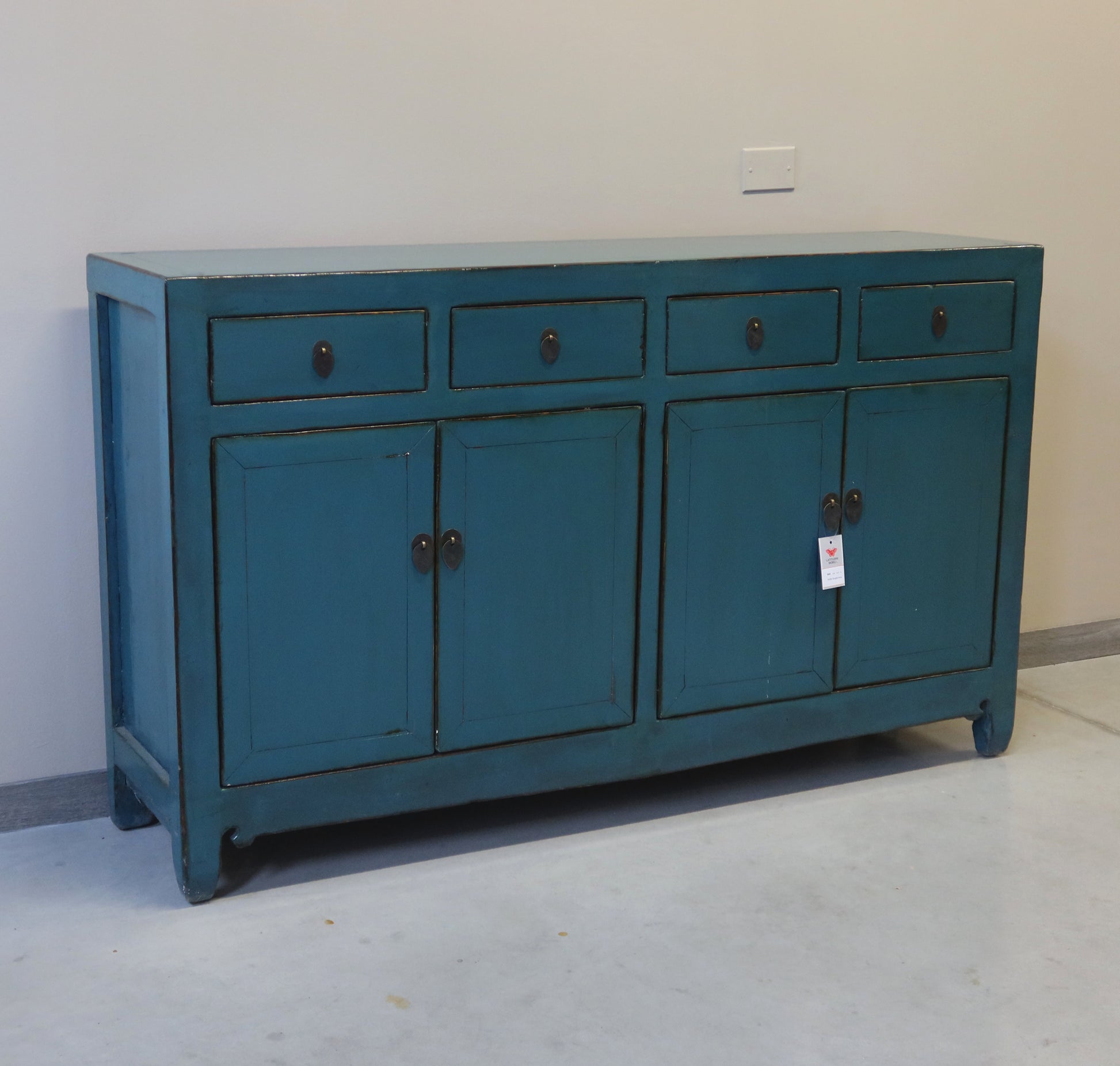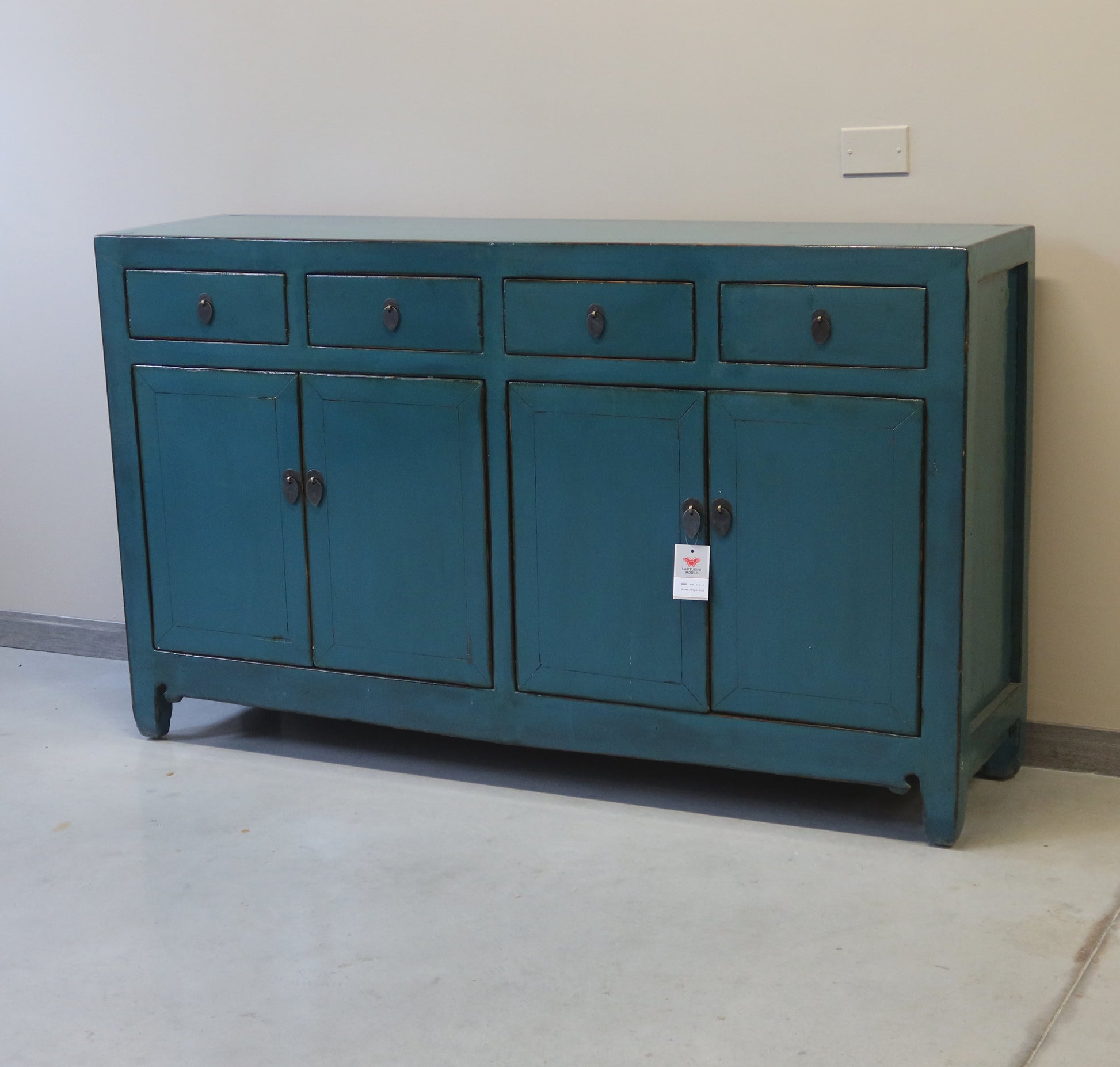 Rigorosa credenza cinese in lacca a quattro ante chiuse da caratteristica metalleria e tre cassetti nella fascia superiore. La provenienza è la regione del Dongbei (Cina Nord-orientale)