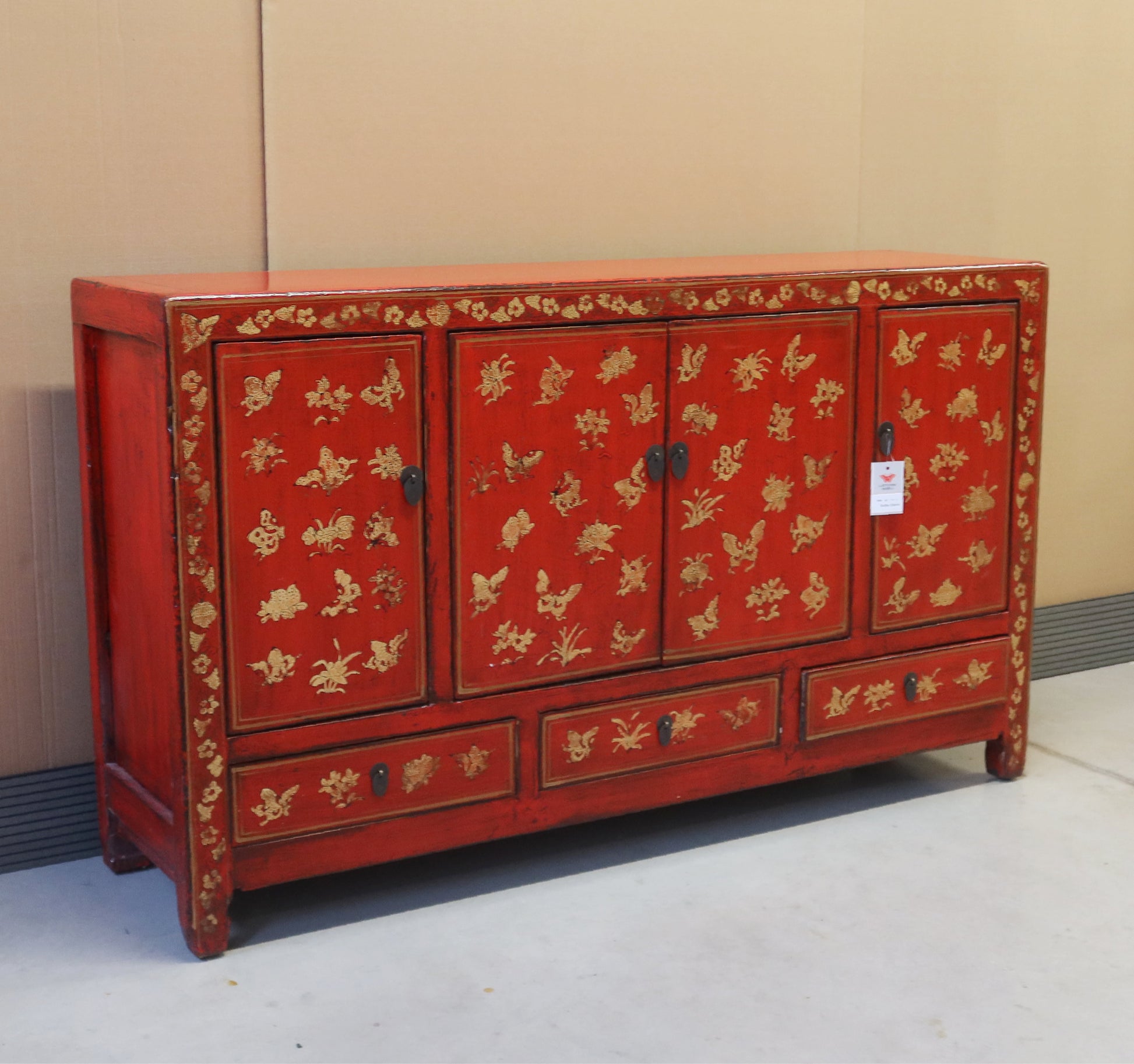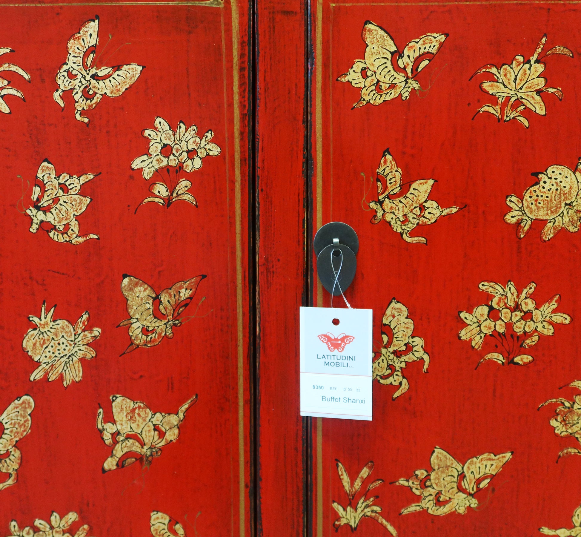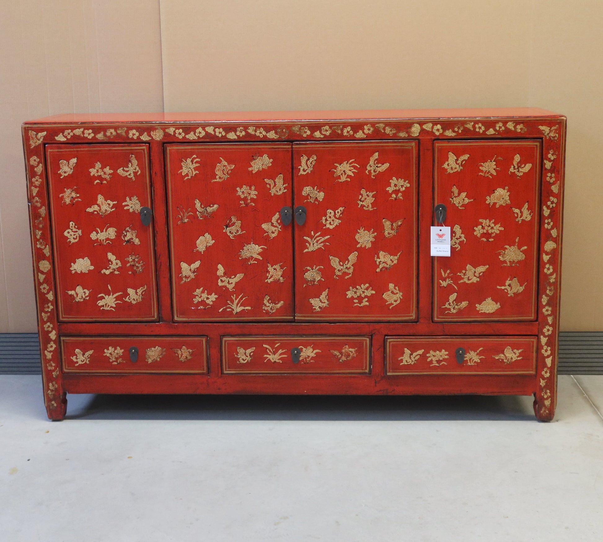 Bella credenza cinese dalla rigorosa forma ingentilita da un raffinato decoro dorato sul fronte. Finitura in lacca rossa. La provenienza di questo mobile etnico è la regione dello Shanxi.