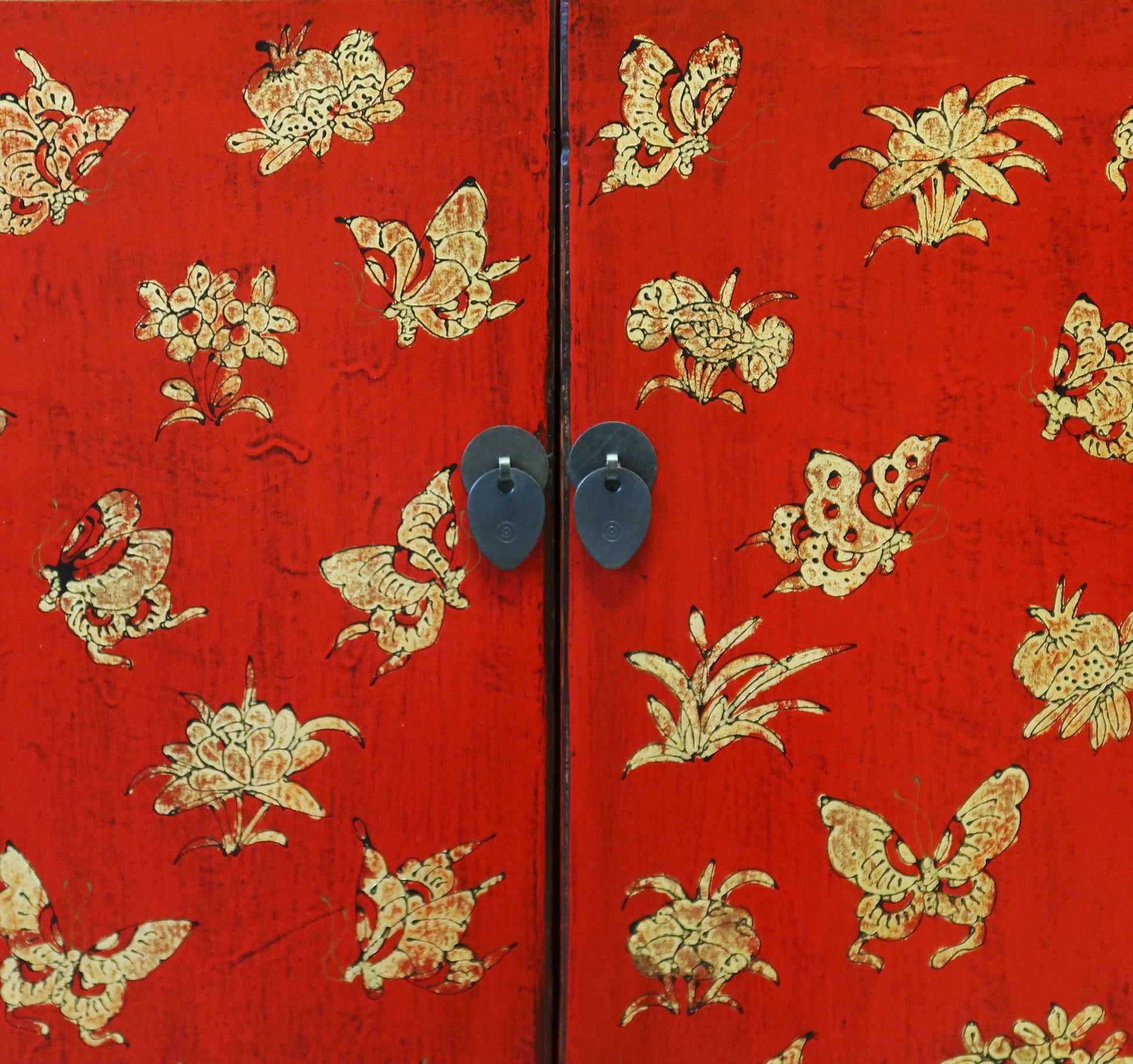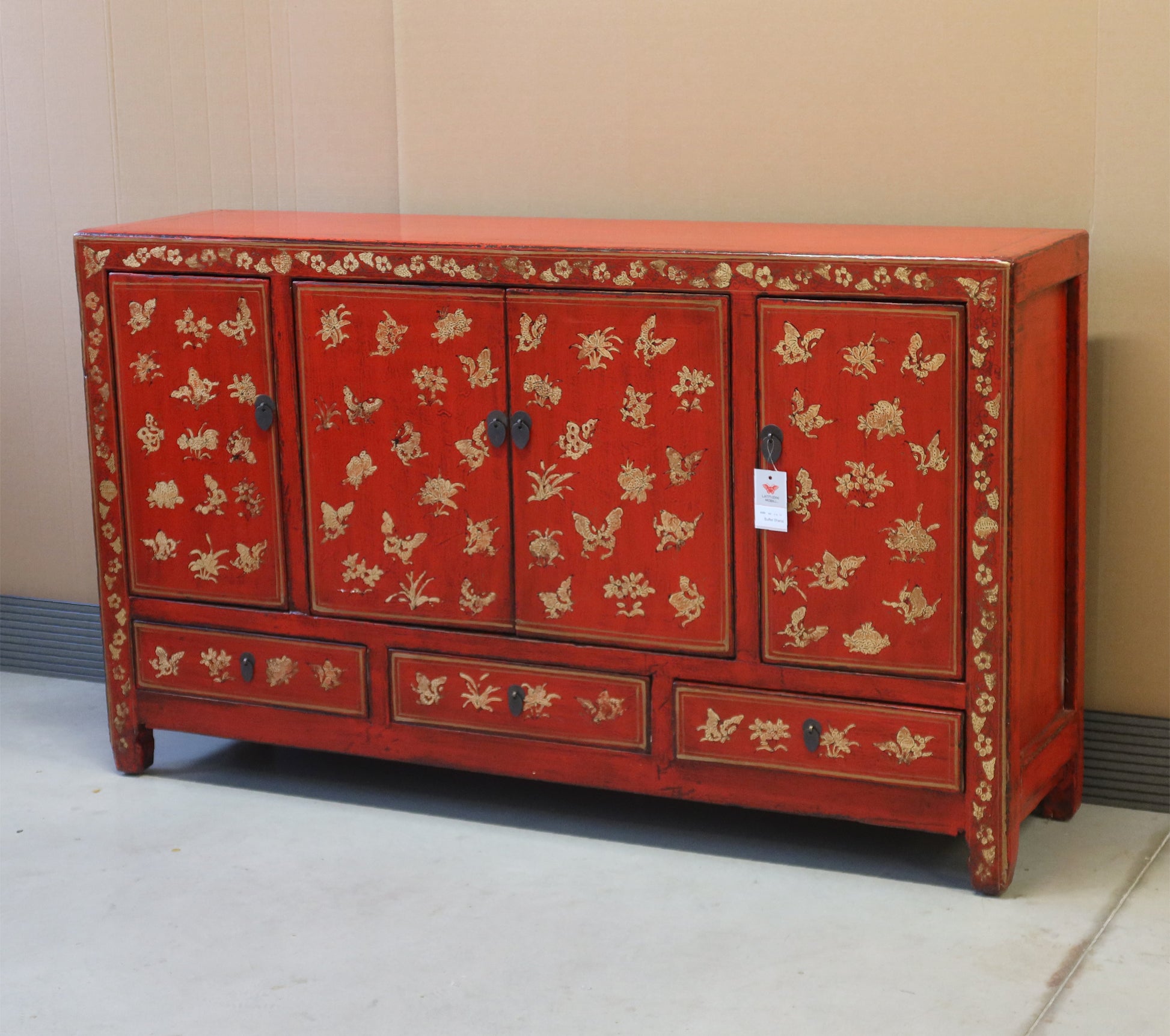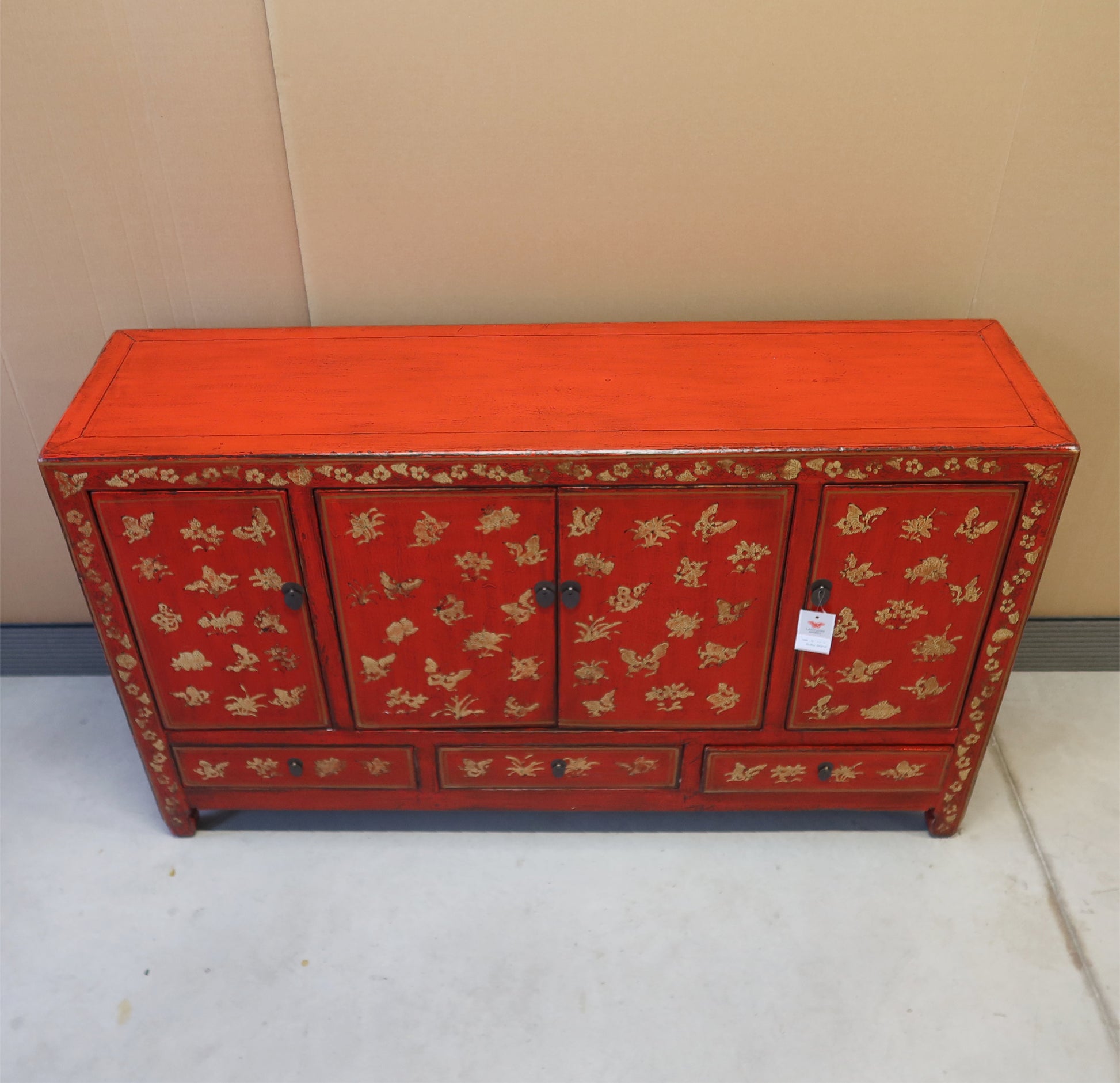 Bella credenza cinese dalla rigorosa forma ingentilita da un raffinato decoro dorato sul fronte. Finitura in lacca rossa. La provenienza di questo mobile etnico è la regione dello Shanxi.