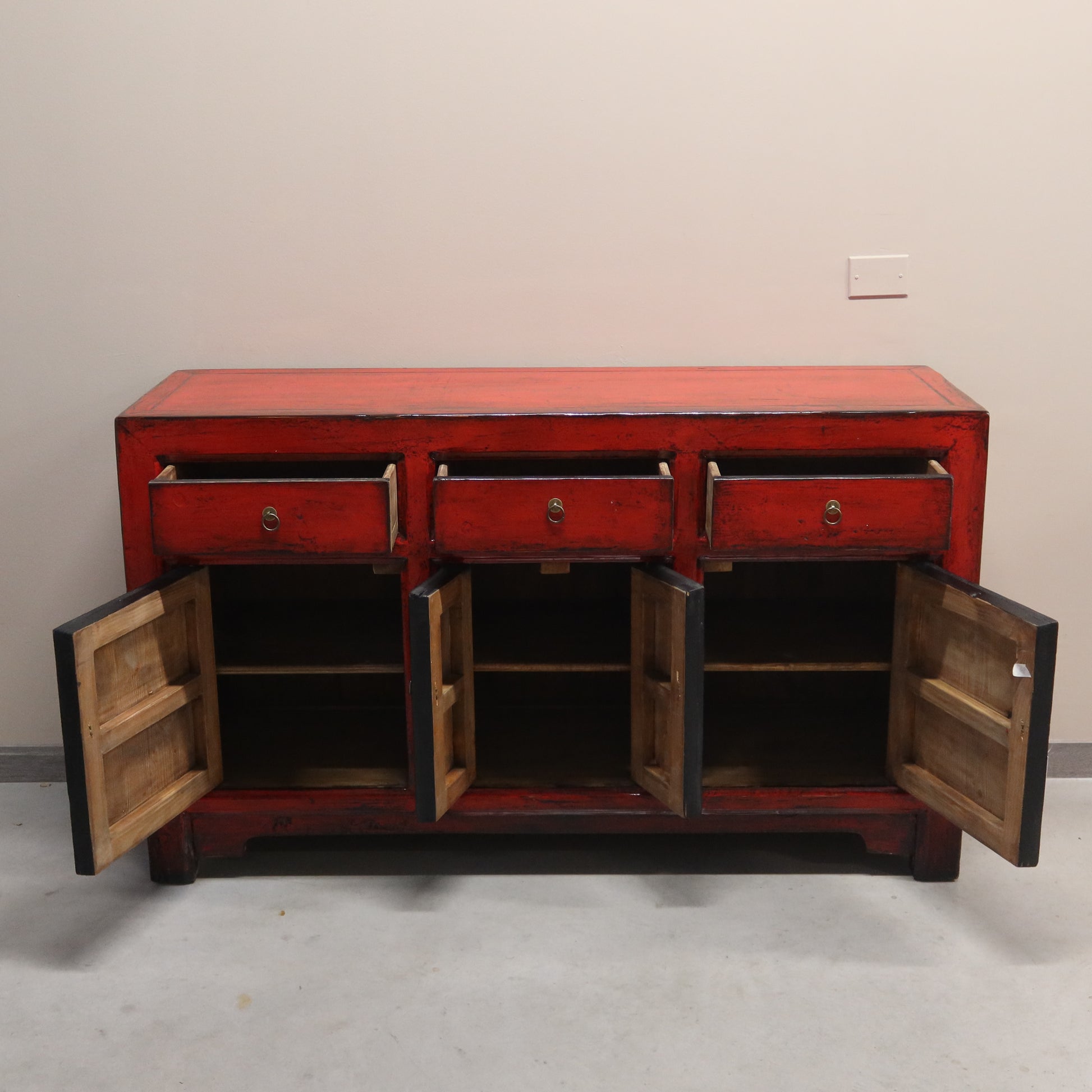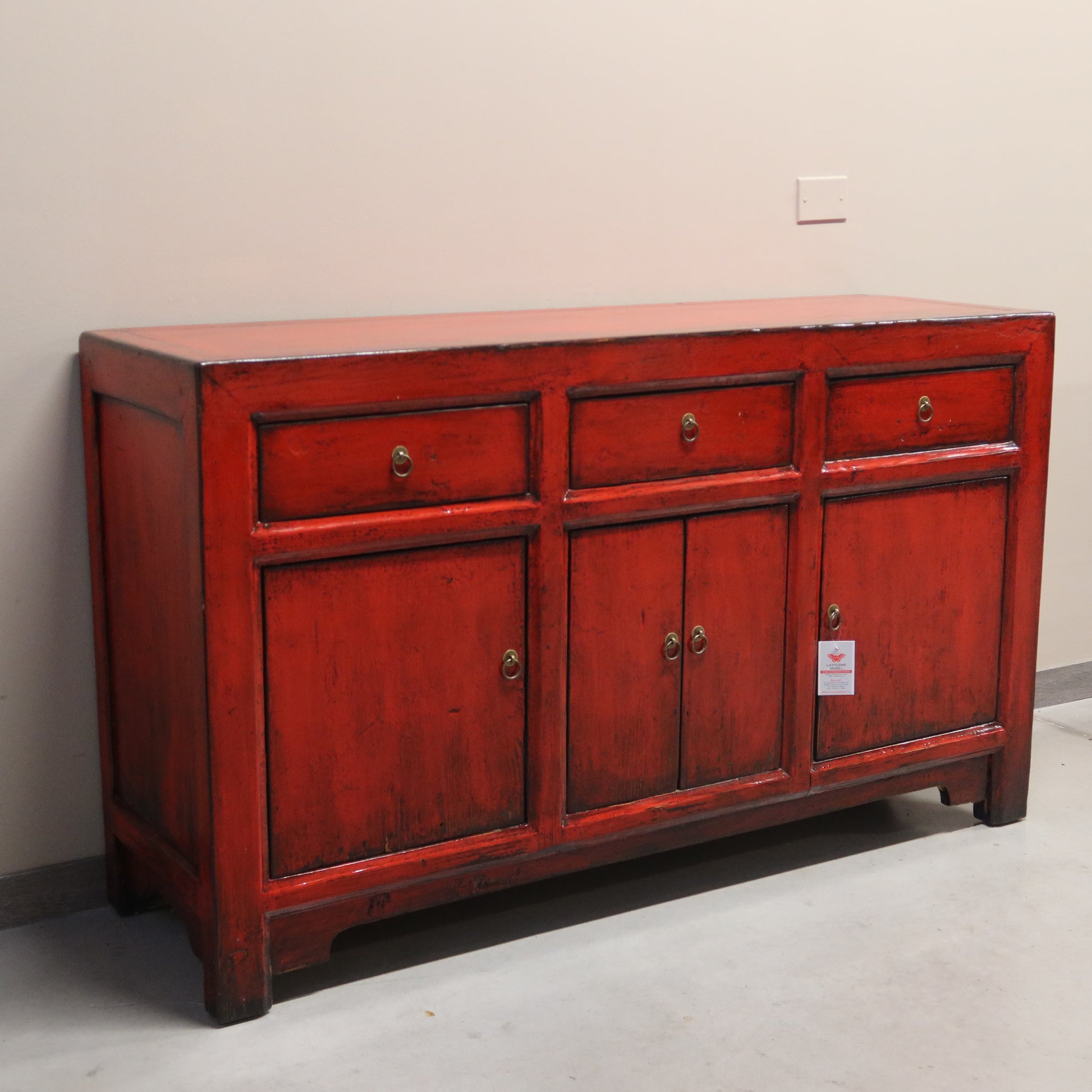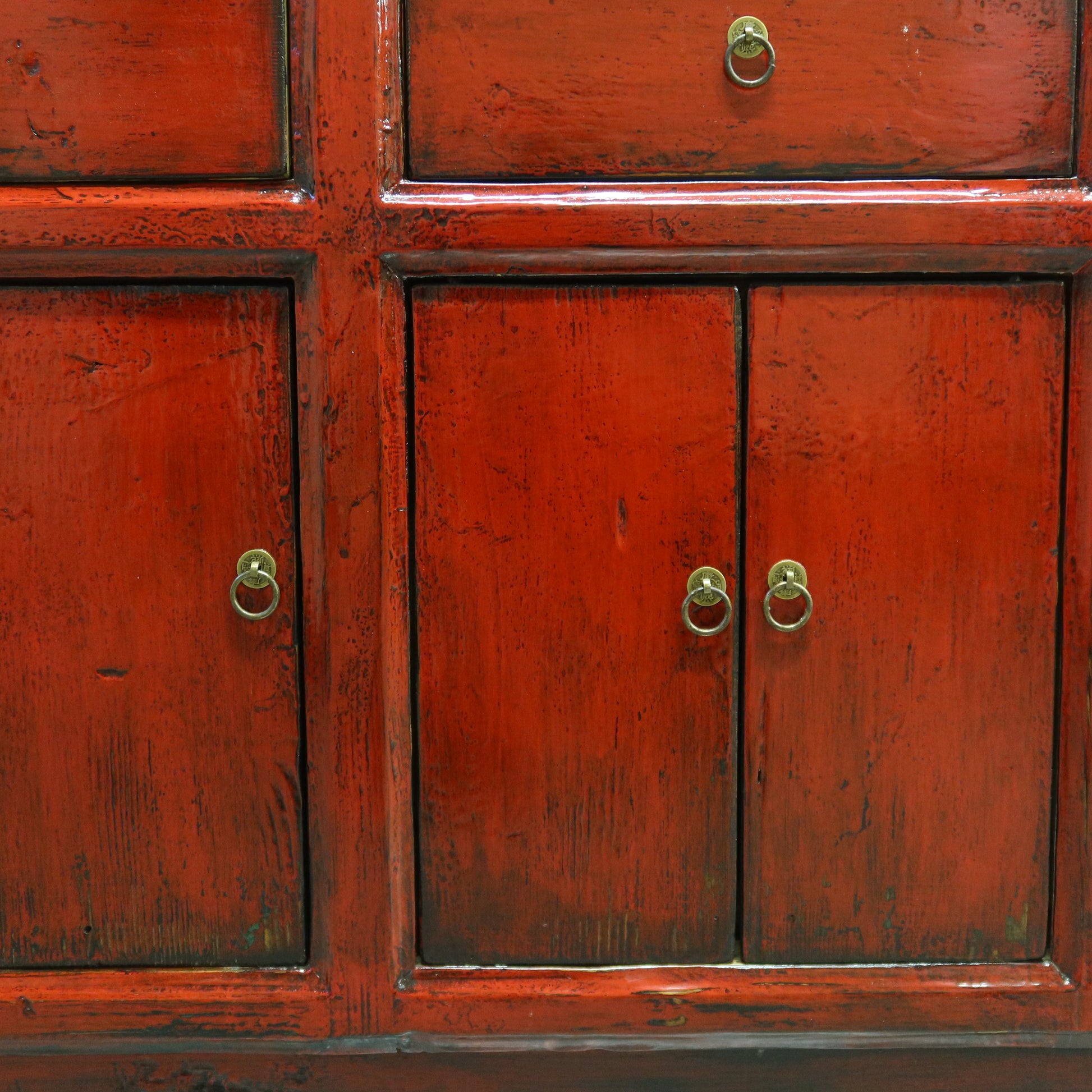 Credenza in olmo cinese laccato rossa: caratteristico fronte con fascia di 3 cassetti superiori, vano centrale con 2 ante e 2 pannelli laterali. Provenienza Regione di Tianjin.