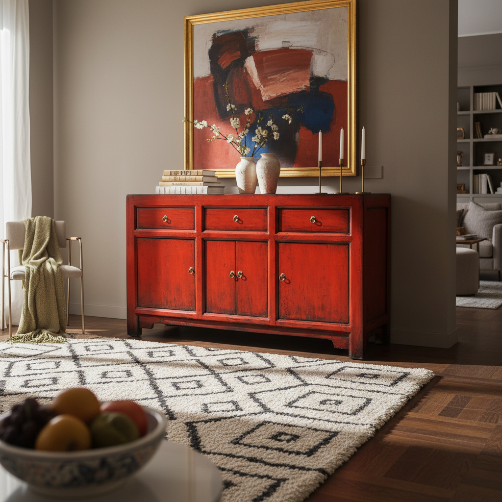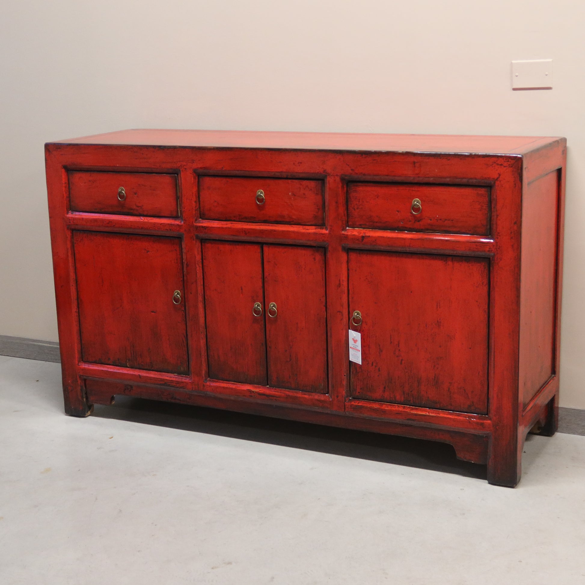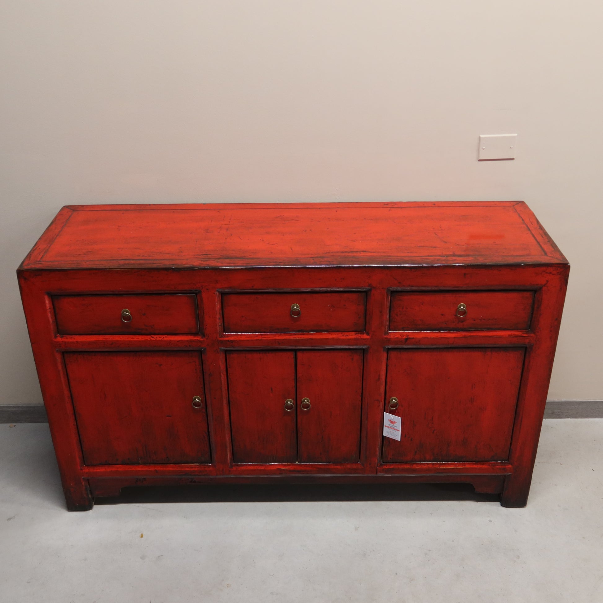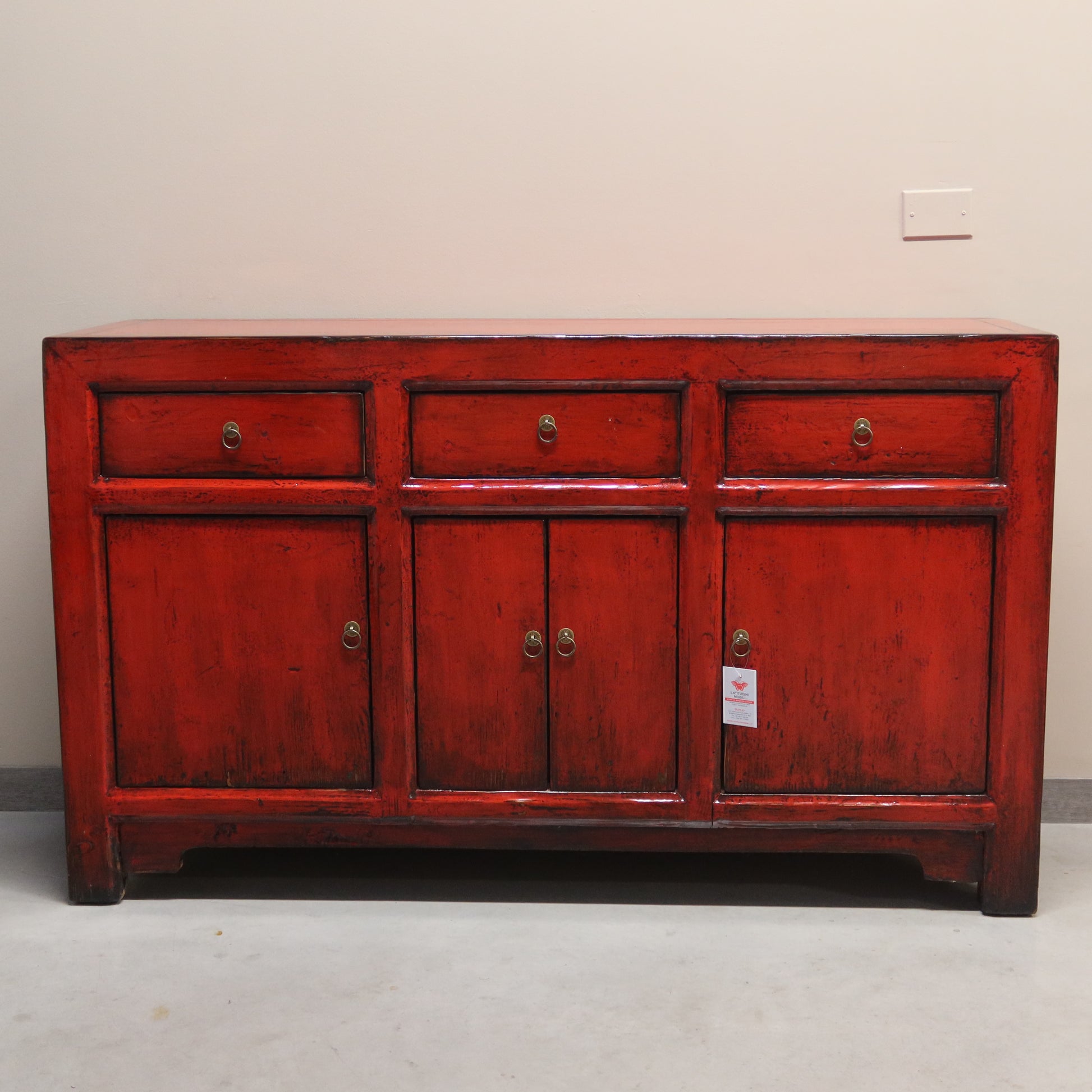Credenza in olmo cinese laccato rossa: caratteristico fronte con fascia di 3 cassetti superiori, vano centrale con 2 ante e 2 pannelli laterali. Provenienza Regione di Tianjin.