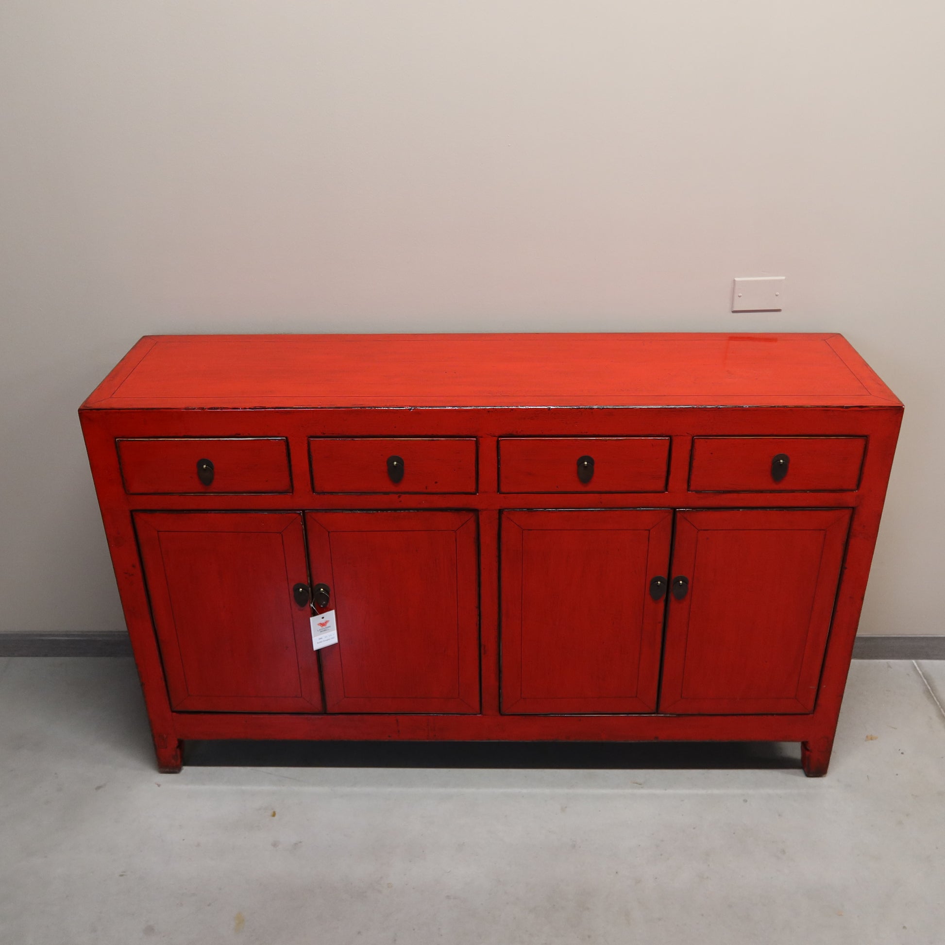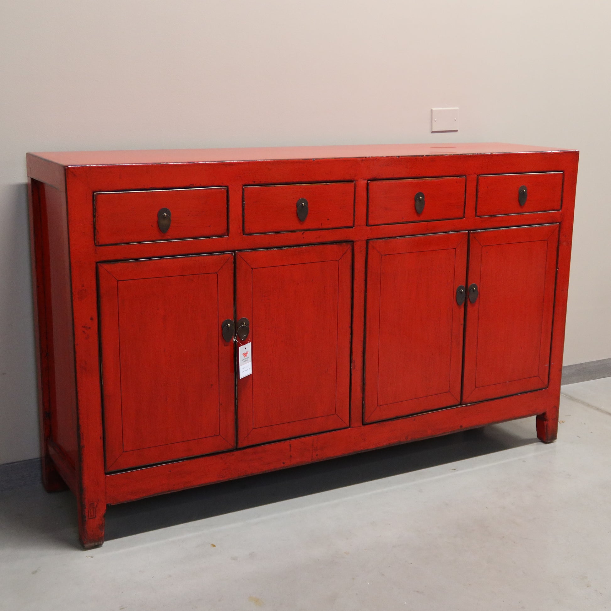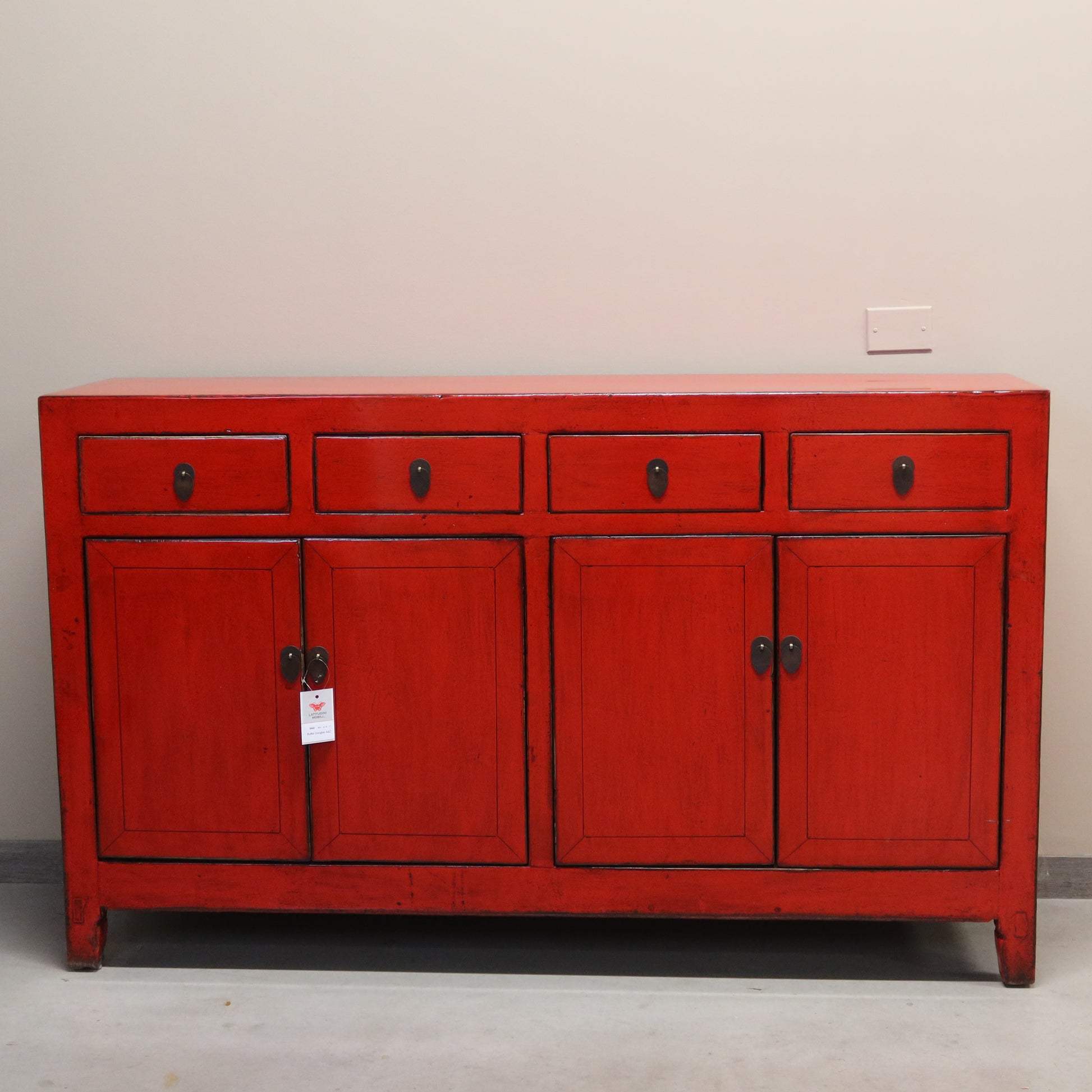 Rigoroso buffet in lacca rossa adatto a zona giorno come pure ad una zona pranzo, ma può essere un particolare mobile etnico da inserire anche in zona notte, in ogni tipo di camera!