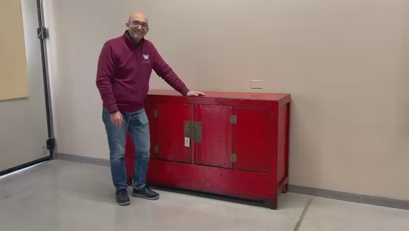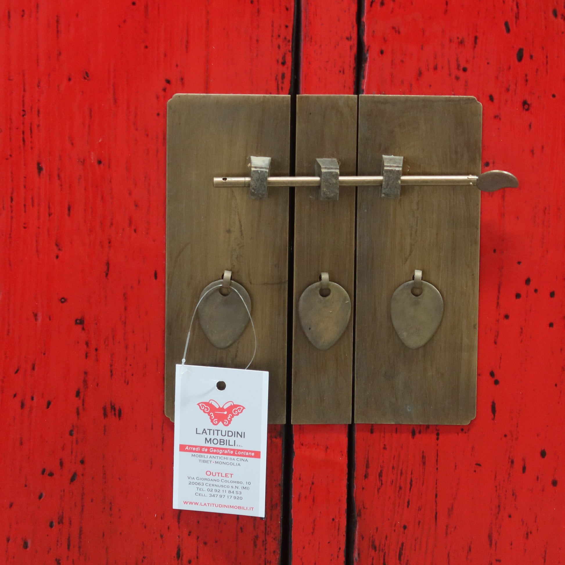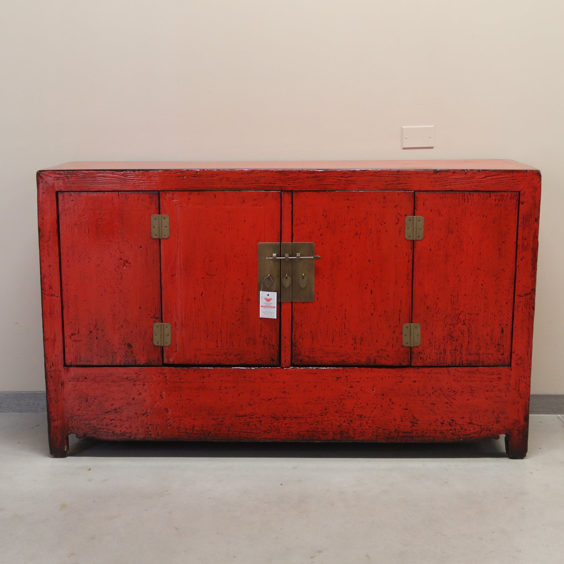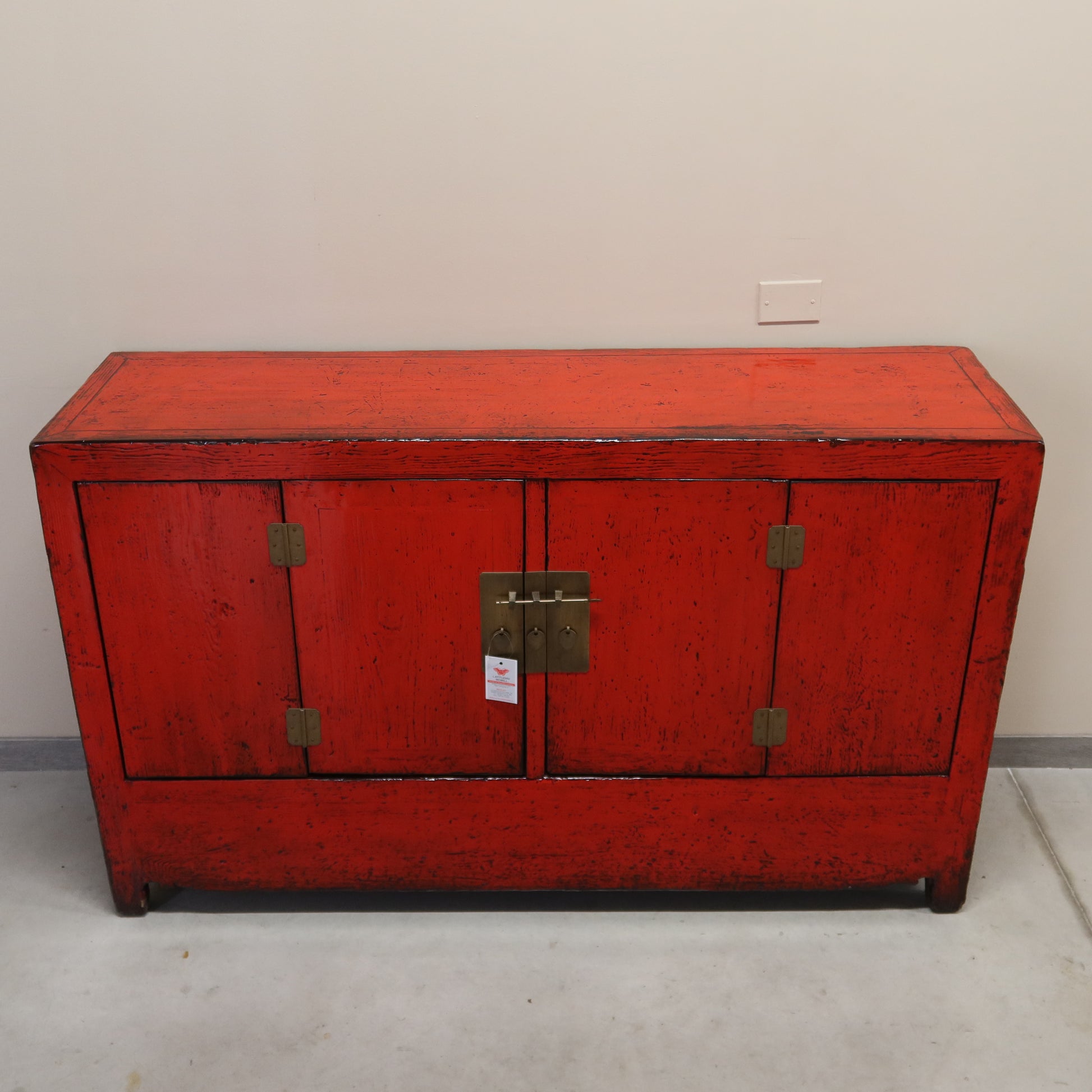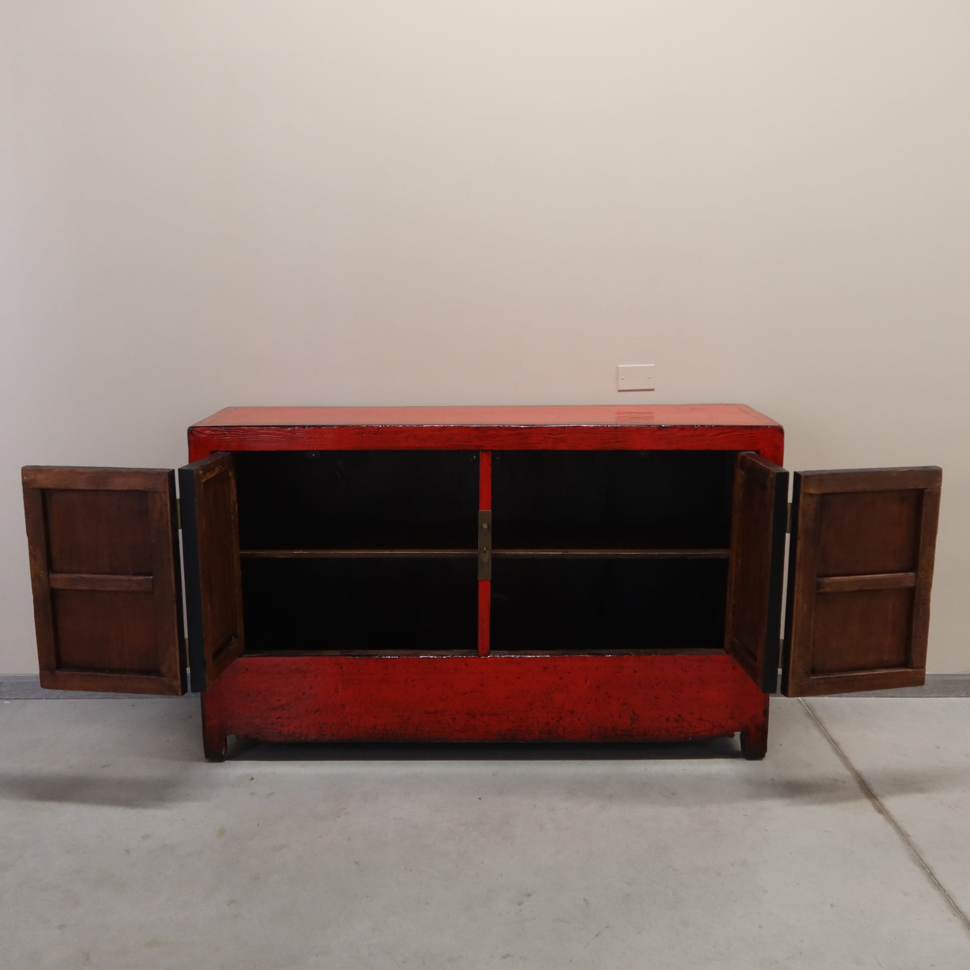 Rigorosa credenza in lacca rossa monocromatica. Il mobile ha un vano unico interno a cui si accede dalle 4 aperture frontali. Provenienza regione del Dongbei.