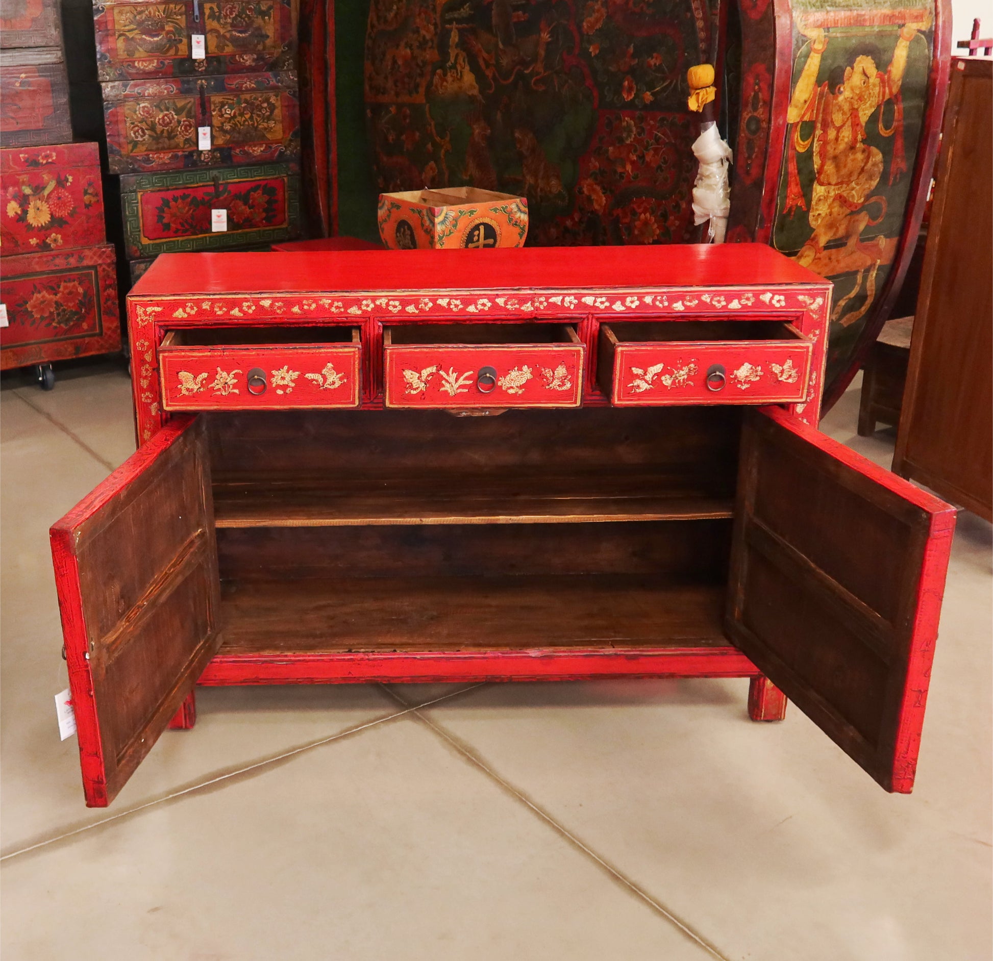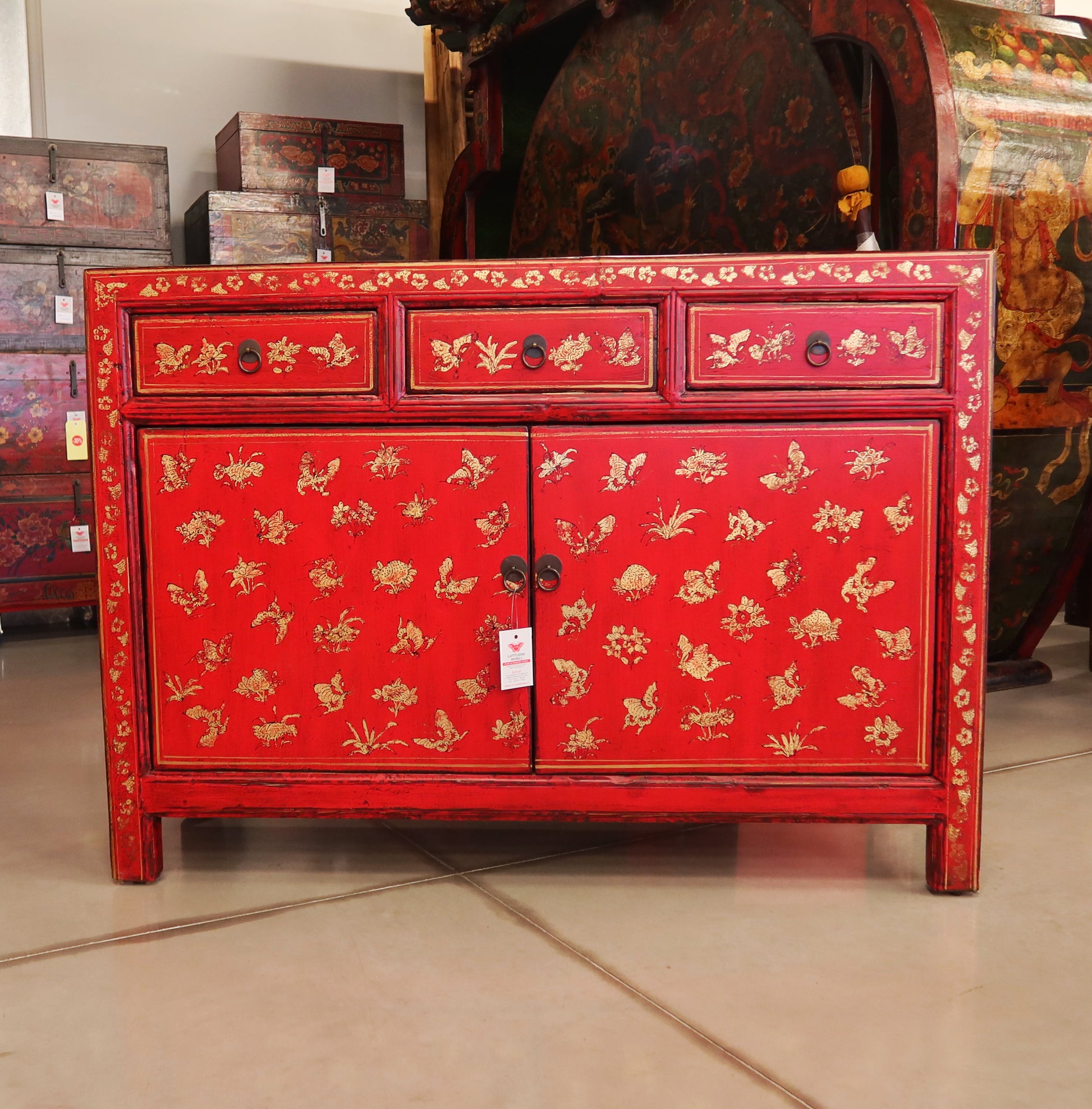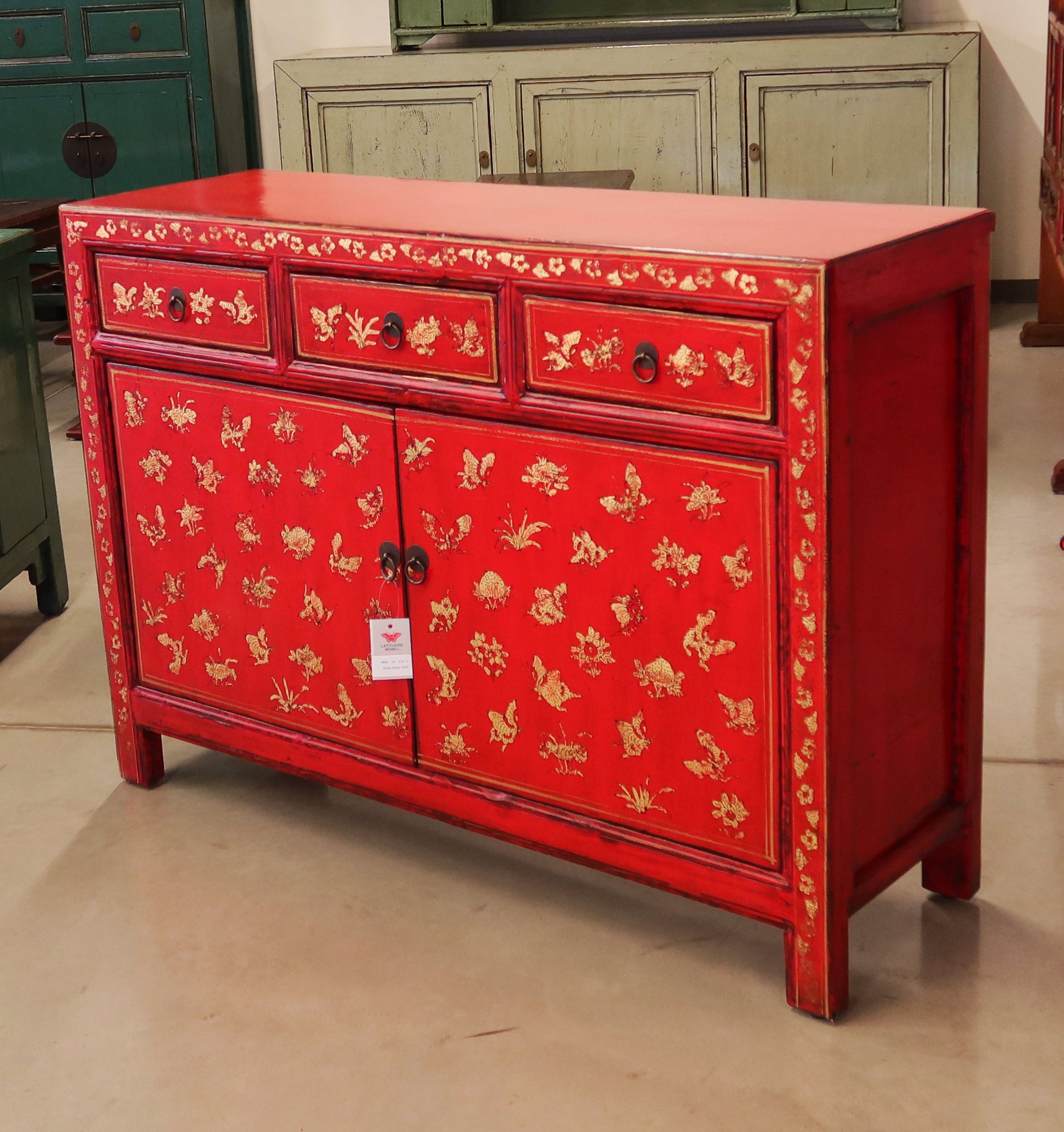Corto buffet etnico in lacca rossa decorata con fronte a doppia anta e fascia di cassetti. Mobile da zona giorno con un pratico vano unico di contenimento e tre cassetti nella fascia superiore.