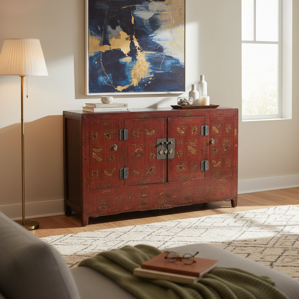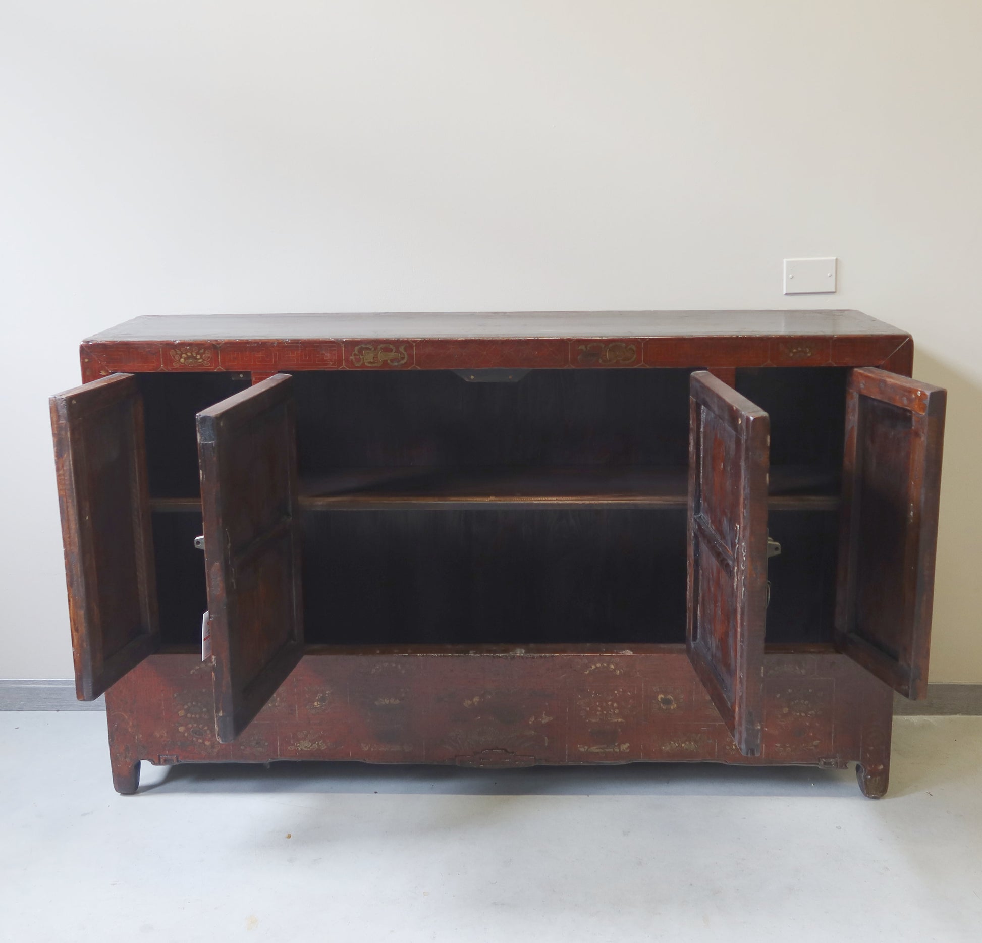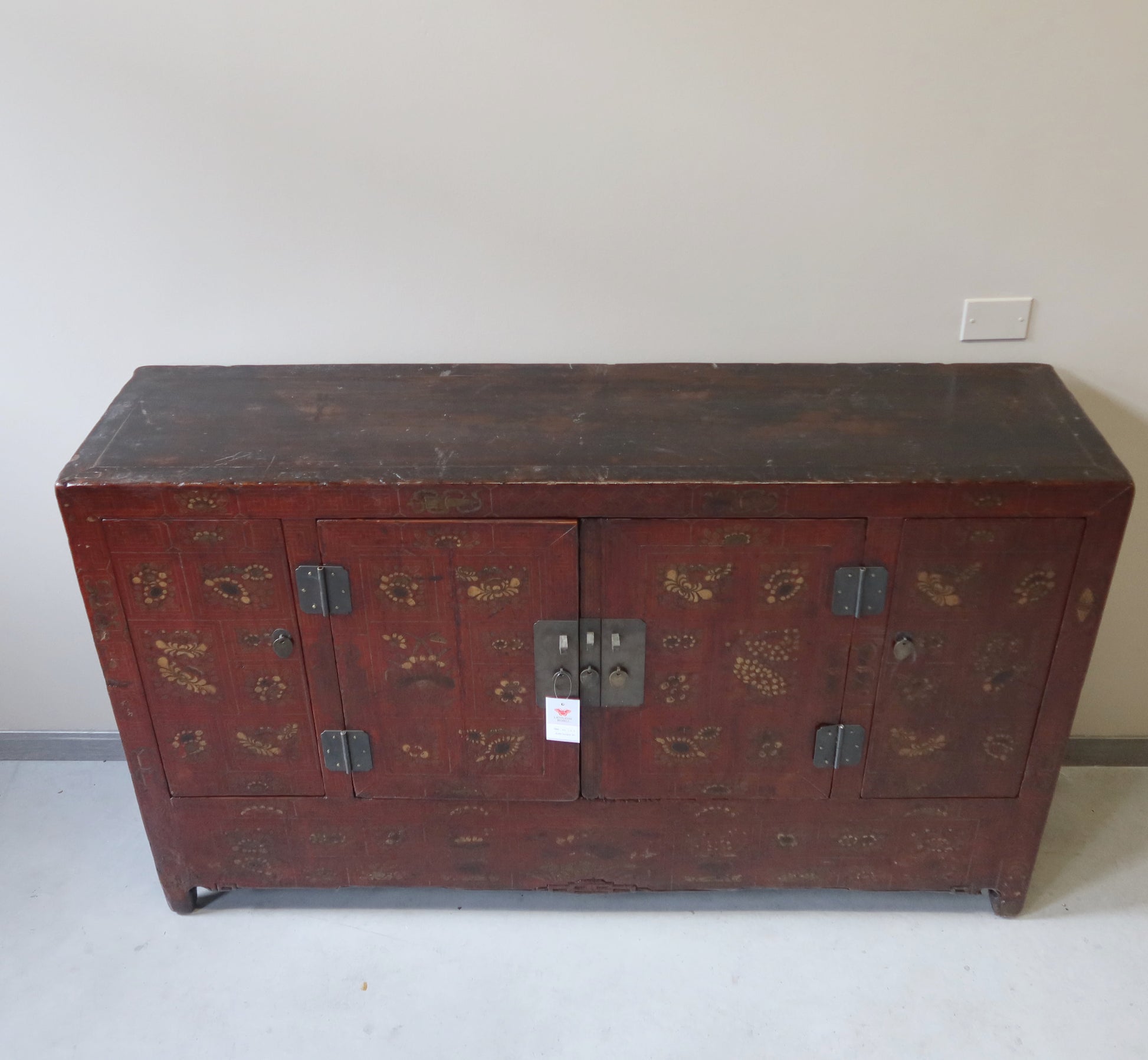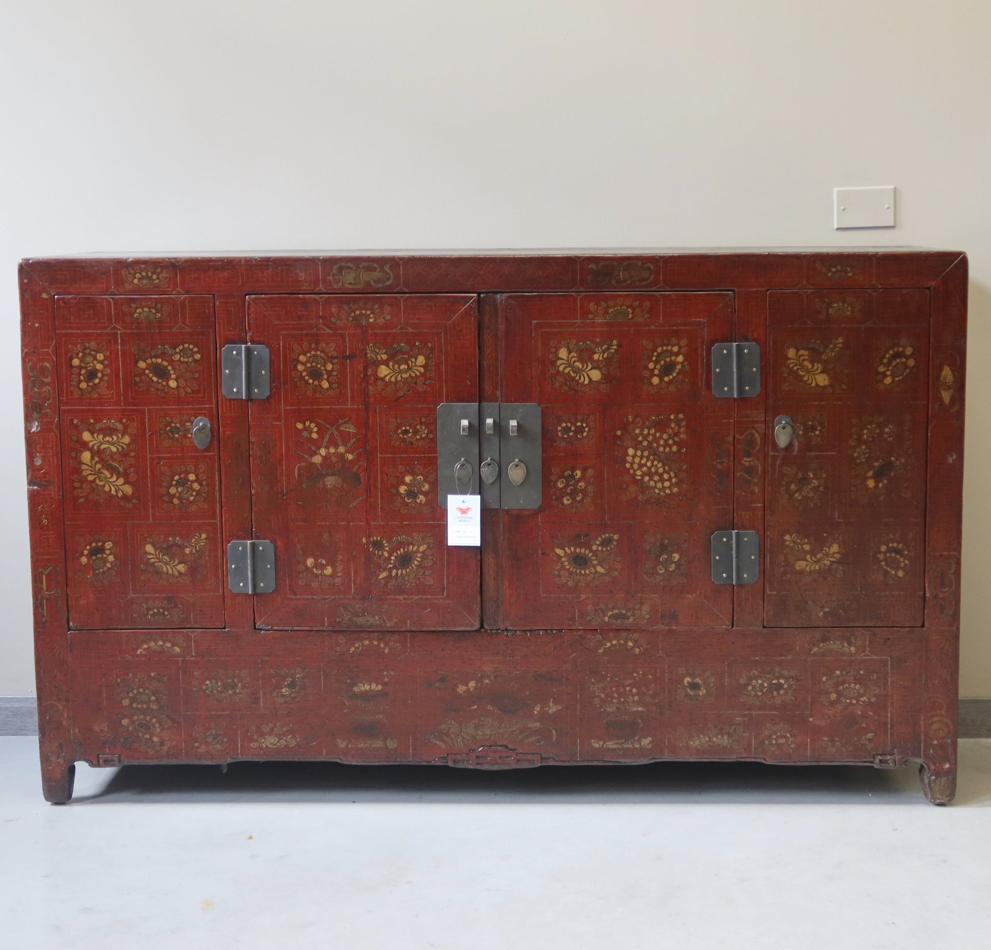 Particolare credenza buffet dal fronte ad apertura a 4 ante. Le tonalità del decoro del fronte rendono questa credenza molto originale. Provenienza provincia di Dongbei.