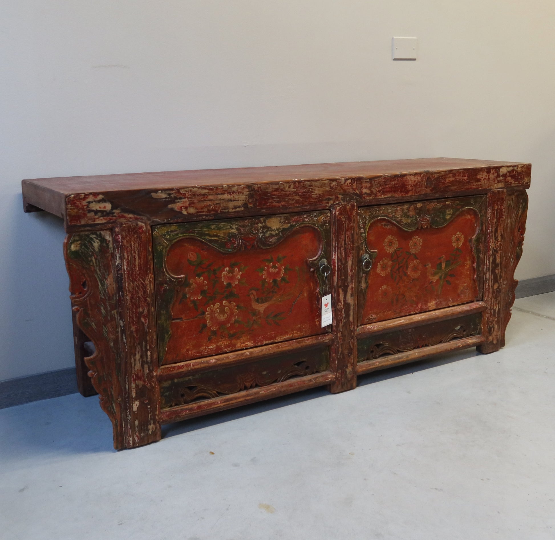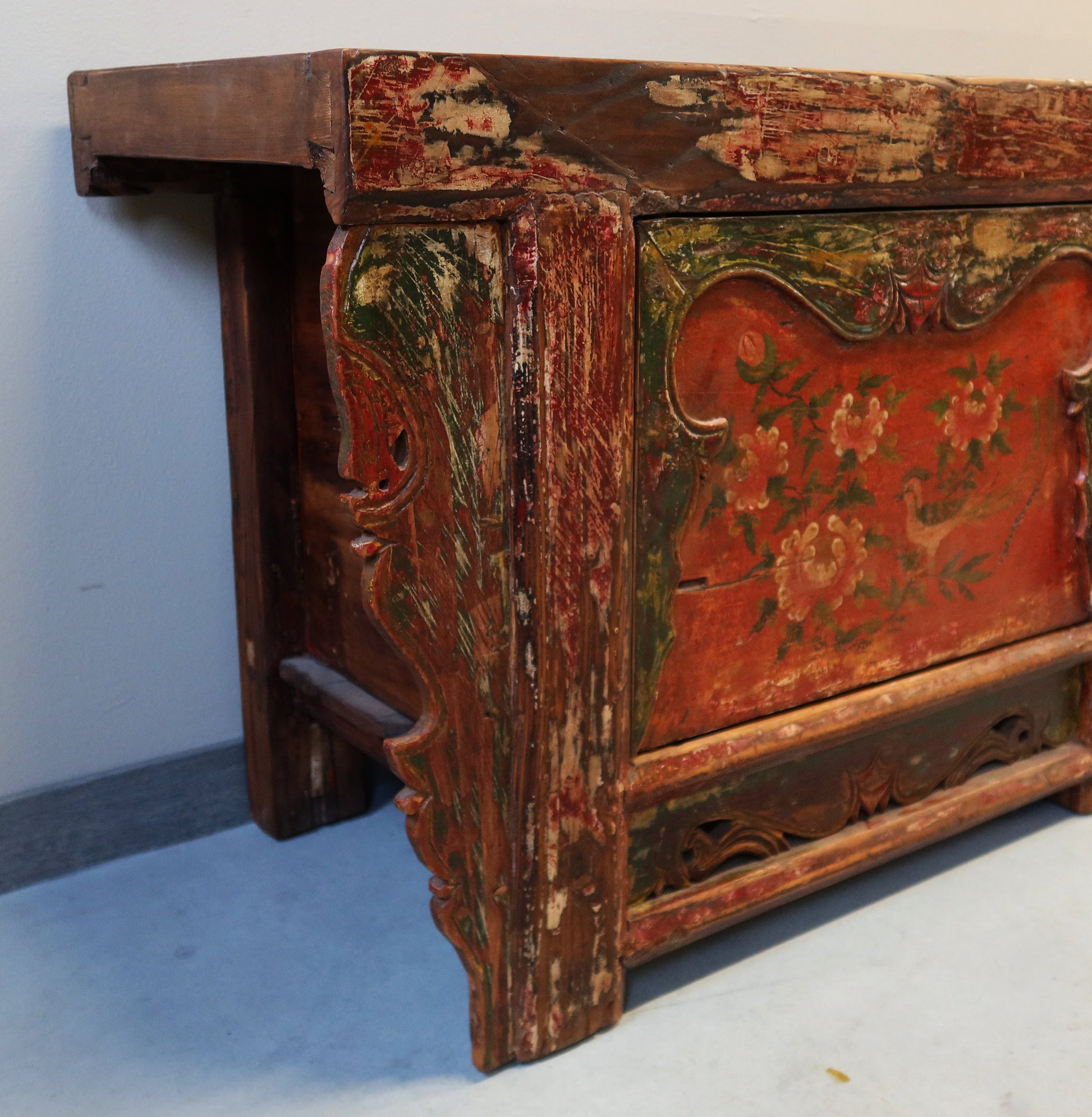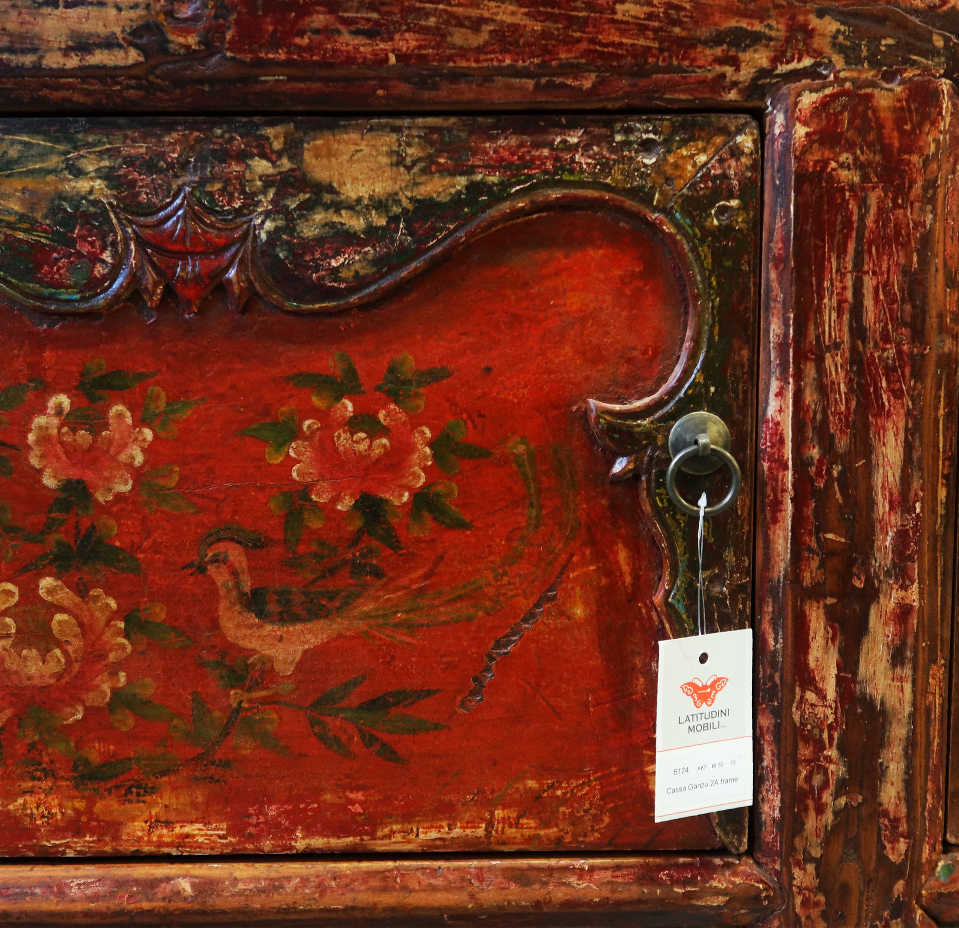Bella cassapanca dipinta a doppio vano con piano aggettante, ali di raccordo e grembiulini sagomati. La specchiatura delle antine ha tracce di decoro a tema floreale. Regione di provenienza: Ganzu. Finitura in patina.