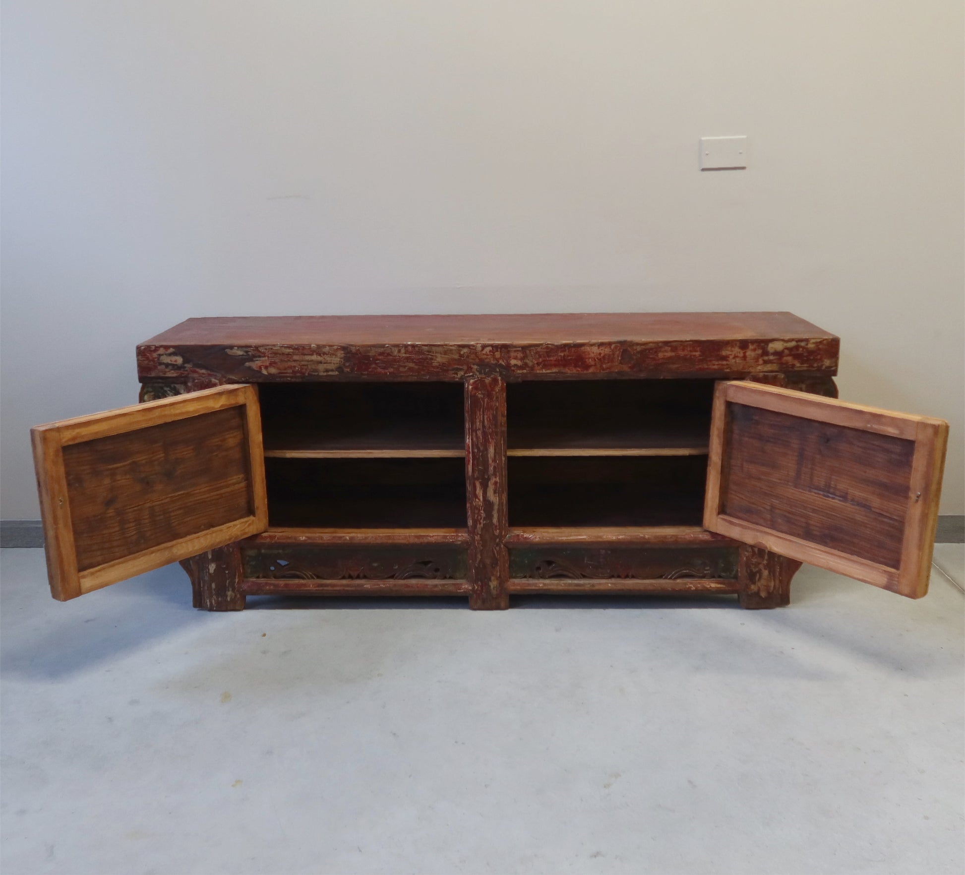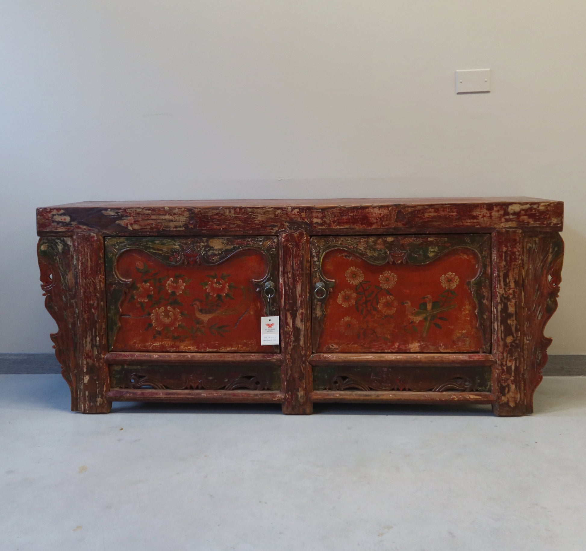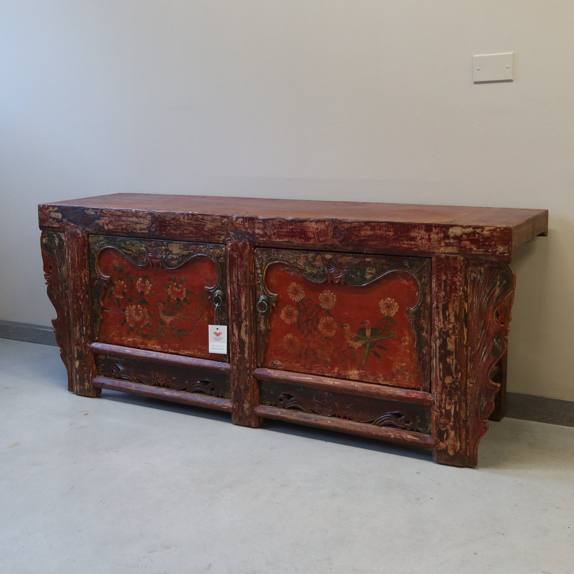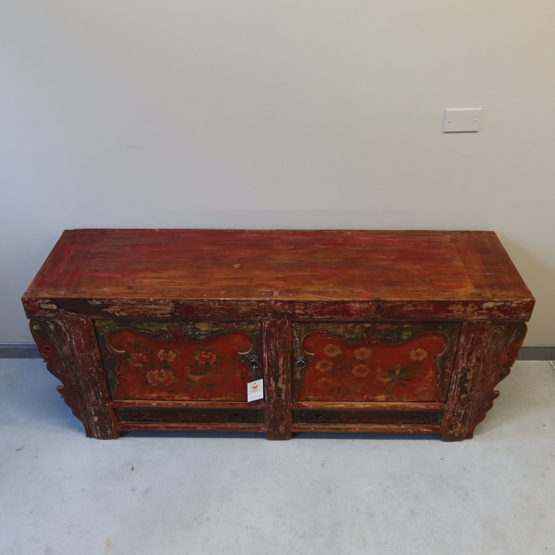 Bella cassapanca dipinta a doppio vano con piano aggettante, ali di raccordo e grembiulini sagomati. La specchiatura delle antine ha tracce di decoro a tema floreale. Regione di provenienza: Ganzu. Finitura in patina.
