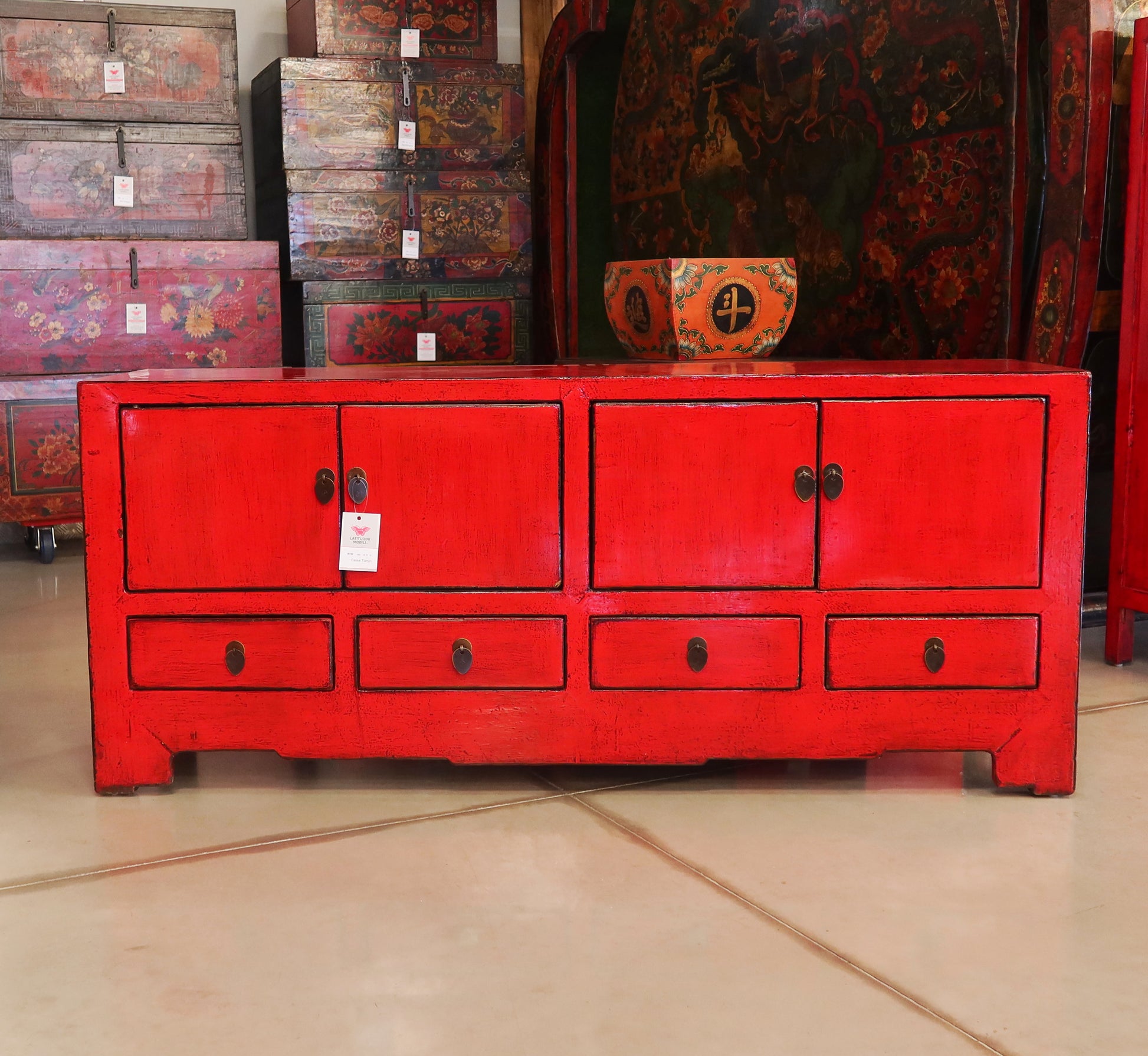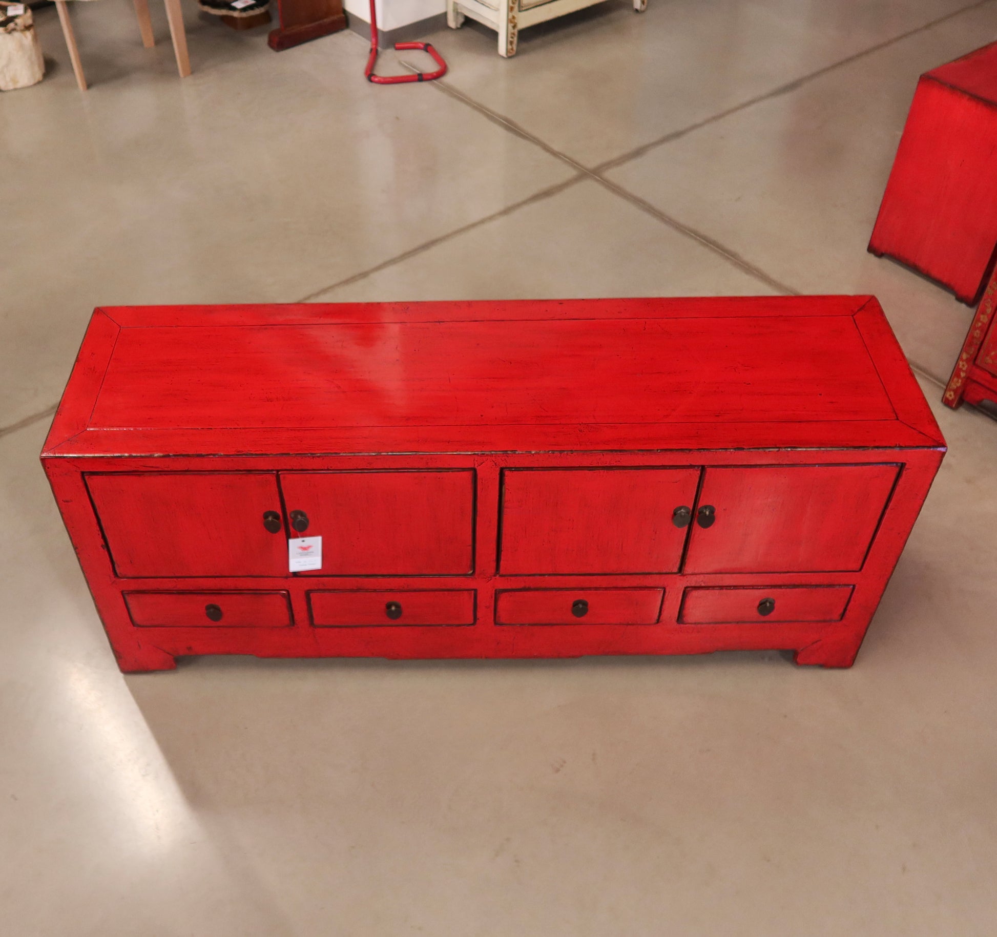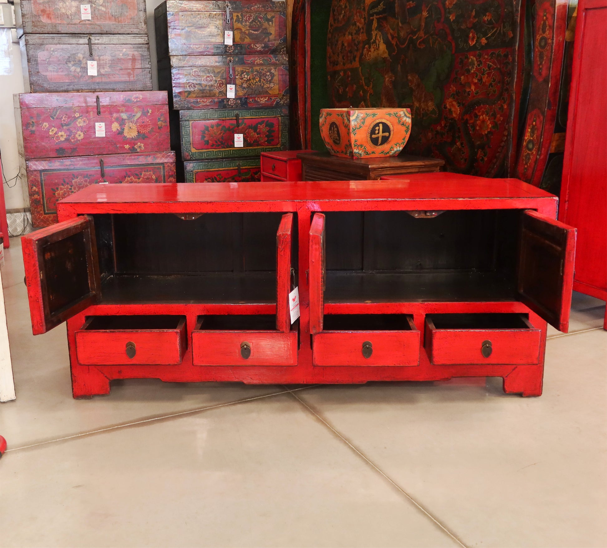 Cassapanca etnica in lacca rossa con ante e cassetti. E' il mobile etnico ideale per la televisione senza rinunciare alla funzionalità del contenimento.